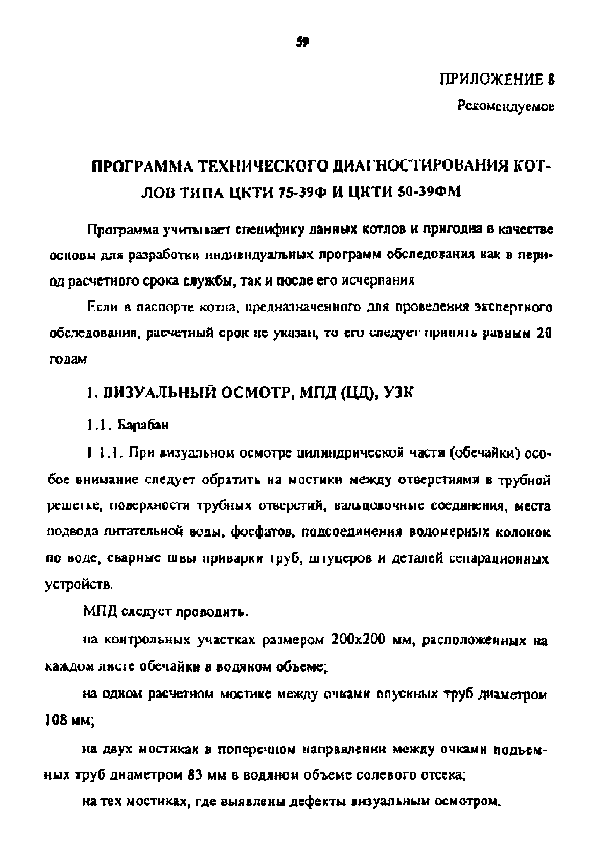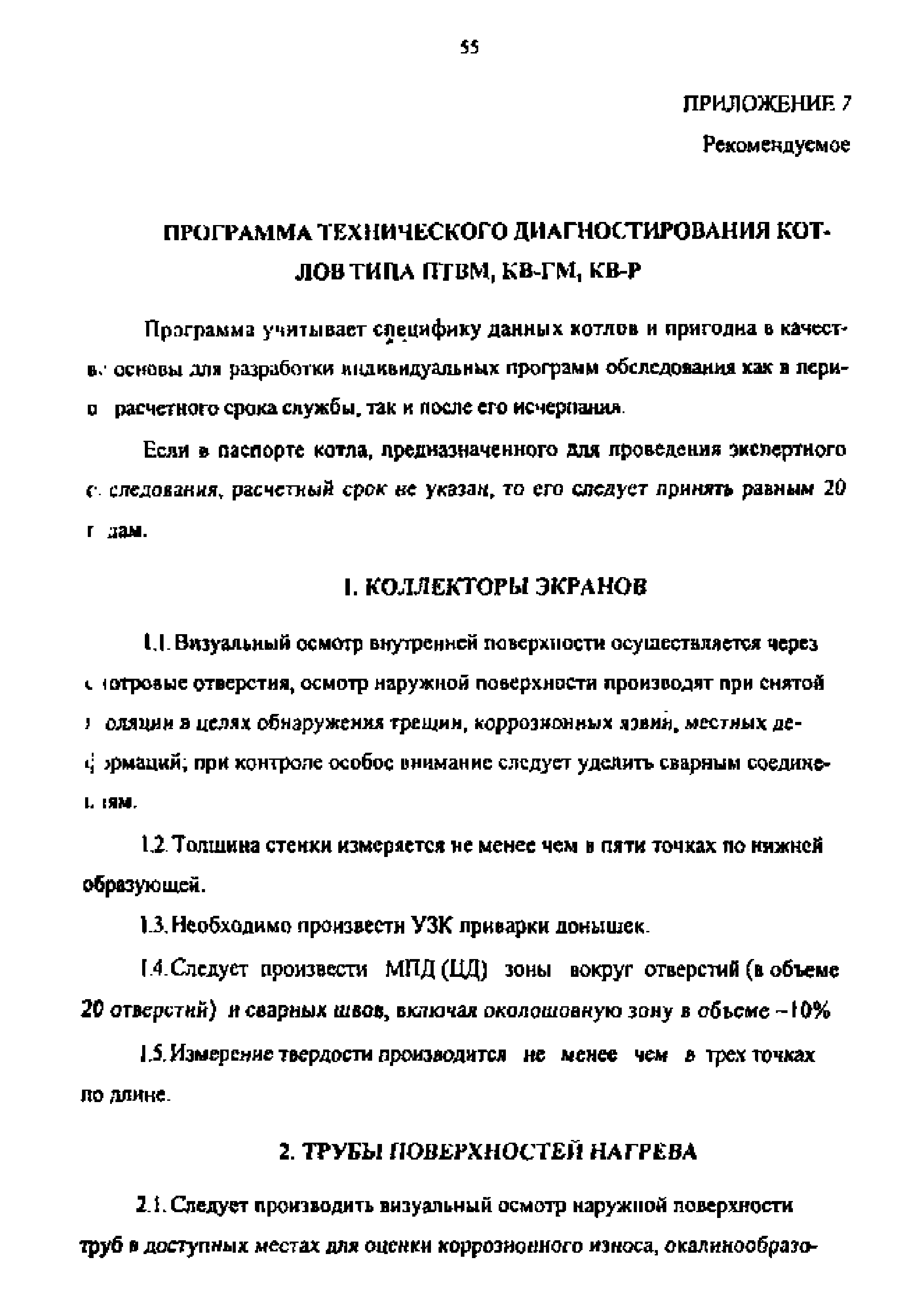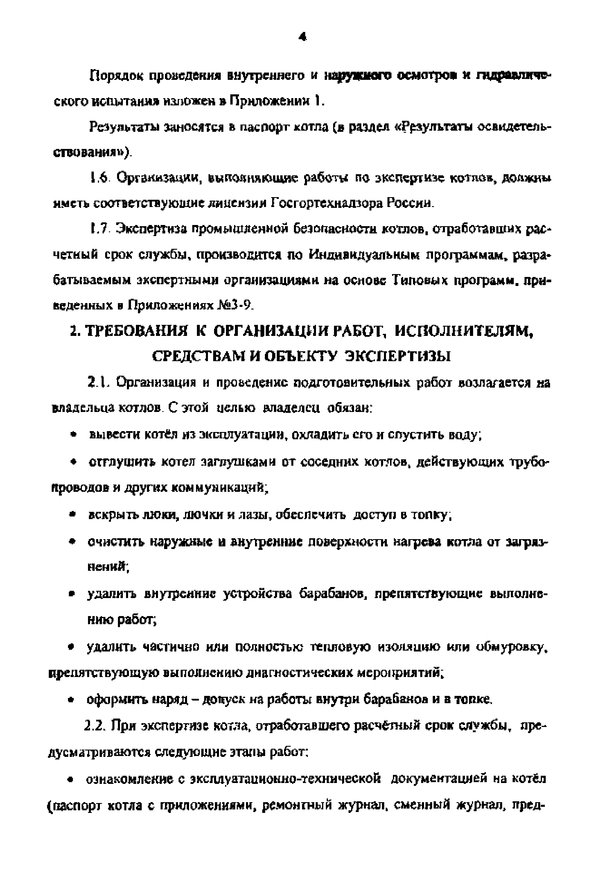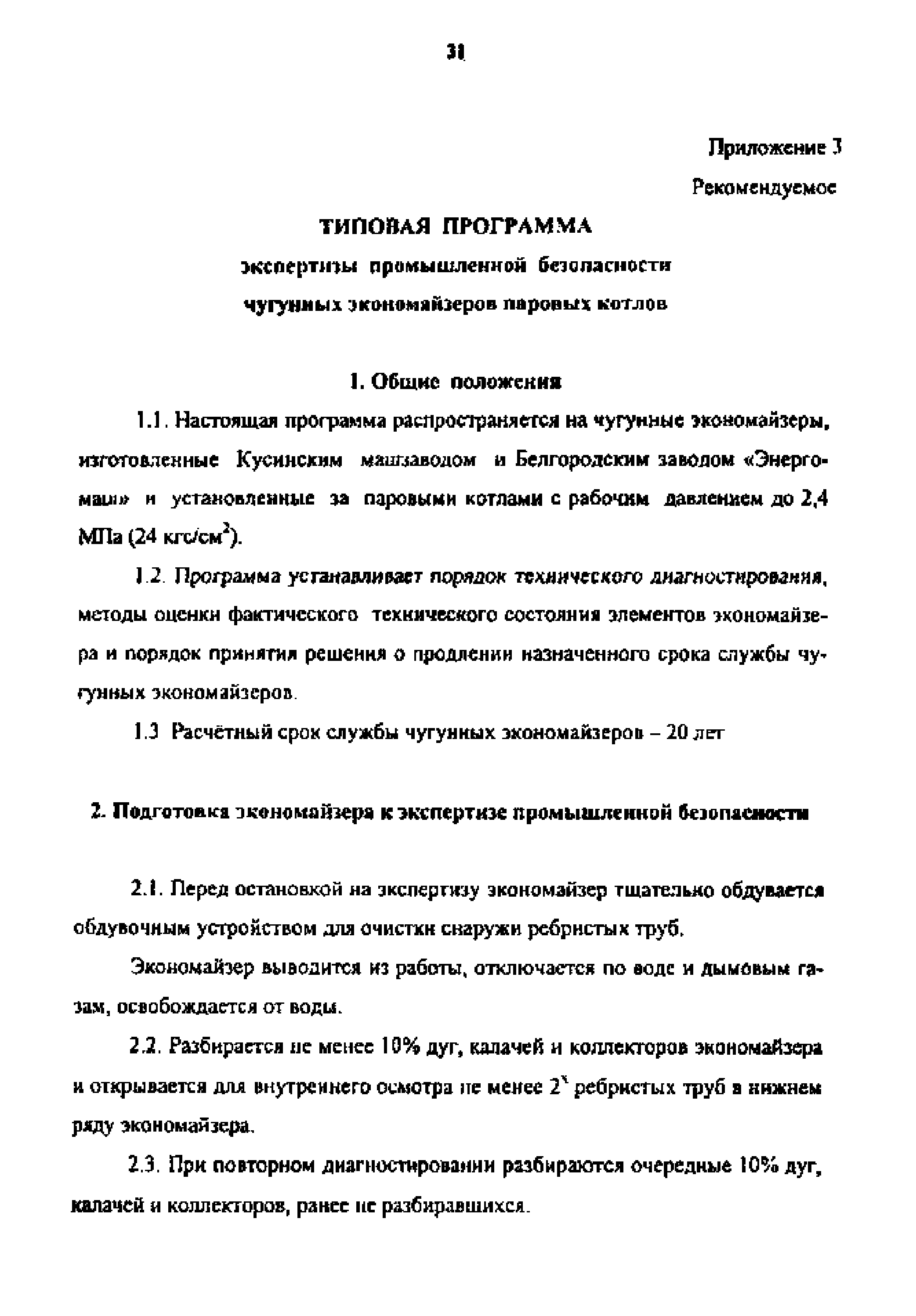 | Оглавление: | 1. Общие положения 2. Требования к организации работ, исполнителям, средствам и объекту экспертизы 3. Экспертиза котла Приложение 1 (обязательное). Техническое освидетельствование паровых и водогрейных котлов с давлением до 4 МПа Приложение 2 (обязательное). Нормы оценки технического состояния котлов по результатам экспертизы Приложение 3 (рекомендуемое). Типовая программа экспертизы промышленной безопасности чугунных экономайзеров паровых котлов Приложение 4 (рекомендуемое). Типовая программа технического диагностирования котлов МЗК-7 и МЗК-8 Приложение 5 (рекомендуемое). Типовая программа технического диагностирования котлов типа Е-1,0-0,9 и ПКИ Приложение 6 (рекомендуемое). Программа технического диагностирования котлов типа КЕ, ДЕ, ДКВр и ДКВ Приложение 7 (рекомендуемое). Программа технического диагностирования котлов типа ПТВМ,КВ-ГМ, КВ-Р Приложение 8 (рекомендуемое). Программа технического диагностирования котлов типа ЦКТИ 75-39Ф, ЦКТИ 50-39ФМ Приложение 9 (рекомендуемое). Программа технического диагностирования котлов-утилизаторов типа КУН-24/16-М, Г-420 ВПЭ Приложение 10. Термины и определения Приложение 11. Ссылочные нормативные документы |