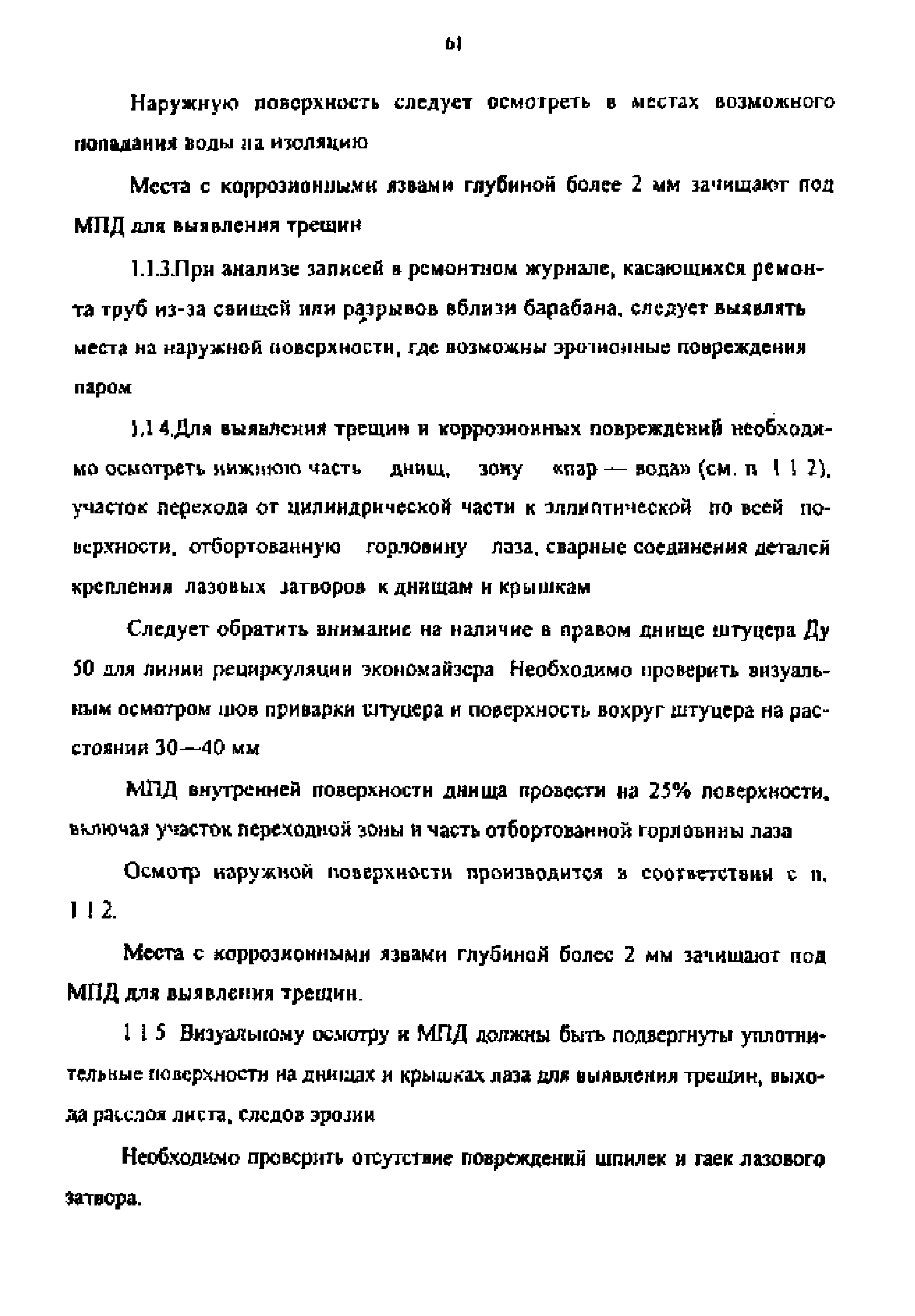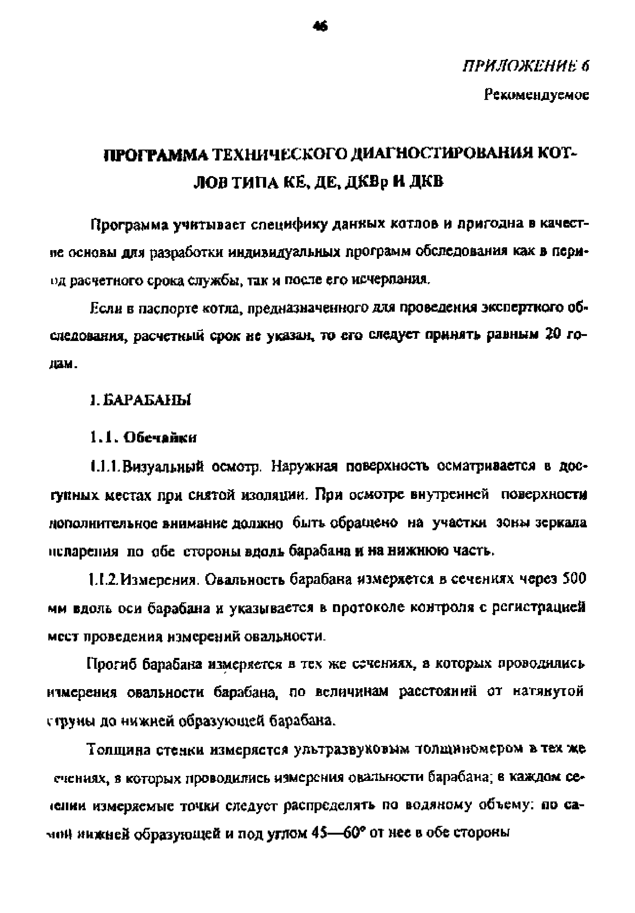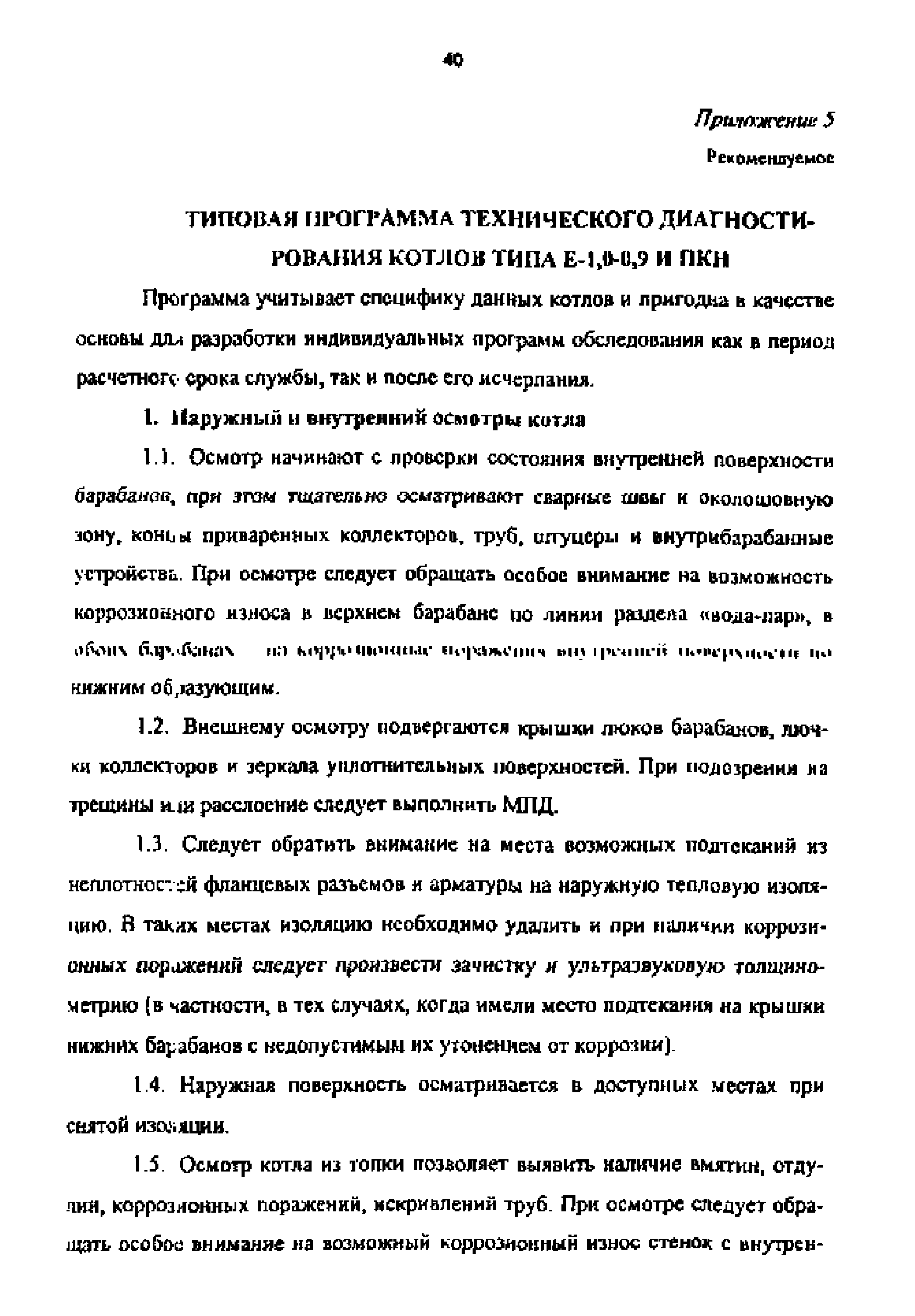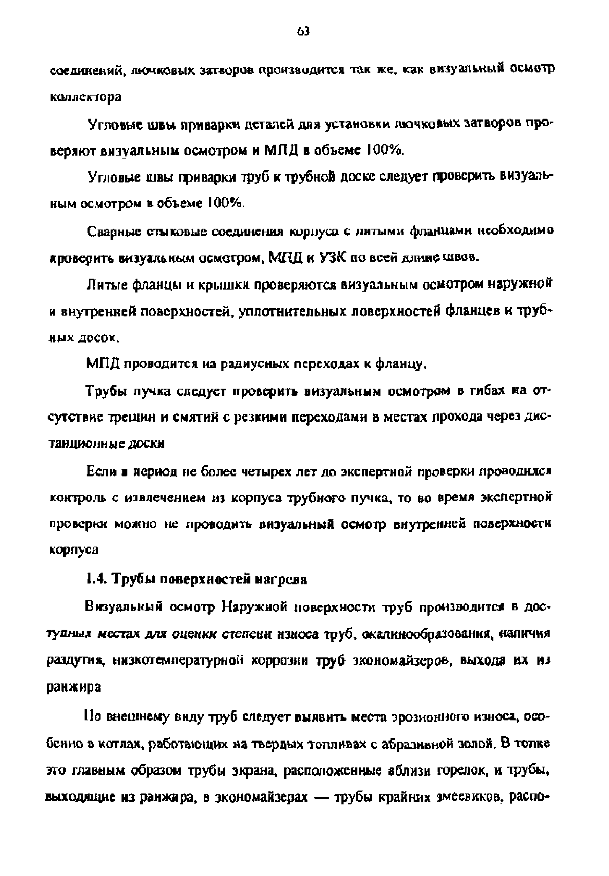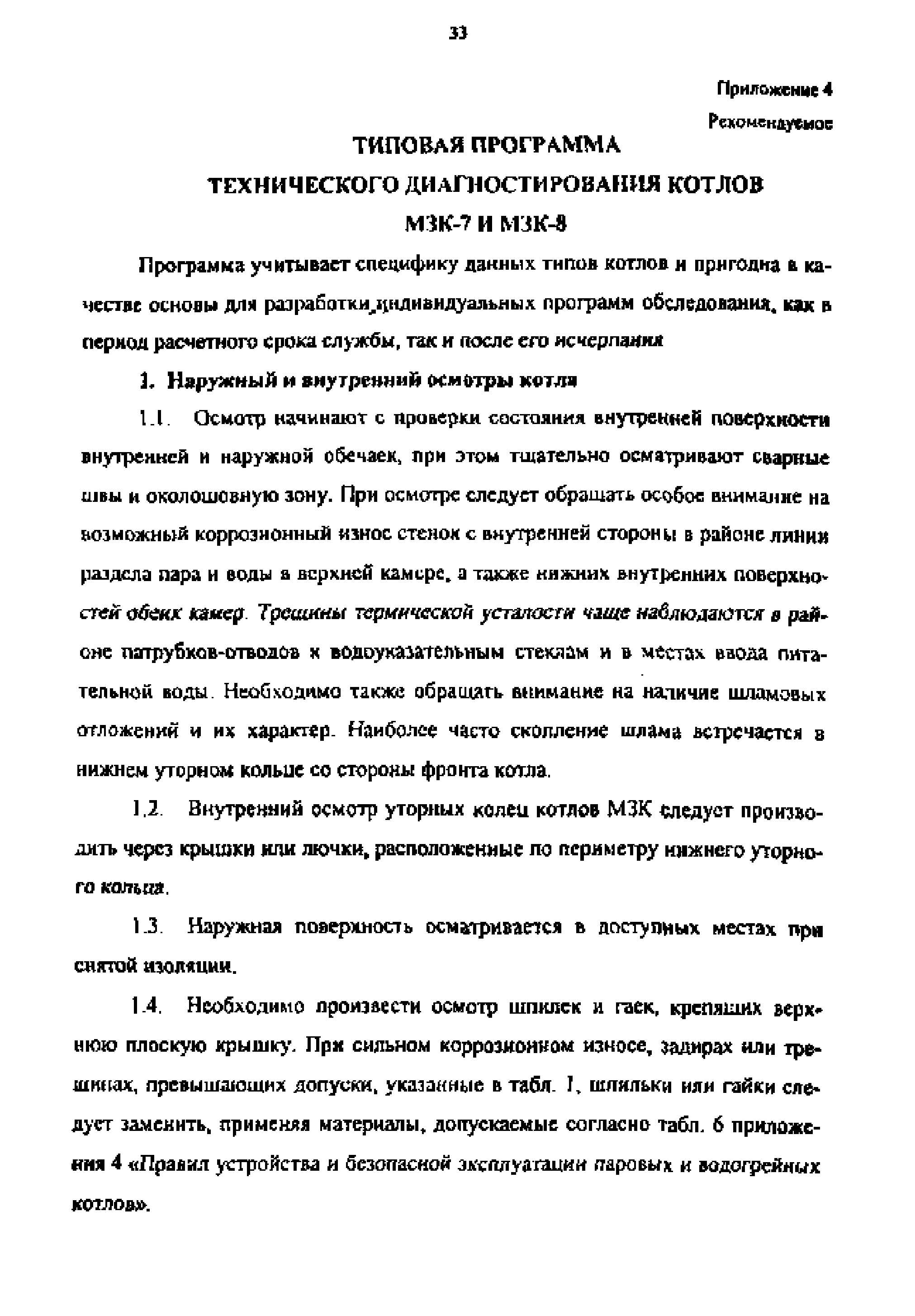 | Оглавление: | 1. Общие положения 2. Требования к организации работ, исполнителям, средствам и объекту экспертизы 3. Экспертиза котла Приложение 1 (обязательное). Техническое освидетельствование паровых и водогрейных котлов с давлением до 4 МПа Приложение 2 (обязательное). Нормы оценки технического состояния котлов по результатам экспертизы Приложение 3 (рекомендуемое). Типовая программа экспертизы промышленной безопасности чугунных экономайзеров паровых котлов Приложение 4 (рекомендуемое). Типовая программа технического диагностирования котлов МЗК-7 и МЗК-8 Приложение 5 (рекомендуемое). Типовая программа технического диагностирования котлов типа Е-1,0-0,9 и ПКИ Приложение 6 (рекомендуемое). Программа технического диагностирования котлов типа КЕ, ДЕ, ДКВр и ДКВ Приложение 7 (рекомендуемое). Программа технического диагностирования котлов типа ПТВМ,КВ-ГМ, КВ-Р Приложение 8 (рекомендуемое). Программа технического диагностирования котлов типа ЦКТИ 75-39Ф, ЦКТИ 50-39ФМ Приложение 9 (рекомендуемое). Программа технического диагностирования котлов-утилизаторов типа КУН-24/16-М, Г-420 ВПЭ Приложение 10. Термины и определения Приложение 11. Ссылочные нормативные документы |