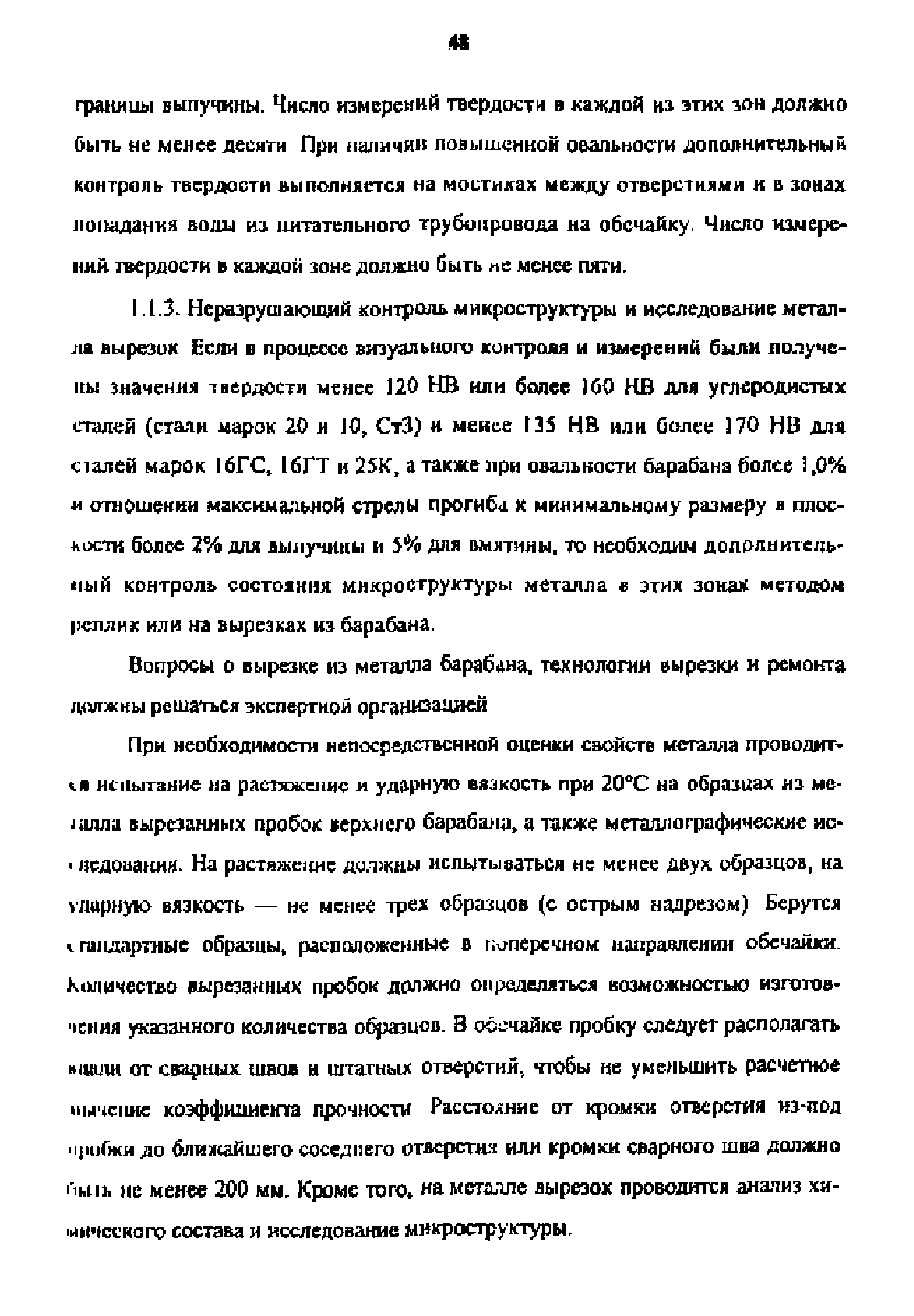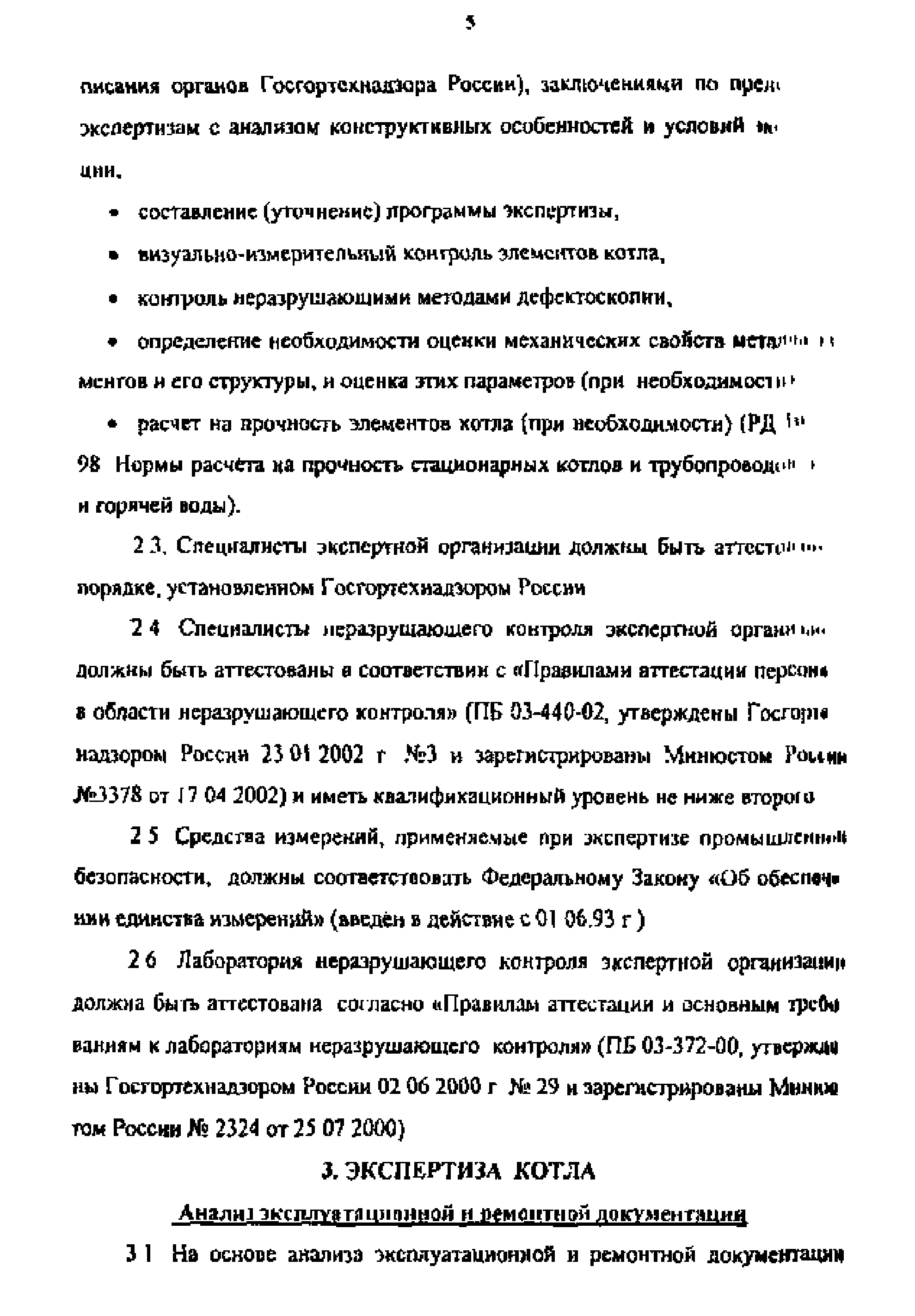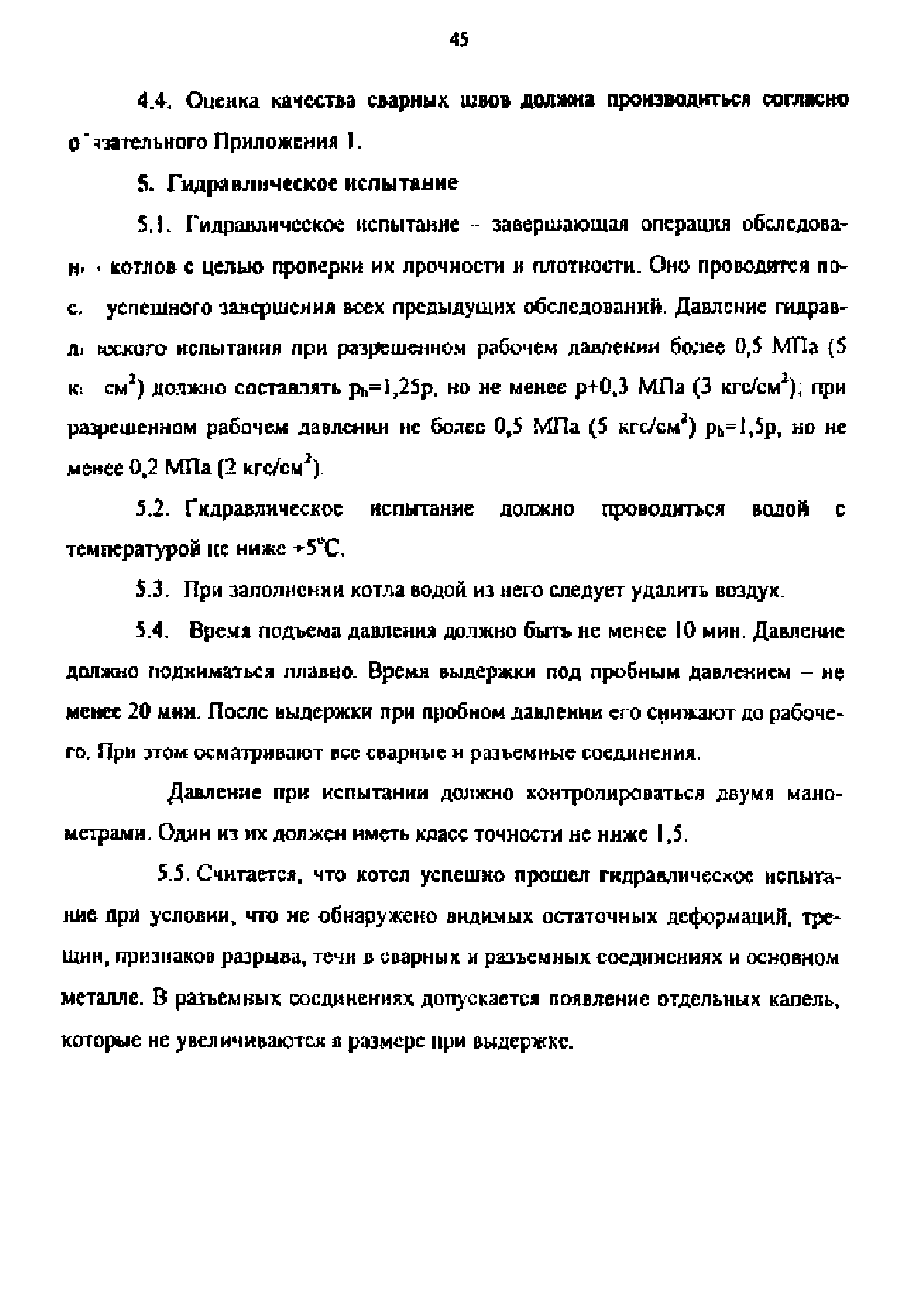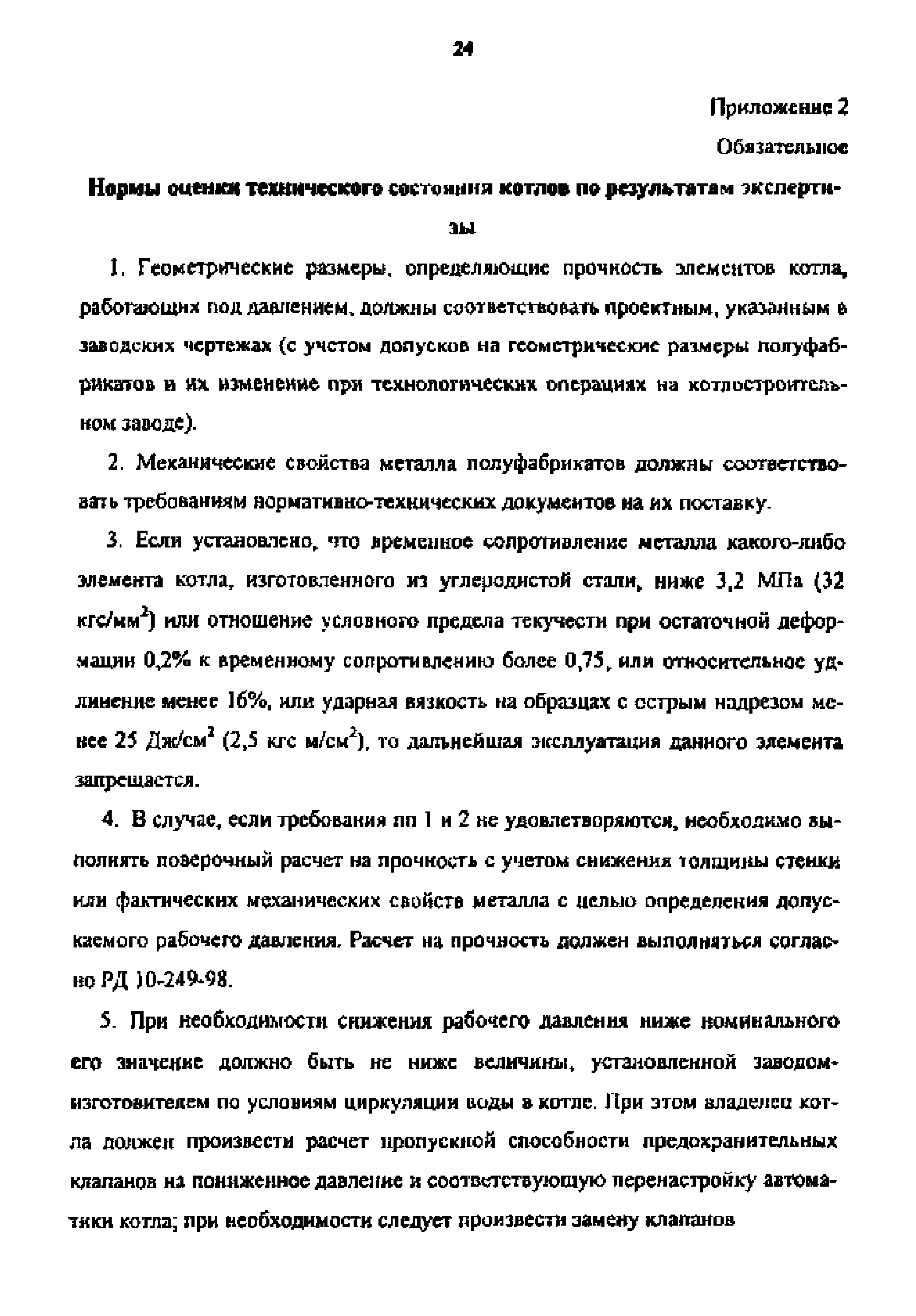 | Оглавление: | 1. Общие положения 2. Требования к организации работ, исполнителям, средствам и объекту экспертизы 3. Экспертиза котла Приложение 1 (обязательное). Техническое освидетельствование паровых и водогрейных котлов с давлением до 4 МПа Приложение 2 (обязательное). Нормы оценки технического состояния котлов по результатам экспертизы Приложение 3 (рекомендуемое). Типовая программа экспертизы промышленной безопасности чугунных экономайзеров паровых котлов Приложение 4 (рекомендуемое). Типовая программа технического диагностирования котлов МЗК-7 и МЗК-8 Приложение 5 (рекомендуемое). Типовая программа технического диагностирования котлов типа Е-1,0-0,9 и ПКИ Приложение 6 (рекомендуемое). Программа технического диагностирования котлов типа КЕ, ДЕ, ДКВр и ДКВ Приложение 7 (рекомендуемое). Программа технического диагностирования котлов типа ПТВМ,КВ-ГМ, КВ-Р Приложение 8 (рекомендуемое). Программа технического диагностирования котлов типа ЦКТИ 75-39Ф, ЦКТИ 50-39ФМ Приложение 9 (рекомендуемое). Программа технического диагностирования котлов-утилизаторов типа КУН-24/16-М, Г-420 ВПЭ Приложение 10. Термины и определения Приложение 11. Ссылочные нормативные документы |