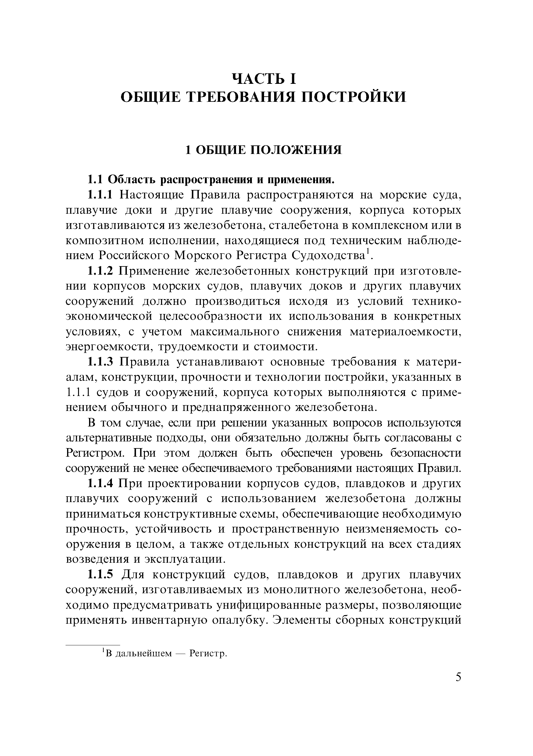 | Область применения: | Правила распространяются на морские суда, плавучие доки и другие плавучие сооружения, корпуса которых изготавливаются из железобетона, сталебетона в комплексном или в композитном исполнении, находящиеся под техническим наблюдением Российского Морского регистра Судоходства. |