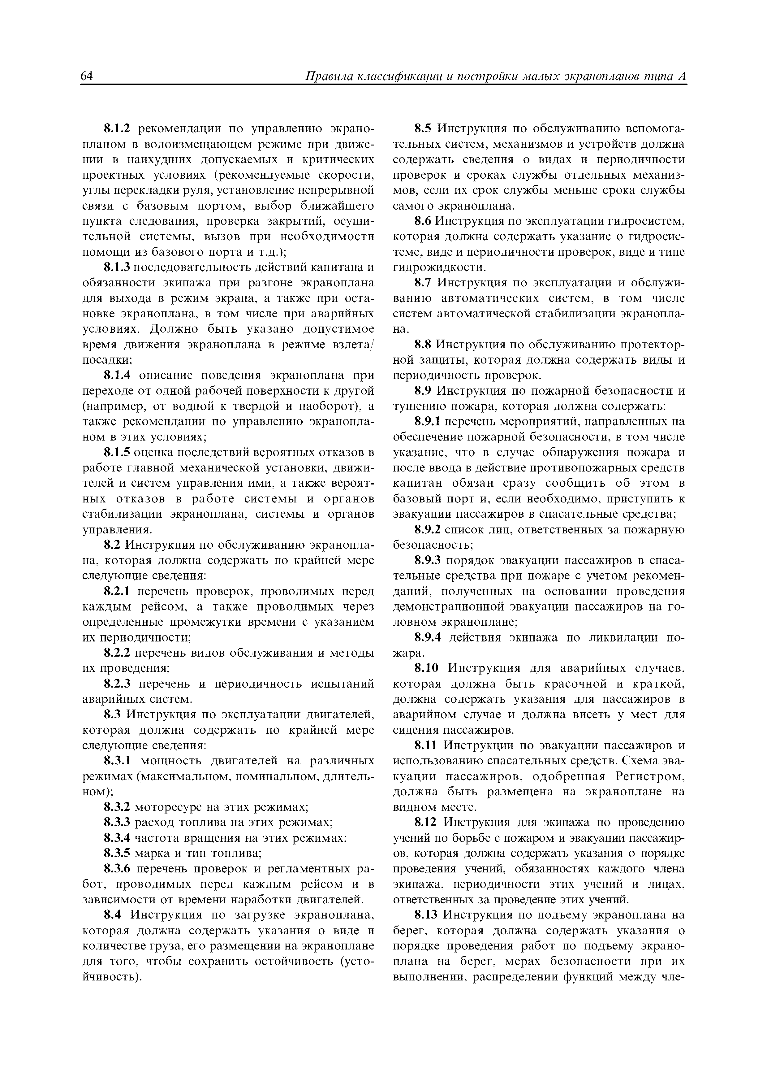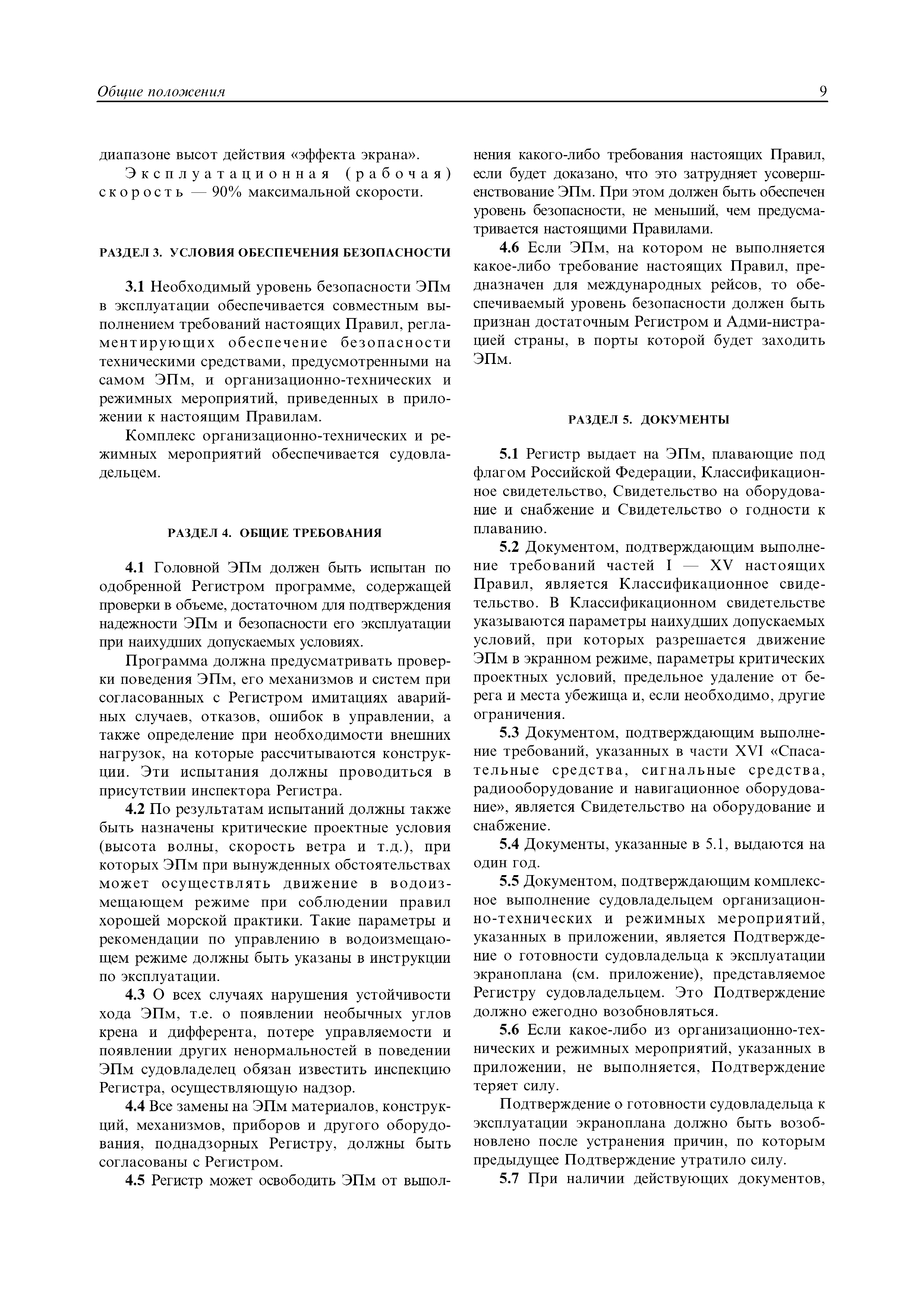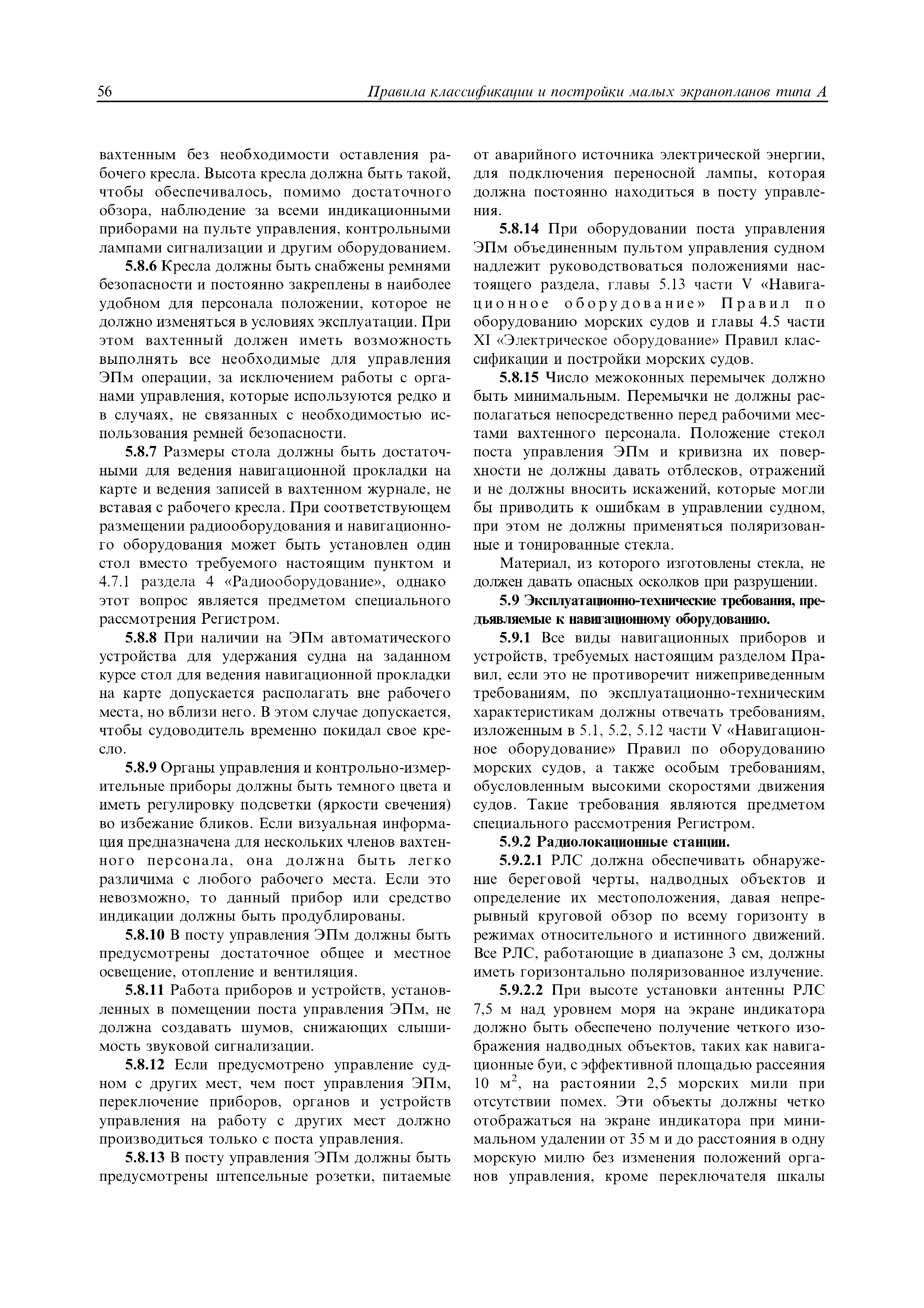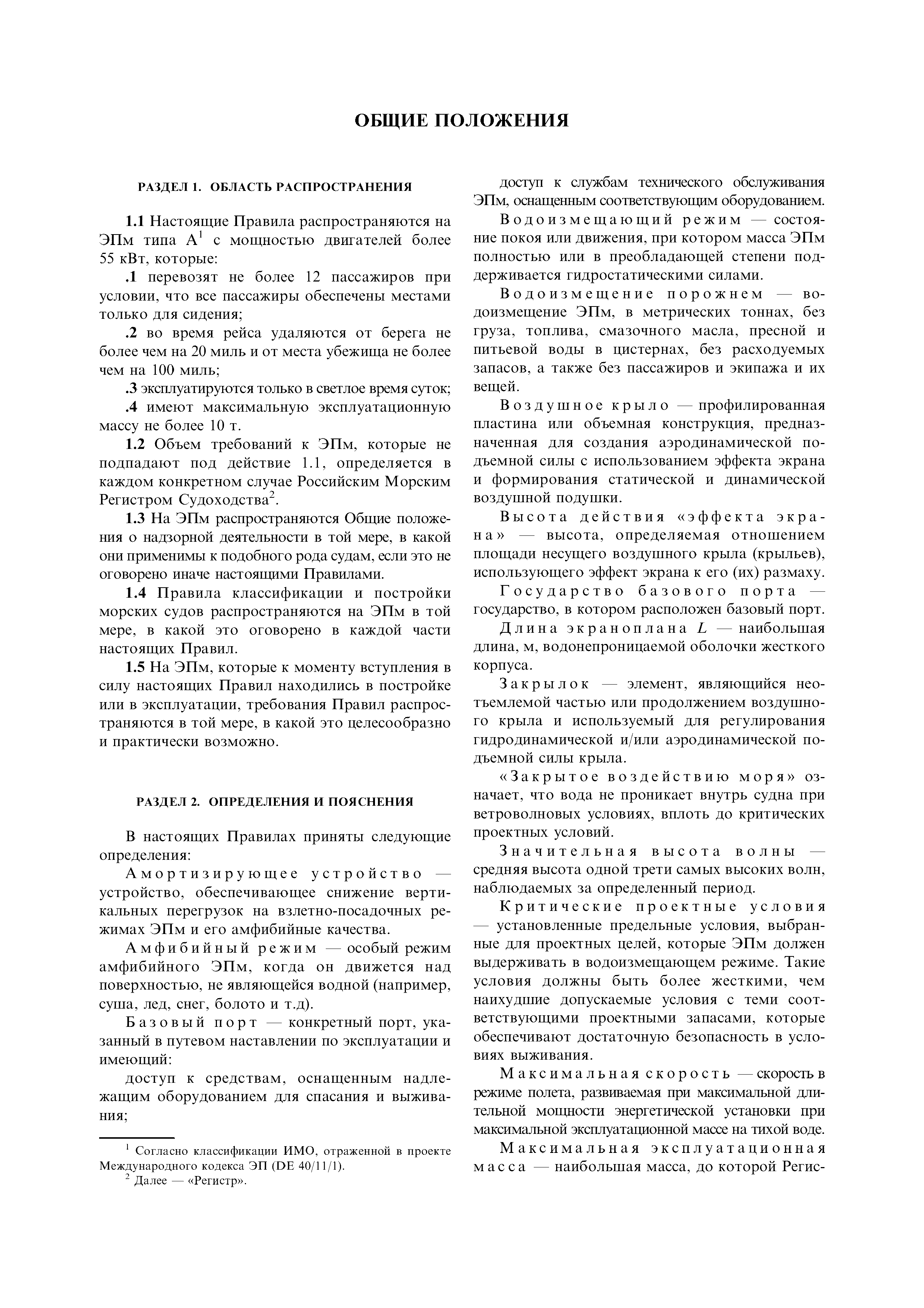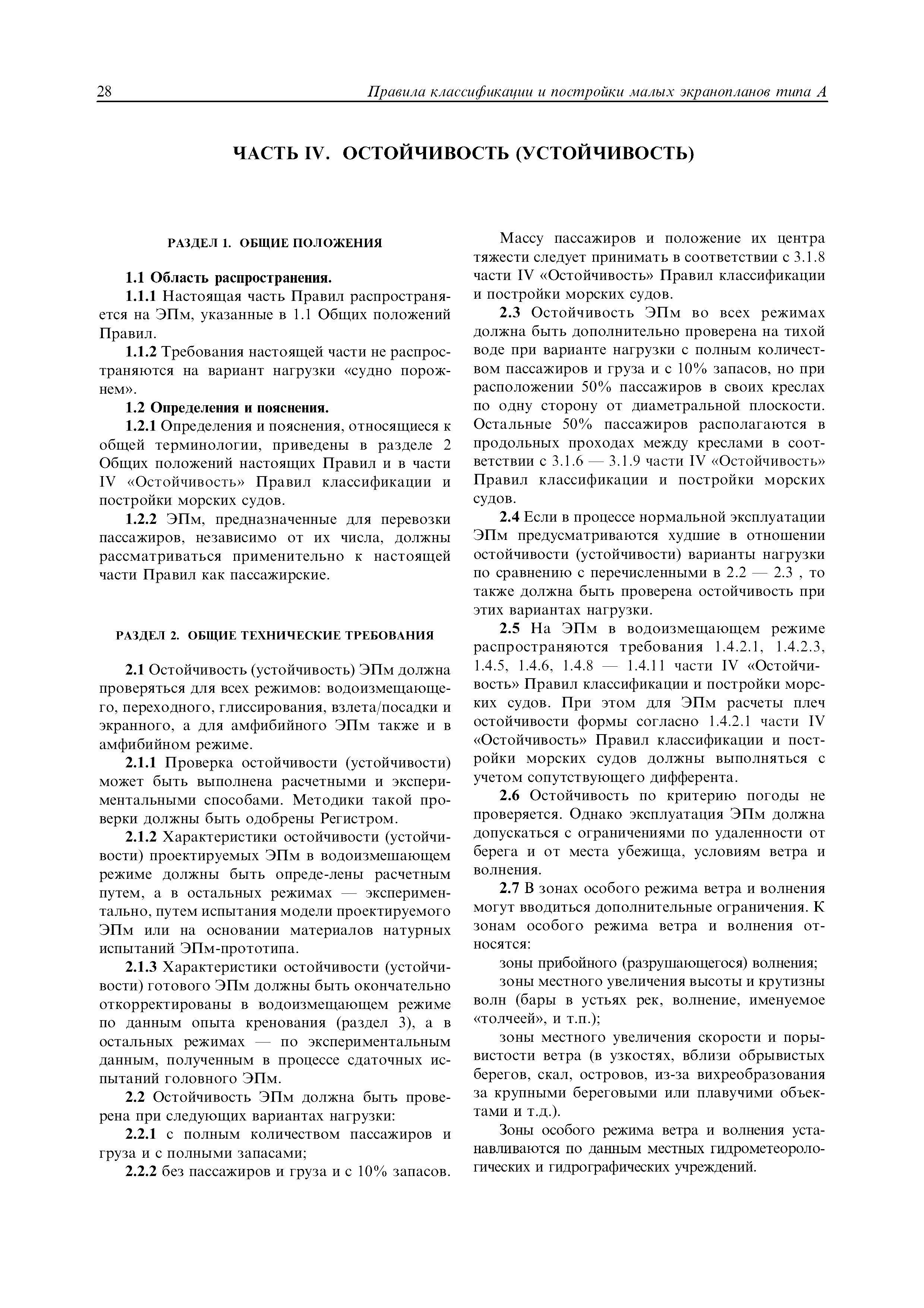 | Область применения: | Правила распространяются на Эпм типа А с мощностью двигателей более 55 кВт, которые перевозят не более 12 пассажиров при условии, что все пассажиры обеспечены местами только для сидения; во время рейса удаляются от берега не более чем на 20 миль и от места убежища не более чем на 100 миль; эксплуатируются только в светлое время суток; имеют максимальную эксплуатационную массу не более 10 т. |