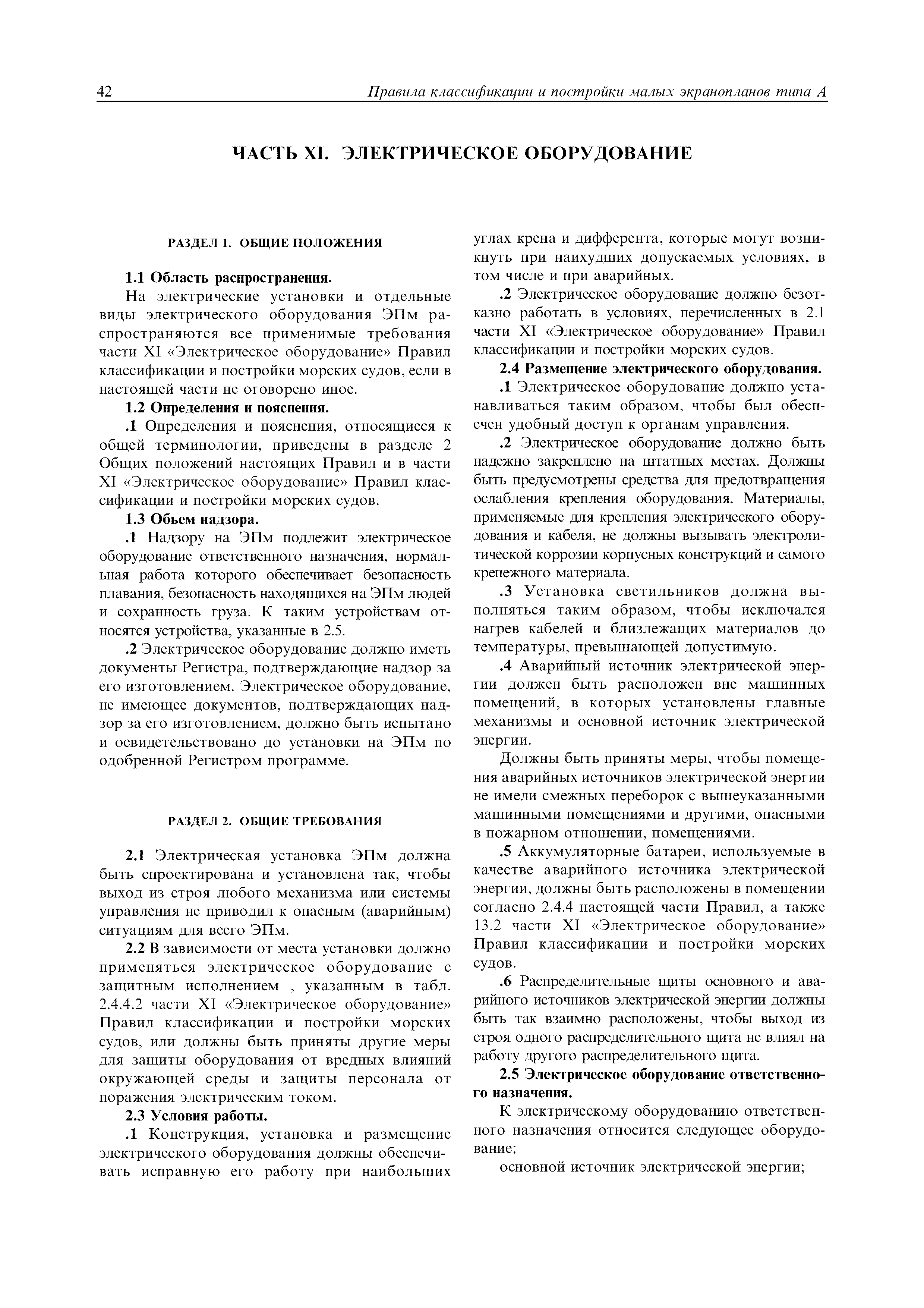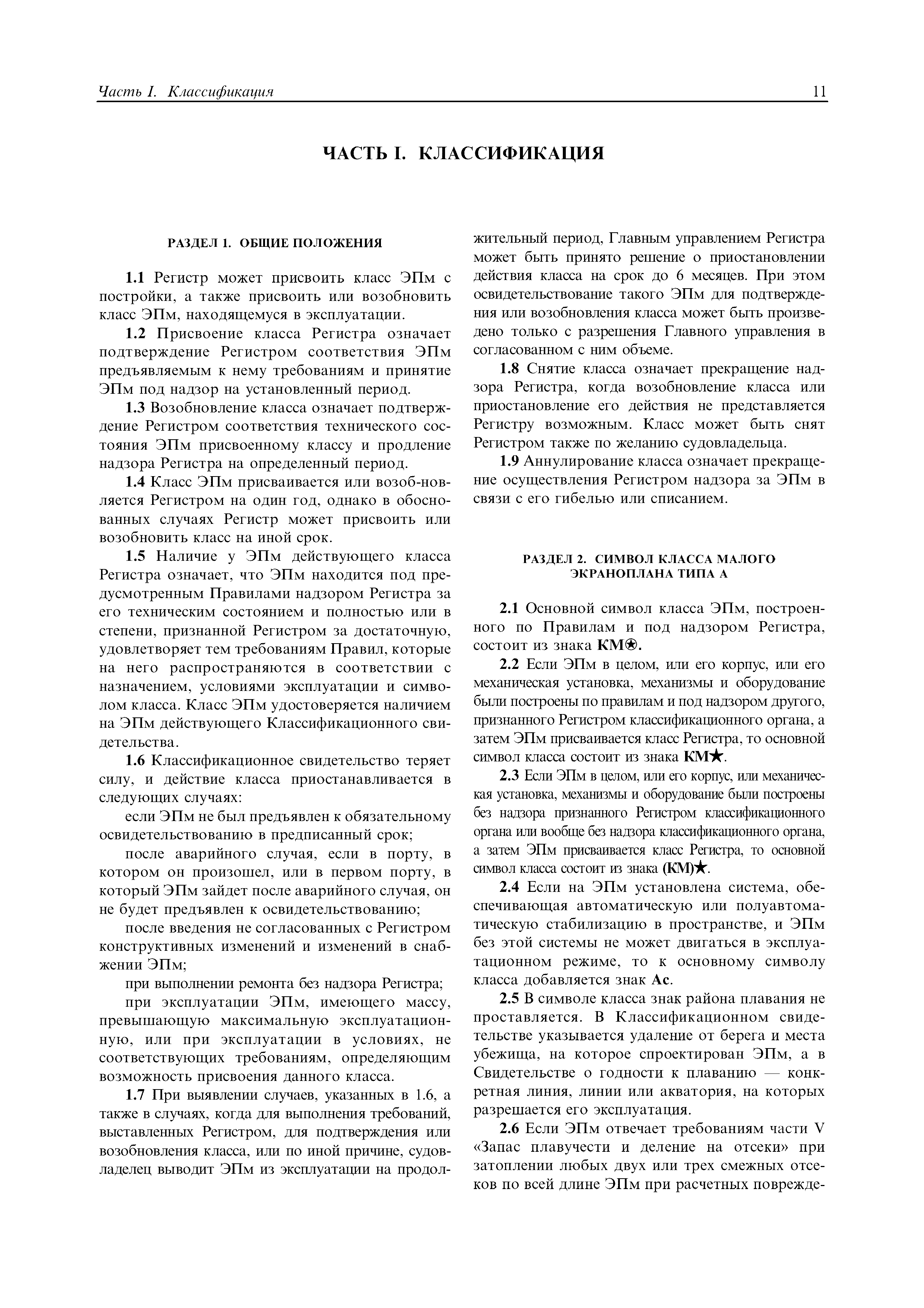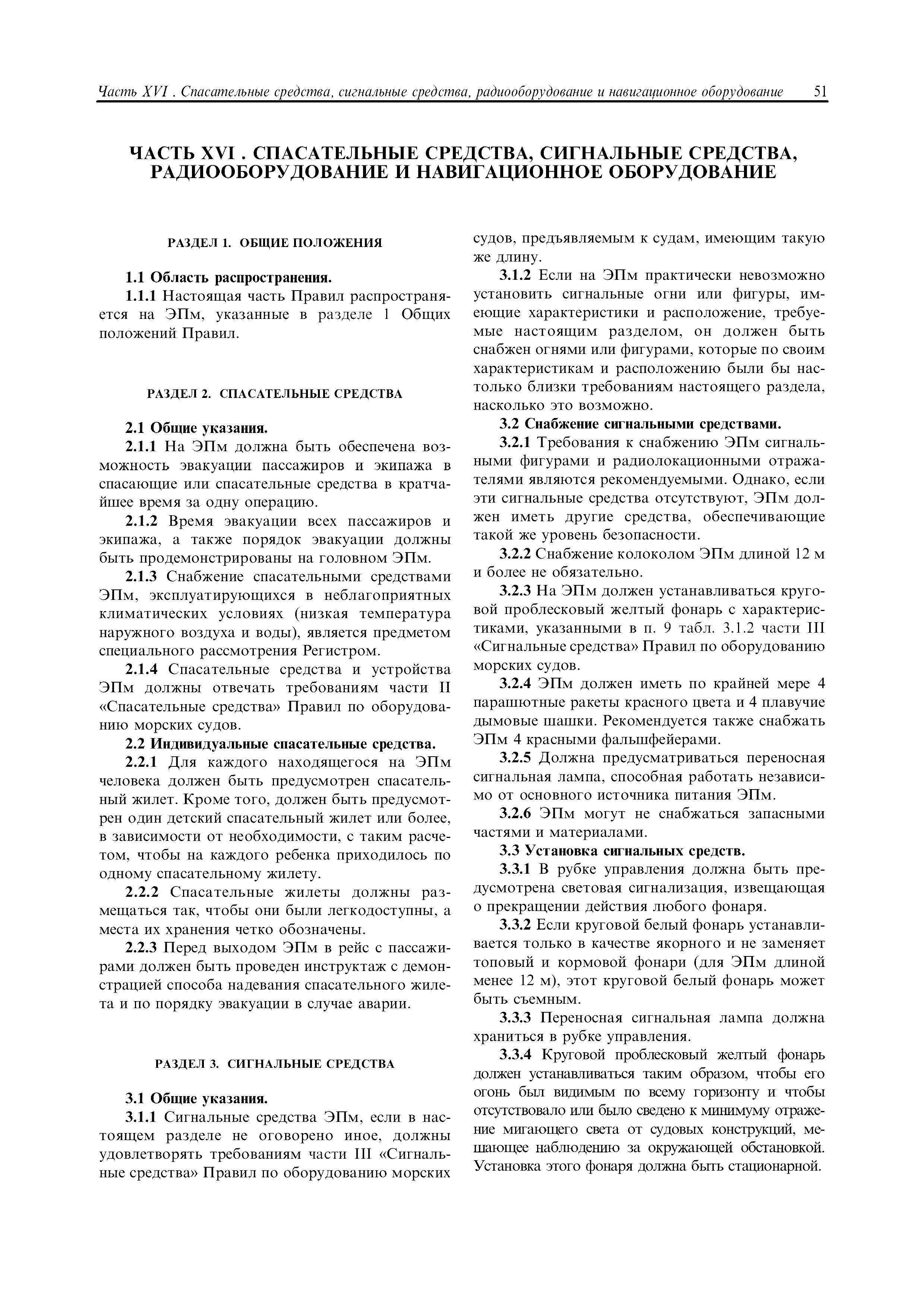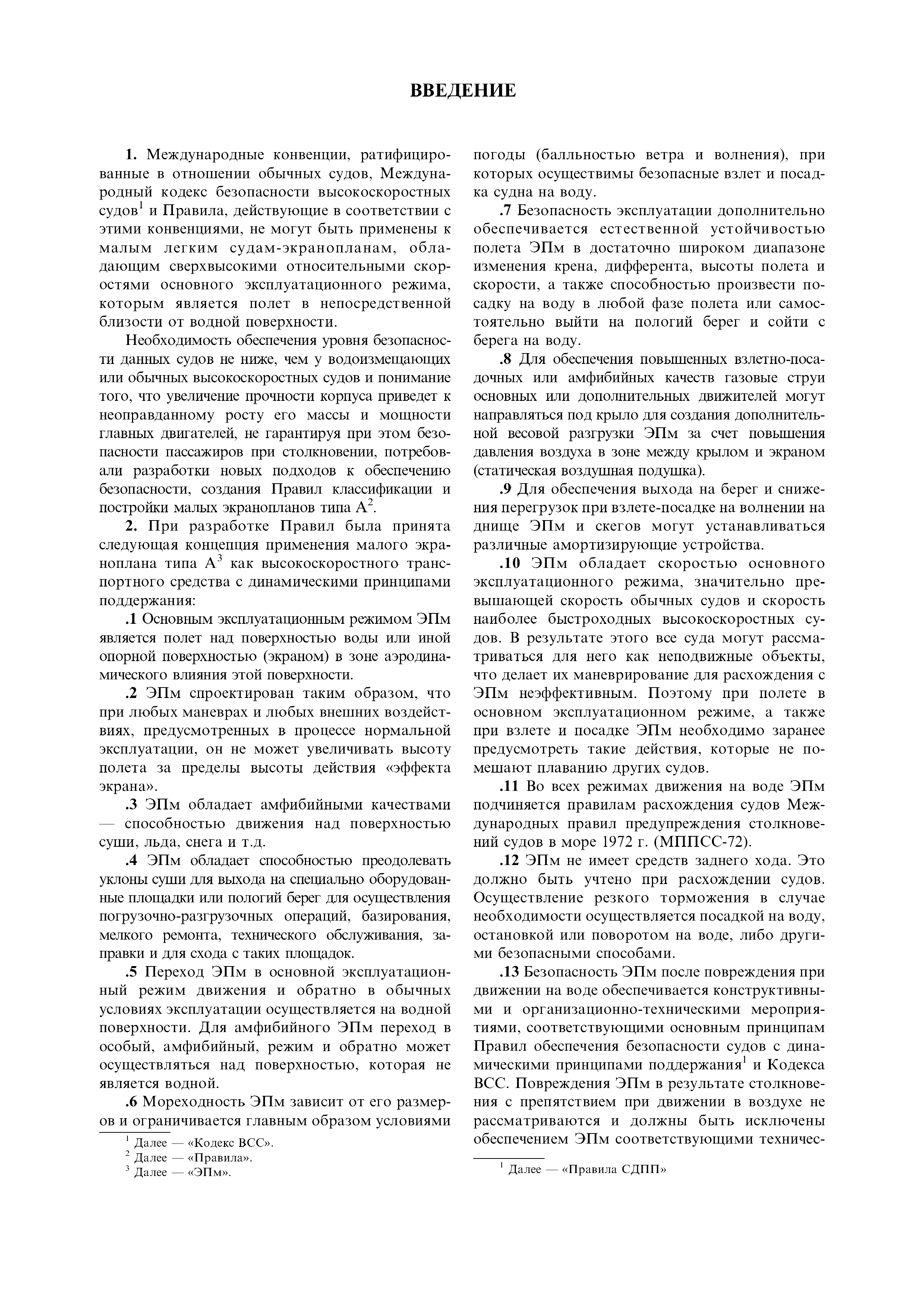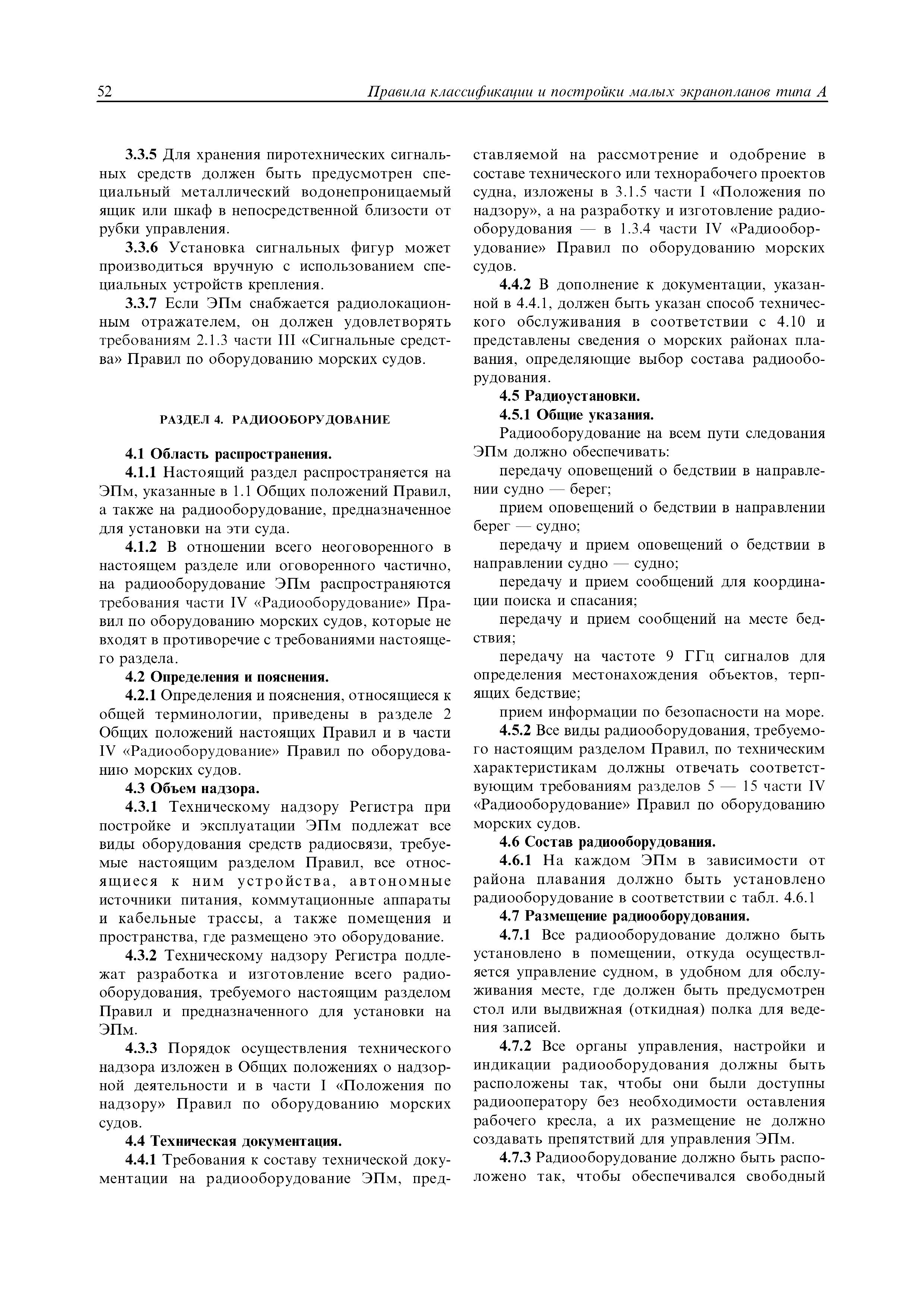 | Область применения: | Правила распространяются на Эпм типа А с мощностью двигателей более 55 кВт, которые перевозят не более 12 пассажиров при условии, что все пассажиры обеспечены местами только для сидения; во время рейса удаляются от берега не более чем на 20 миль и от места убежища не более чем на 100 миль; эксплуатируются только в светлое время суток; имеют максимальную эксплуатационную массу не более 10 т. |
