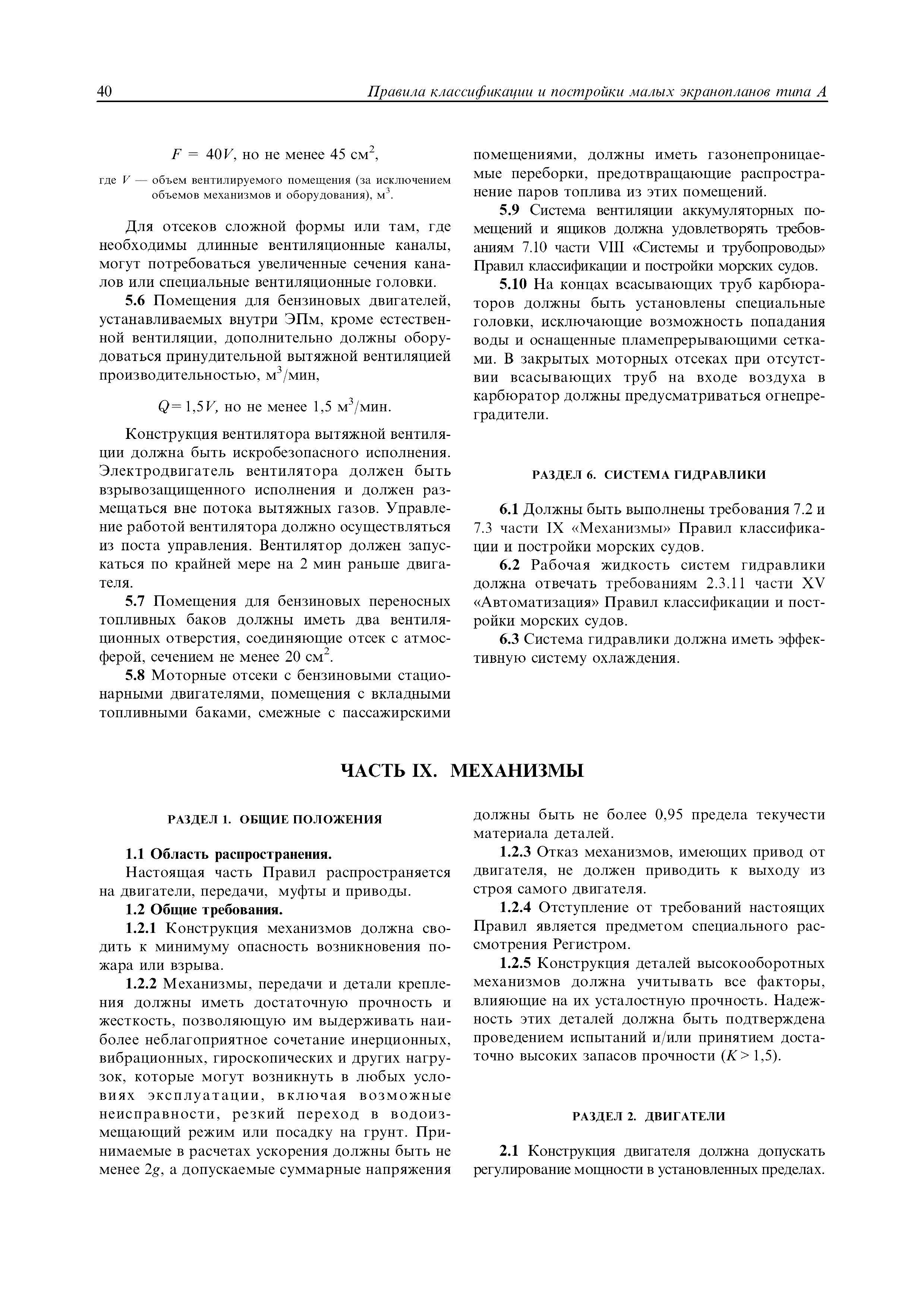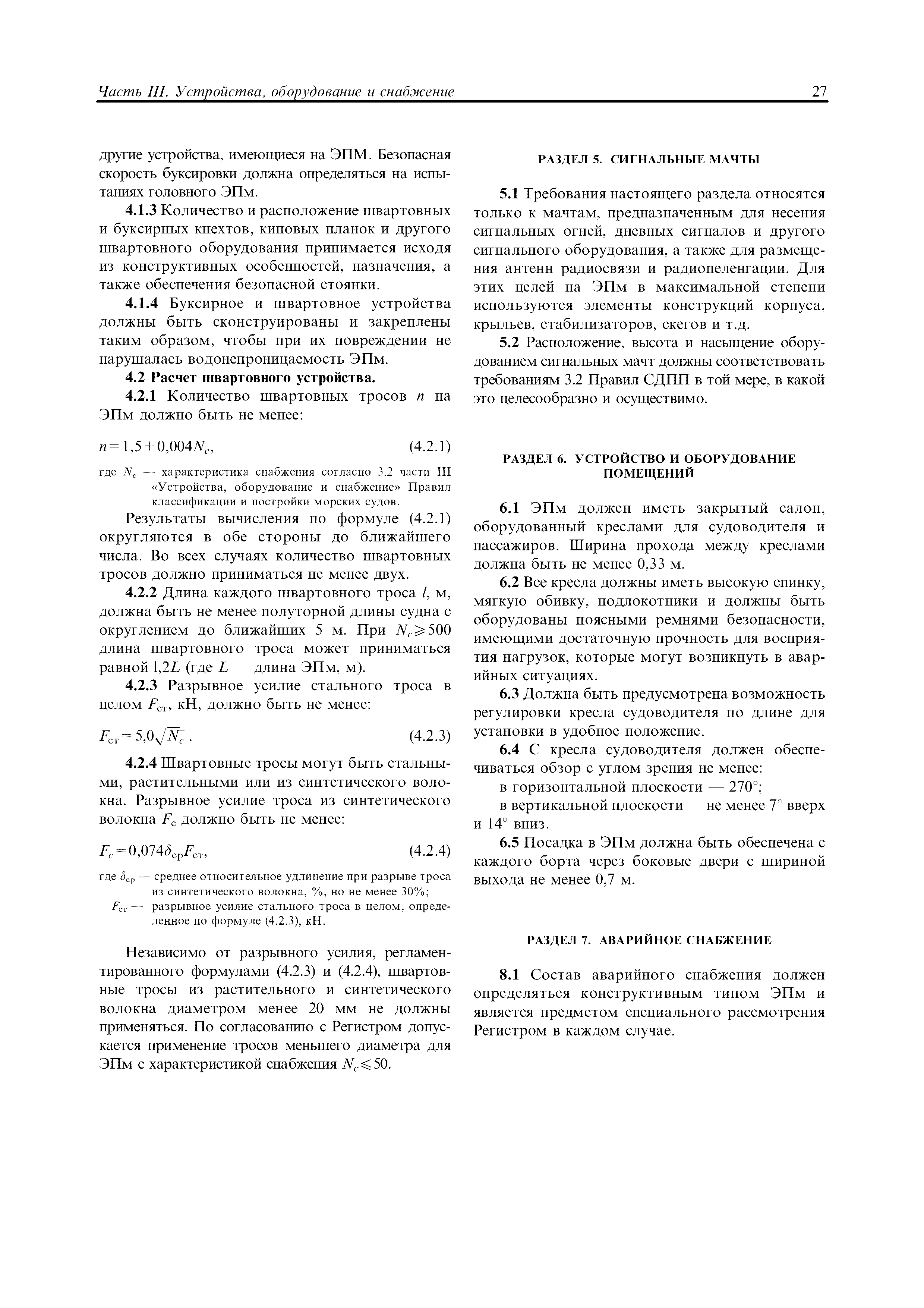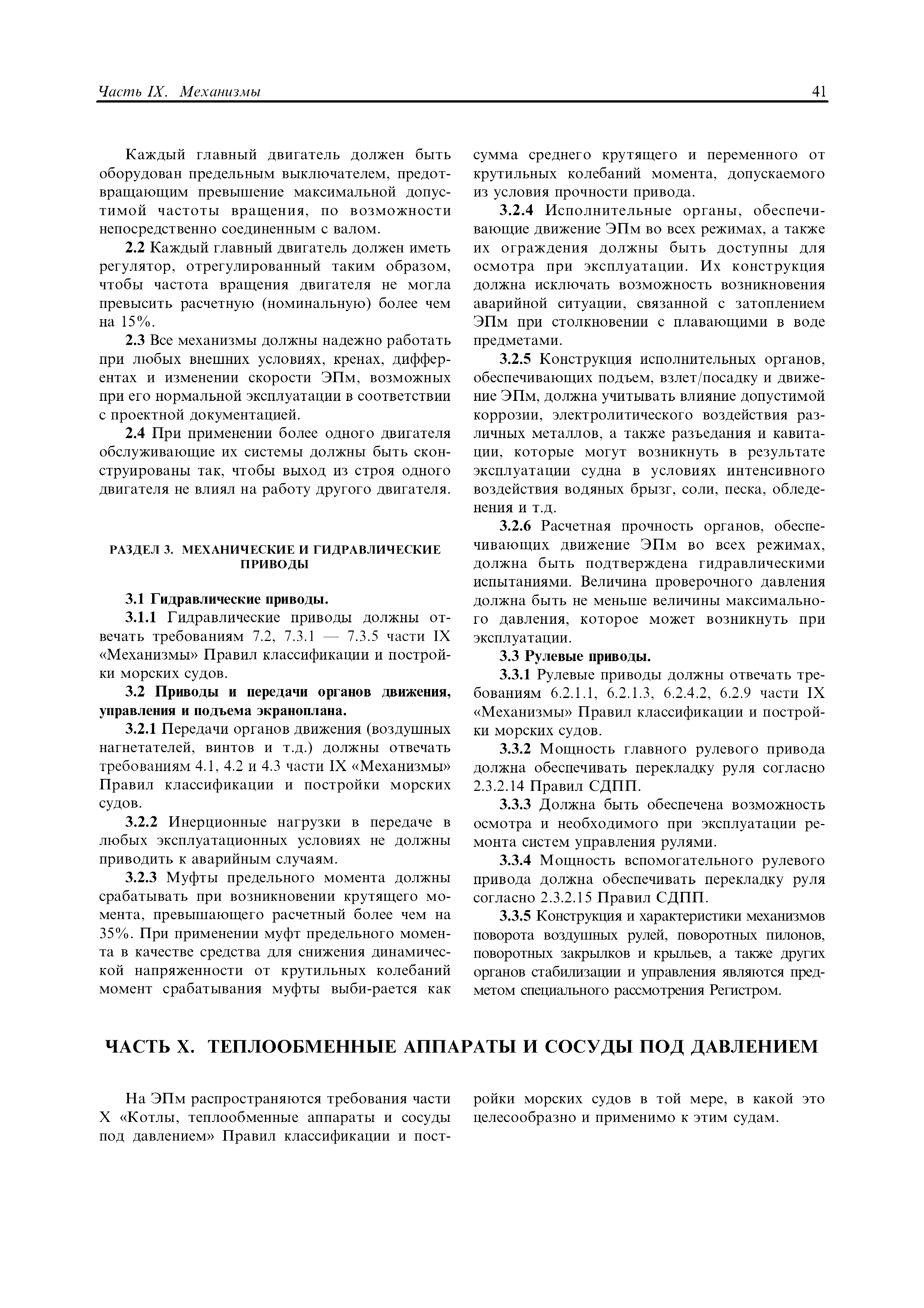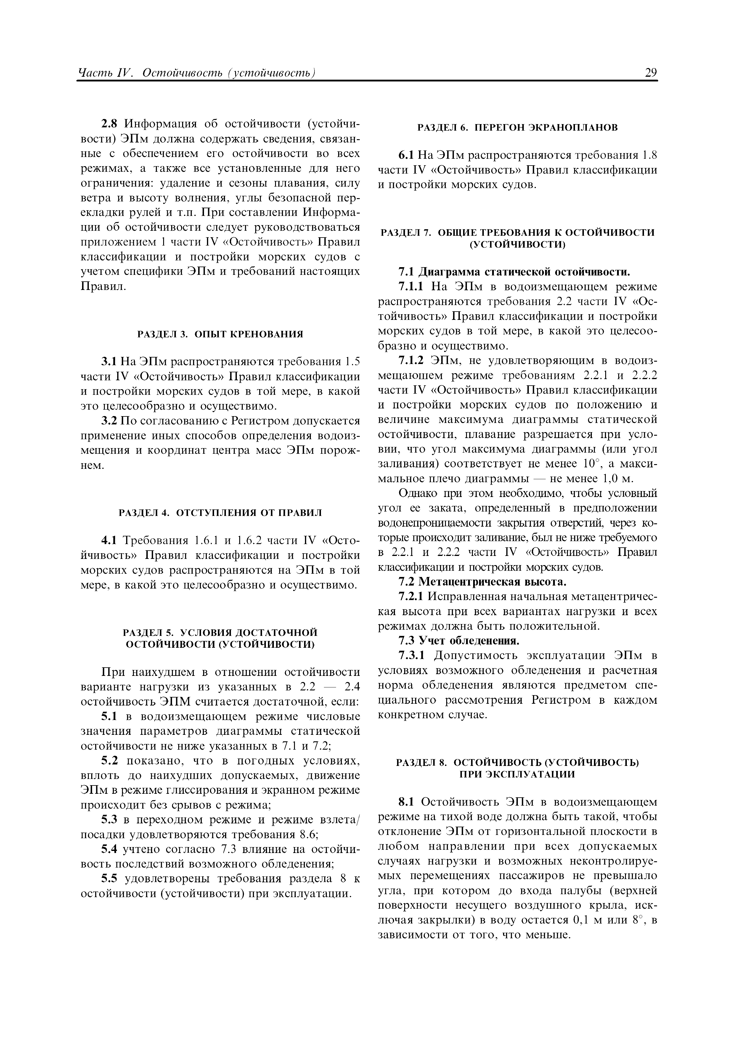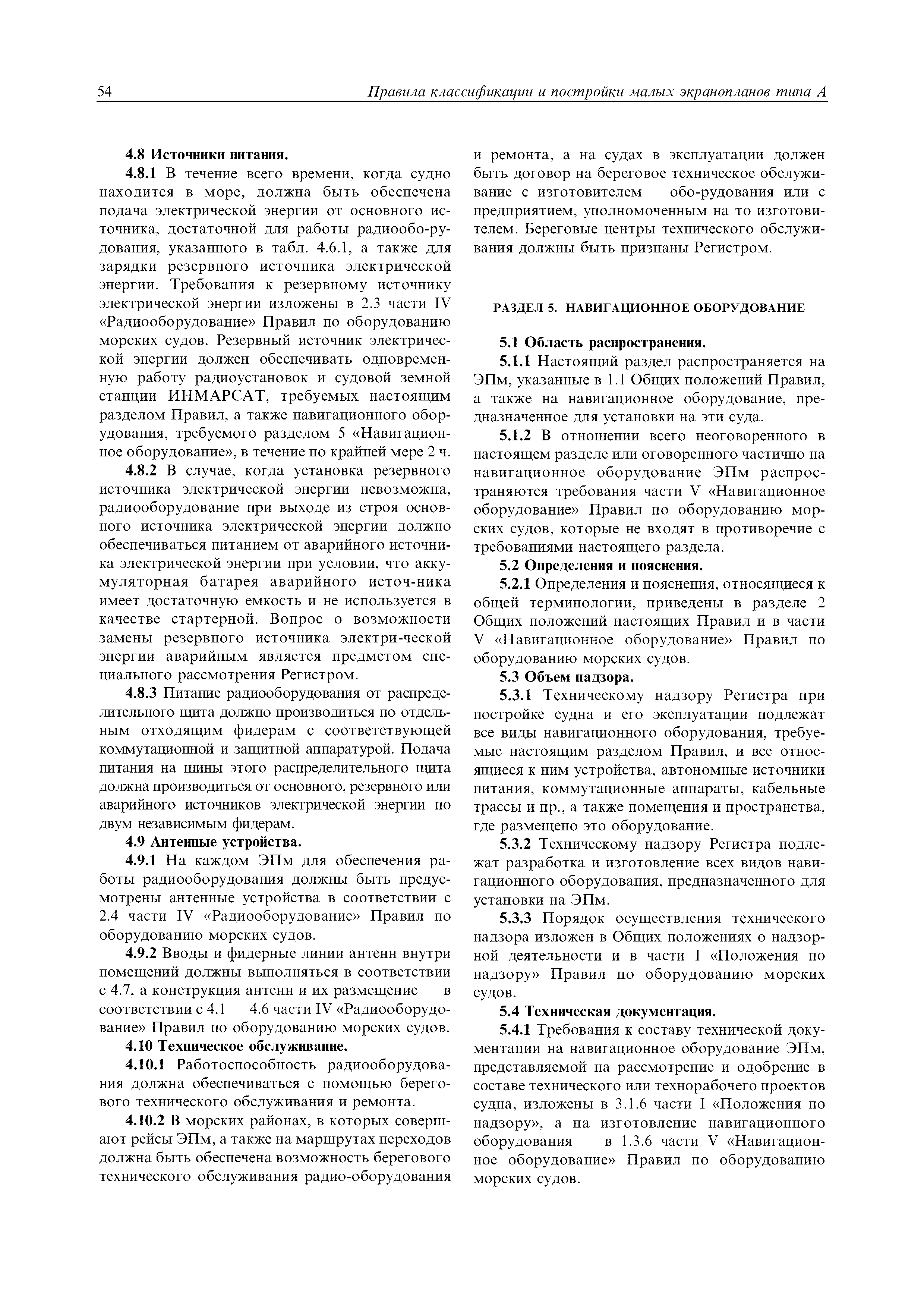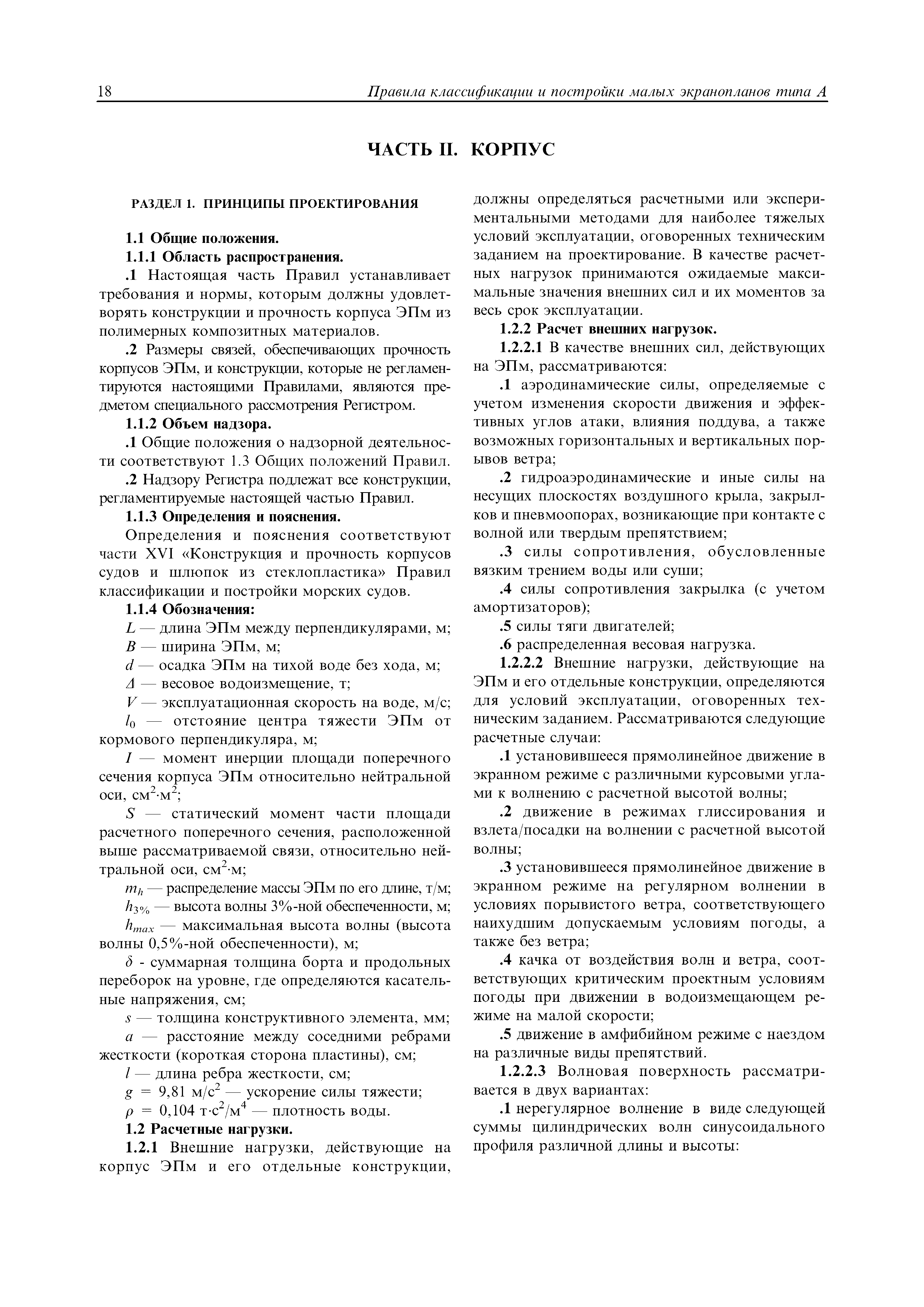 | Область применения: | Правила распространяются на Эпм типа А с мощностью двигателей более 55 кВт, которые перевозят не более 12 пассажиров при условии, что все пассажиры обеспечены местами только для сидения; во время рейса удаляются от берега не более чем на 20 миль и от места убежища не более чем на 100 миль; эксплуатируются только в светлое время суток; имеют максимальную эксплуатационную массу не более 10 т. |