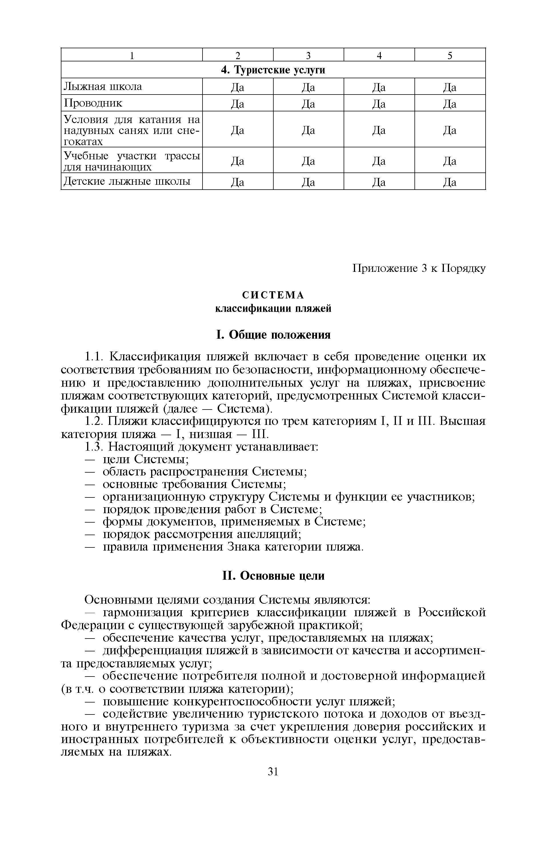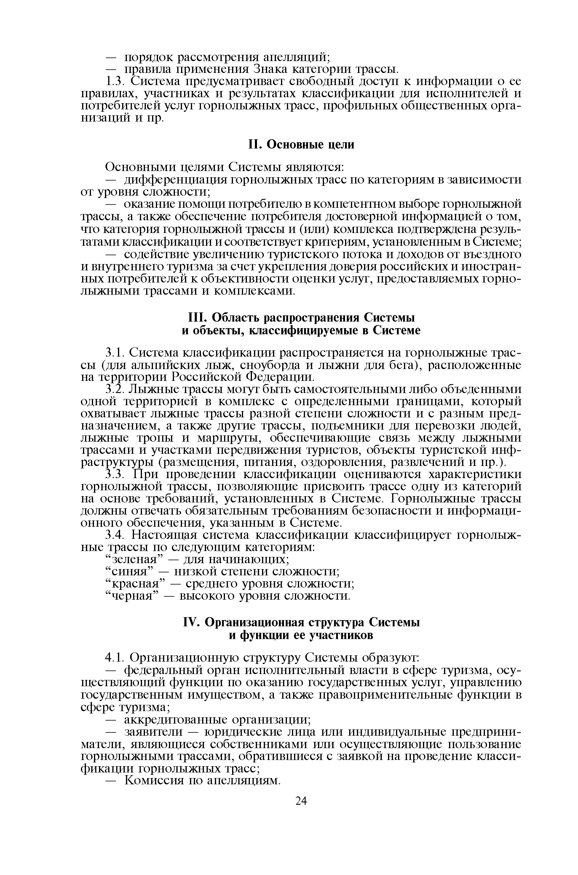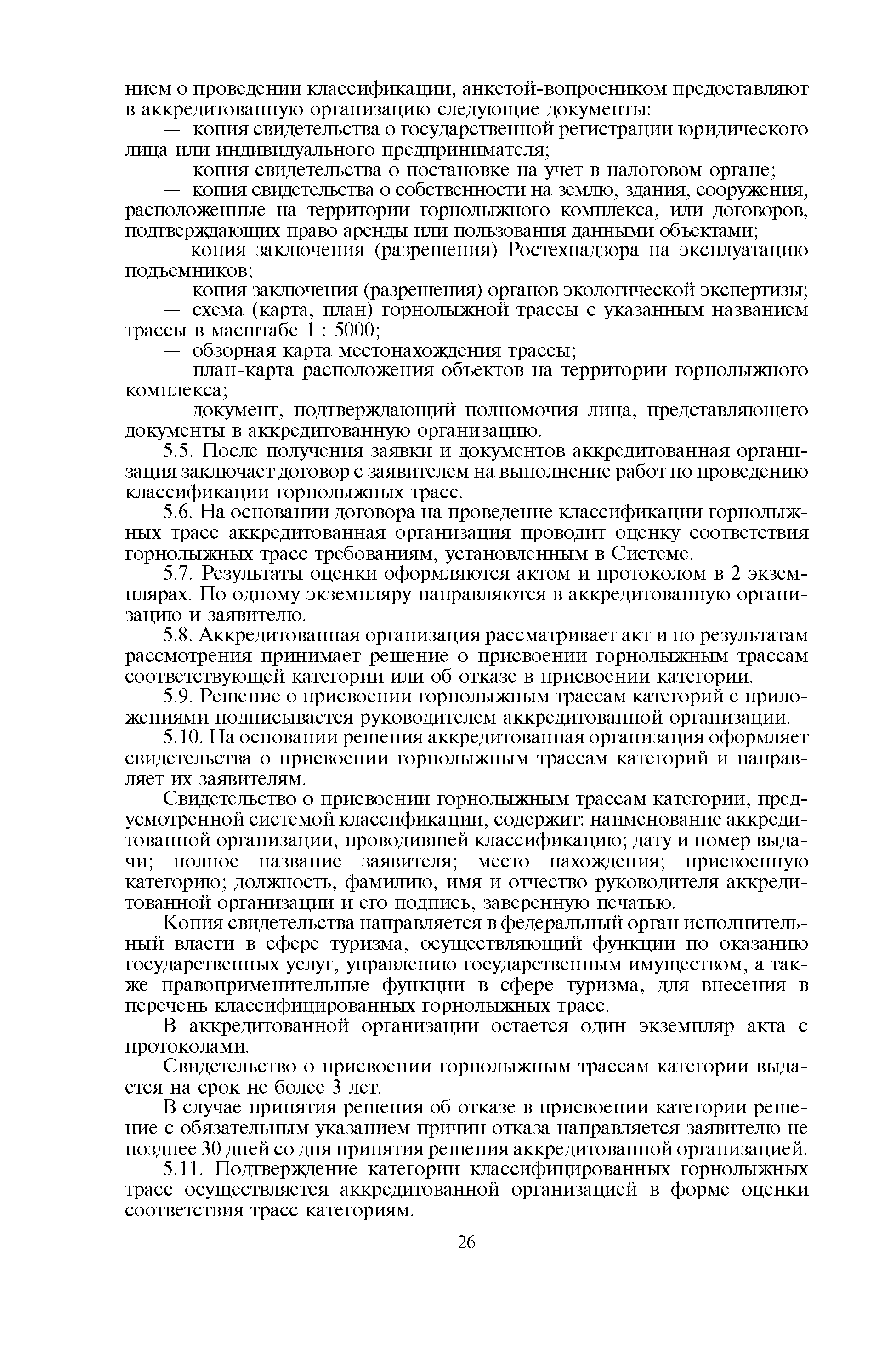 Порядок классификации объектов туристской индустрии, включающих гостиницы и иные средства размещения, горнолыжные трассы и пляжи| Статус: | не действует | | Название рус.: | Порядок классификации объектов туристской индустрии, включающих гостиницы и иные средства размещения, горнолыжные трассы и пляжи | | Дата добавления в базу: | 01.09.2013 | | Дата актуализации: | 01.01.2021 | | Дата введения: | 18.06.2010 | | Дата окончания срока действия: | 14.04.2011 | | Область применения: | Порядок определяет условия и порядок проведения аккредитованными организациями классификации объектов туристской индустрии, включающих гостиницы и иные средства размещения, горнолыжные трассы, пляжи | | Оглавление: | I. Общие положения II. Рассмотрение заявления объекта туристской индустрии и представленных документов и принятие решения о проведении классификации III. Экспертная оценка соответствия объекта туристской индустрии требованиям категории, установленным в соответствующей системе классификации IV. Принятие решения о присвоении объекту туристской индустрии категории, предусмотренной соответствующей системой классификации V. Заключительные положения Приложение 1. Система классификации гостиниц и иных средств размещения Приложение 2. Система классификации горнолыжных трасс Приложение 3. Система классификации пляжей | | Утверждён: | 07.05.2010 Министерство спорта, туризма и молодежной политики РФ (461)