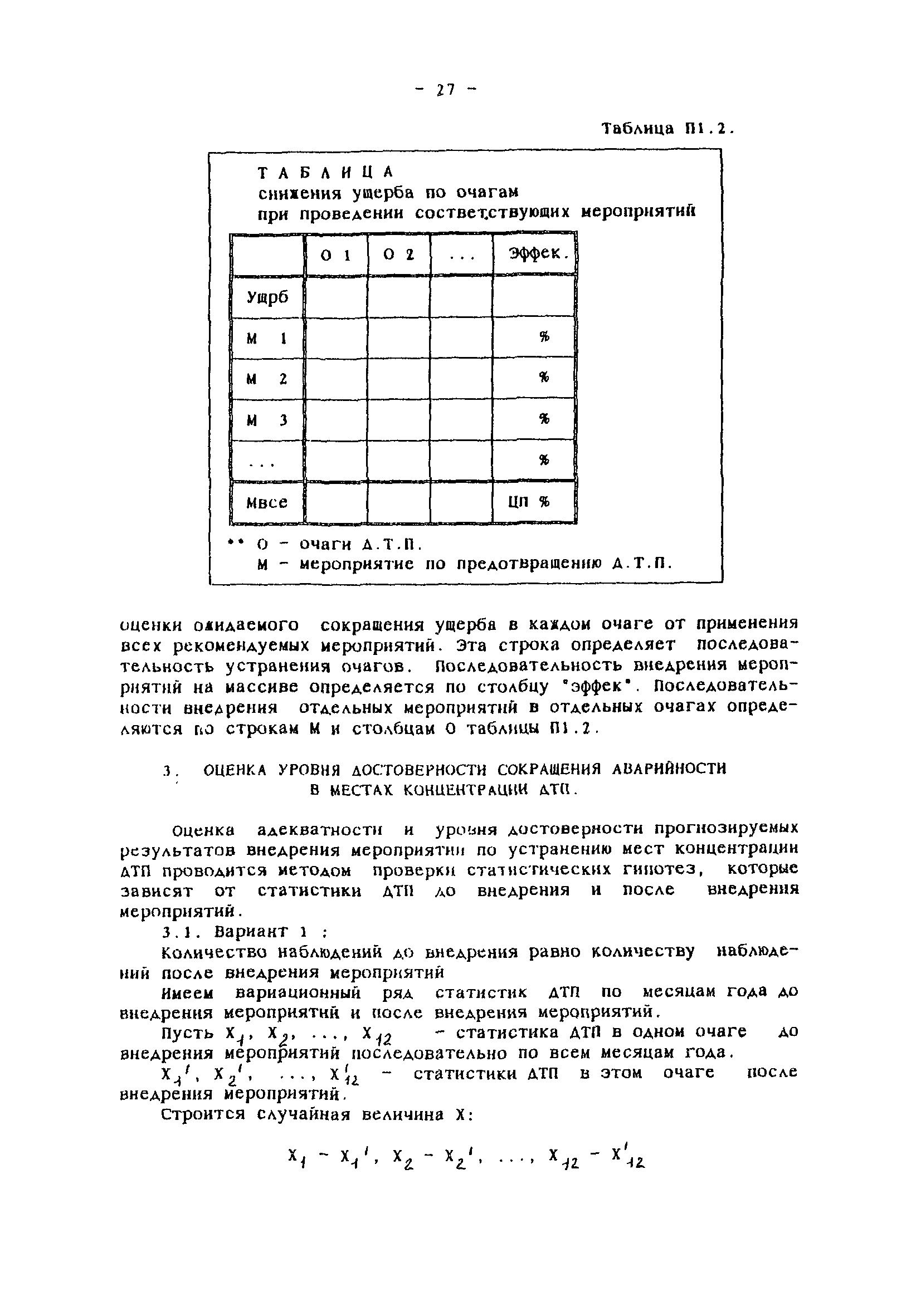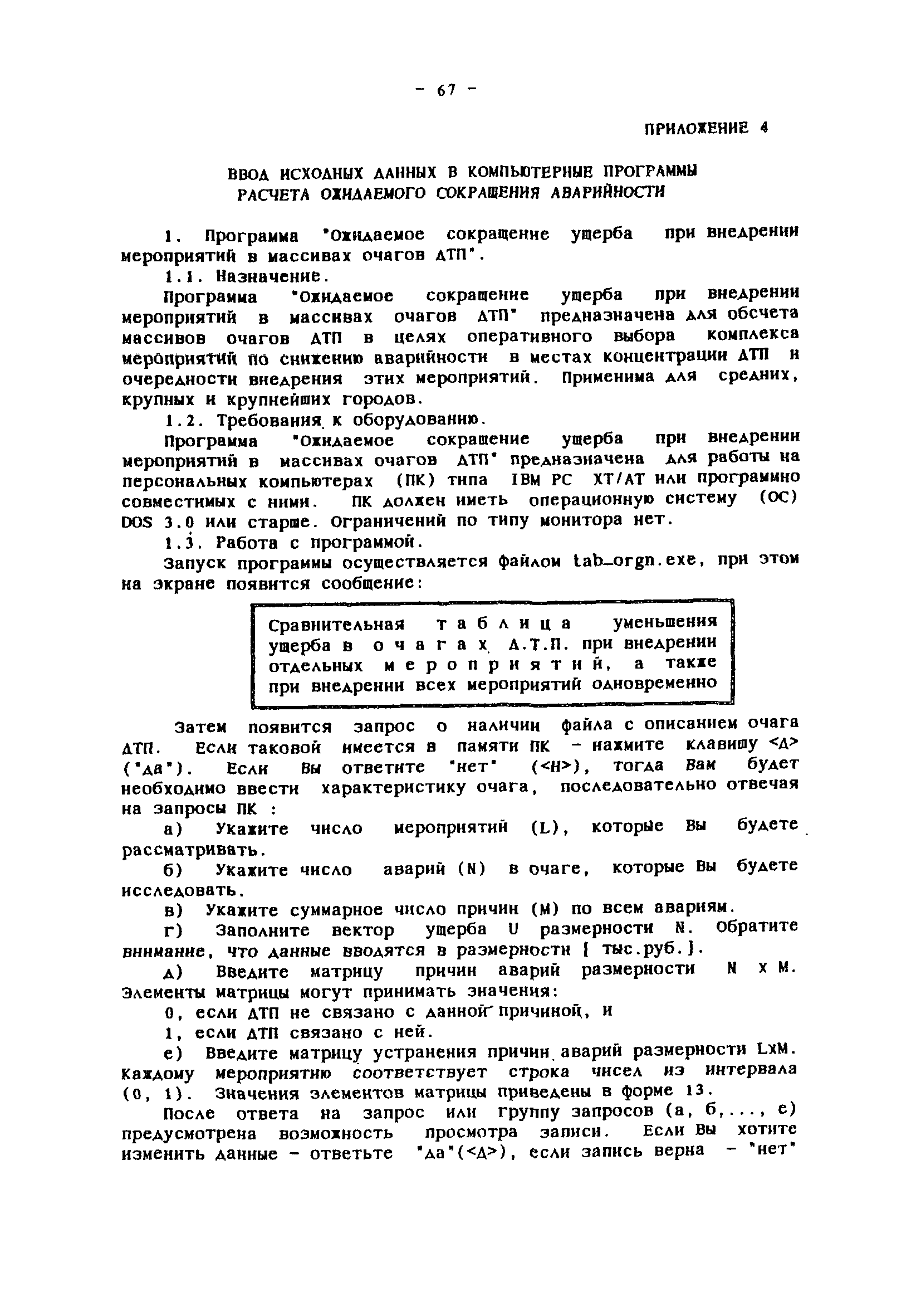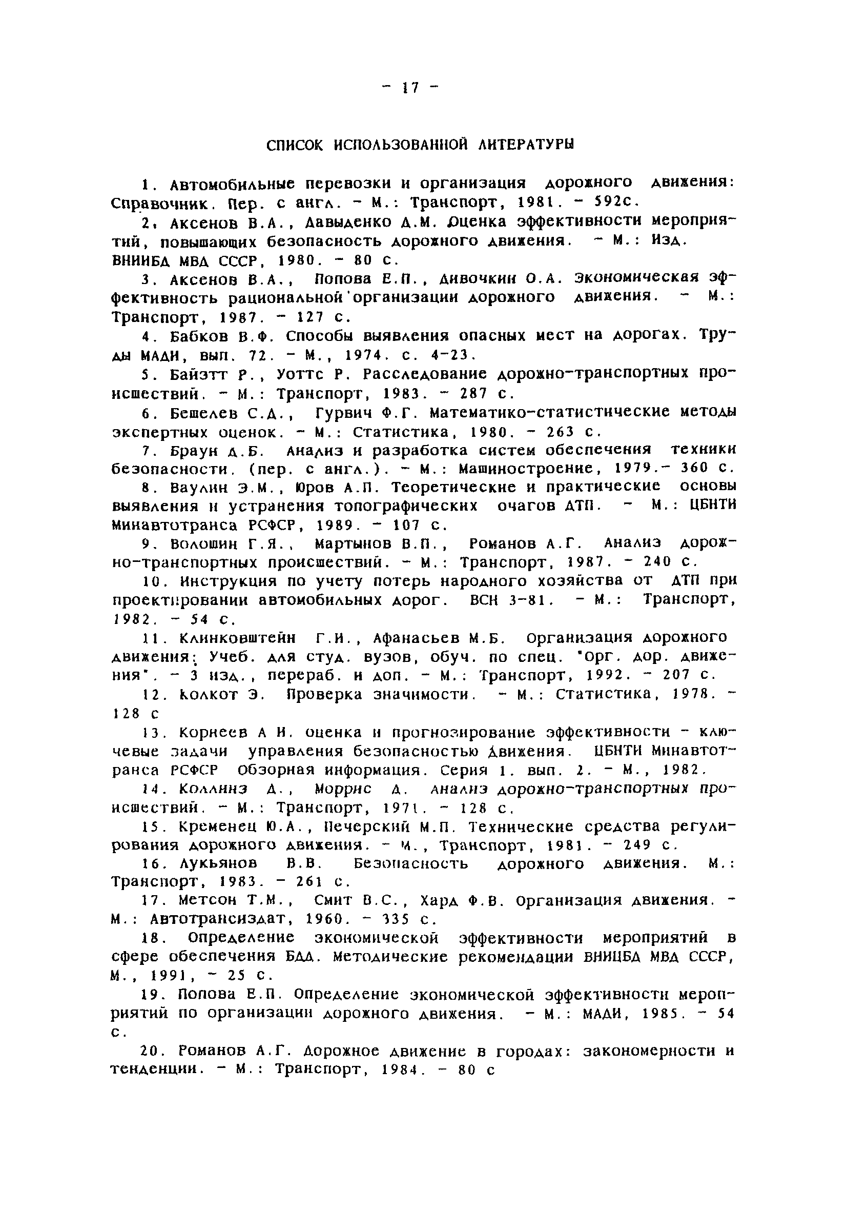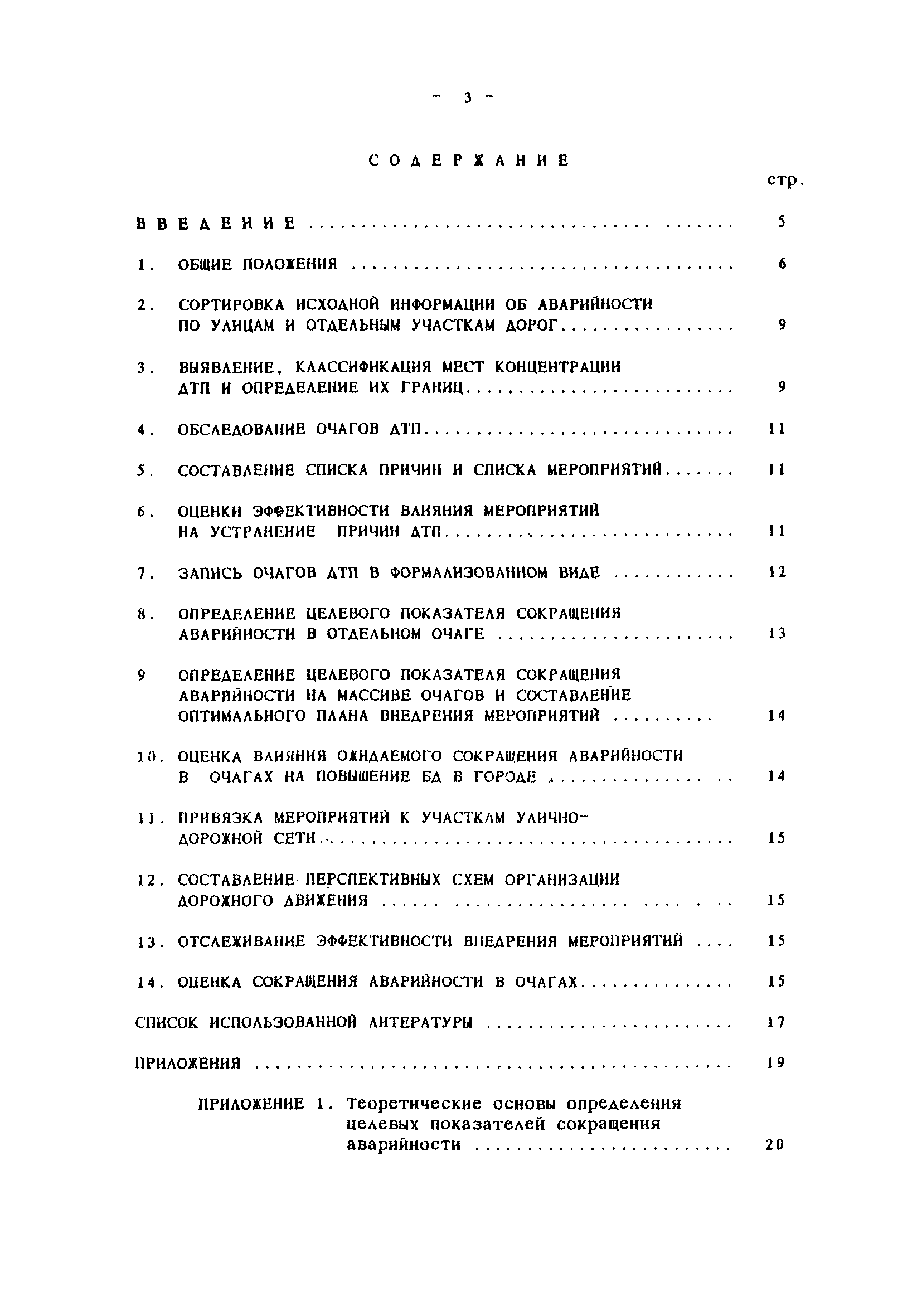 | Оглавление: | Введение Общие положения Сортировка исходной информации об аварийности по улицам и отдельным участкам дорог Выявление, классификация мест концентрации ДТП и определение их границ Обследование очагов ДТП Составление списка причин и списка мероприятий Оценки эффективности влияния мероприятий на устранение причин ДТП Запись очагов ДТП в формализованном виде Определение целевого показателя сокращения аварийности в отдельном очаге Определение целевого показателя сокращения аварийности на массиве очагов и составление оптимального плана внедрения мероприятий Оценка влияния ожидаемого сокращения аварийности в очагах на повышение БД в городе Привязка мероприятий к участкам улично-дорожной сети Составление перспективных схем организации дорожного движения Отслеживание эффективности внедрения мероприятий Оценка сокращения аварийности в очагах Список использованной литературы Приложения Приложение 1. Теоретические основы определения целевых показателей сокращения аварийности Приложение 2. План реализации программно- целевых методов сокращения аварийности Приложение 3. Формы для реализации программно-целевых методов сокращения аварийности в местах концентрации дорожно-транспортных происшествий Приложение 4. Ввод исходных данных в компьютерные программы расчета ожидаемого сокращения аварийности Приложение 5. Примеры расчета целевых показателей сокращения аварийности в местах концентраций ДТП |