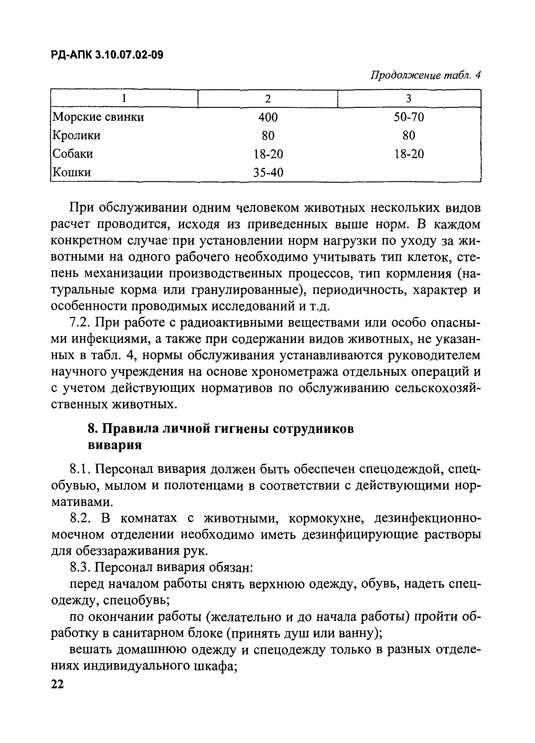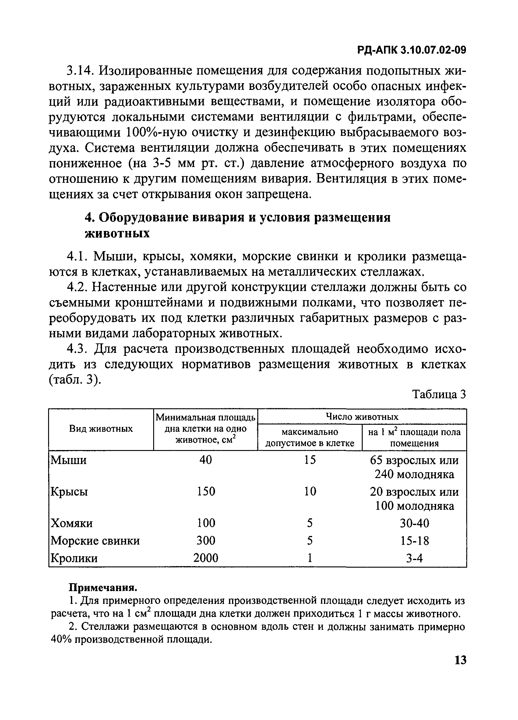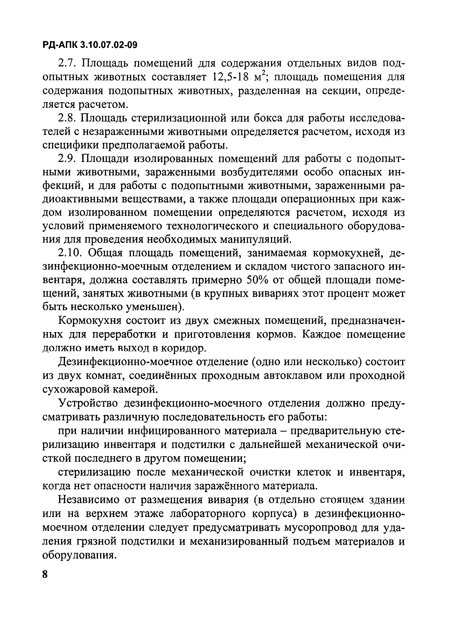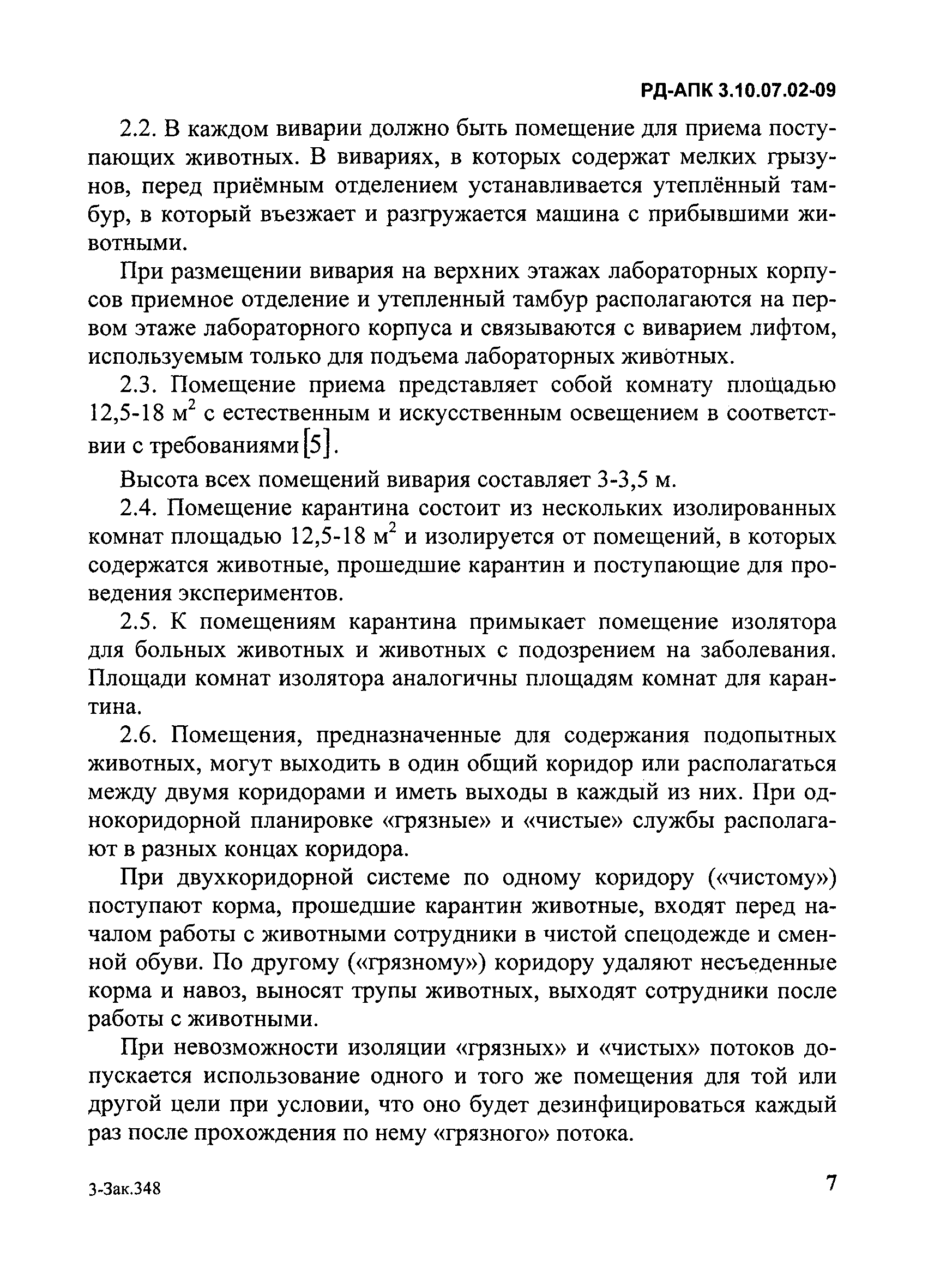 | Оглавление: | 1. Общие положения 2. Состав, взаиморасположение и нормы площади помещений вивариев 3. Ветеринарно-санитарные и технологические требования к строительным решениям помещений вивария и инженерному оборудованию 4. Оборудование вивария и условия размещения животных 5. Прием животных в виварий 6. Режим работы и основные правила содержания животных 7. Штатная численность обслуживающего персонала вивария 8. Правила личной гигиены сотрудников вивария Приложение А. Методы фиксации различных видов животных Список использованных и рекомендуемых нормативных, нормативно-методических и рекомендательных источников |