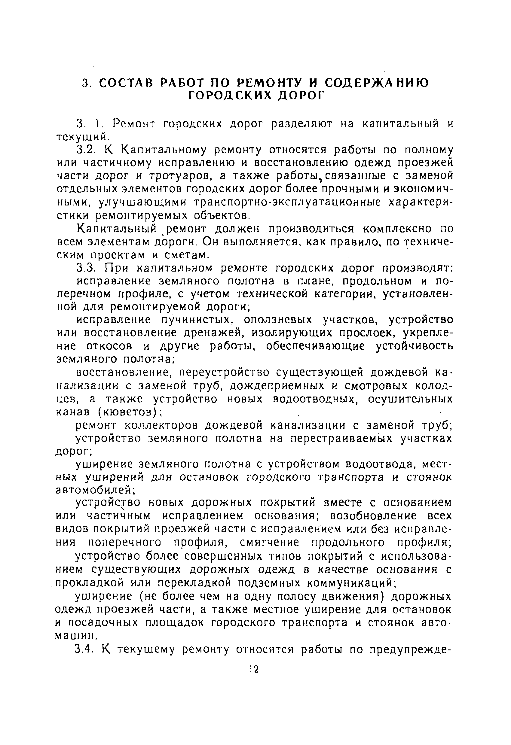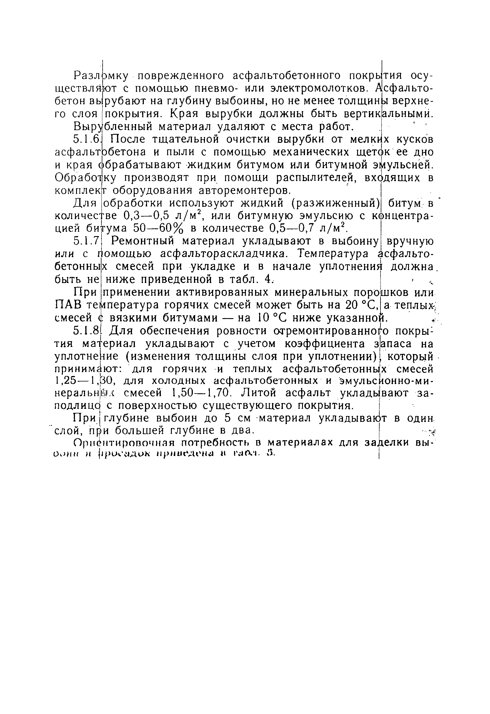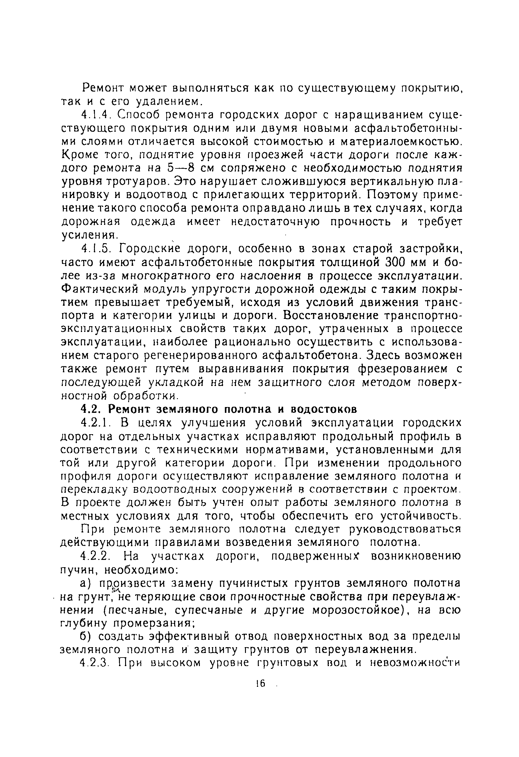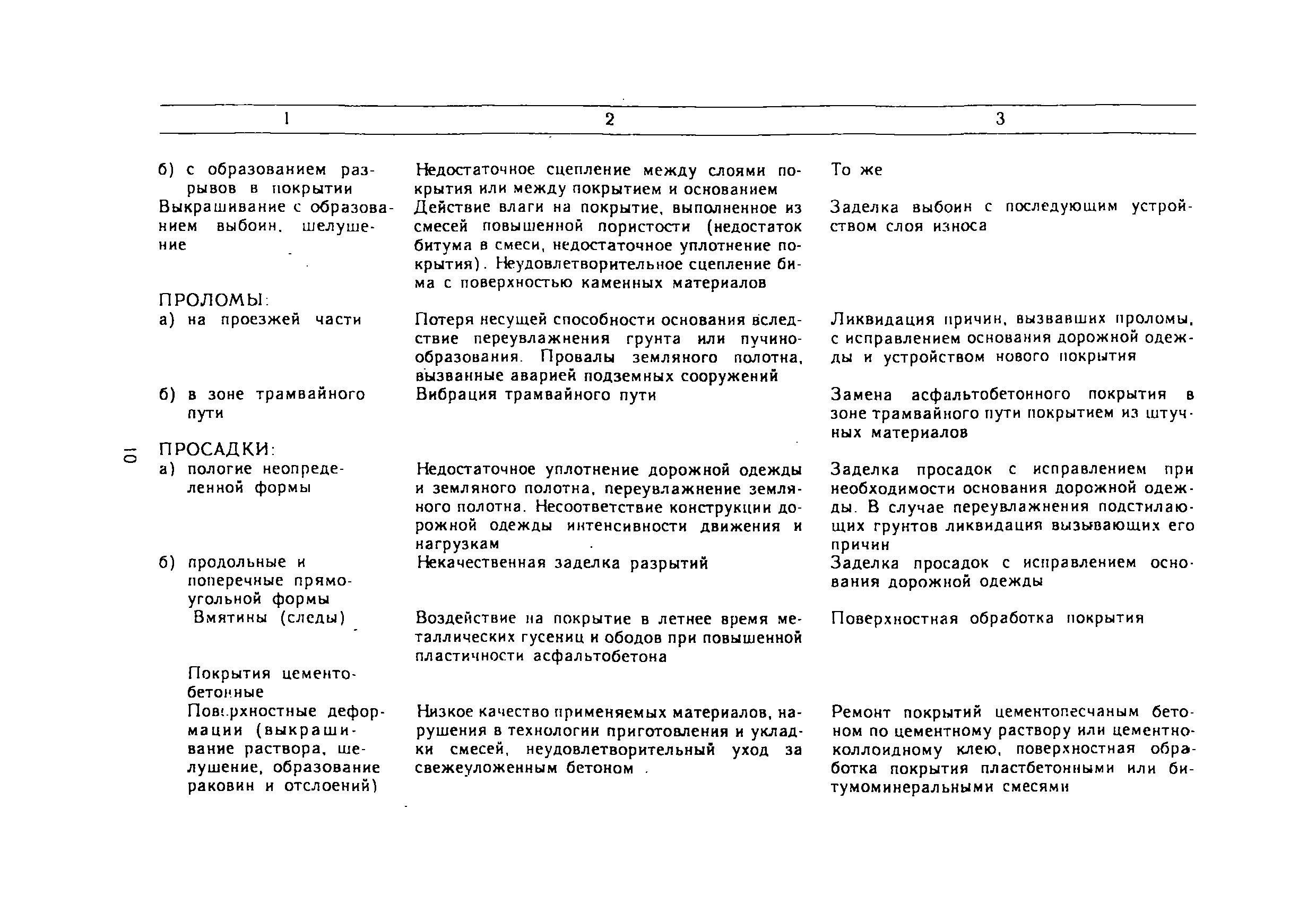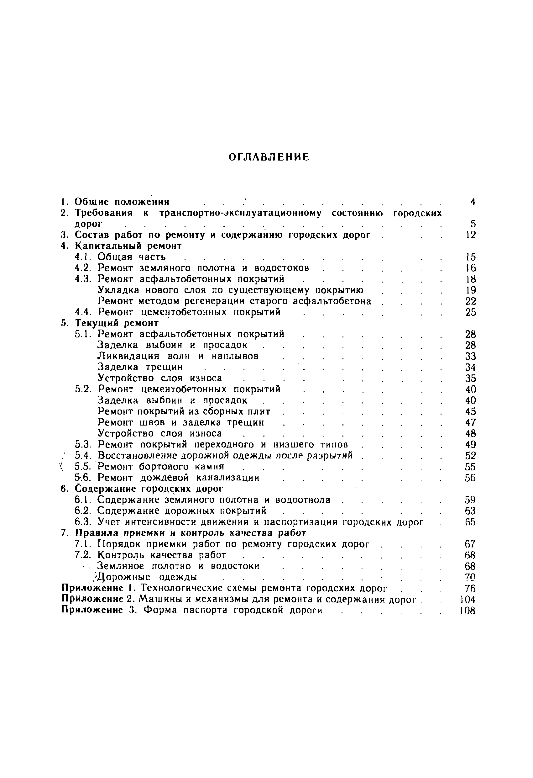 | Оглавление: | 1. Общие положения 2. Требования к транспортно-эксплуатационному состоянию городских дорог 3. Состав работ по ремонту и содержанию городских дорог 4. Капитальный ремонт 4.1 Общая часть 4.2 Ремонт земляного полотна и водостоков 4.3 Ремонт асфальтобетонных покрытий Укладка нового слоя по существующему покрытию Ремонт методом регенерации старого асфальтобетона 4.4 Ремонт цементобетонных покрытий 5. Текущий ремонт 5.1 Ремонт асфальтобетонных покрытий Заделка выбоин и просадок Ликвидация волн и наплывов Заделка трещин Устройство слоя износа 5.2 Ремонт цементобетонных покрытий Заделка выбоин и просадок Ремонт покрытий из сборных плит Ремонт швов и заделка трещин Устройство слоя износа 5.3 Ремонт покрытий переходного и низшего типов 5.4 Восстановление дорожной одежды после разрытий 5.5 Ремонт бортового камня 5.6 Ремонт дождевой канализации 6. Содержание городских дорог 6.1 Содержание земляного полотна и водоотвода 6.2 Содержание дородных покрытий 6.3 Учет интенсивности движения и паспортизация городских дорог 7. Правила приемки и контроль качества работ 7.1 Порядок приемки работ по ремонту городских улиц 7.2 Контроль качества работ Земляное полотно и водостоки Дорожные одежды Приложение 1. Технологические схемы ремонта городских дорог Приложение 2. Машины и механизмы для ремонта и содержания дорог Приложение 3. Форма паспорта городской дороги |