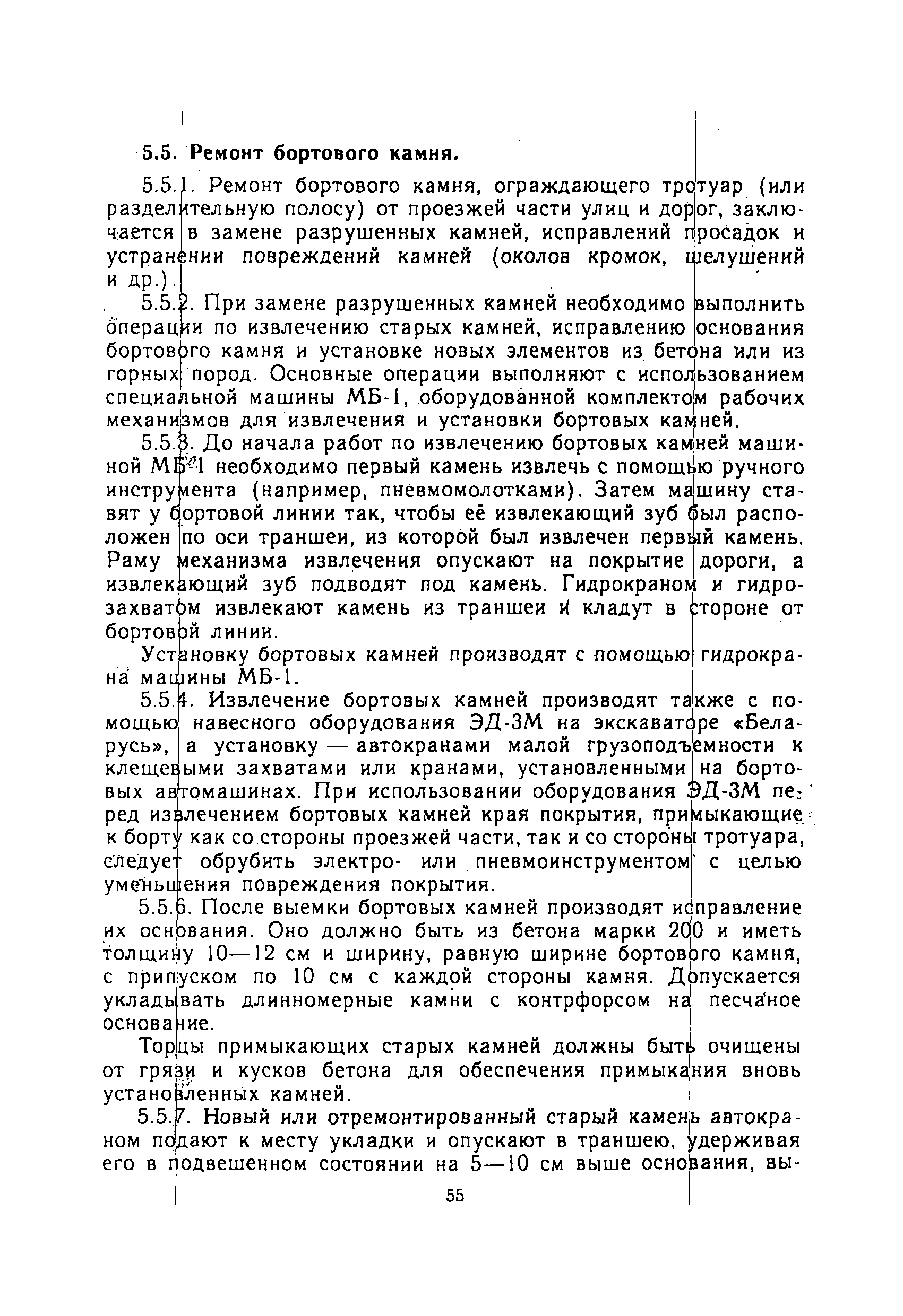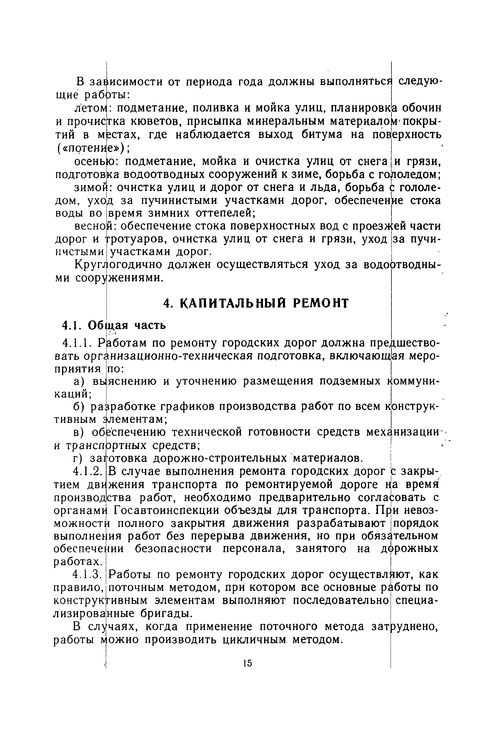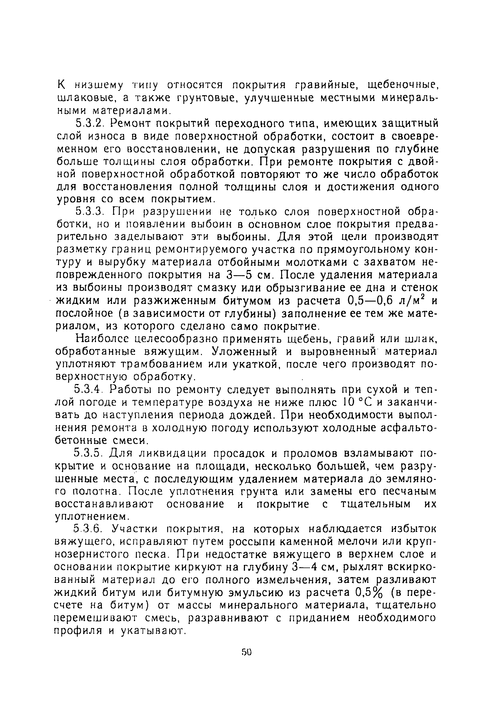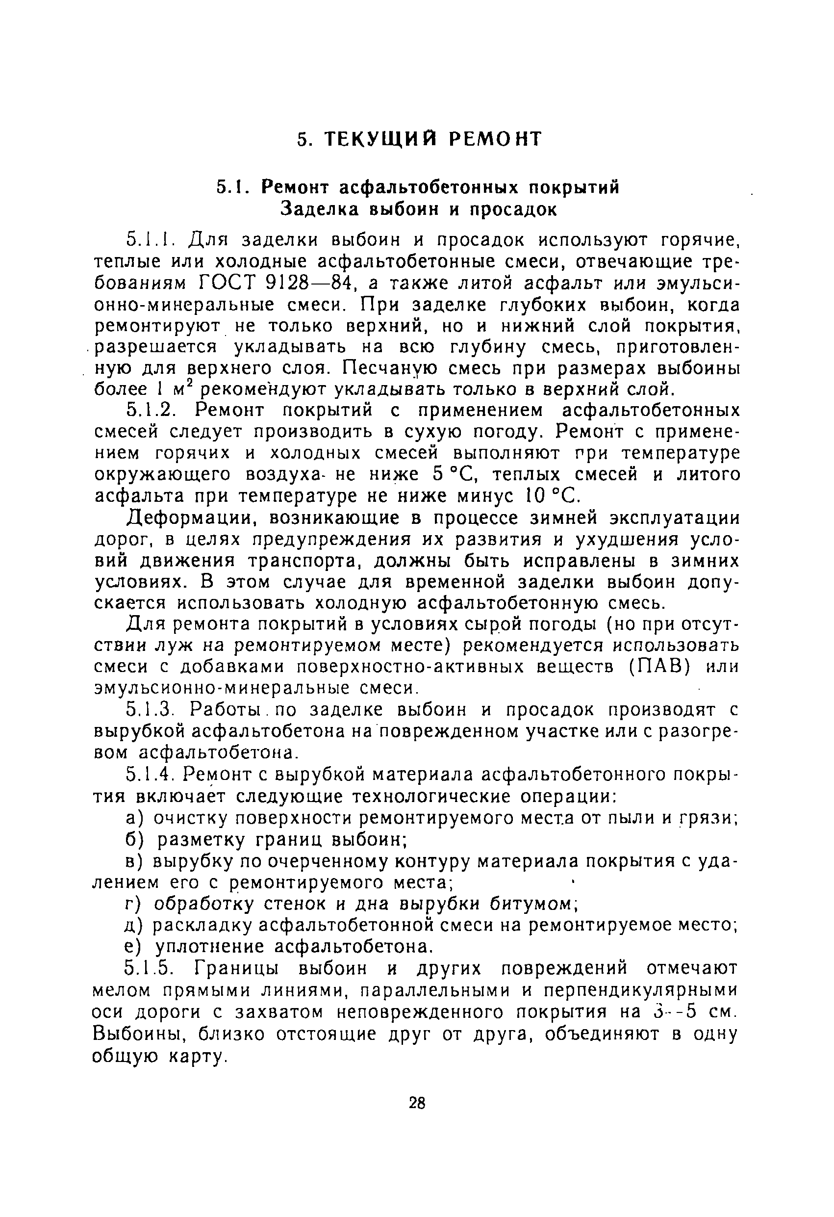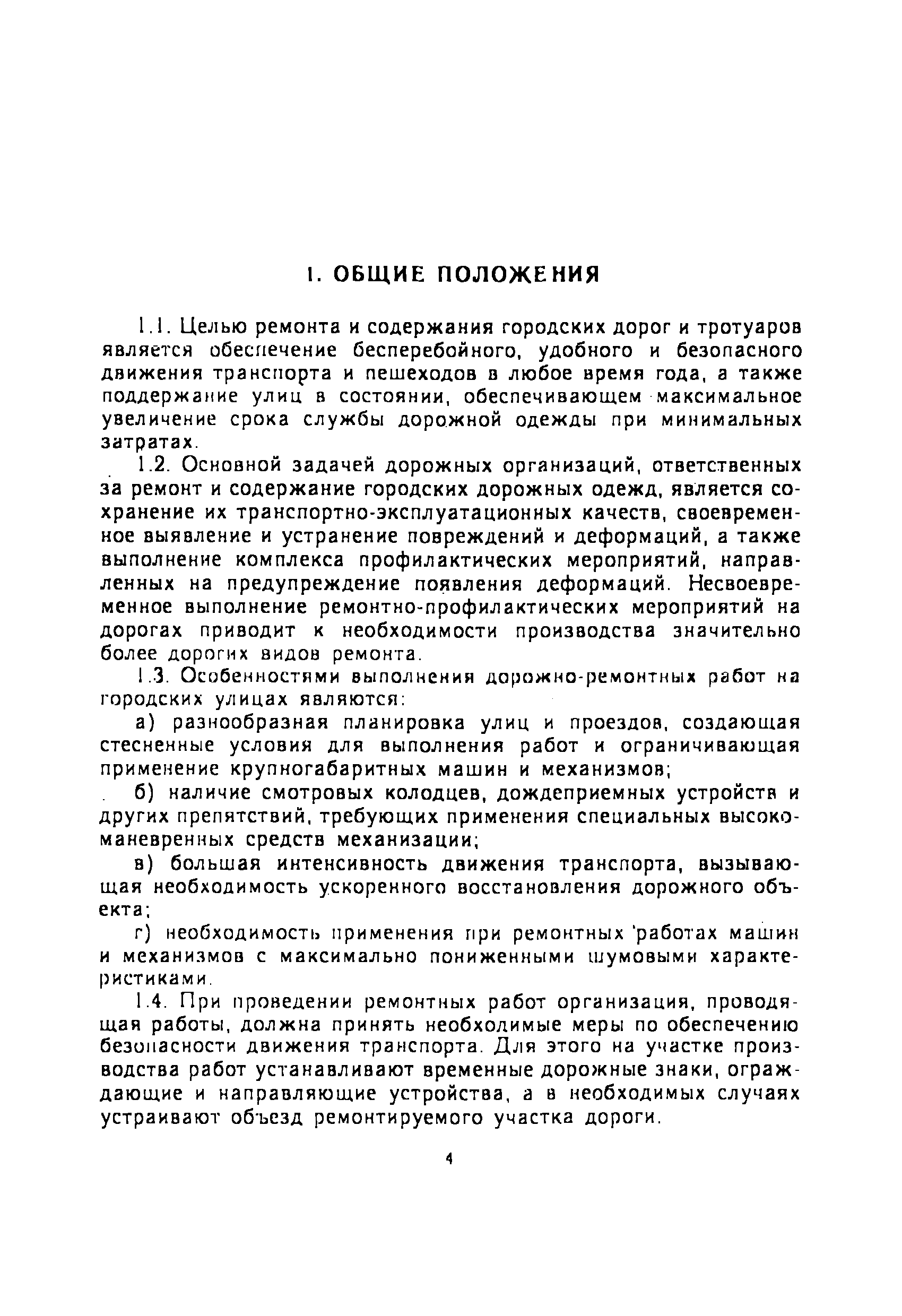 | Оглавление: | 1. Общие положения 2. Требования к транспортно-эксплуатационному состоянию городских дорог 3. Состав работ по ремонту и содержанию городских дорог 4. Капитальный ремонт 4.1 Общая часть 4.2 Ремонт земляного полотна и водостоков 4.3 Ремонт асфальтобетонных покрытий Укладка нового слоя по существующему покрытию Ремонт методом регенерации старого асфальтобетона 4.4 Ремонт цементобетонных покрытий 5. Текущий ремонт 5.1 Ремонт асфальтобетонных покрытий Заделка выбоин и просадок Ликвидация волн и наплывов Заделка трещин Устройство слоя износа 5.2 Ремонт цементобетонных покрытий Заделка выбоин и просадок Ремонт покрытий из сборных плит Ремонт швов и заделка трещин Устройство слоя износа 5.3 Ремонт покрытий переходного и низшего типов 5.4 Восстановление дорожной одежды после разрытий 5.5 Ремонт бортового камня 5.6 Ремонт дождевой канализации 6. Содержание городских дорог 6.1 Содержание земляного полотна и водоотвода 6.2 Содержание дородных покрытий 6.3 Учет интенсивности движения и паспортизация городских дорог 7. Правила приемки и контроль качества работ 7.1 Порядок приемки работ по ремонту городских улиц 7.2 Контроль качества работ Земляное полотно и водостоки Дорожные одежды Приложение 1. Технологические схемы ремонта городских дорог Приложение 2. Машины и механизмы для ремонта и содержания дорог Приложение 3. Форма паспорта городской дороги |