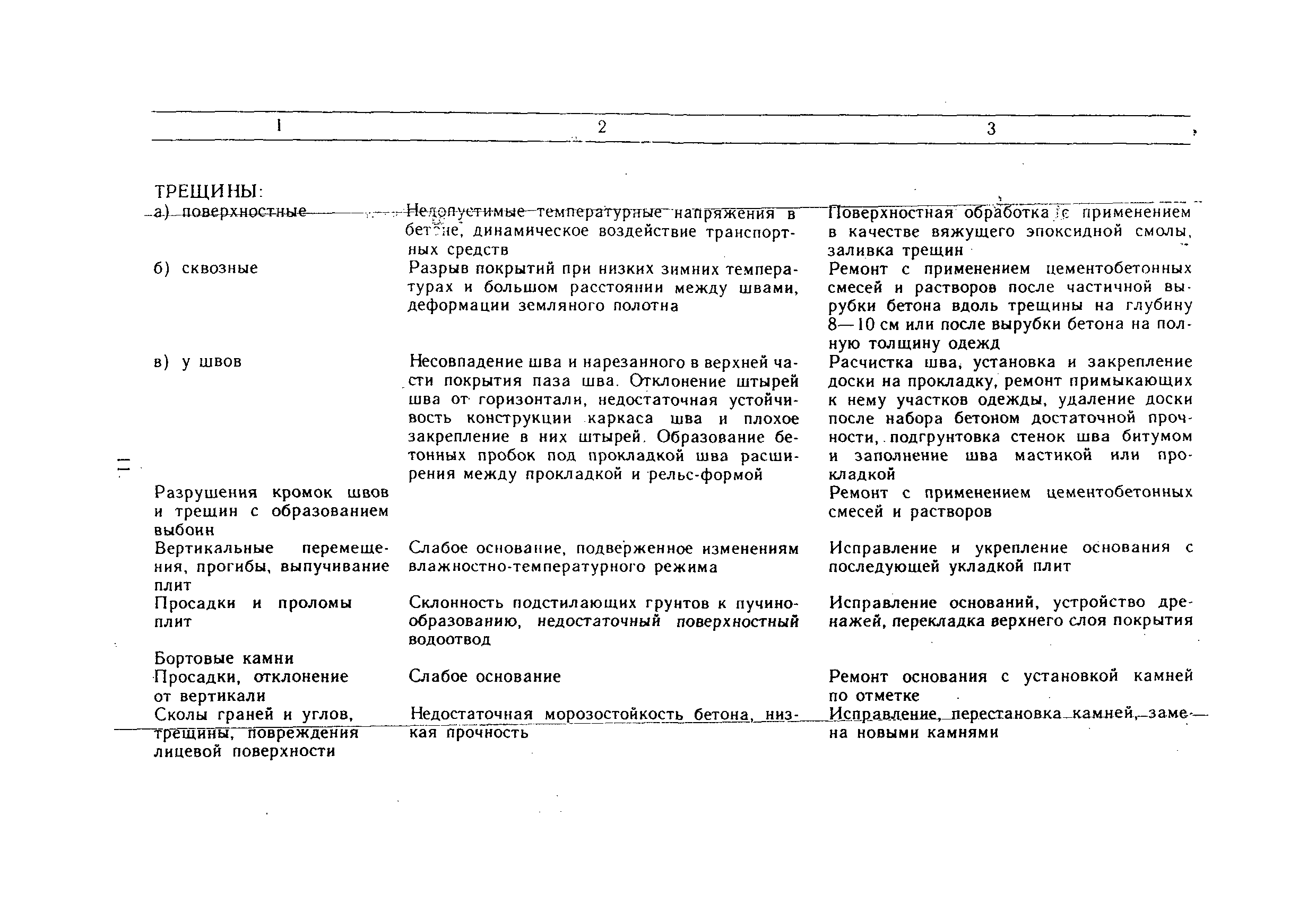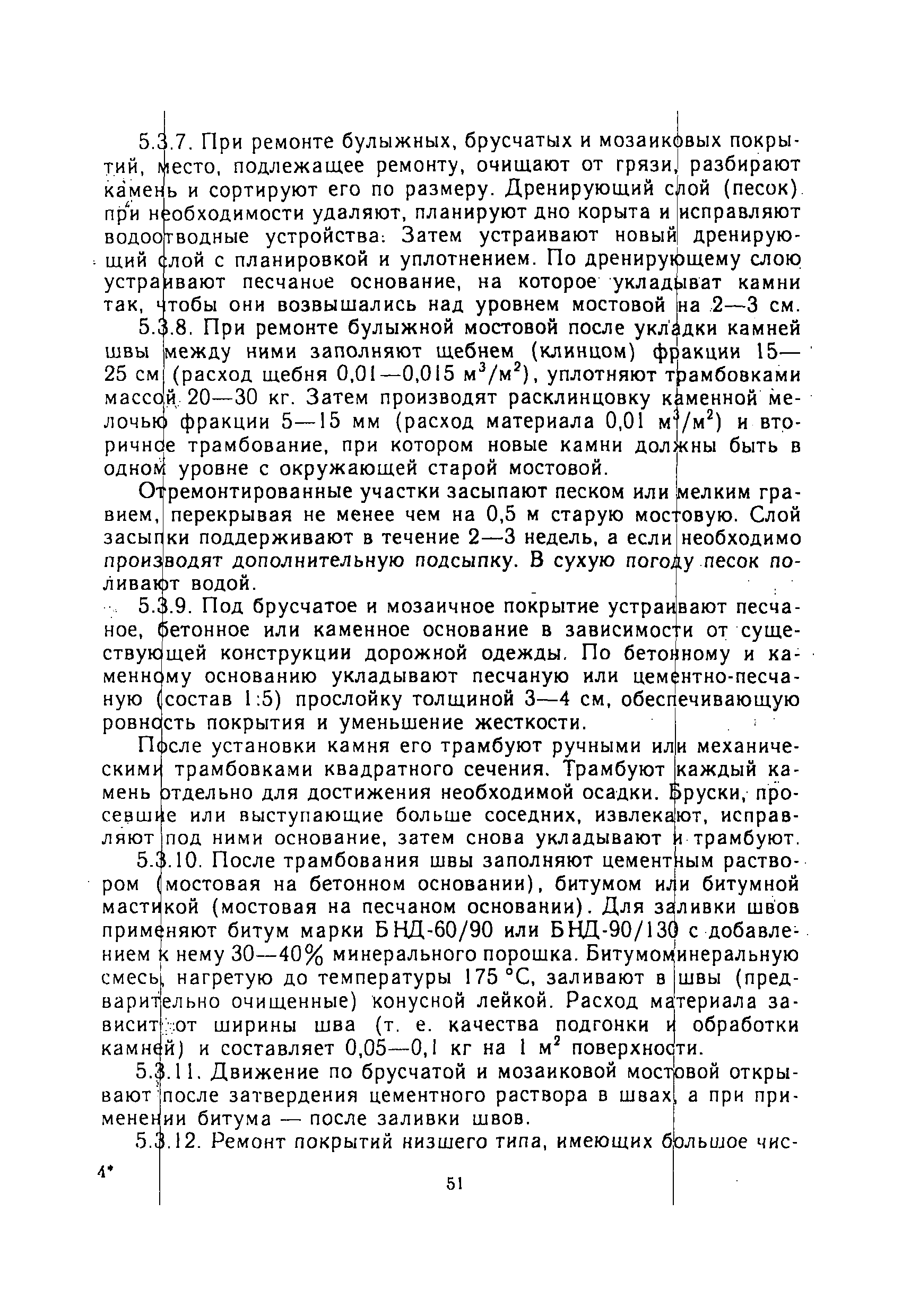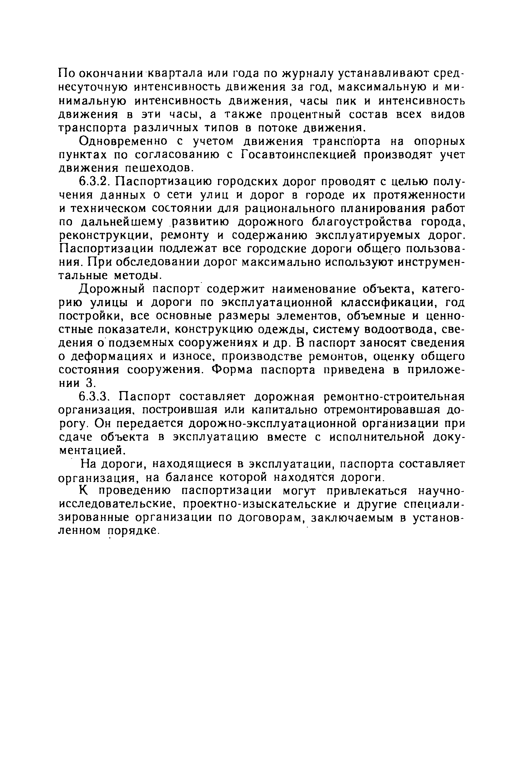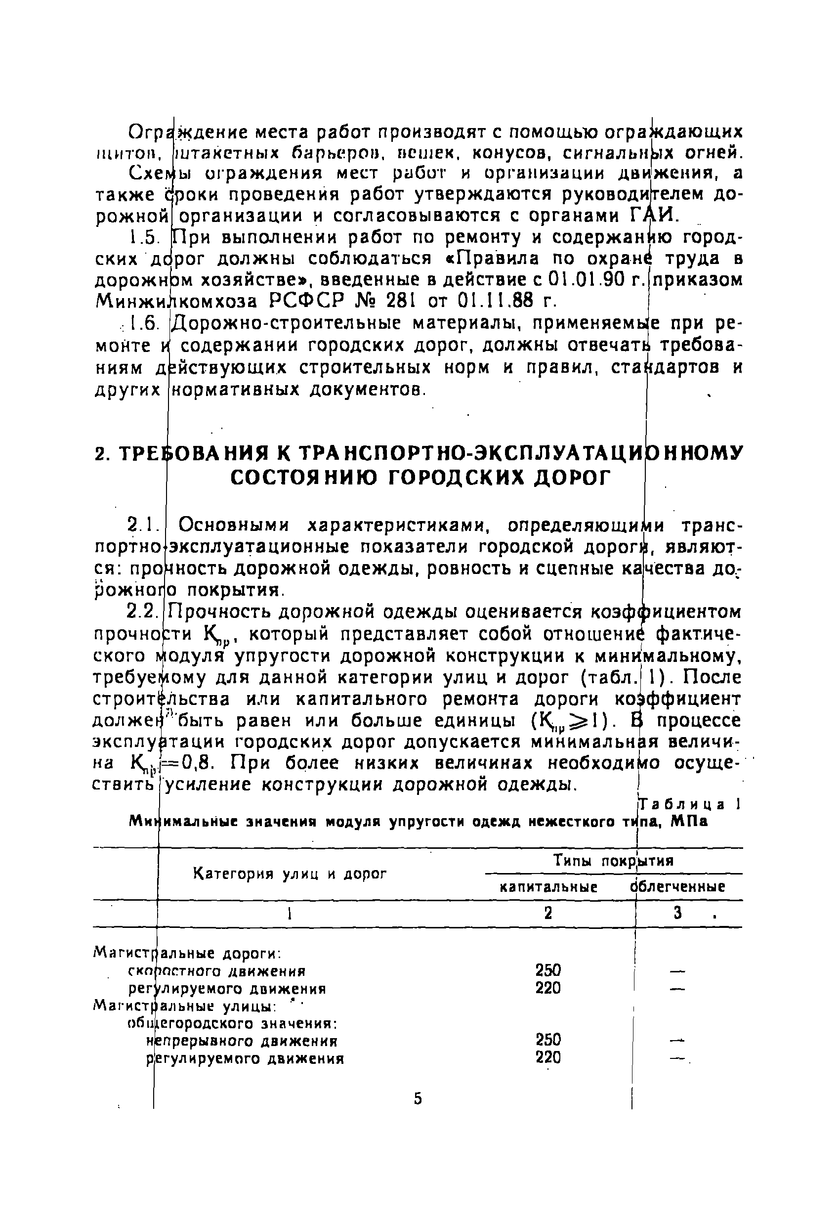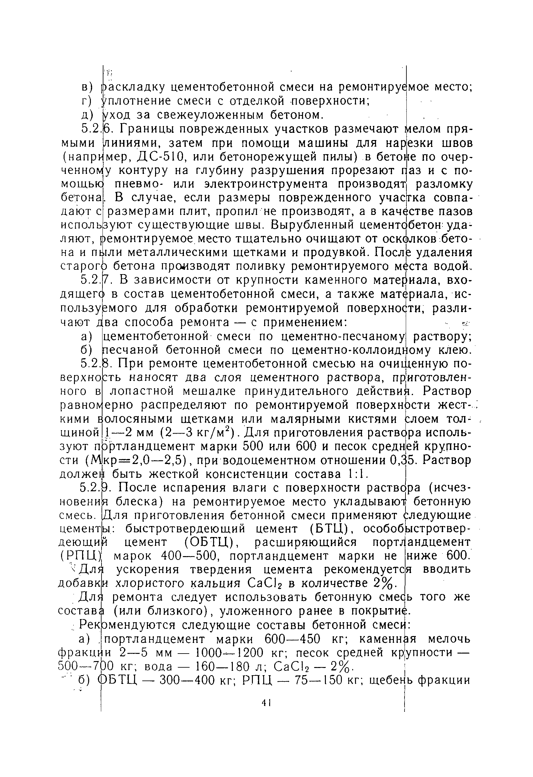 | Оглавление: | 1. Общие положения 2. Требования к транспортно-эксплуатационному состоянию городских дорог 3. Состав работ по ремонту и содержанию городских дорог 4. Капитальный ремонт 4.1 Общая часть 4.2 Ремонт земляного полотна и водостоков 4.3 Ремонт асфальтобетонных покрытий Укладка нового слоя по существующему покрытию Ремонт методом регенерации старого асфальтобетона 4.4 Ремонт цементобетонных покрытий 5. Текущий ремонт 5.1 Ремонт асфальтобетонных покрытий Заделка выбоин и просадок Ликвидация волн и наплывов Заделка трещин Устройство слоя износа 5.2 Ремонт цементобетонных покрытий Заделка выбоин и просадок Ремонт покрытий из сборных плит Ремонт швов и заделка трещин Устройство слоя износа 5.3 Ремонт покрытий переходного и низшего типов 5.4 Восстановление дорожной одежды после разрытий 5.5 Ремонт бортового камня 5.6 Ремонт дождевой канализации 6. Содержание городских дорог 6.1 Содержание земляного полотна и водоотвода 6.2 Содержание дородных покрытий 6.3 Учет интенсивности движения и паспортизация городских дорог 7. Правила приемки и контроль качества работ 7.1 Порядок приемки работ по ремонту городских улиц 7.2 Контроль качества работ Земляное полотно и водостоки Дорожные одежды Приложение 1. Технологические схемы ремонта городских дорог Приложение 2. Машины и механизмы для ремонта и содержания дорог Приложение 3. Форма паспорта городской дороги |