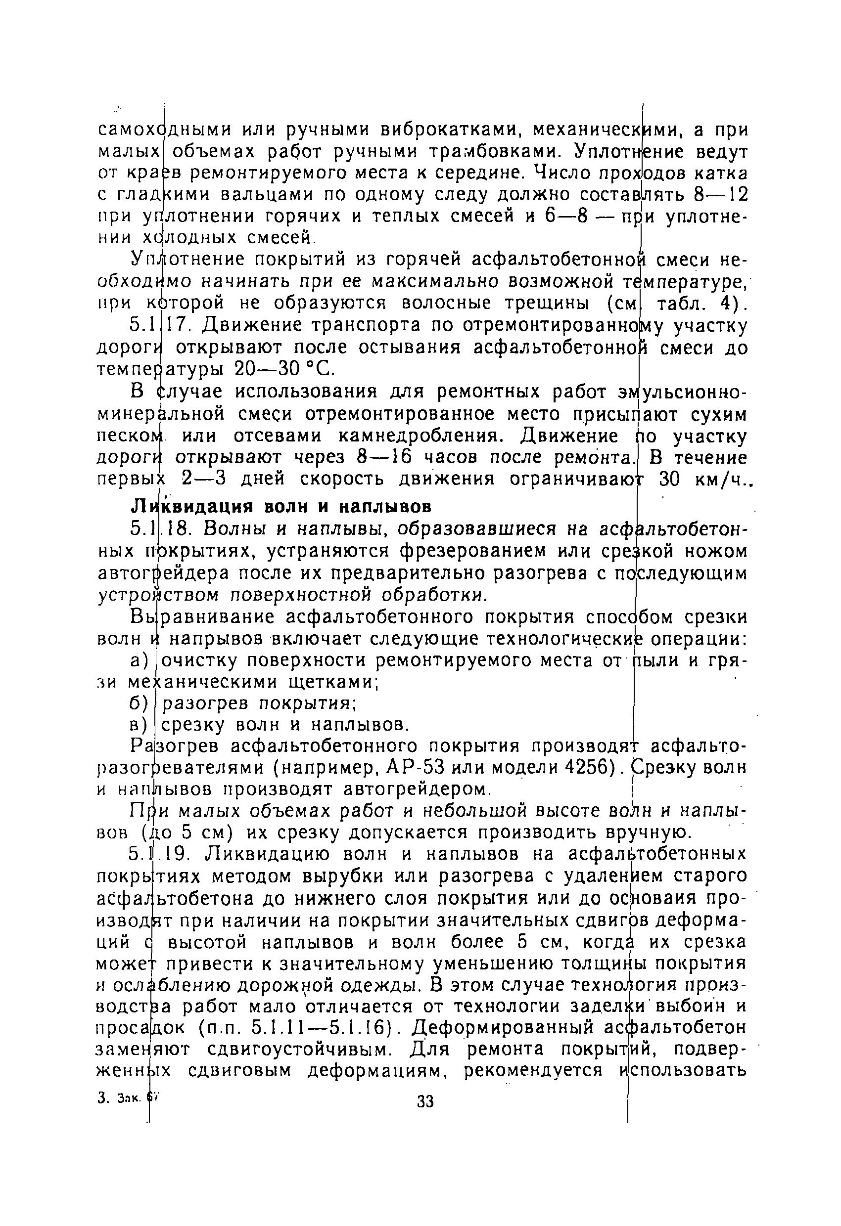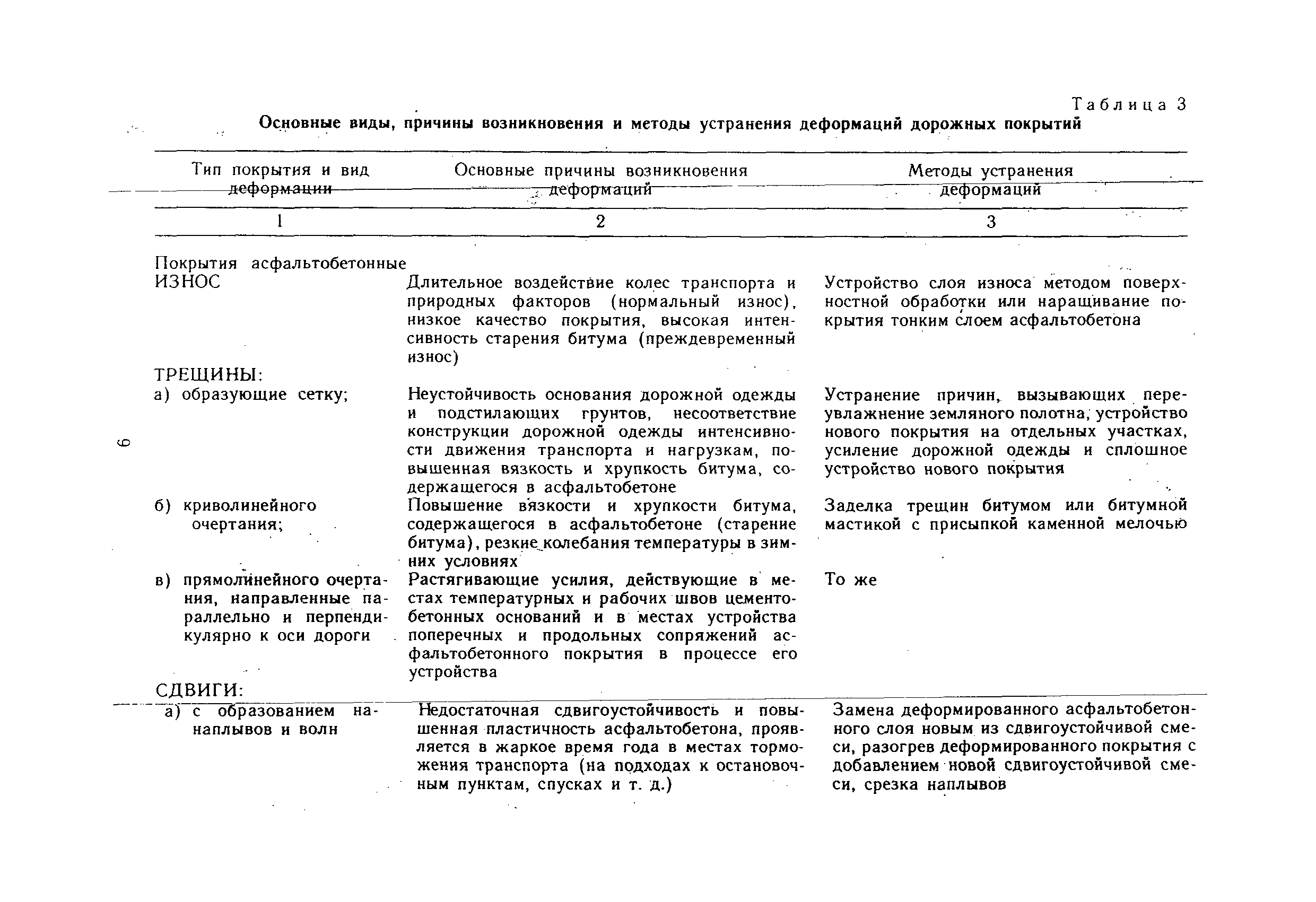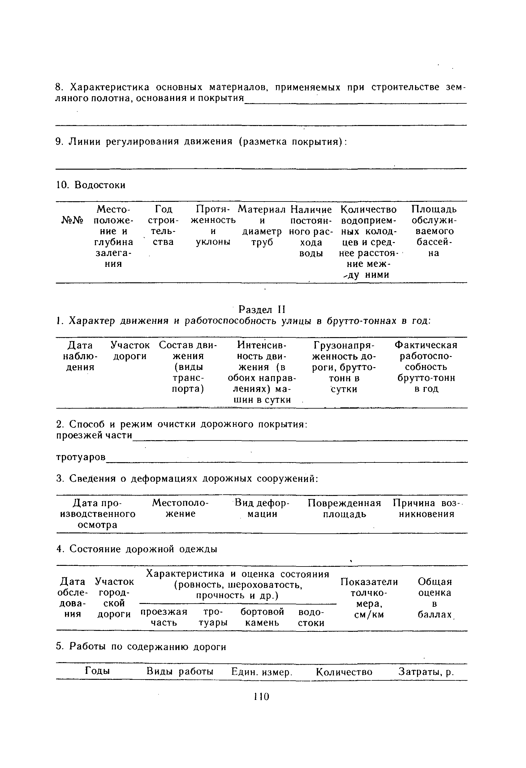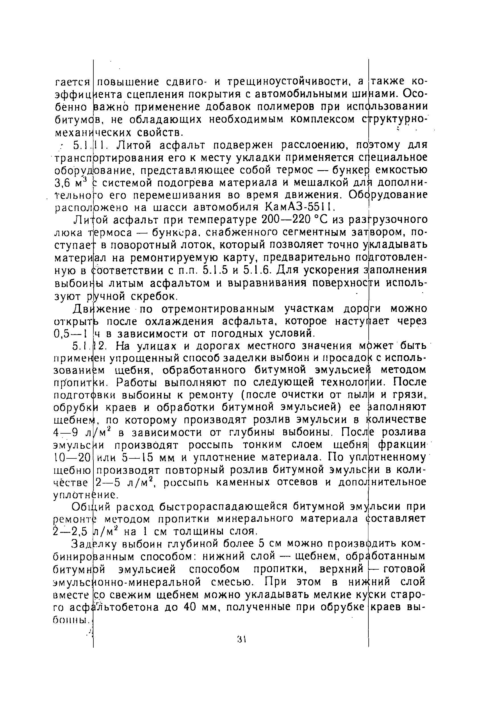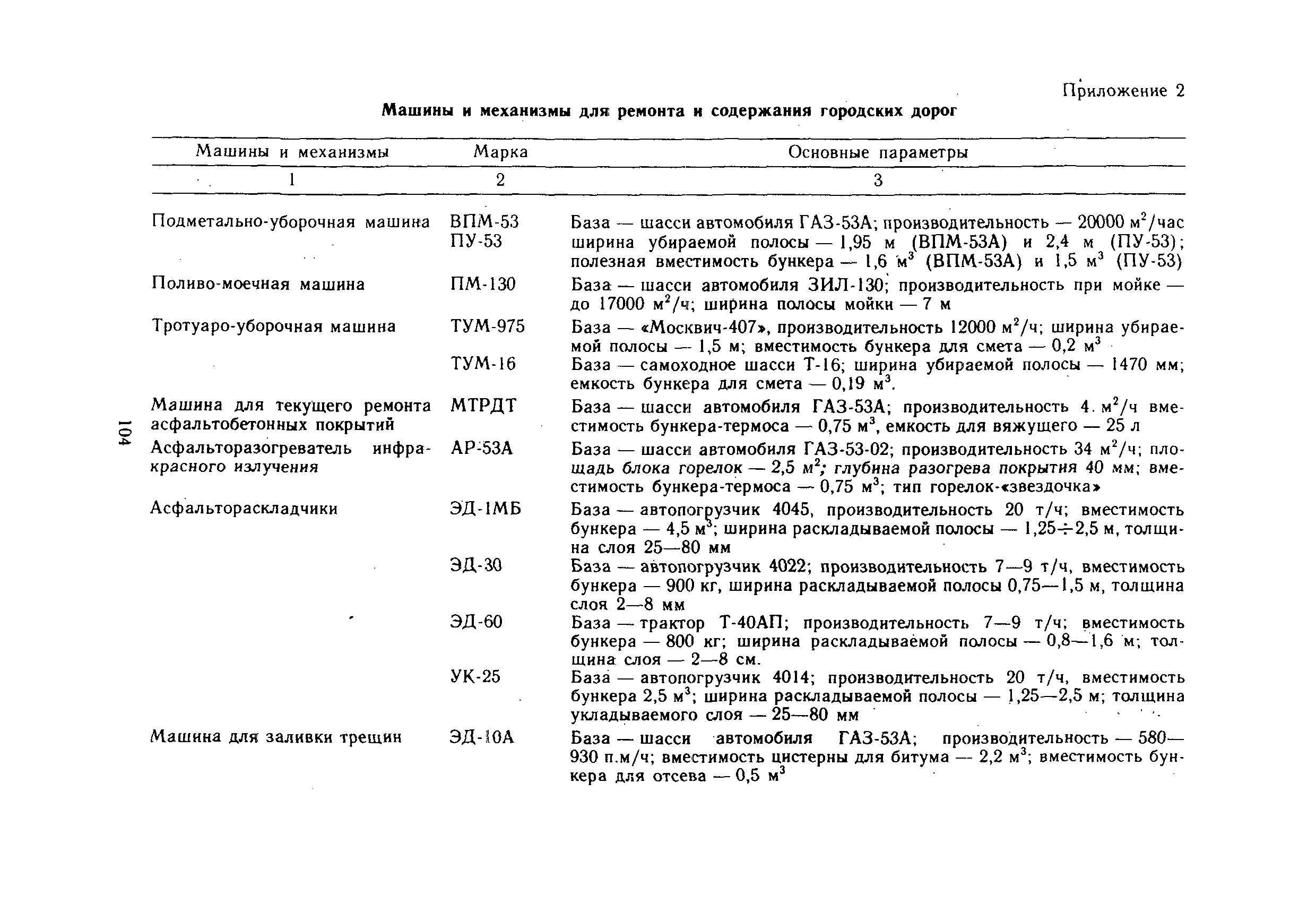 | Оглавление: | 1. Общие положения 2. Требования к транспортно-эксплуатационному состоянию городских дорог 3. Состав работ по ремонту и содержанию городских дорог 4. Капитальный ремонт 4.1 Общая часть 4.2 Ремонт земляного полотна и водостоков 4.3 Ремонт асфальтобетонных покрытий Укладка нового слоя по существующему покрытию Ремонт методом регенерации старого асфальтобетона 4.4 Ремонт цементобетонных покрытий 5. Текущий ремонт 5.1 Ремонт асфальтобетонных покрытий Заделка выбоин и просадок Ликвидация волн и наплывов Заделка трещин Устройство слоя износа 5.2 Ремонт цементобетонных покрытий Заделка выбоин и просадок Ремонт покрытий из сборных плит Ремонт швов и заделка трещин Устройство слоя износа 5.3 Ремонт покрытий переходного и низшего типов 5.4 Восстановление дорожной одежды после разрытий 5.5 Ремонт бортового камня 5.6 Ремонт дождевой канализации 6. Содержание городских дорог 6.1 Содержание земляного полотна и водоотвода 6.2 Содержание дородных покрытий 6.3 Учет интенсивности движения и паспортизация городских дорог 7. Правила приемки и контроль качества работ 7.1 Порядок приемки работ по ремонту городских улиц 7.2 Контроль качества работ Земляное полотно и водостоки Дорожные одежды Приложение 1. Технологические схемы ремонта городских дорог Приложение 2. Машины и механизмы для ремонта и содержания дорог Приложение 3. Форма паспорта городской дороги |