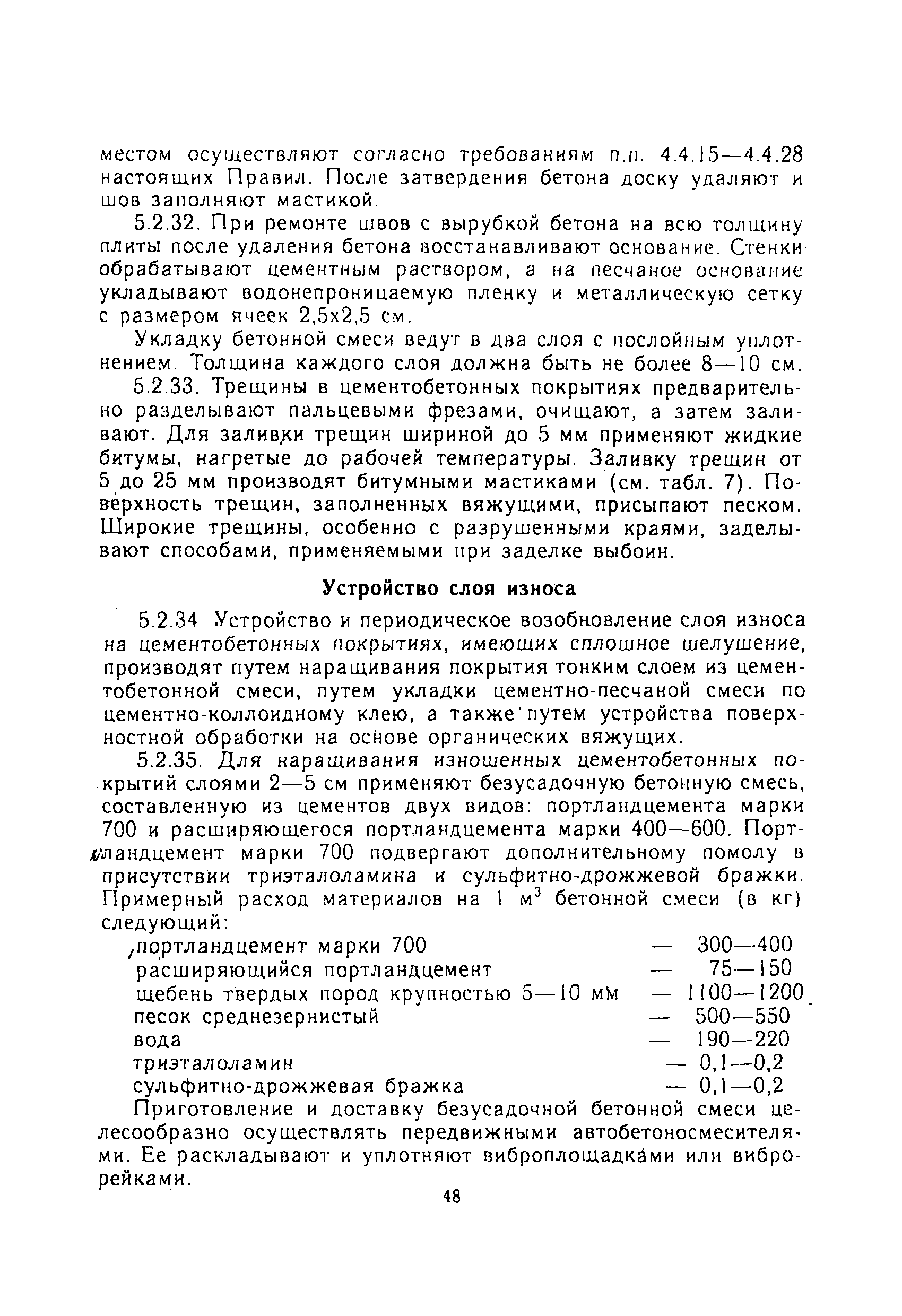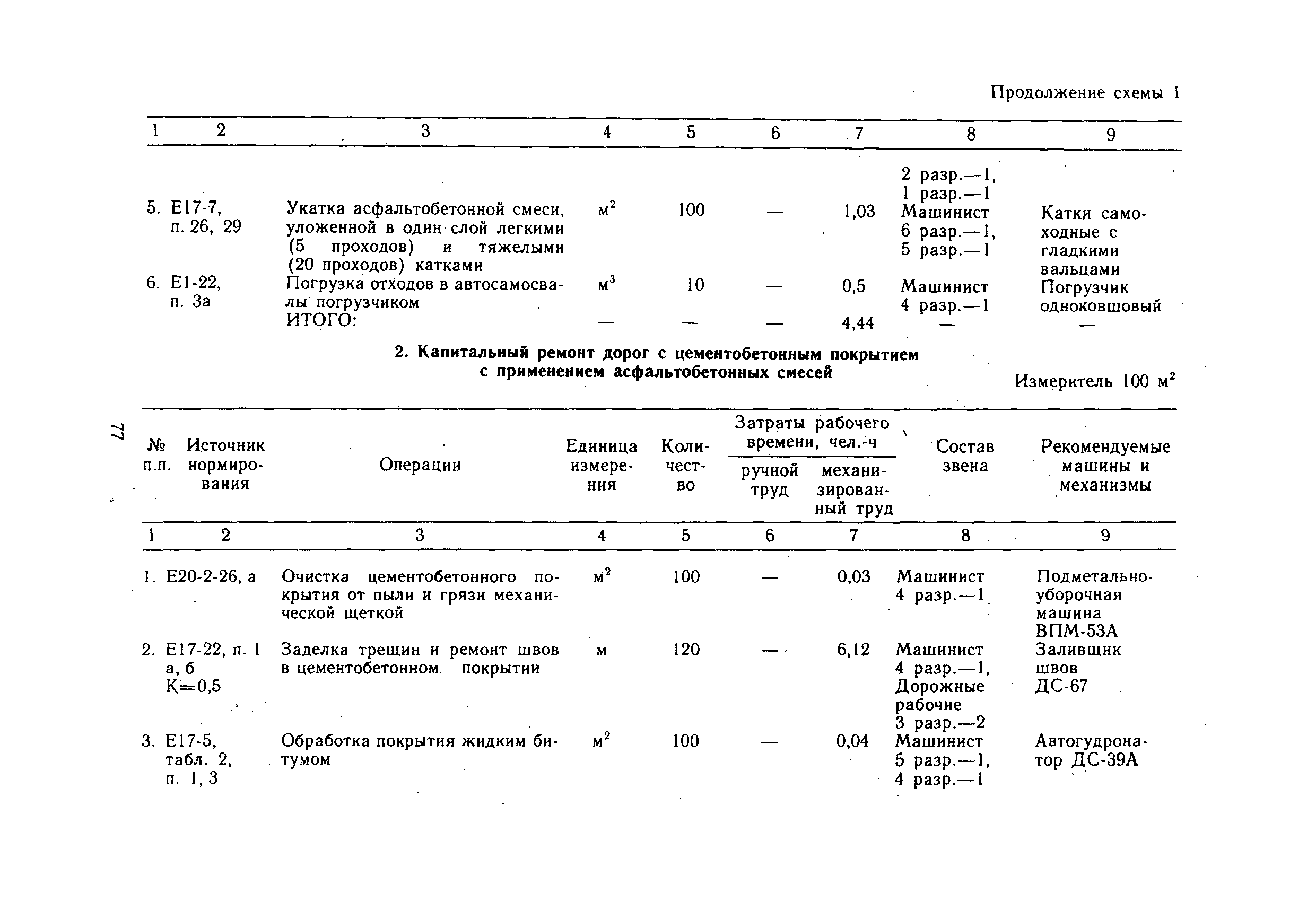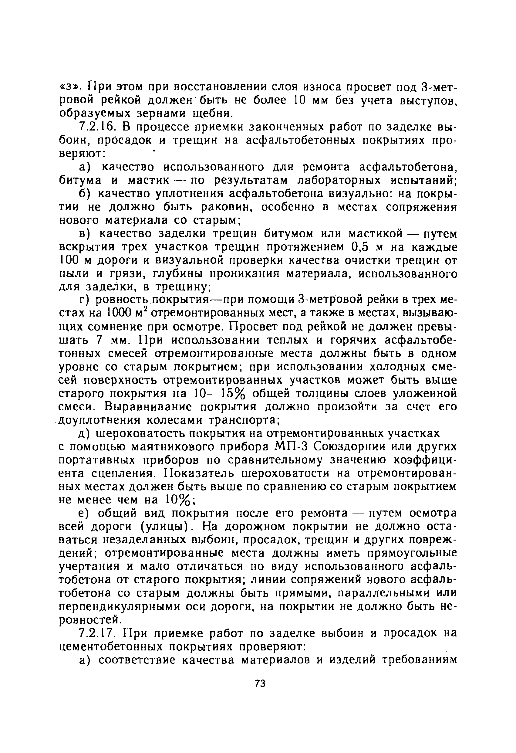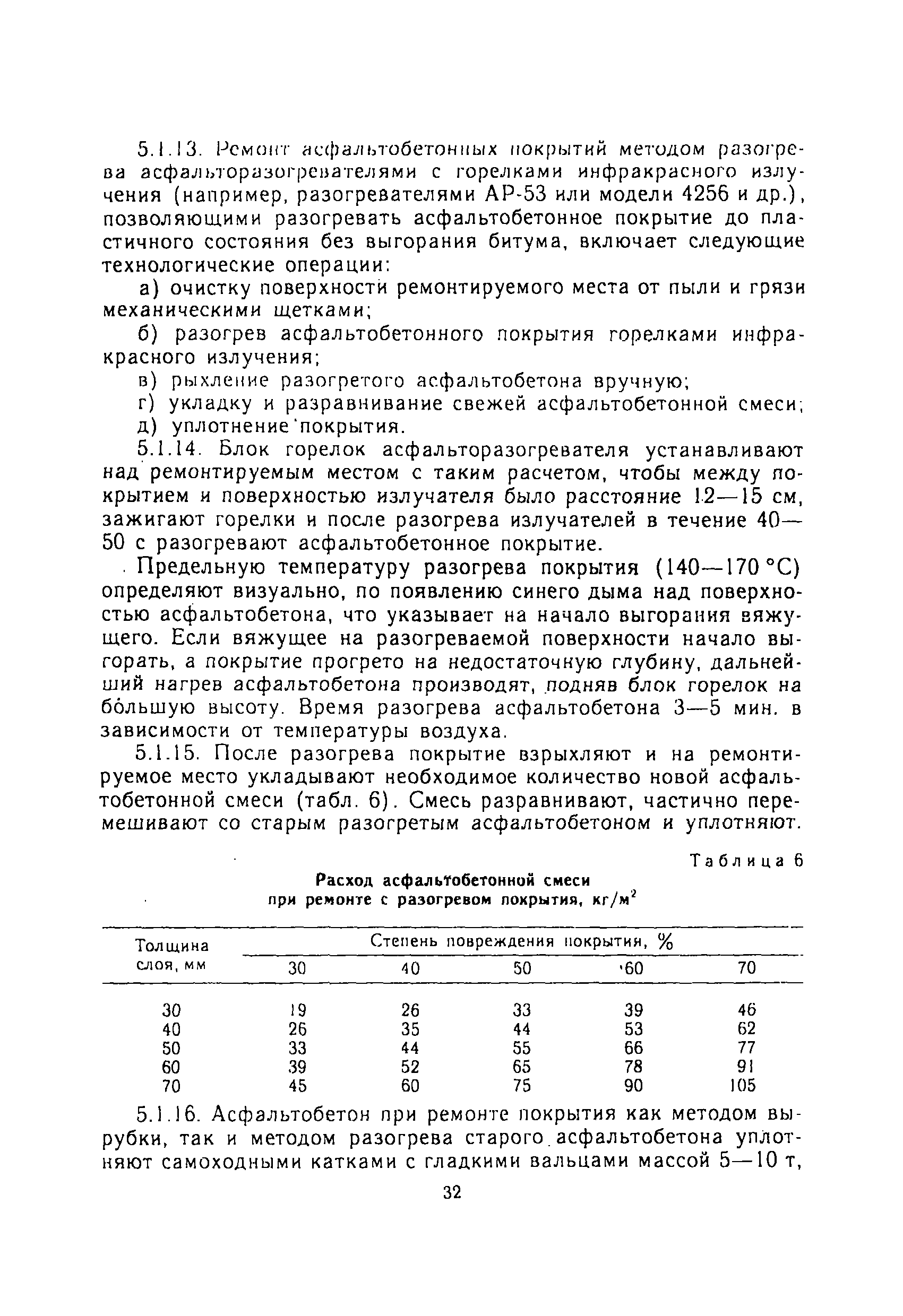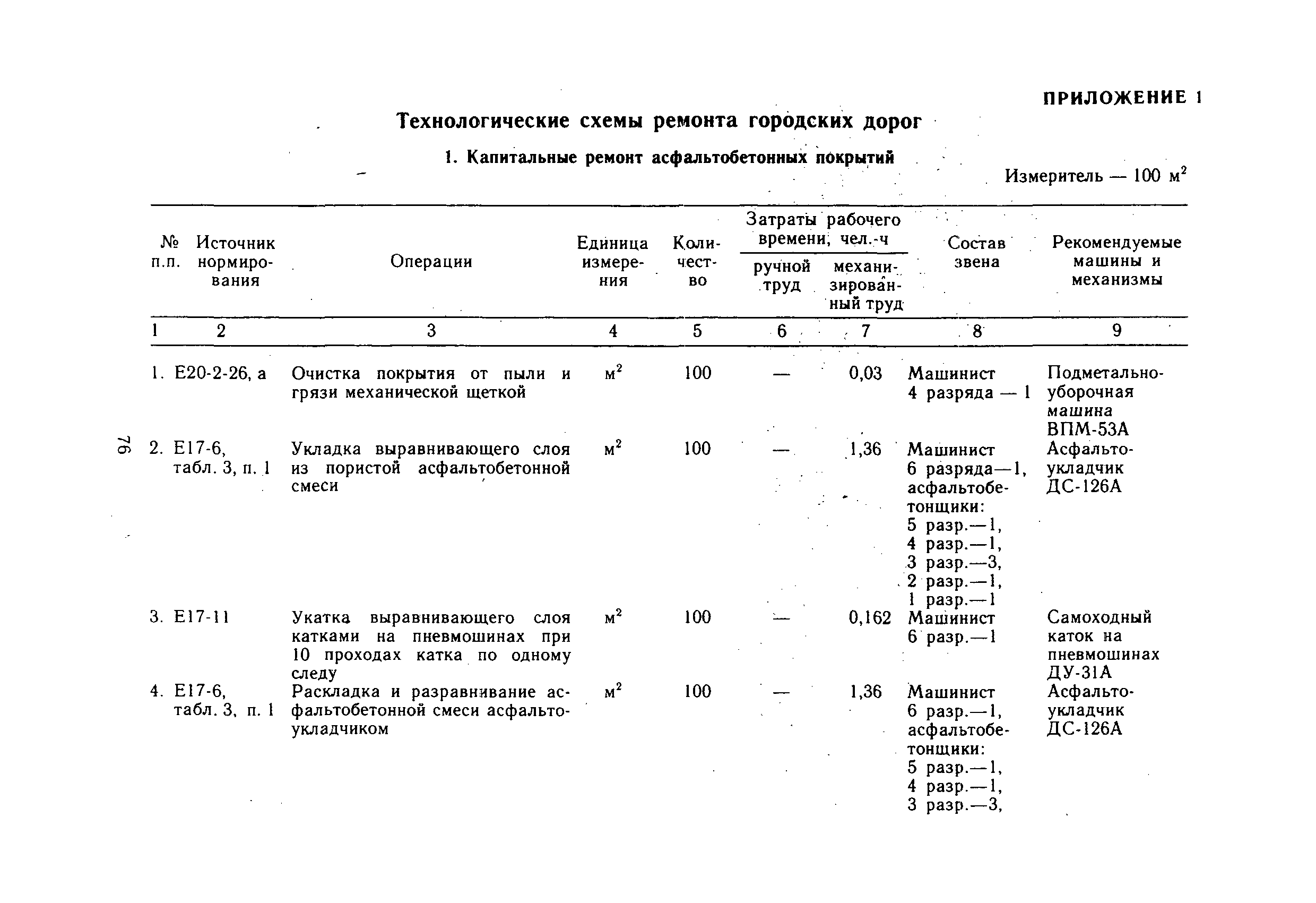 | Оглавление: | 1. Общие положения 2. Требования к транспортно-эксплуатационному состоянию городских дорог 3. Состав работ по ремонту и содержанию городских дорог 4. Капитальный ремонт 4.1 Общая часть 4.2 Ремонт земляного полотна и водостоков 4.3 Ремонт асфальтобетонных покрытий Укладка нового слоя по существующему покрытию Ремонт методом регенерации старого асфальтобетона 4.4 Ремонт цементобетонных покрытий 5. Текущий ремонт 5.1 Ремонт асфальтобетонных покрытий Заделка выбоин и просадок Ликвидация волн и наплывов Заделка трещин Устройство слоя износа 5.2 Ремонт цементобетонных покрытий Заделка выбоин и просадок Ремонт покрытий из сборных плит Ремонт швов и заделка трещин Устройство слоя износа 5.3 Ремонт покрытий переходного и низшего типов 5.4 Восстановление дорожной одежды после разрытий 5.5 Ремонт бортового камня 5.6 Ремонт дождевой канализации 6. Содержание городских дорог 6.1 Содержание земляного полотна и водоотвода 6.2 Содержание дородных покрытий 6.3 Учет интенсивности движения и паспортизация городских дорог 7. Правила приемки и контроль качества работ 7.1 Порядок приемки работ по ремонту городских улиц 7.2 Контроль качества работ Земляное полотно и водостоки Дорожные одежды Приложение 1. Технологические схемы ремонта городских дорог Приложение 2. Машины и механизмы для ремонта и содержания дорог Приложение 3. Форма паспорта городской дороги |
