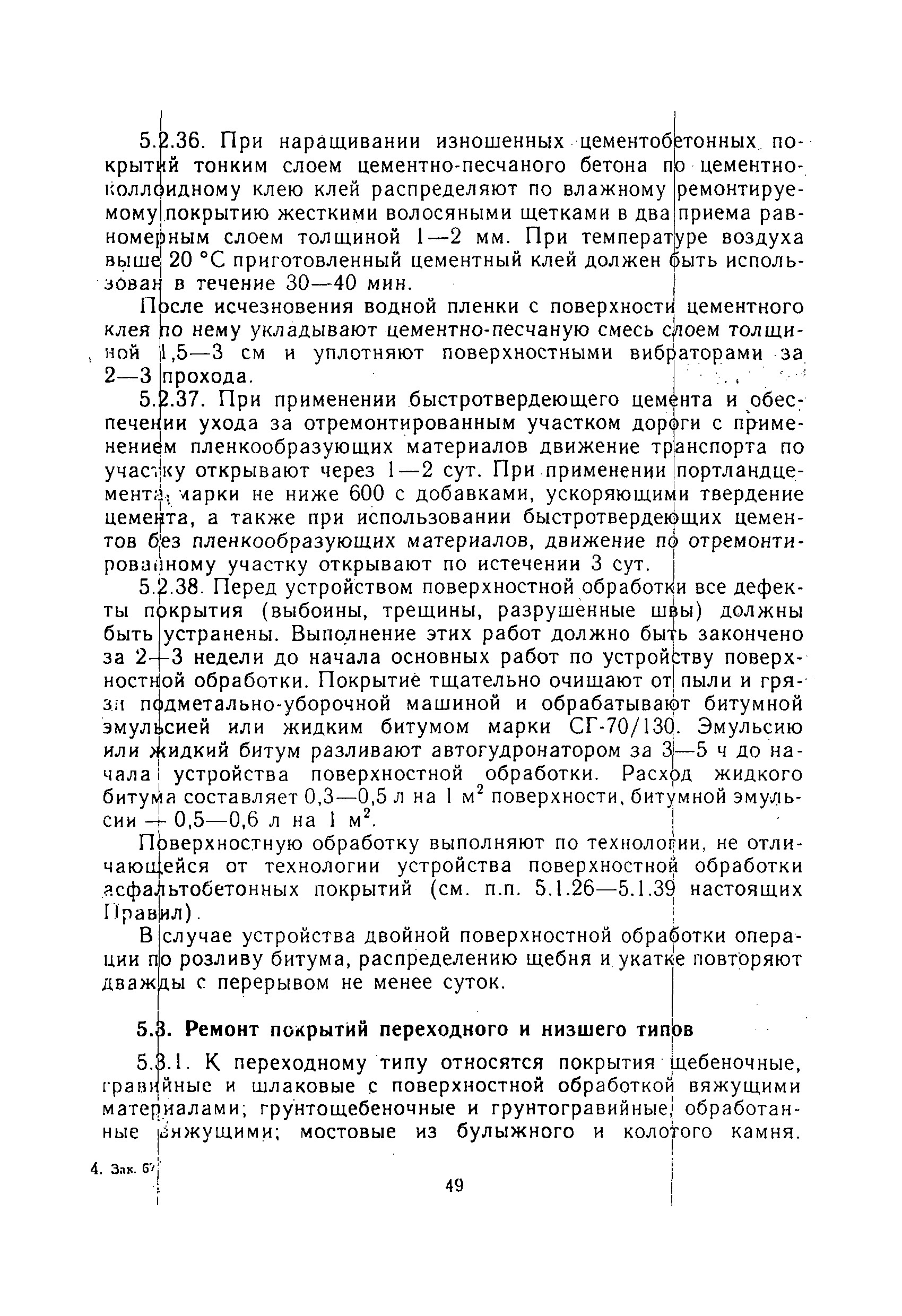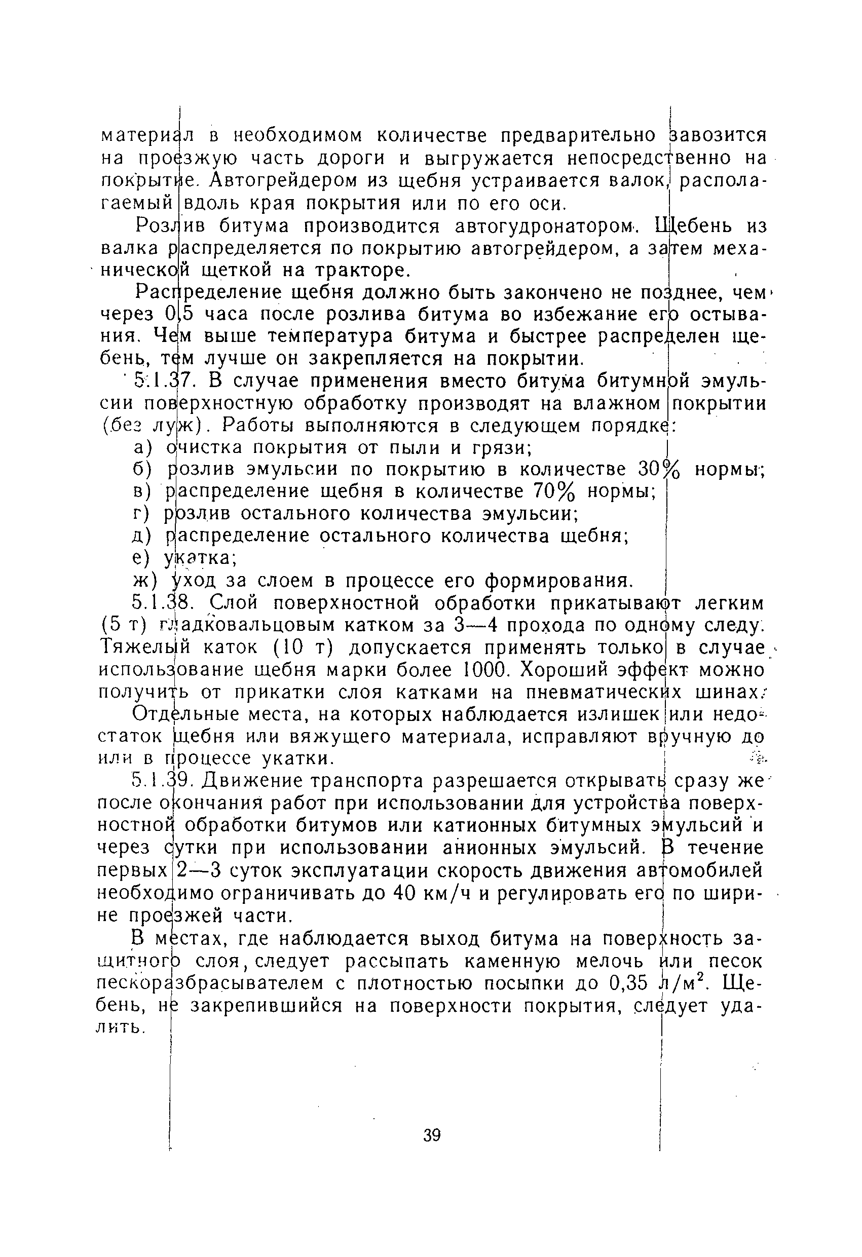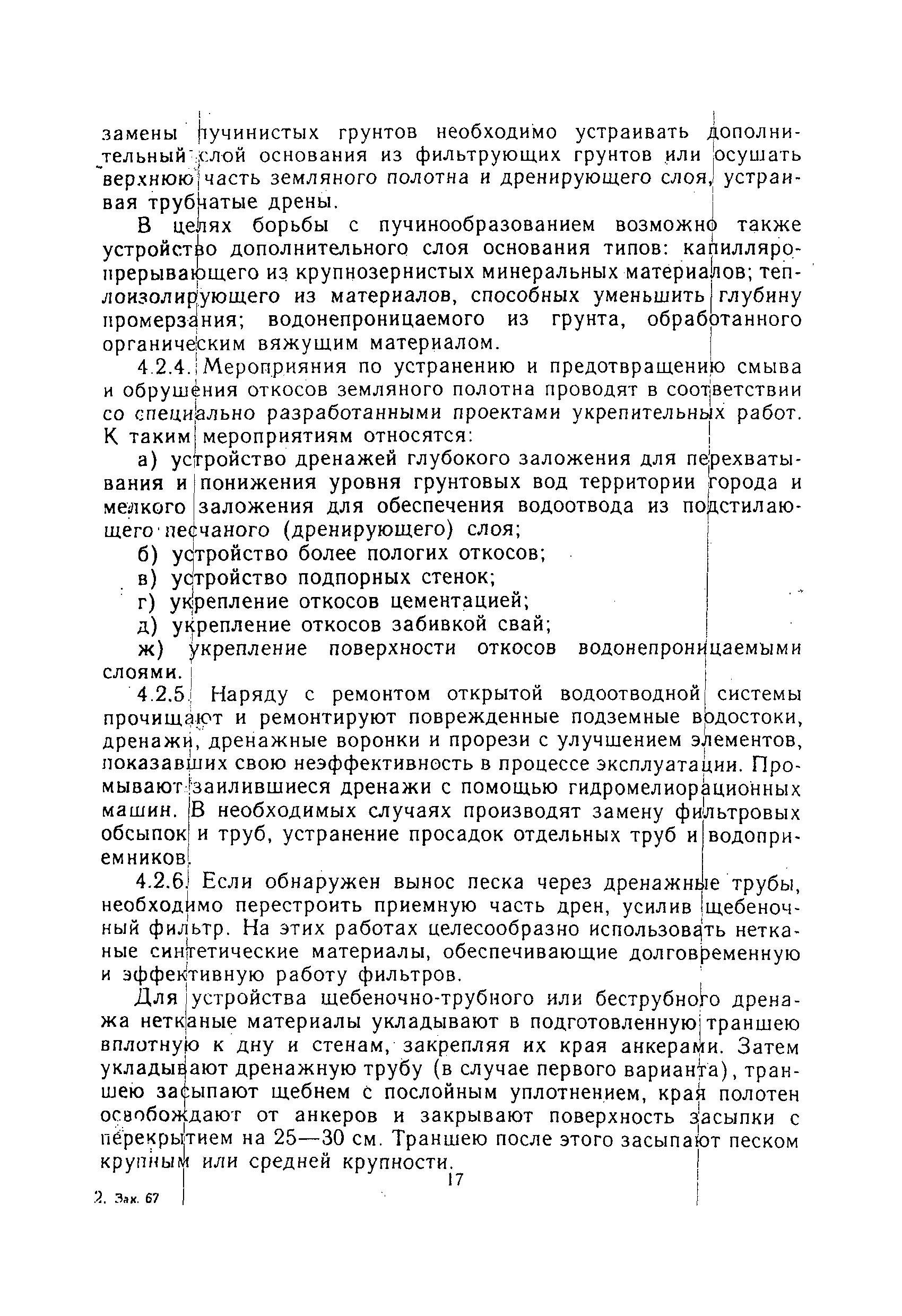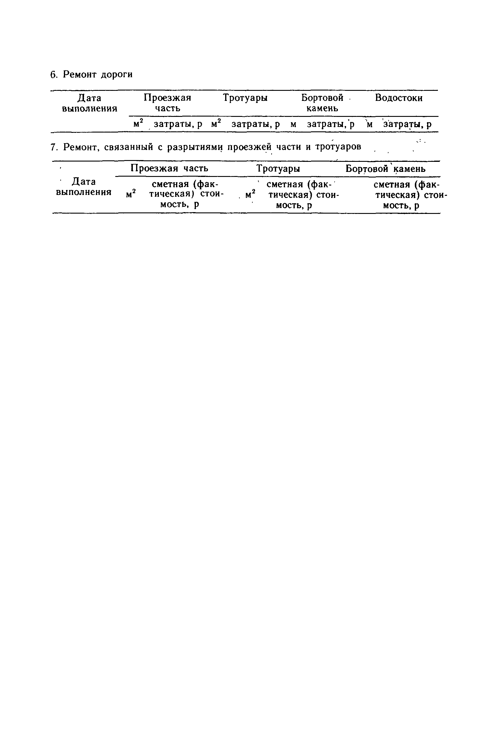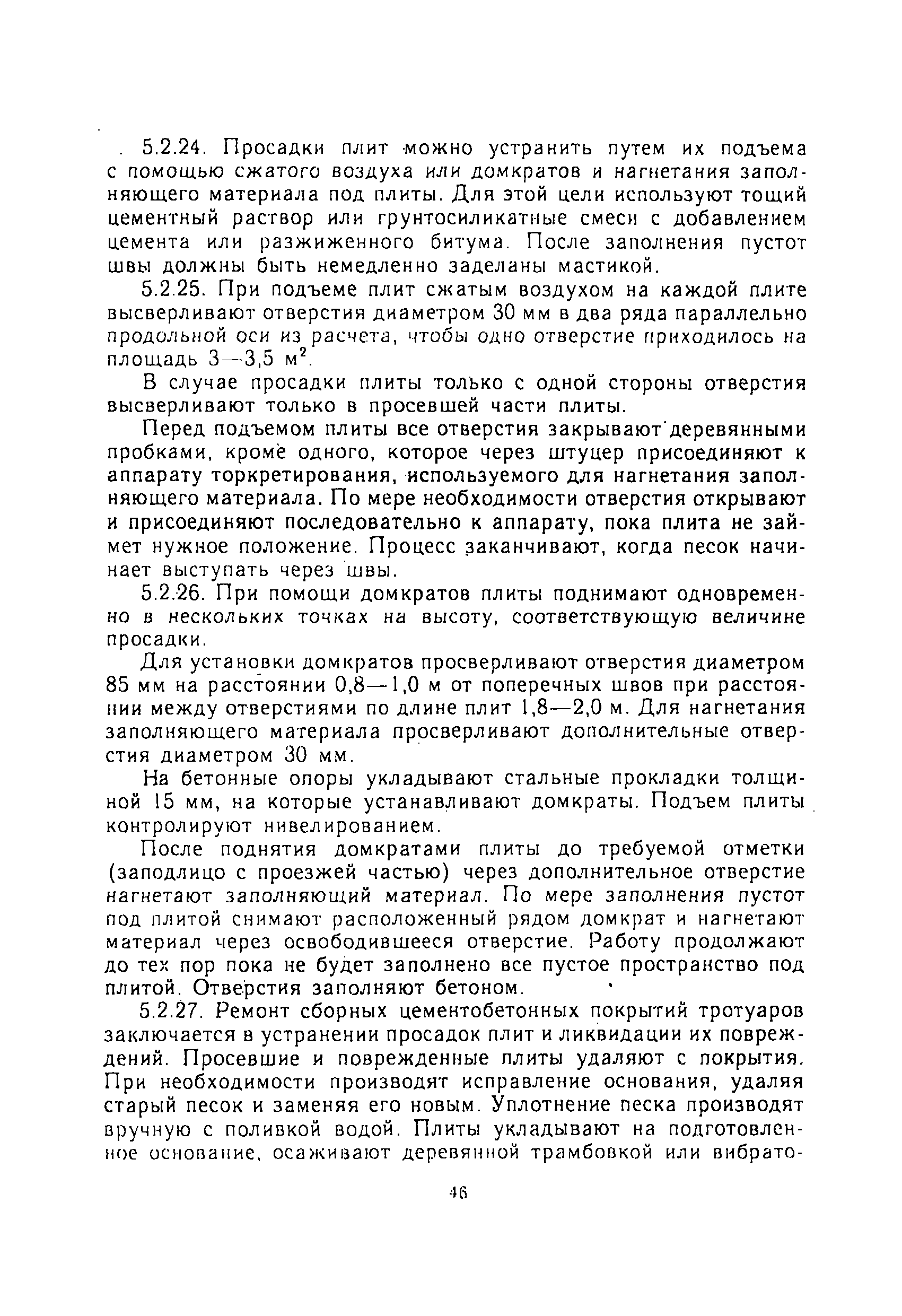 | Оглавление: | 1. Общие положения 2. Требования к транспортно-эксплуатационному состоянию городских дорог 3. Состав работ по ремонту и содержанию городских дорог 4. Капитальный ремонт 4.1 Общая часть 4.2 Ремонт земляного полотна и водостоков 4.3 Ремонт асфальтобетонных покрытий Укладка нового слоя по существующему покрытию Ремонт методом регенерации старого асфальтобетона 4.4 Ремонт цементобетонных покрытий 5. Текущий ремонт 5.1 Ремонт асфальтобетонных покрытий Заделка выбоин и просадок Ликвидация волн и наплывов Заделка трещин Устройство слоя износа 5.2 Ремонт цементобетонных покрытий Заделка выбоин и просадок Ремонт покрытий из сборных плит Ремонт швов и заделка трещин Устройство слоя износа 5.3 Ремонт покрытий переходного и низшего типов 5.4 Восстановление дорожной одежды после разрытий 5.5 Ремонт бортового камня 5.6 Ремонт дождевой канализации 6. Содержание городских дорог 6.1 Содержание земляного полотна и водоотвода 6.2 Содержание дородных покрытий 6.3 Учет интенсивности движения и паспортизация городских дорог 7. Правила приемки и контроль качества работ 7.1 Порядок приемки работ по ремонту городских улиц 7.2 Контроль качества работ Земляное полотно и водостоки Дорожные одежды Приложение 1. Технологические схемы ремонта городских дорог Приложение 2. Машины и механизмы для ремонта и содержания дорог Приложение 3. Форма паспорта городской дороги |