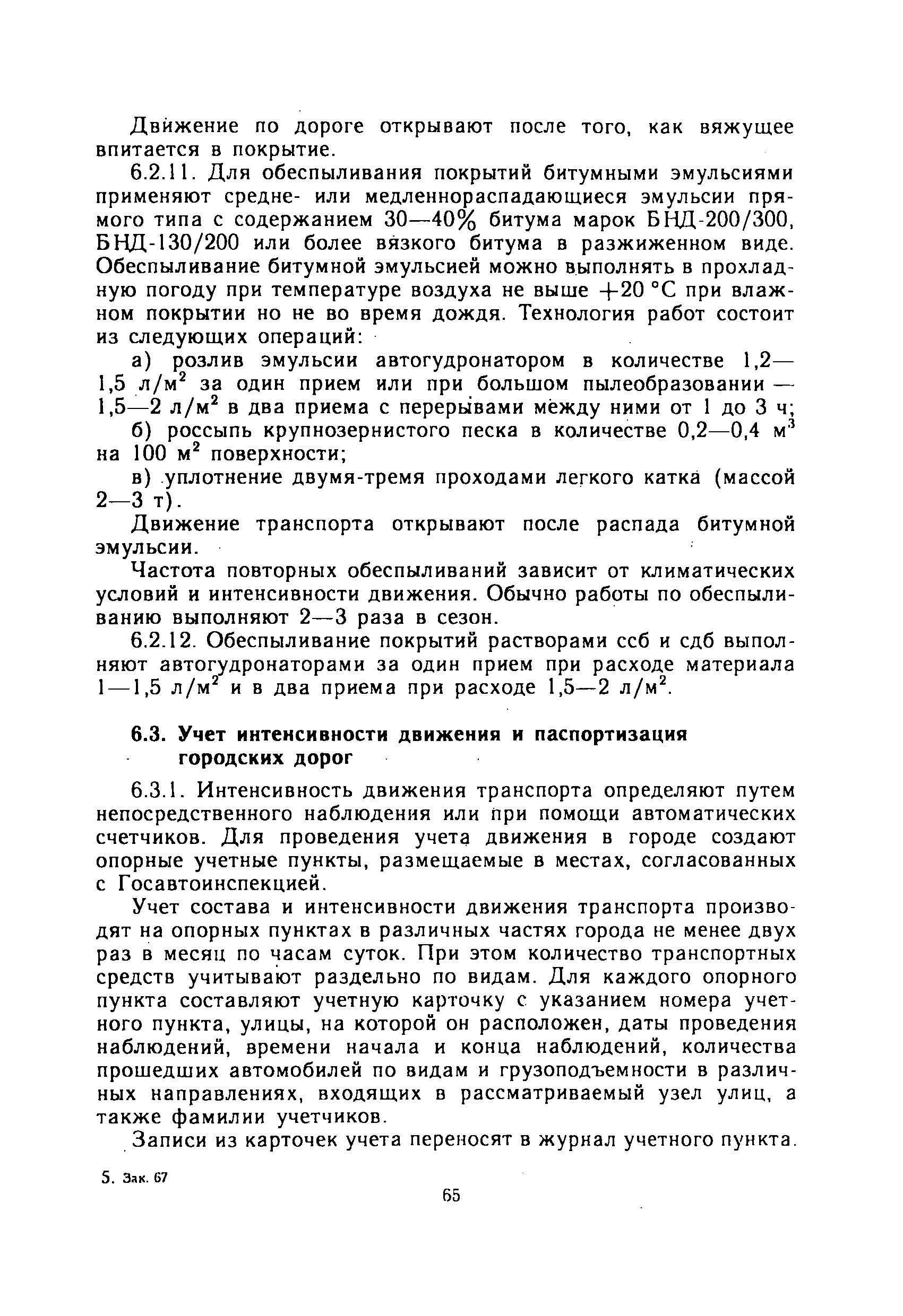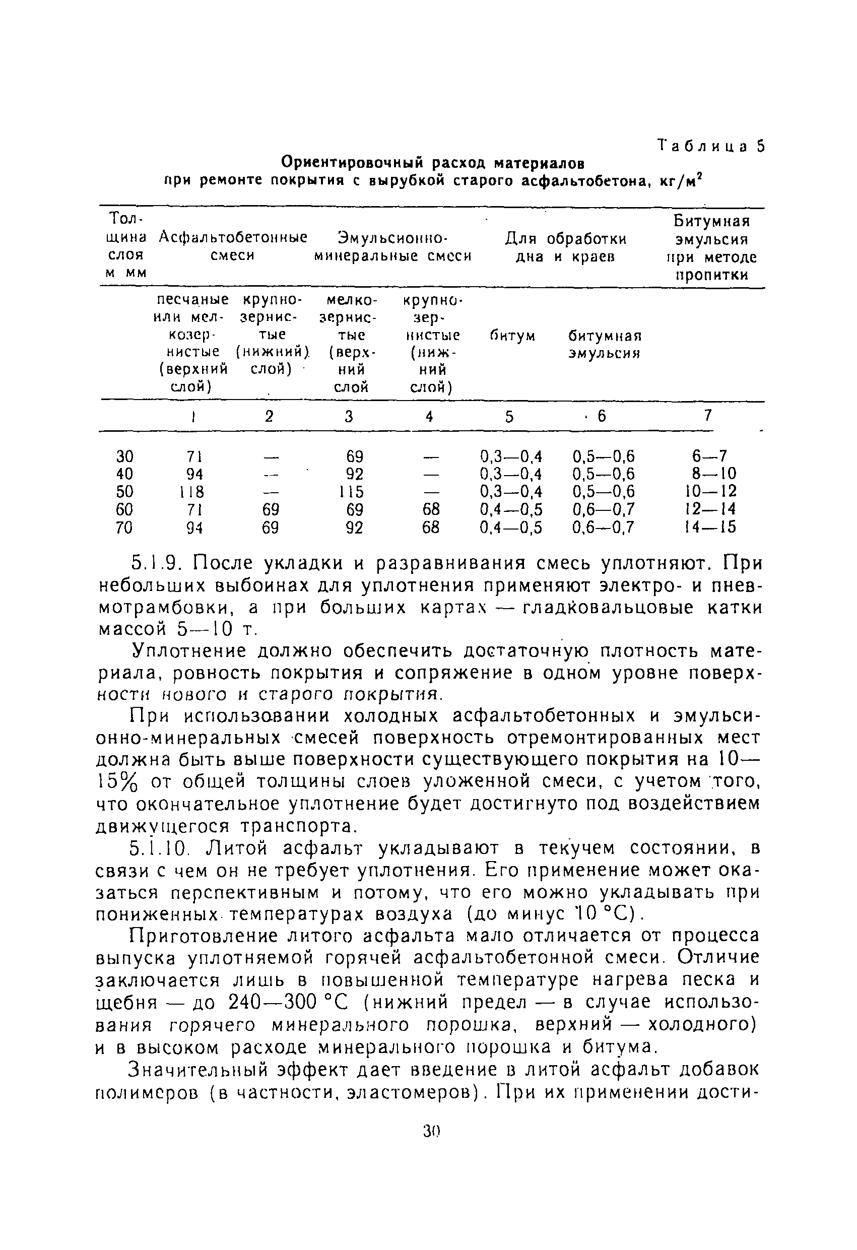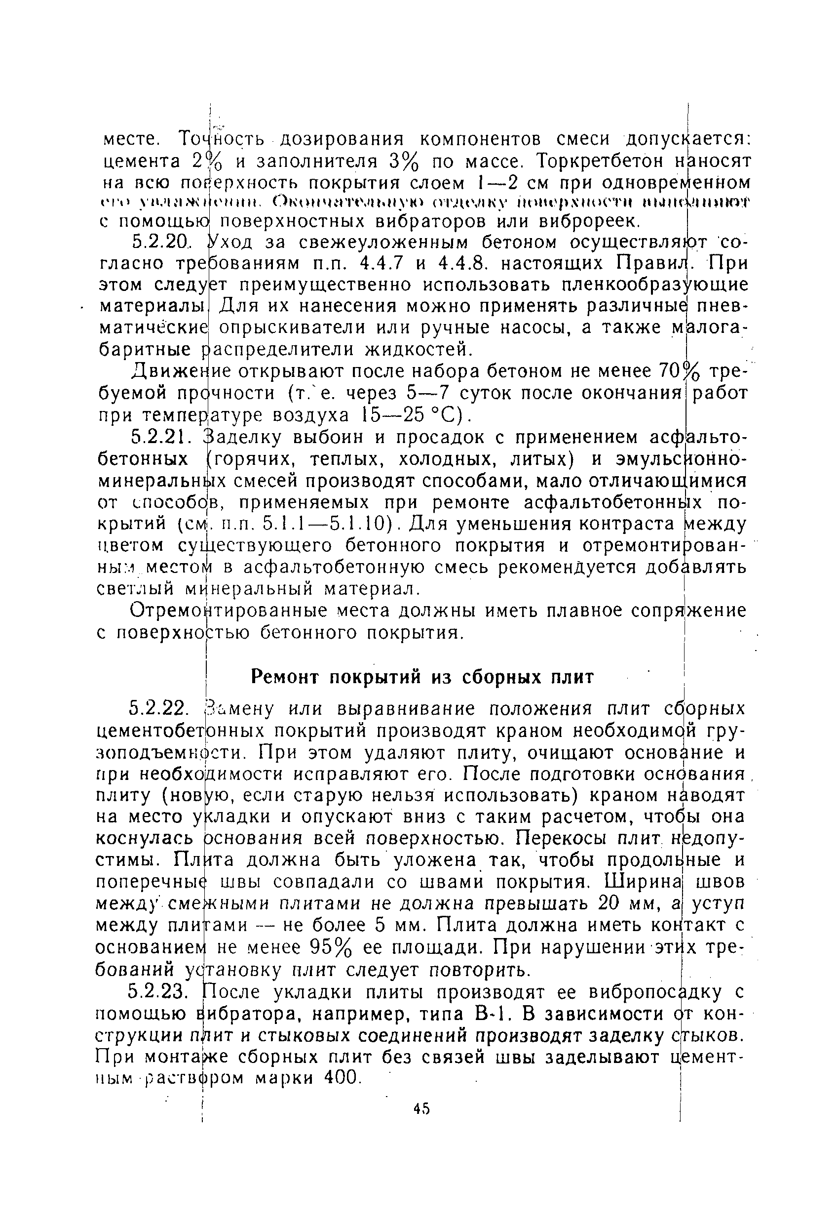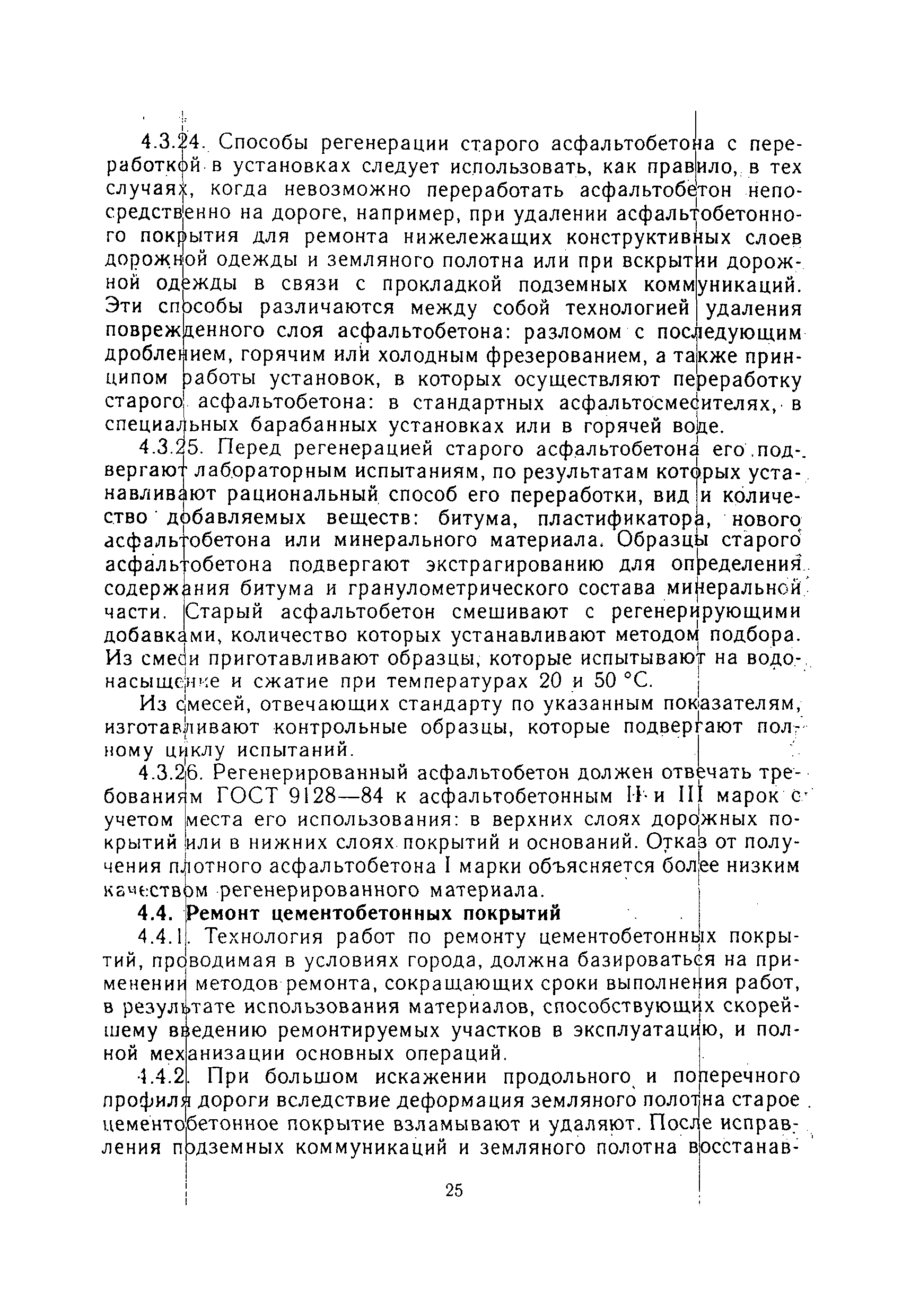 | Оглавление: | 1. Общие положения 2. Требования к транспортно-эксплуатационному состоянию городских дорог 3. Состав работ по ремонту и содержанию городских дорог 4. Капитальный ремонт 4.1 Общая часть 4.2 Ремонт земляного полотна и водостоков 4.3 Ремонт асфальтобетонных покрытий Укладка нового слоя по существующему покрытию Ремонт методом регенерации старого асфальтобетона 4.4 Ремонт цементобетонных покрытий 5. Текущий ремонт 5.1 Ремонт асфальтобетонных покрытий Заделка выбоин и просадок Ликвидация волн и наплывов Заделка трещин Устройство слоя износа 5.2 Ремонт цементобетонных покрытий Заделка выбоин и просадок Ремонт покрытий из сборных плит Ремонт швов и заделка трещин Устройство слоя износа 5.3 Ремонт покрытий переходного и низшего типов 5.4 Восстановление дорожной одежды после разрытий 5.5 Ремонт бортового камня 5.6 Ремонт дождевой канализации 6. Содержание городских дорог 6.1 Содержание земляного полотна и водоотвода 6.2 Содержание дородных покрытий 6.3 Учет интенсивности движения и паспортизация городских дорог 7. Правила приемки и контроль качества работ 7.1 Порядок приемки работ по ремонту городских улиц 7.2 Контроль качества работ Земляное полотно и водостоки Дорожные одежды Приложение 1. Технологические схемы ремонта городских дорог Приложение 2. Машины и механизмы для ремонта и содержания дорог Приложение 3. Форма паспорта городской дороги |