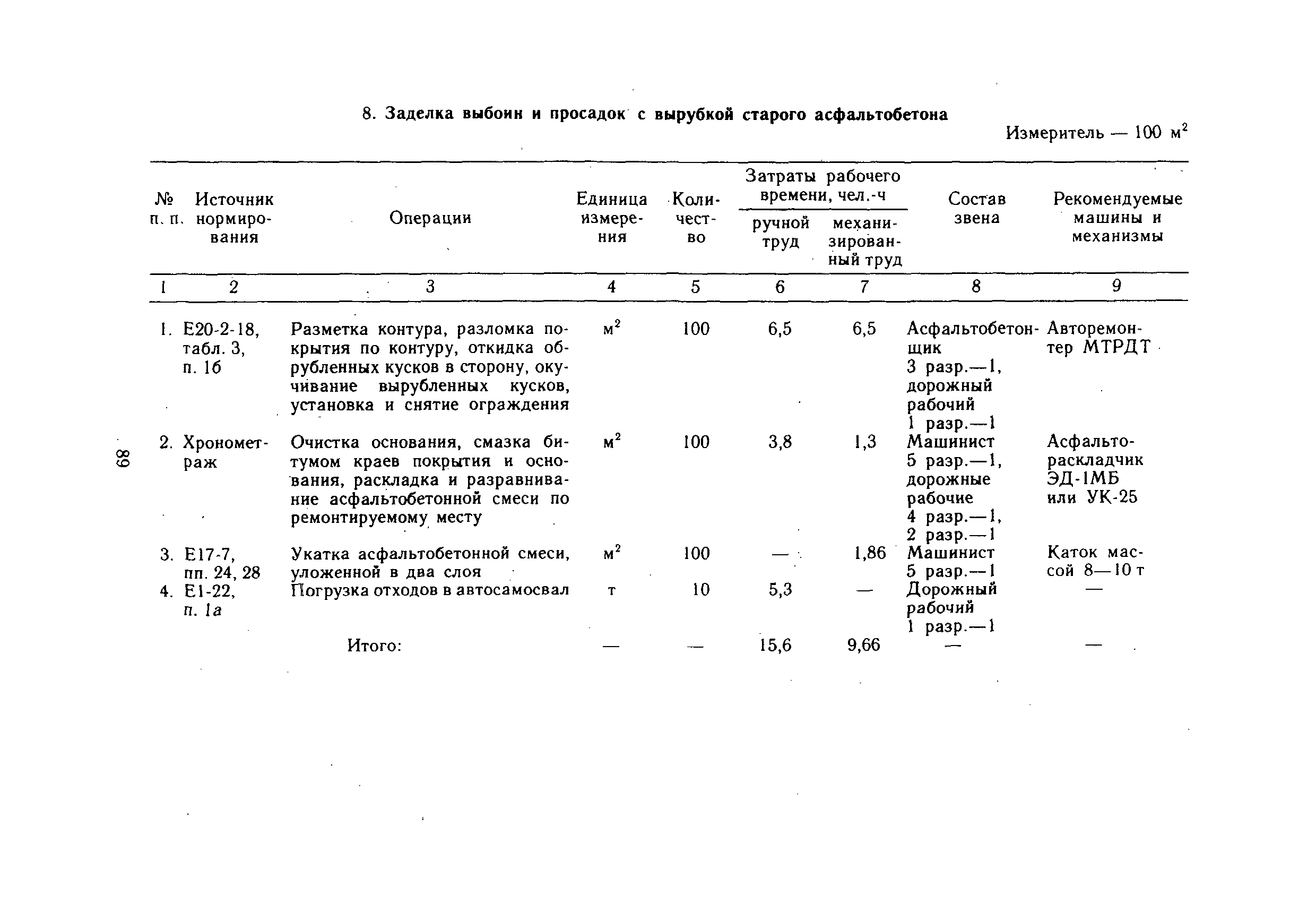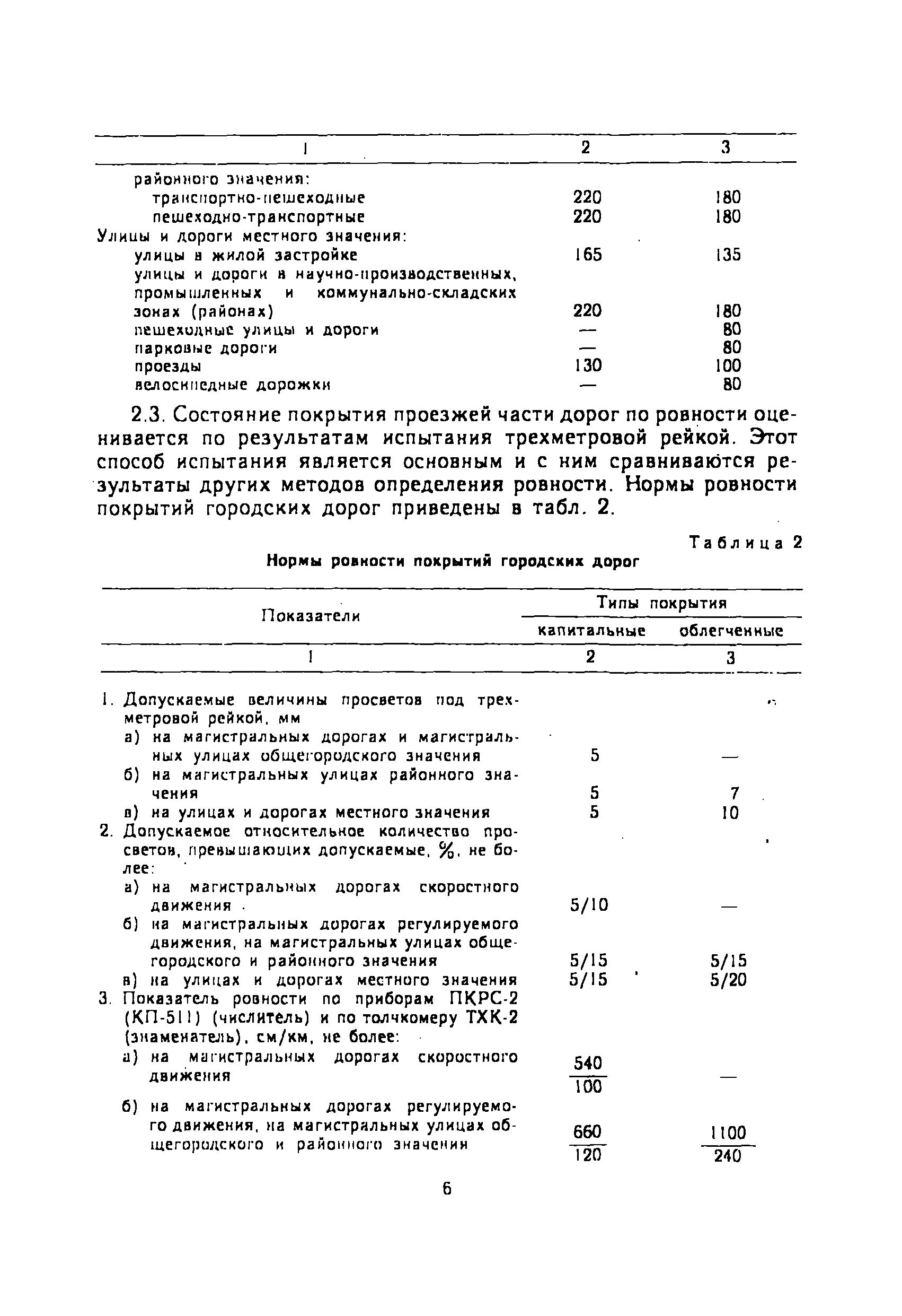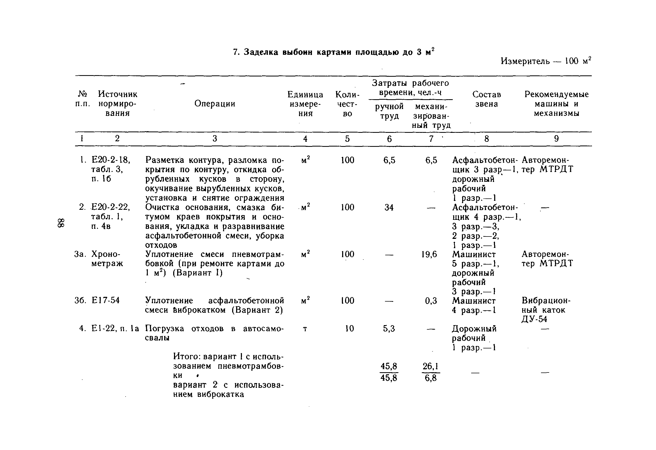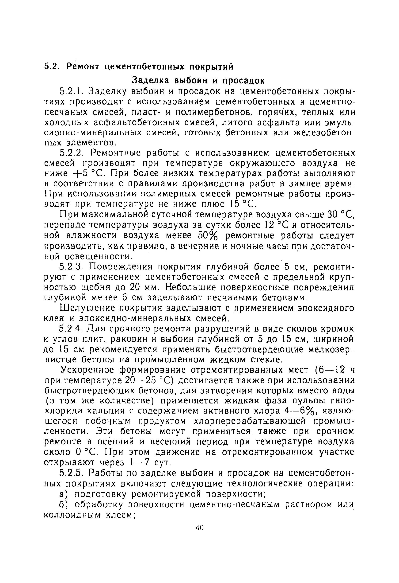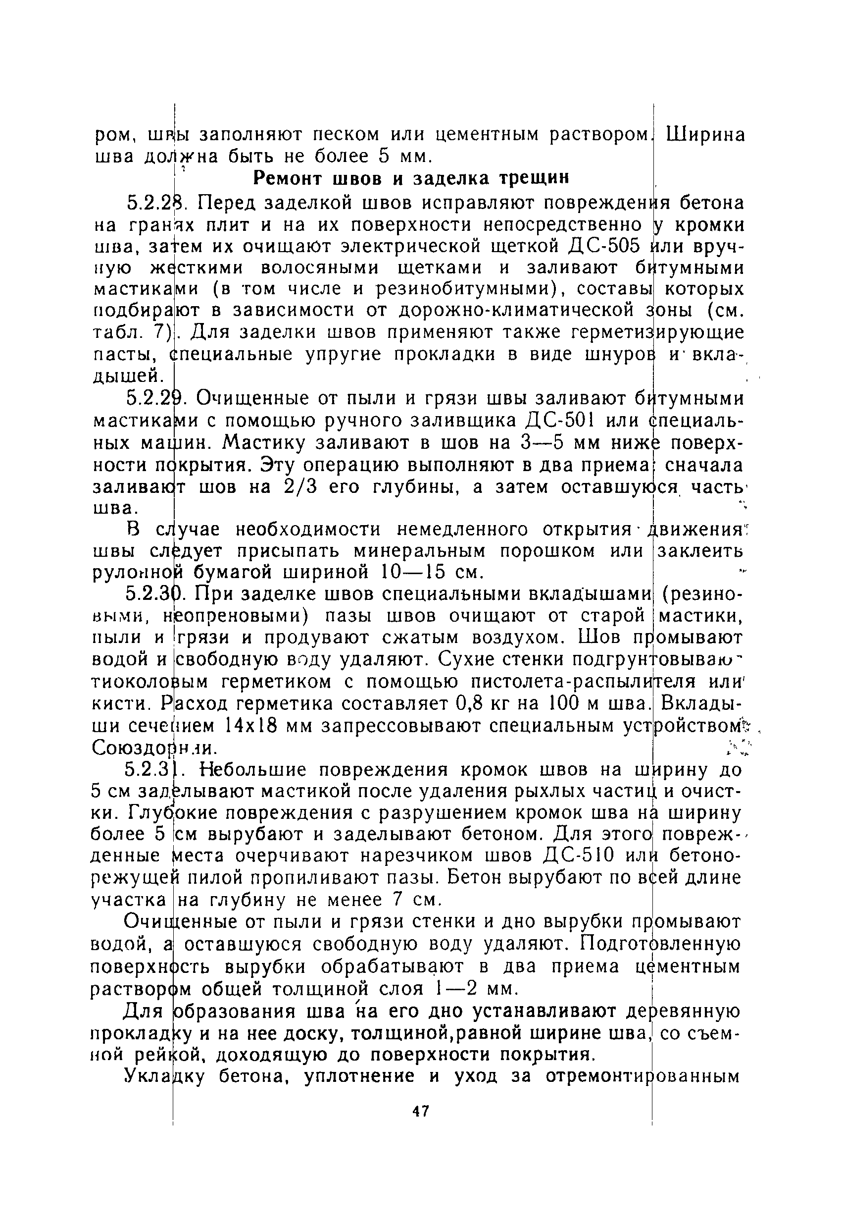 | Оглавление: | 1. Общие положения 2. Требования к транспортно-эксплуатационному состоянию городских дорог 3. Состав работ по ремонту и содержанию городских дорог 4. Капитальный ремонт 4.1 Общая часть 4.2 Ремонт земляного полотна и водостоков 4.3 Ремонт асфальтобетонных покрытий Укладка нового слоя по существующему покрытию Ремонт методом регенерации старого асфальтобетона 4.4 Ремонт цементобетонных покрытий 5. Текущий ремонт 5.1 Ремонт асфальтобетонных покрытий Заделка выбоин и просадок Ликвидация волн и наплывов Заделка трещин Устройство слоя износа 5.2 Ремонт цементобетонных покрытий Заделка выбоин и просадок Ремонт покрытий из сборных плит Ремонт швов и заделка трещин Устройство слоя износа 5.3 Ремонт покрытий переходного и низшего типов 5.4 Восстановление дорожной одежды после разрытий 5.5 Ремонт бортового камня 5.6 Ремонт дождевой канализации 6. Содержание городских дорог 6.1 Содержание земляного полотна и водоотвода 6.2 Содержание дородных покрытий 6.3 Учет интенсивности движения и паспортизация городских дорог 7. Правила приемки и контроль качества работ 7.1 Порядок приемки работ по ремонту городских улиц 7.2 Контроль качества работ Земляное полотно и водостоки Дорожные одежды Приложение 1. Технологические схемы ремонта городских дорог Приложение 2. Машины и механизмы для ремонта и содержания дорог Приложение 3. Форма паспорта городской дороги |