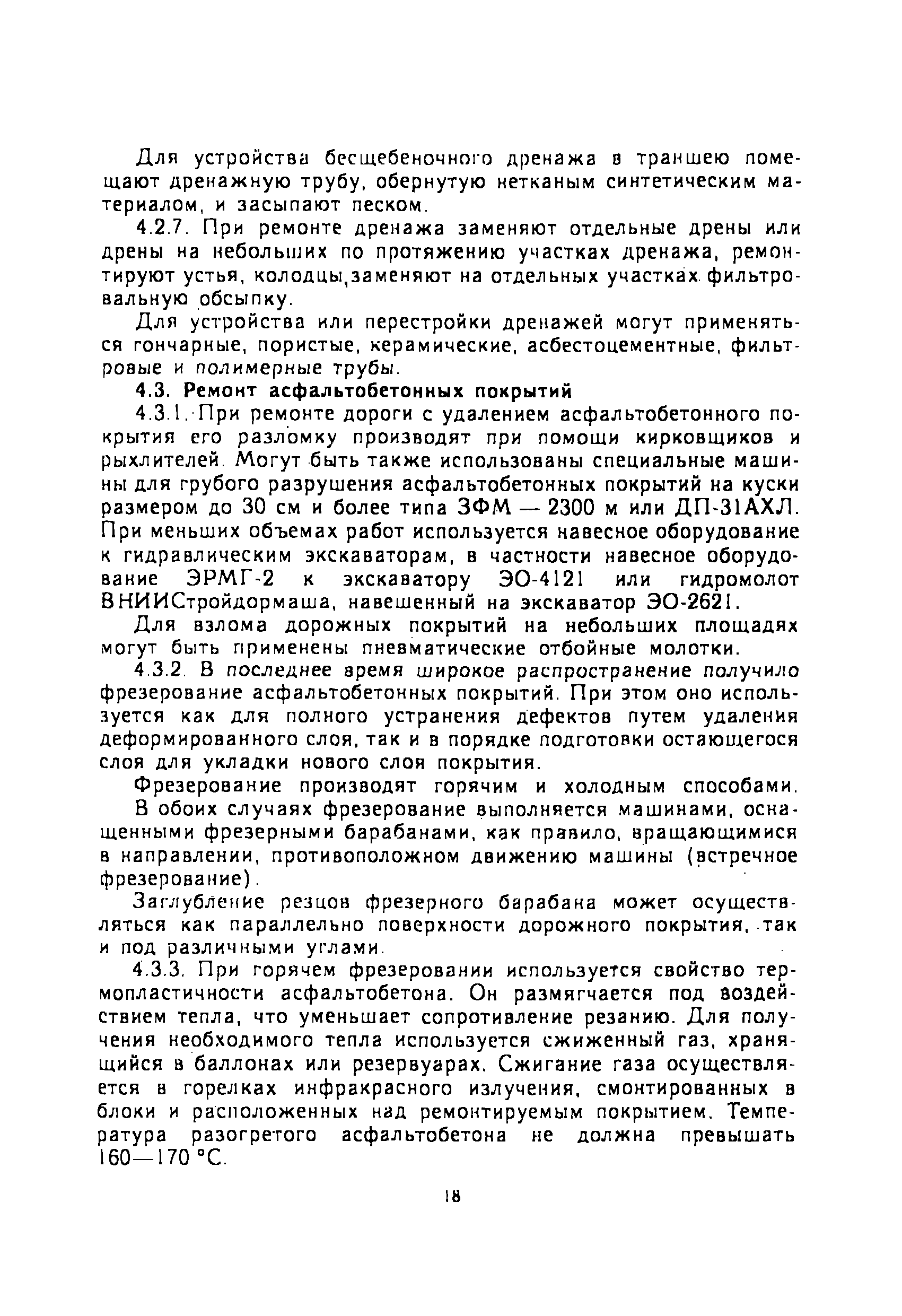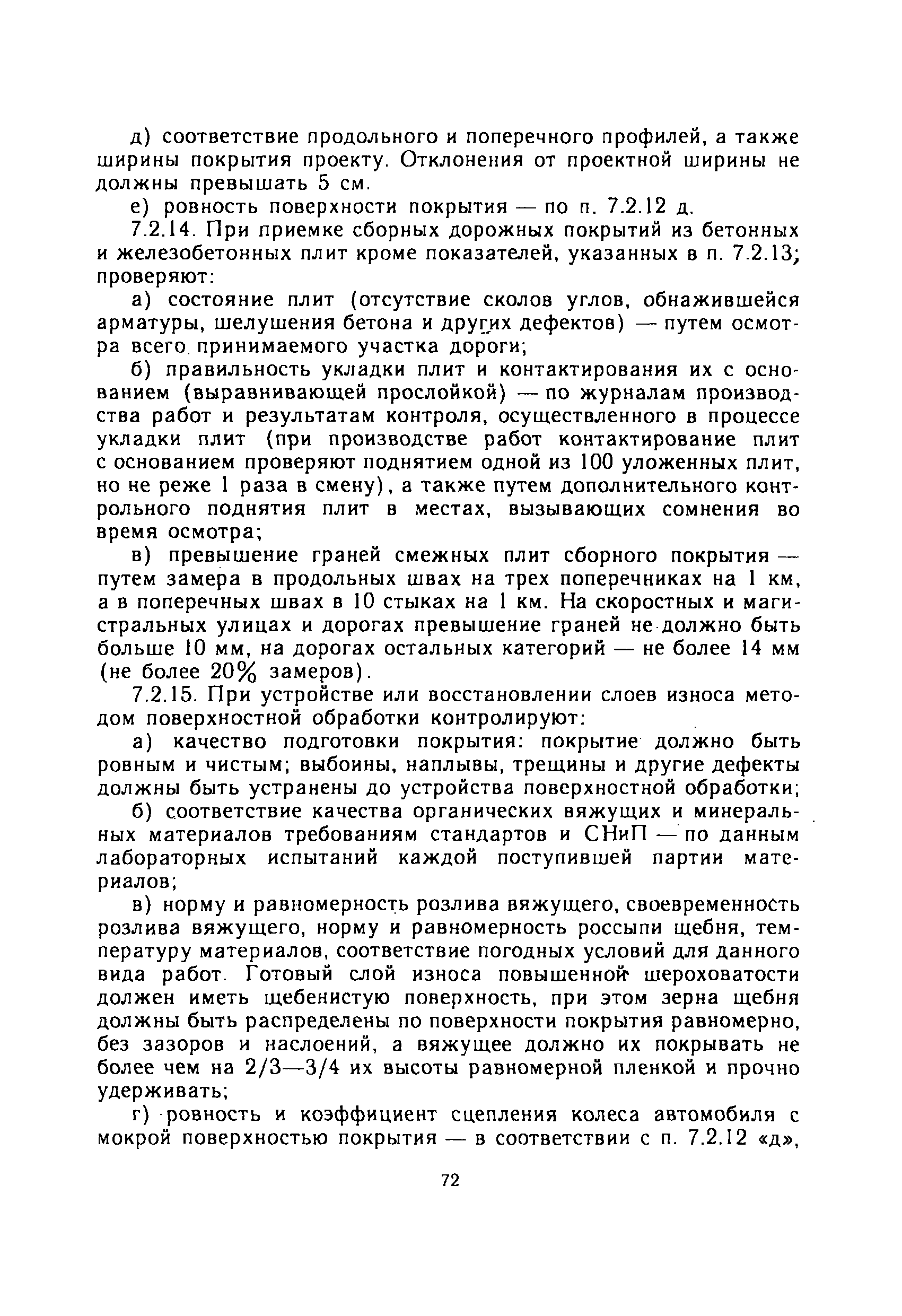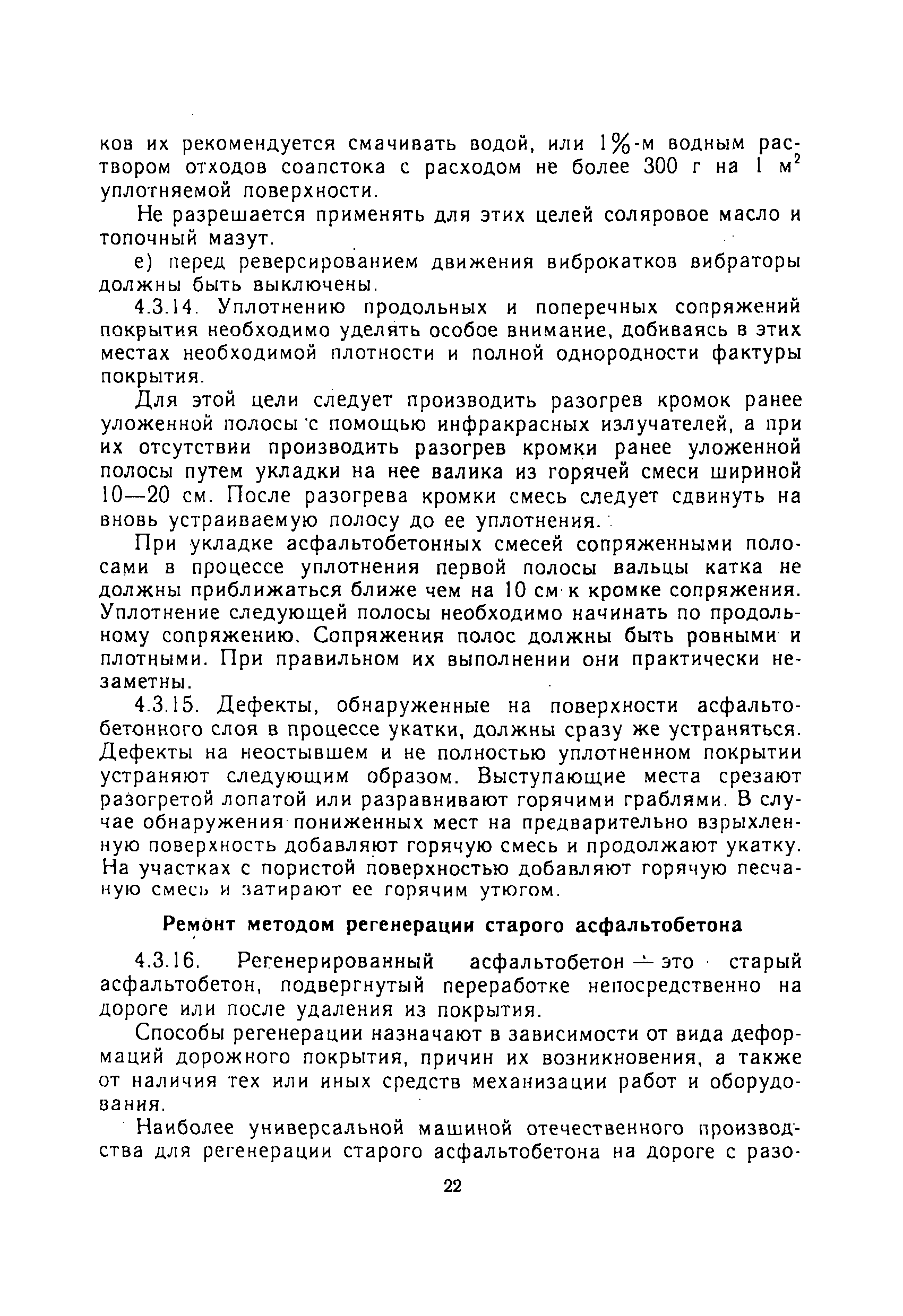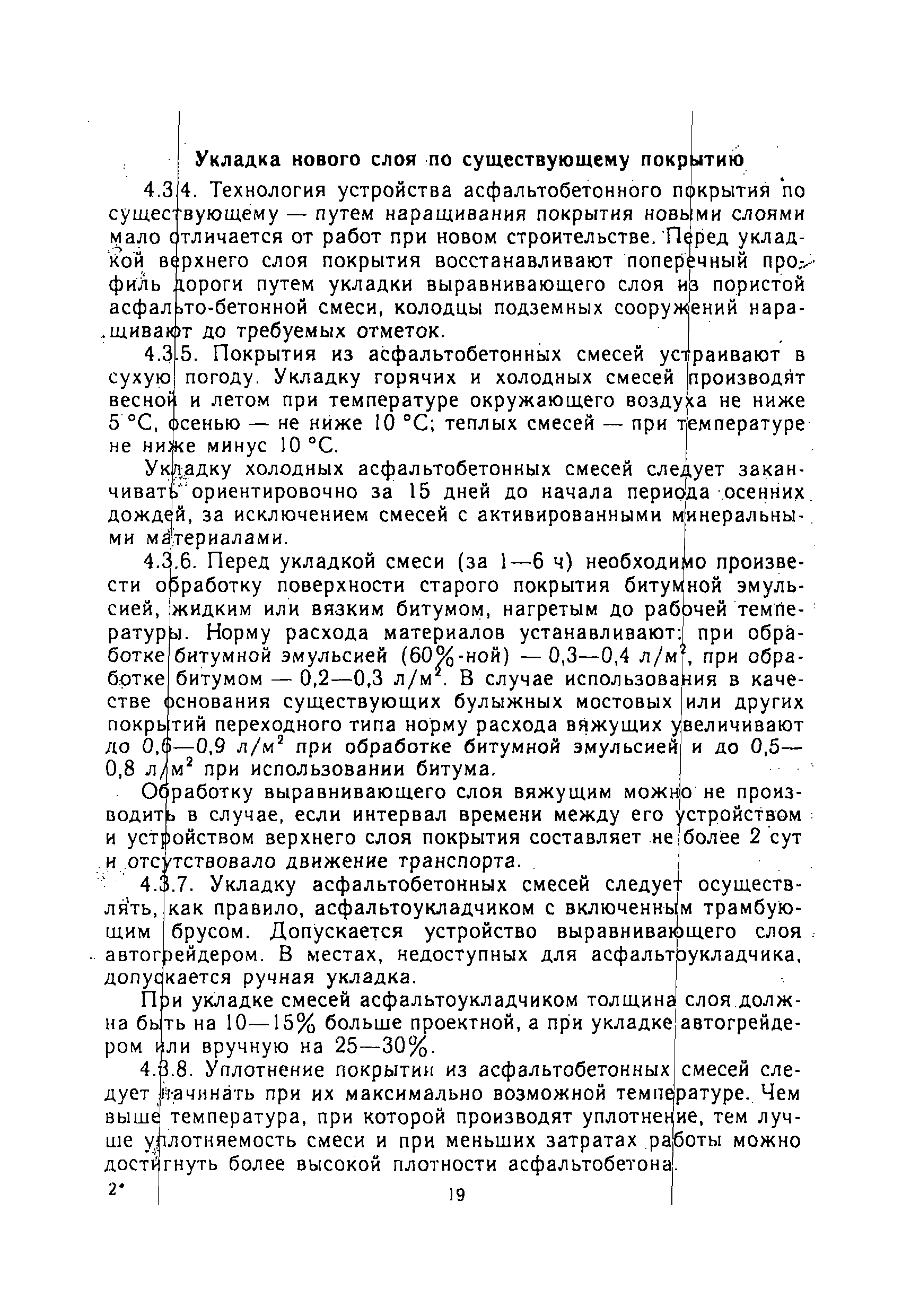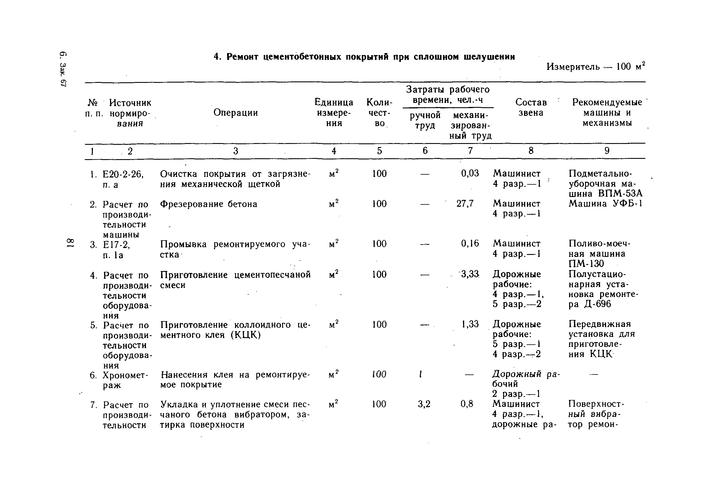 | Оглавление: | 1. Общие положения 2. Требования к транспортно-эксплуатационному состоянию городских дорог 3. Состав работ по ремонту и содержанию городских дорог 4. Капитальный ремонт 4.1 Общая часть 4.2 Ремонт земляного полотна и водостоков 4.3 Ремонт асфальтобетонных покрытий Укладка нового слоя по существующему покрытию Ремонт методом регенерации старого асфальтобетона 4.4 Ремонт цементобетонных покрытий 5. Текущий ремонт 5.1 Ремонт асфальтобетонных покрытий Заделка выбоин и просадок Ликвидация волн и наплывов Заделка трещин Устройство слоя износа 5.2 Ремонт цементобетонных покрытий Заделка выбоин и просадок Ремонт покрытий из сборных плит Ремонт швов и заделка трещин Устройство слоя износа 5.3 Ремонт покрытий переходного и низшего типов 5.4 Восстановление дорожной одежды после разрытий 5.5 Ремонт бортового камня 5.6 Ремонт дождевой канализации 6. Содержание городских дорог 6.1 Содержание земляного полотна и водоотвода 6.2 Содержание дородных покрытий 6.3 Учет интенсивности движения и паспортизация городских дорог 7. Правила приемки и контроль качества работ 7.1 Порядок приемки работ по ремонту городских улиц 7.2 Контроль качества работ Земляное полотно и водостоки Дорожные одежды Приложение 1. Технологические схемы ремонта городских дорог Приложение 2. Машины и механизмы для ремонта и содержания дорог Приложение 3. Форма паспорта городской дороги |