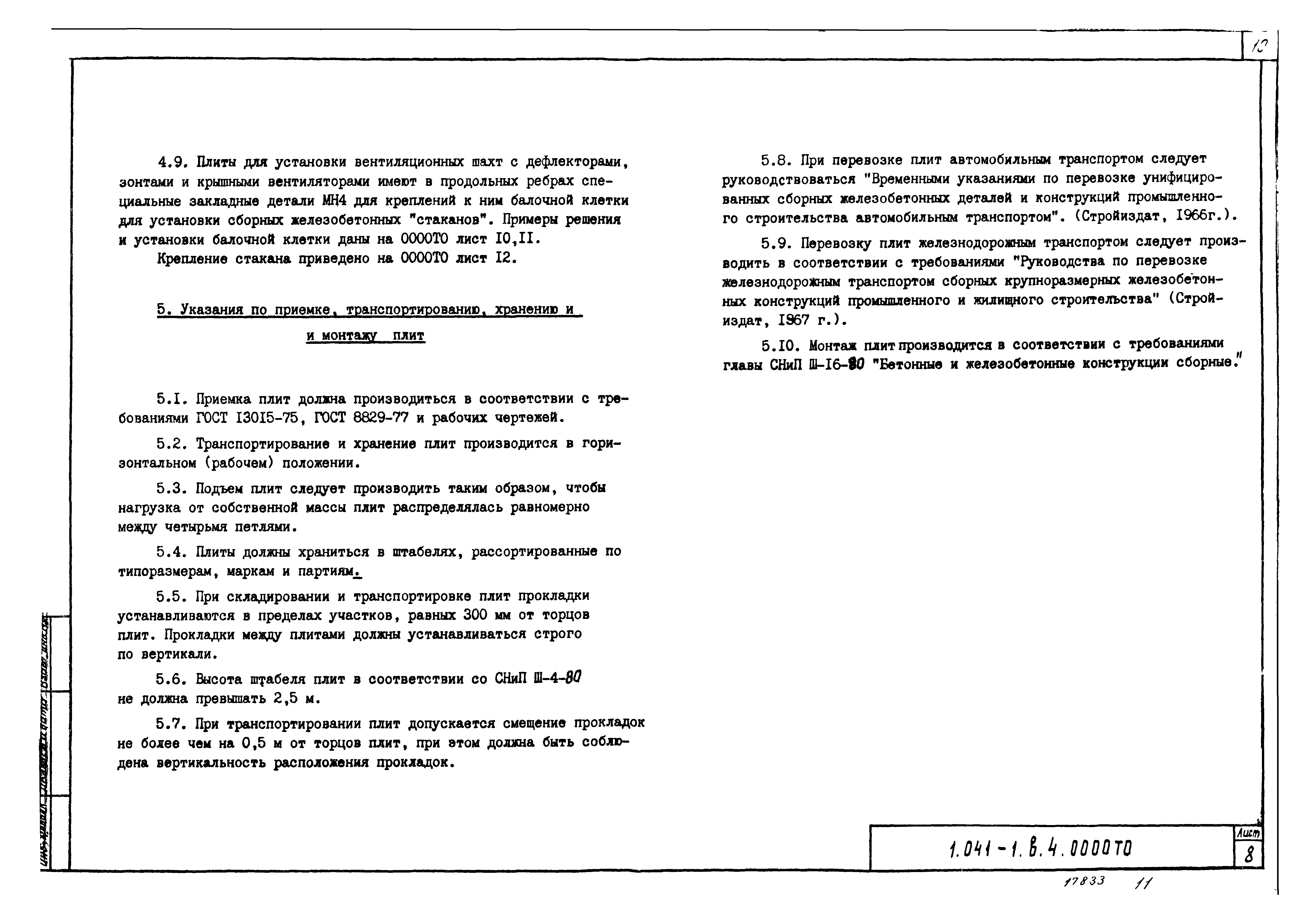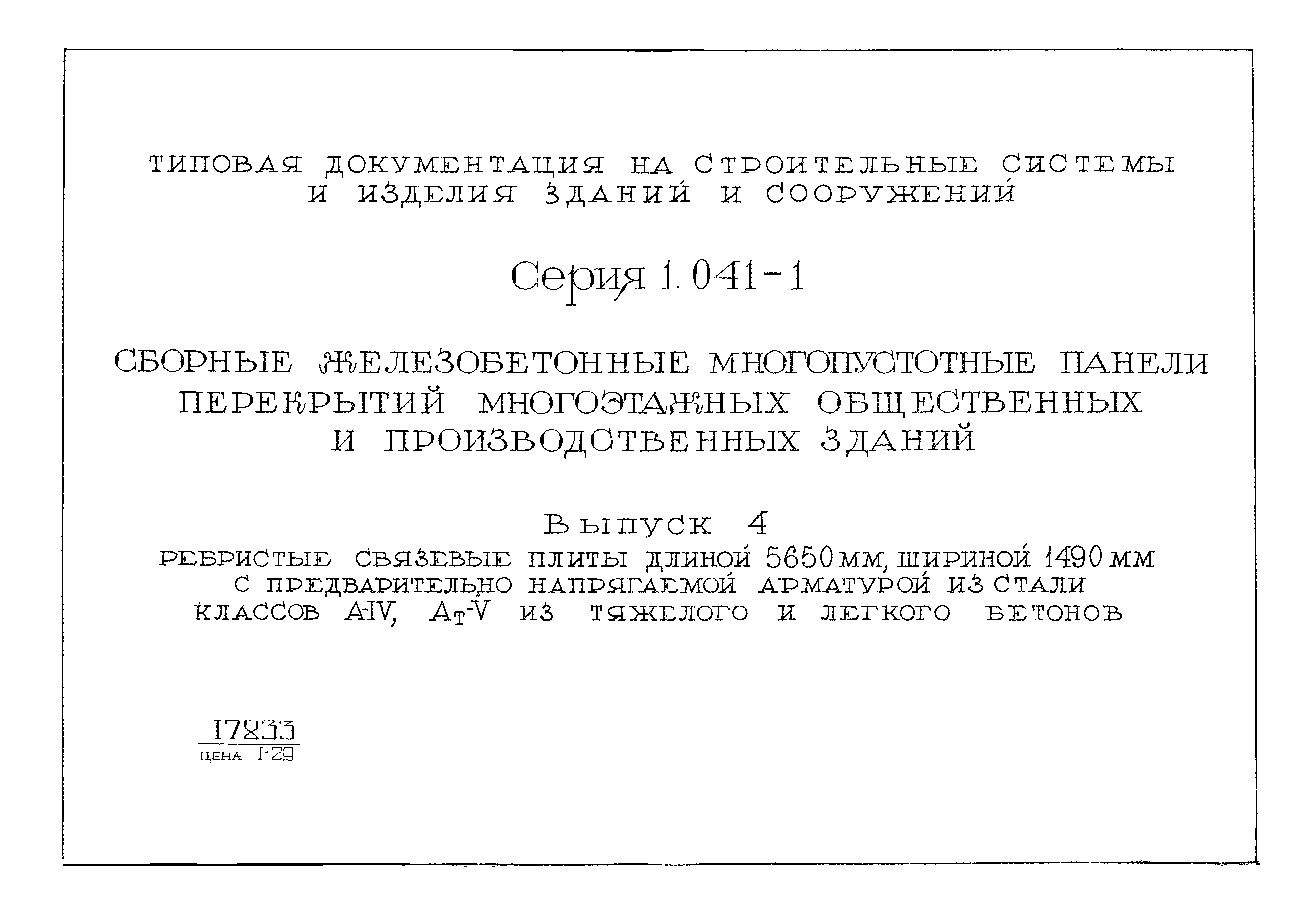 | Название рус.: | Выпуск 4. Ребристые связевые плиты длиной 5650 мм, шириной 1490 мм с предварительно напрягаемой арматурой из стали классов А-IV, Ат-V из тяжелого и легкого бетонов |