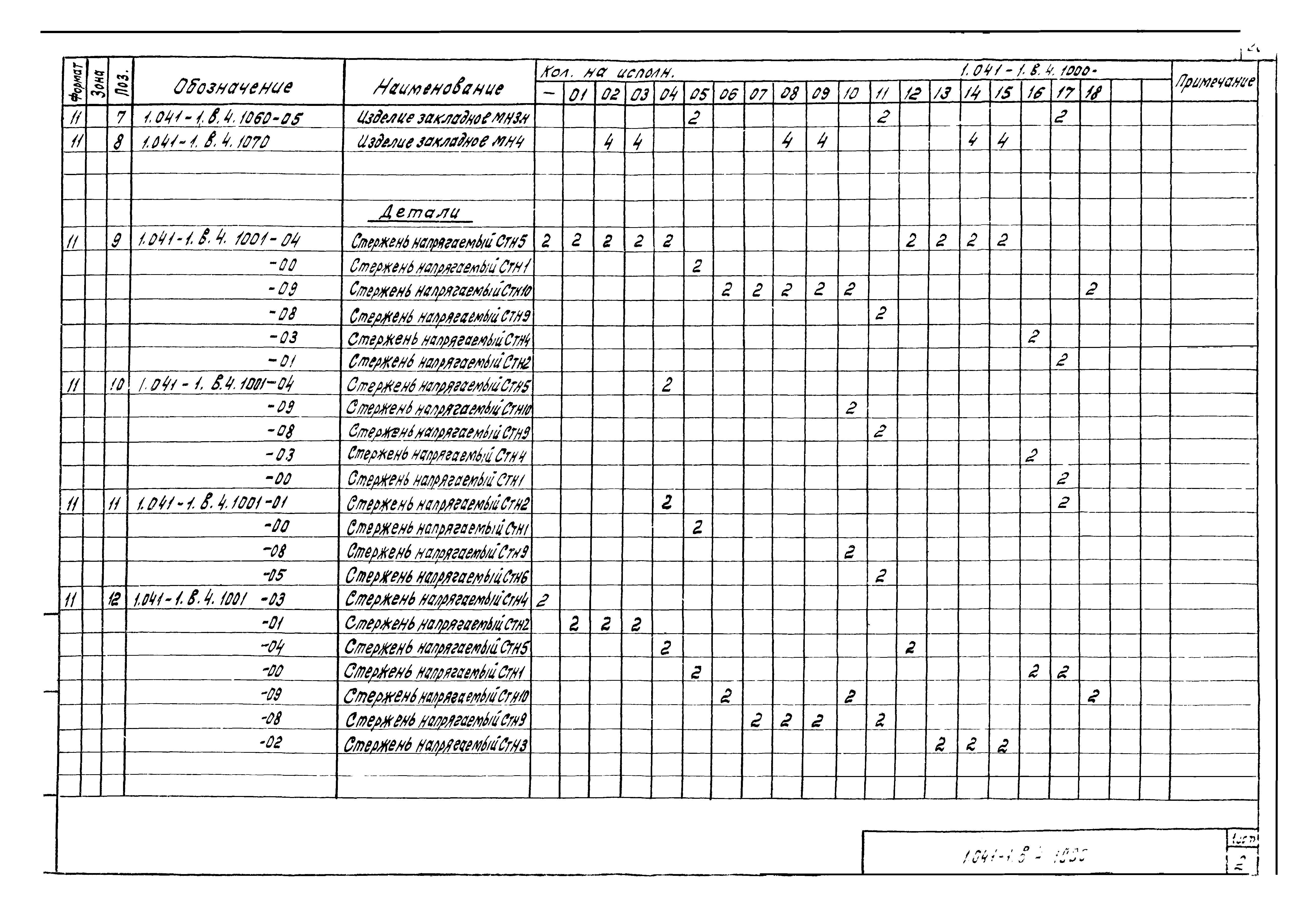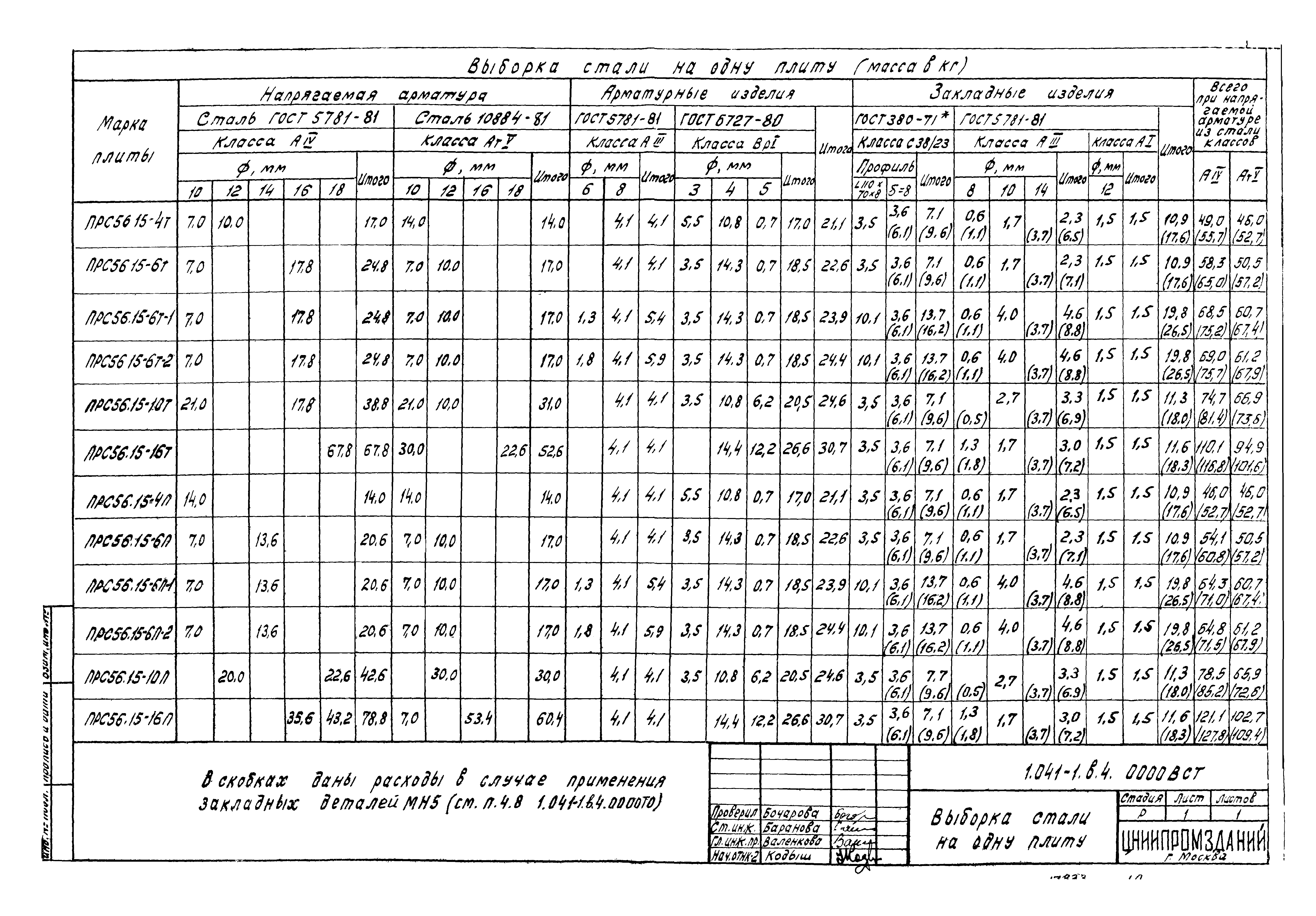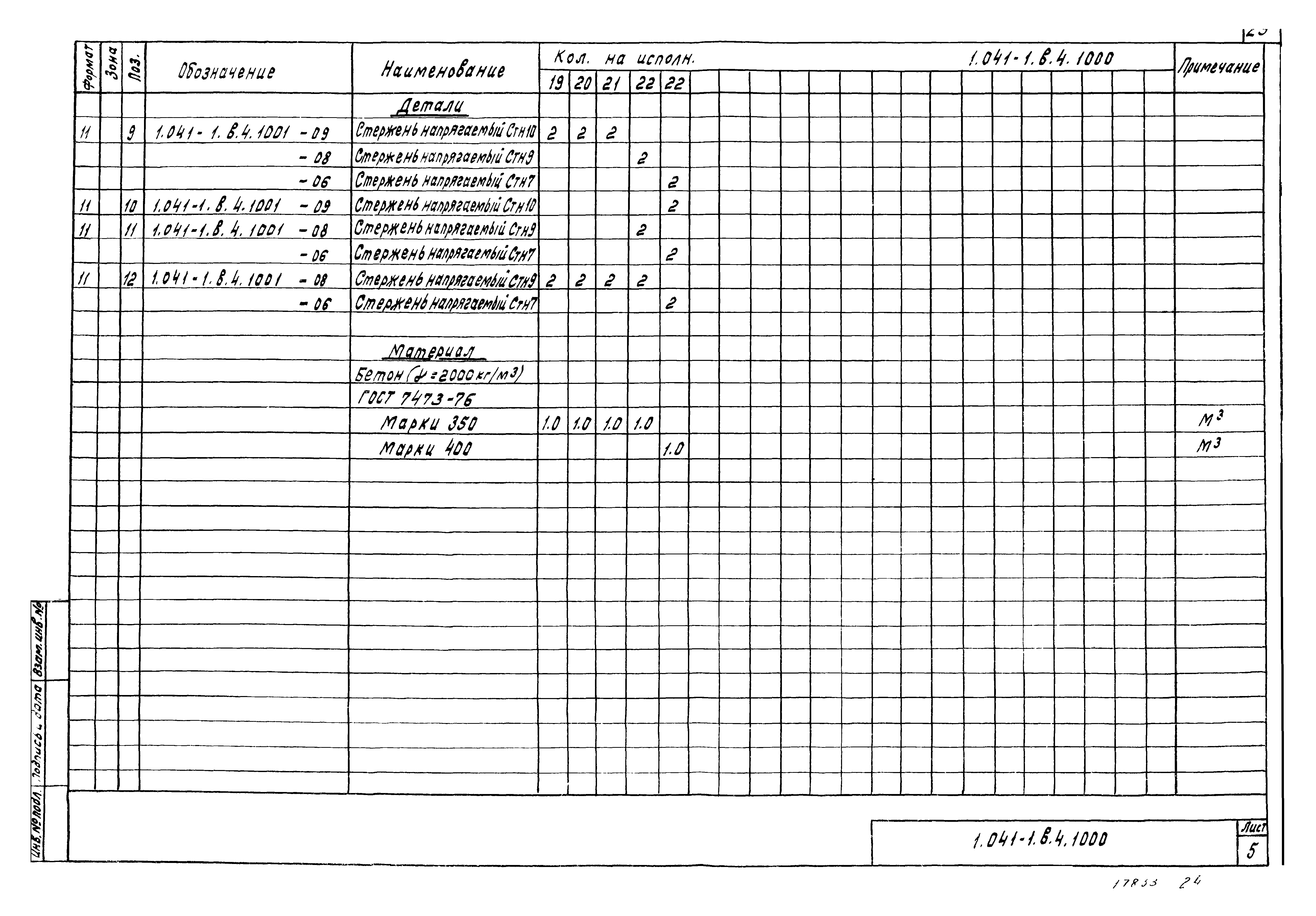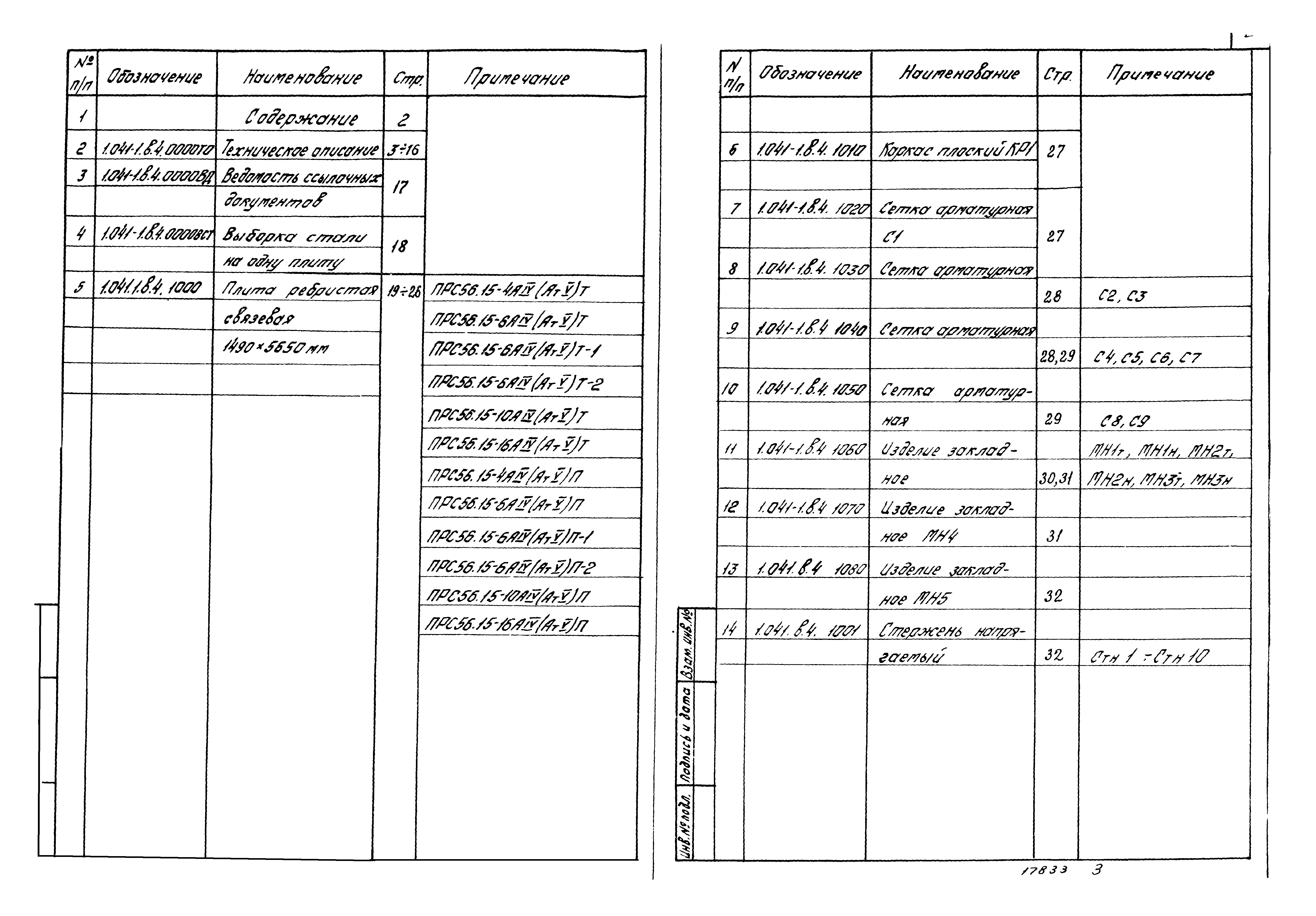 | Оглавление: | Содержание 1.041-1.в.4.0000 ТО Техническое описание 1.041-1.в.4.0000 ВД Ведомость ссылочных документов 1.041-1.в.4.0000 ВСТ Выборка стали на одну плиту 1.041-1.в.4.1000 Плита ребристая связевая 1490х5650 мм 1.041-1.в.4.1010 Каркас плоский КР1 1.041-1.в.4.1020 Сетка арматурная С1 1.041-1.в.4.1030 Сетка арматурная 1.041-1.в.4.1040 Сетка арматурная 1.041-1.в.4.1050 Сетка арматурная 1.041-1.в.4.1060 Изделие закладное 1.041-1.в.4.1070 Изделие закладное МН4 1.041-1.в.4.1080 Изделие закладное МН5 1.041-1.в.4.1001 Стержень напрягаемый |