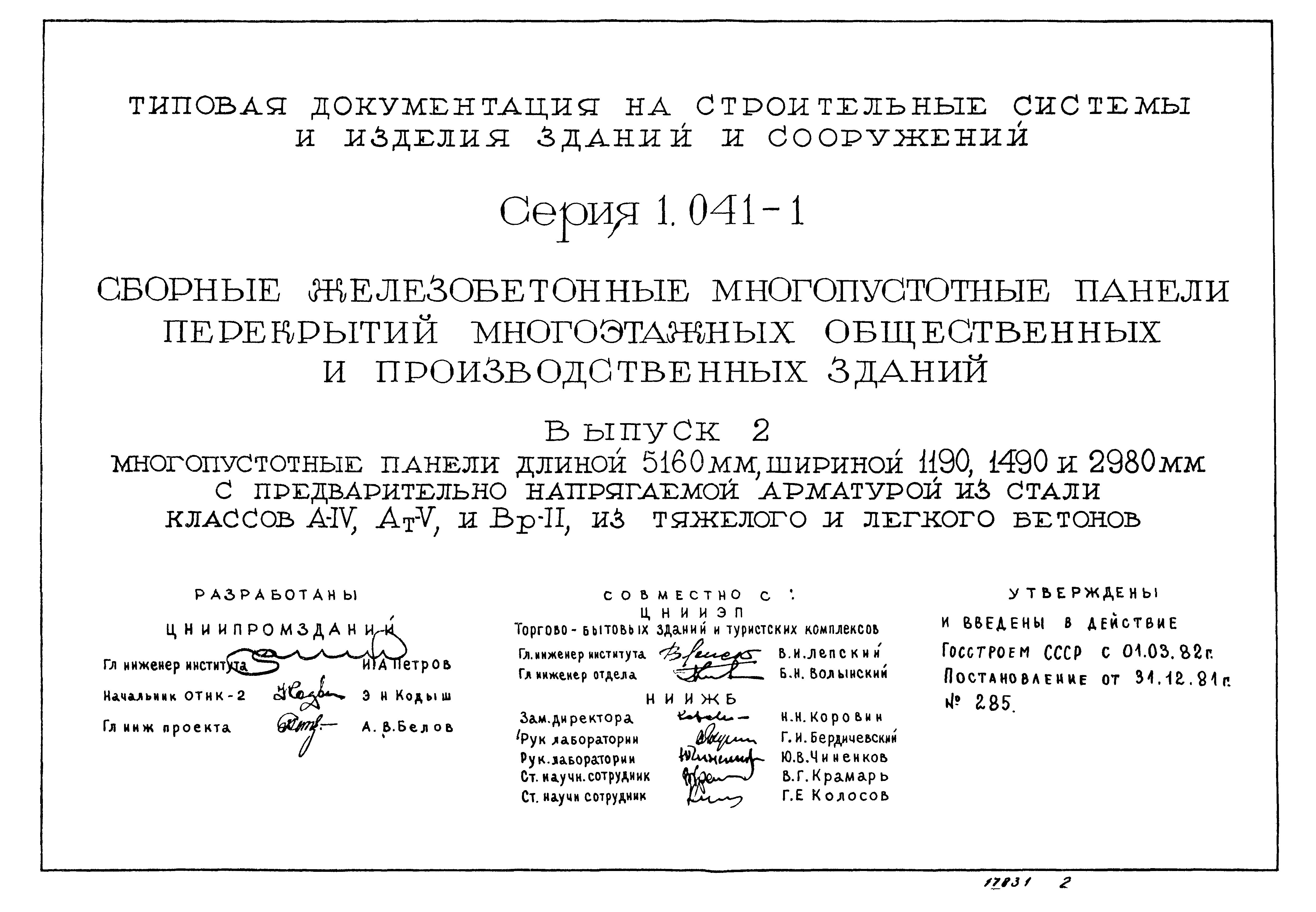 | Утверждён: | 31.12.1981 Госстрой СССР (Государственный комитет Совета Министров СССР по делам строительства) (USSR Gosstroy 285) |