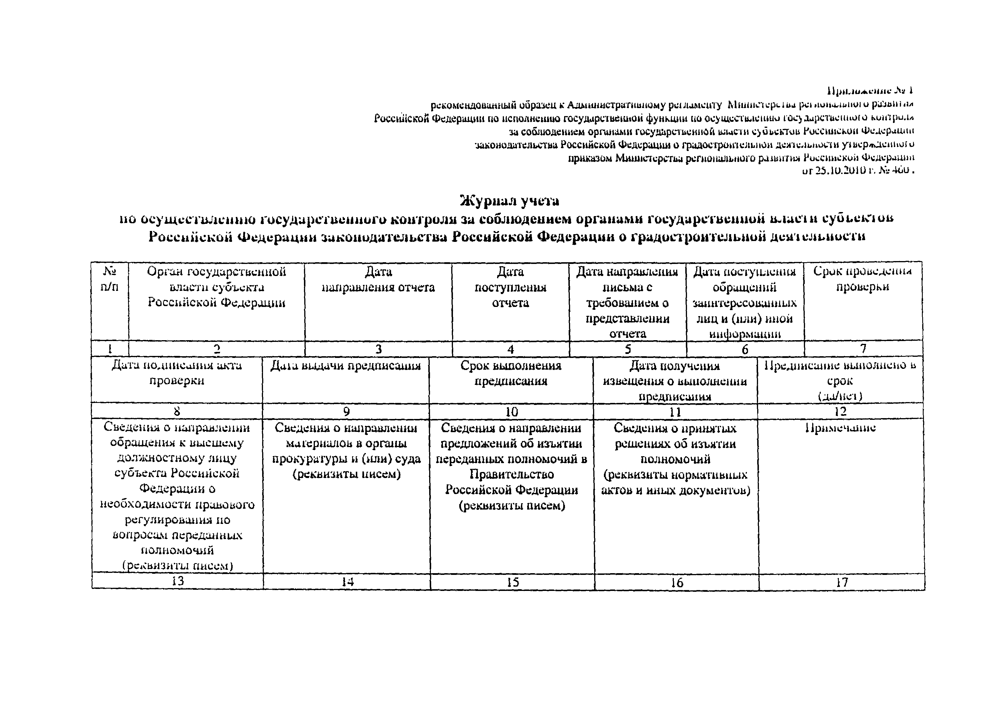| Оглавление: | 1. Общие положения 2. Требования к порядку исполнения государственной функции 3. Административные процедуры 4. Порядок и формы контроля за исполнением государственной функции 5. Порядок обжалования действий (бездействия) должностных лиц и их решений, принятых при исполнении государственной функции Приложение 1. Журнал учета по осуществлению государственного контроля за соблюдением органами государственной власти и субъектов Российской Федерации законодательства Российской Федерации о градостроительной деятельности Приложение 2. Блок-схема последовательности действий по исполнению государственной функции по осуществлению государственного контроля за соблюдением органами государственной власти субъектов Российской Федерации законодательства Российской Федерации о градостроительной деятельности |