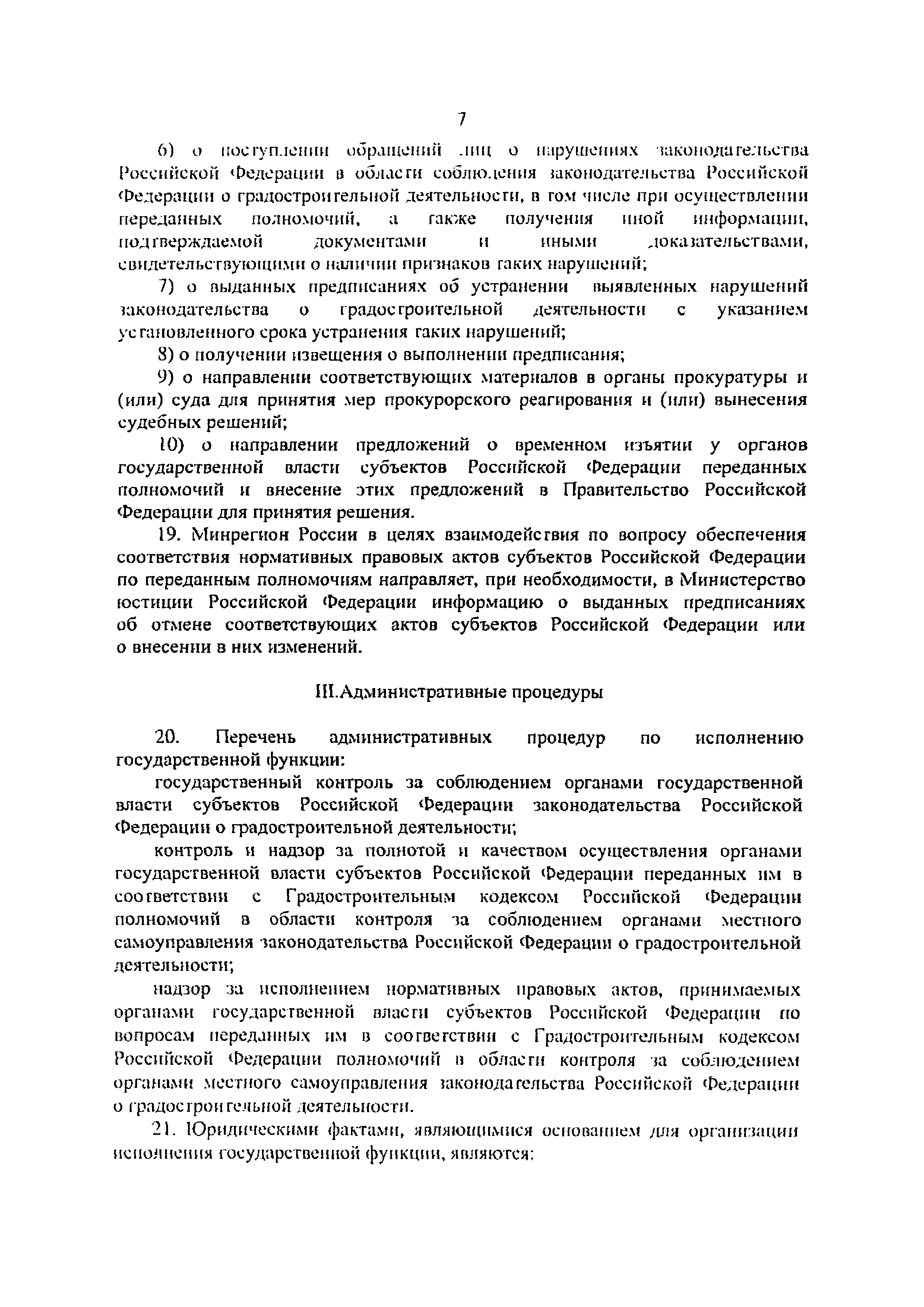| Область применения: | Административный регламент Министерства регионального развития Российской Федерации по исполнению государственной функции по осуществлению государственного контроля за соблюдением органами государственной власти субъектов Российской Федерации законодательства Российской Федерации о градостроительной деятельности определяет сроки и последовательность действий (административных процедур) Министерства Регионального развития Российской Федерации, порядок взаимодействия между Минрегионом России, уполномоченными органами исполнительной власти субъектов Российской Федерации в области соблюдения законодательства о градостроительной деятельности, исполнения нормативных правовых актов, принимаемых органами государственной власти субъектов Российской Федерации по вопросам переданных полномочий, а также контроля и надзора за соблюдением органами местного самоуправления законодательства о градостроительной деятельности |