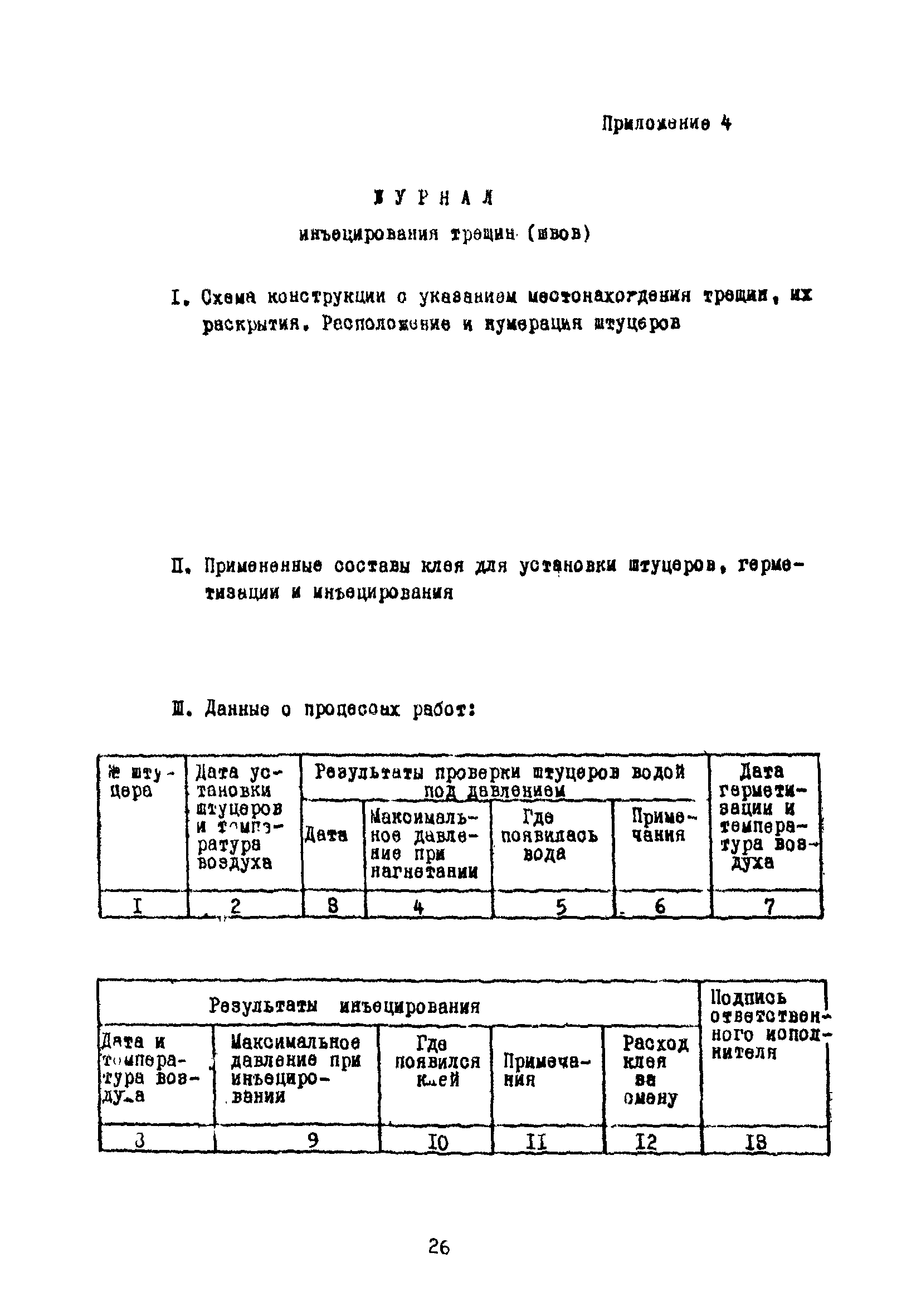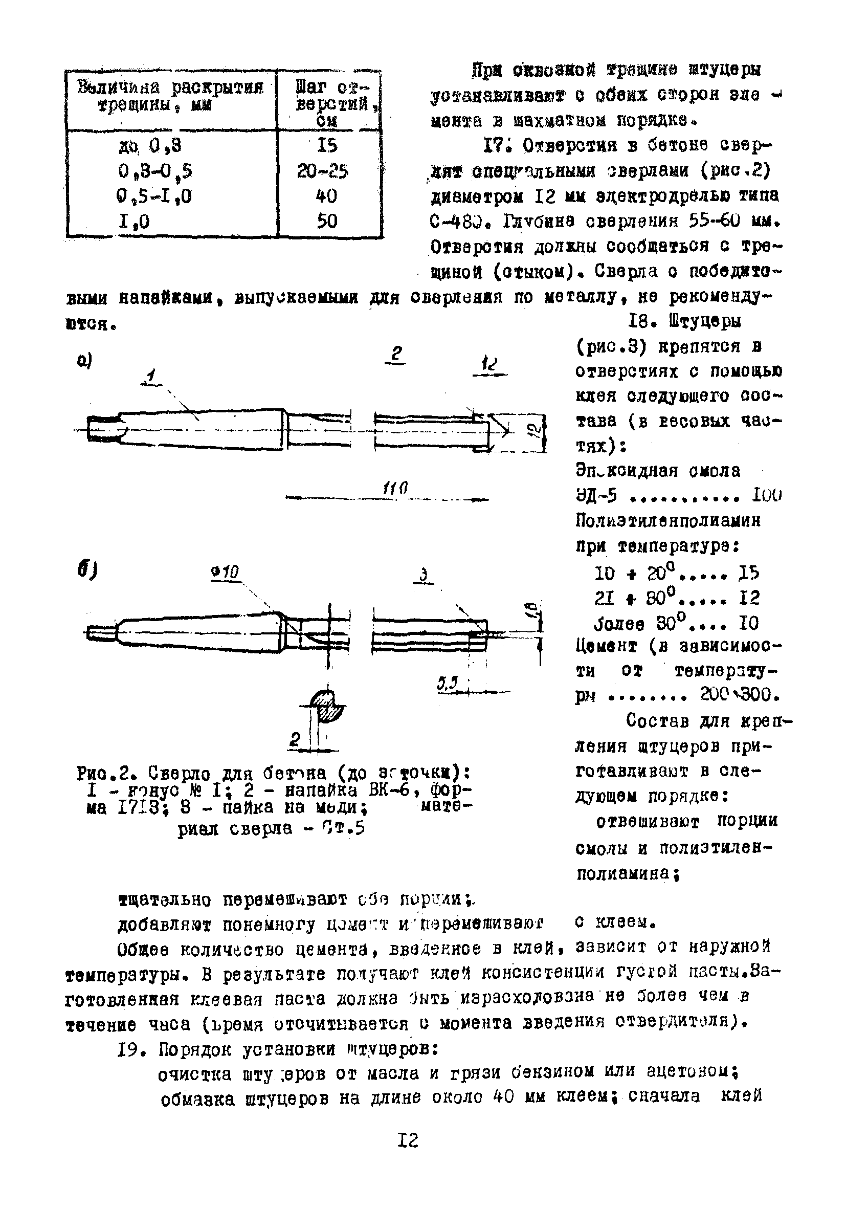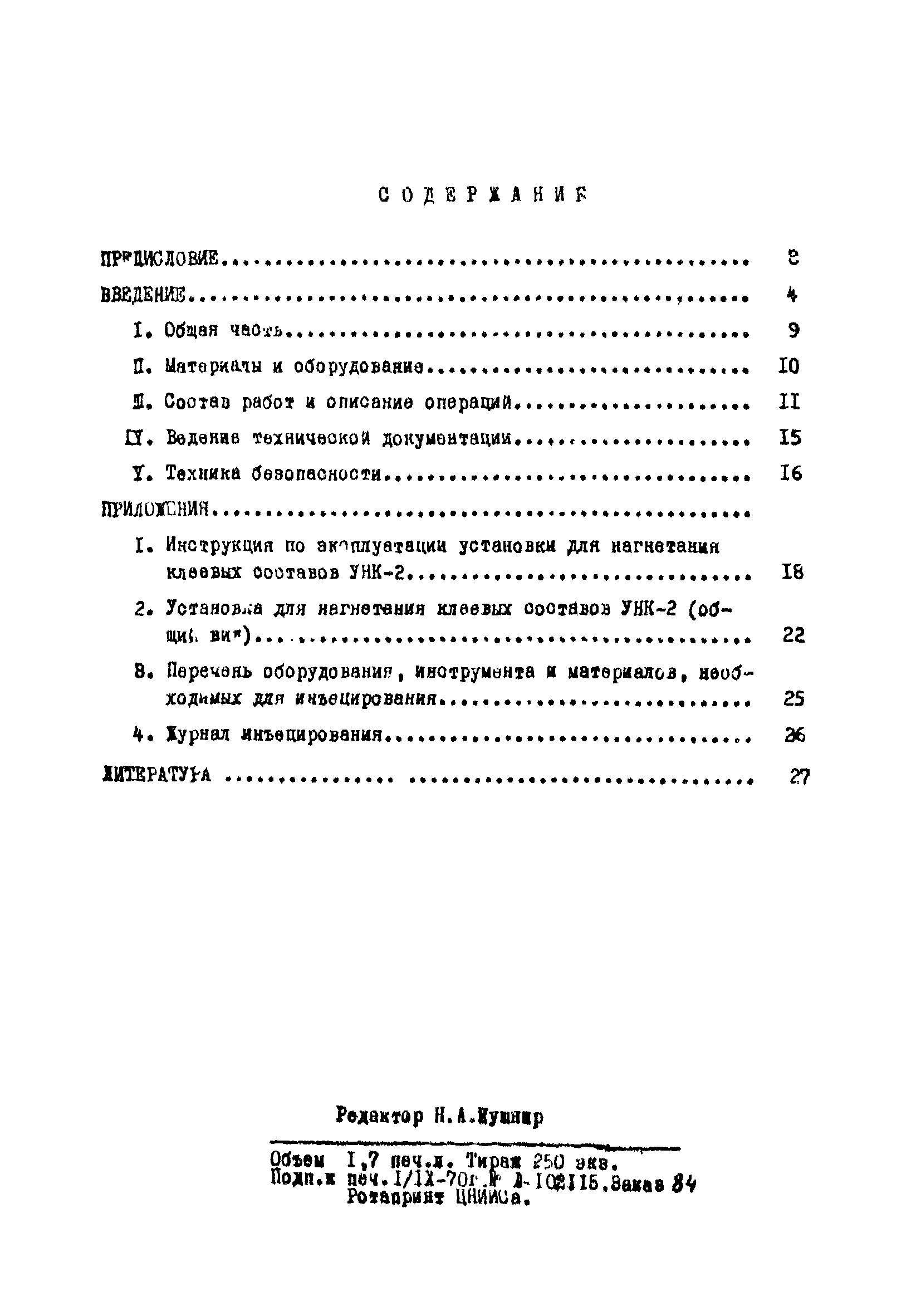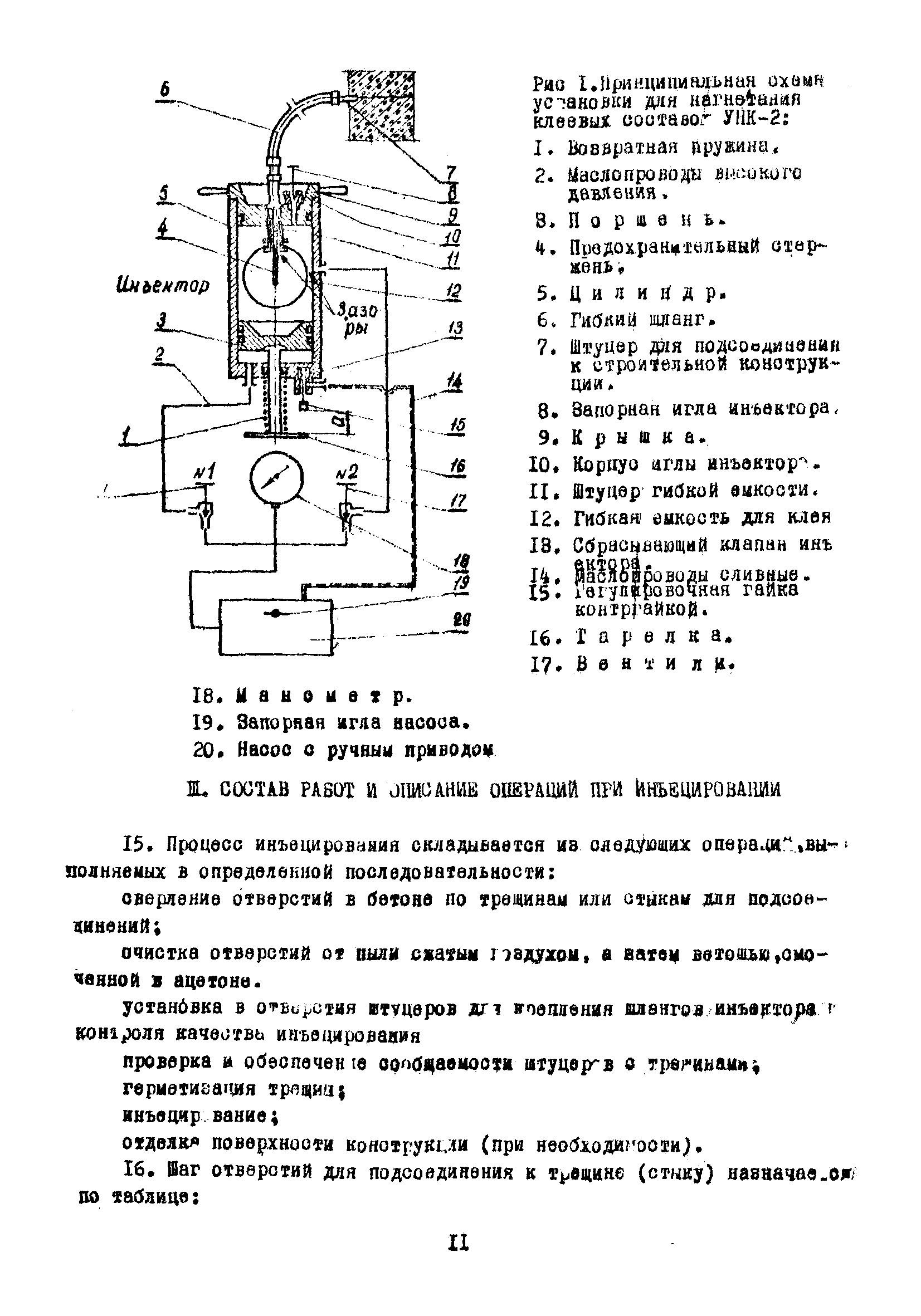 | Оглавление: | Предисловие Введение 1. Общая часть 2. Материалы и оборудование 3. Состав работ и описание операций 4. Ведение технической документации 5. Техника безопасности Приложения 1. Инструкция по эксплуатации установки для нагнетания клееных составов УНК-2 2. Установка для нагнетания клеевых составов УНК-2 (общий вид) 3. Перечень оборудования, инструментов и материалов, необходимых для инъецирования 4. Журнал инъецирования Литература |