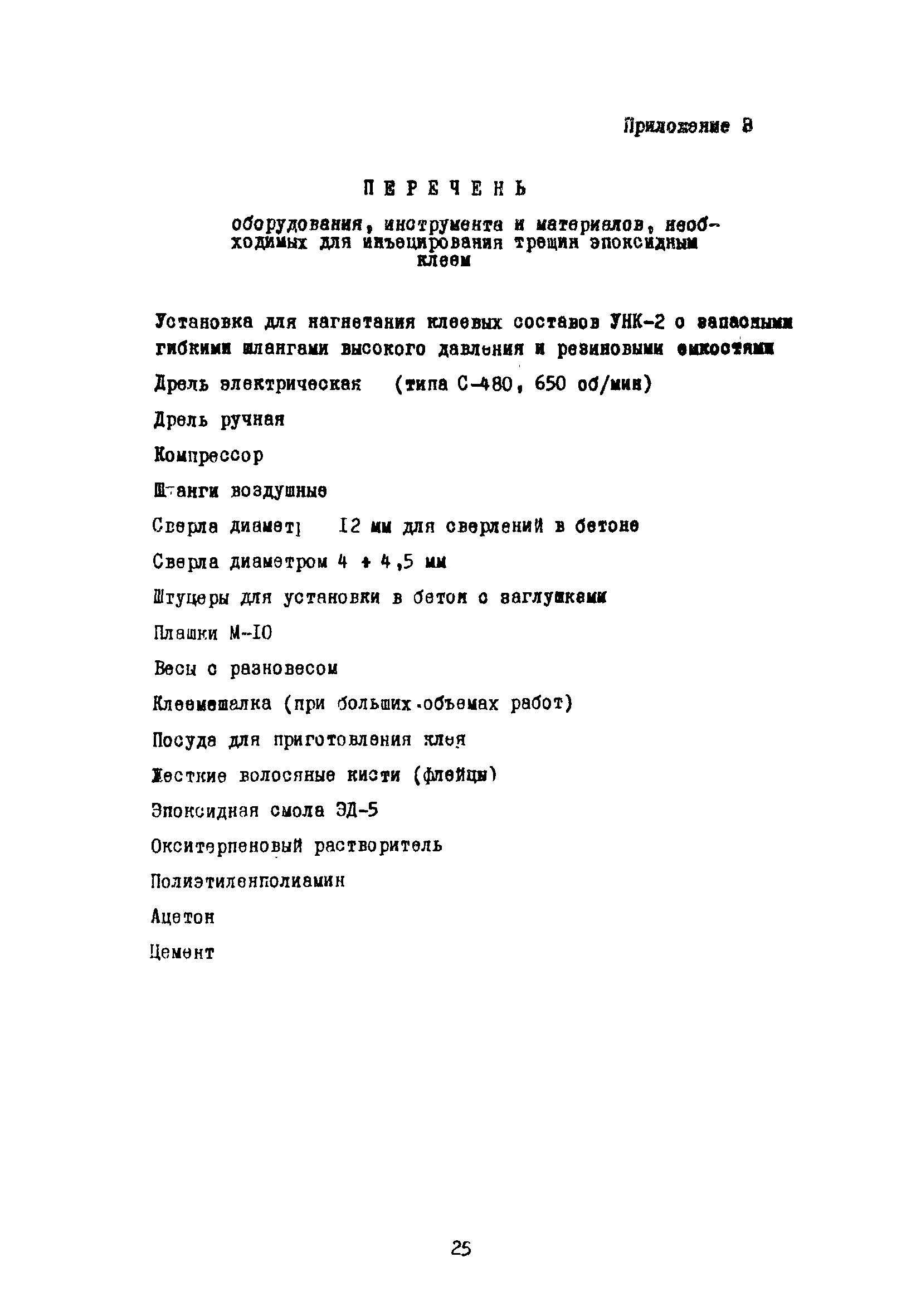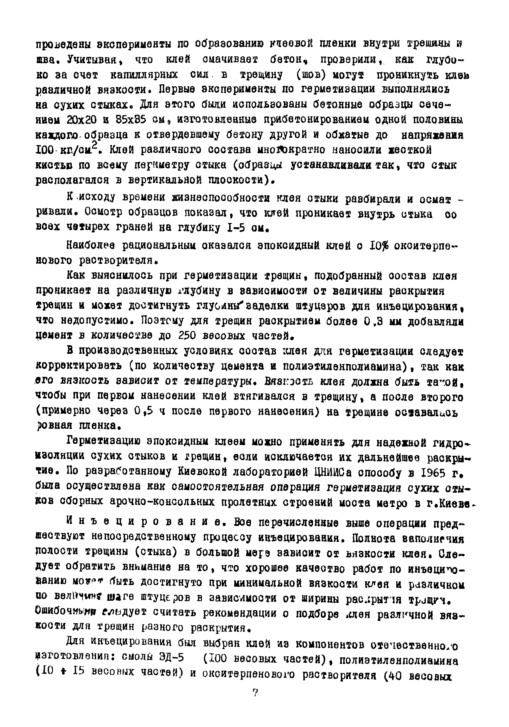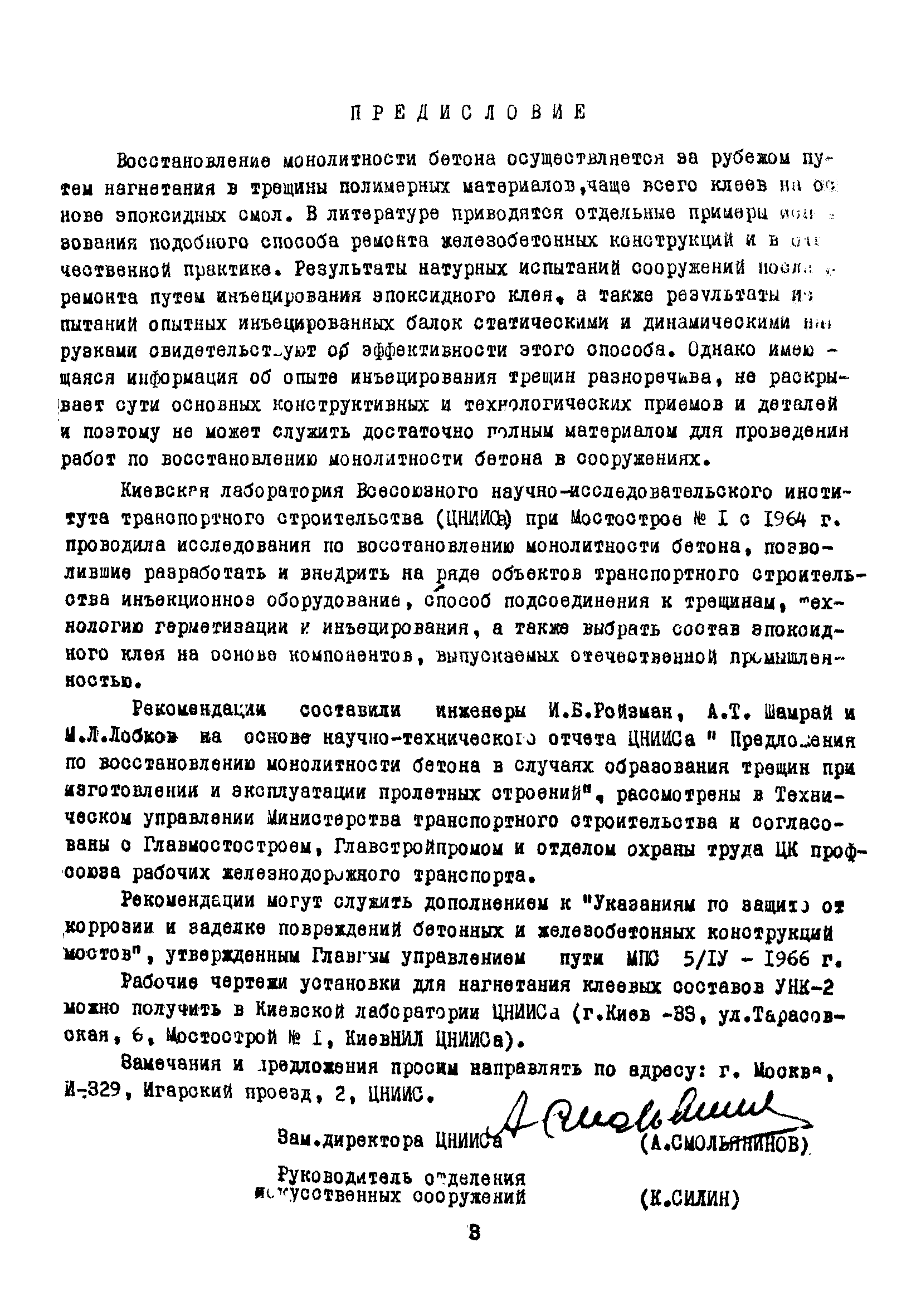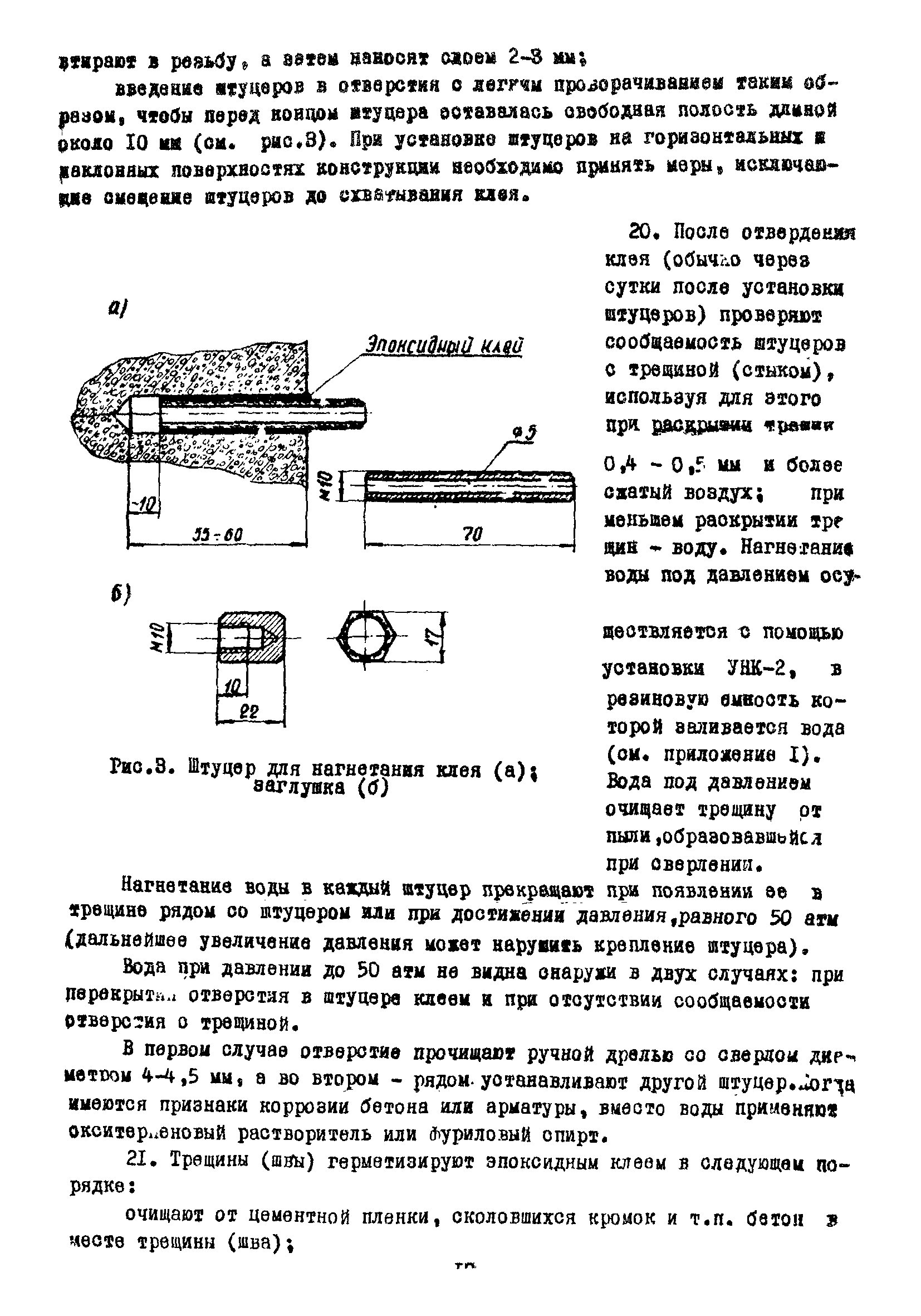 | Оглавление: | Предисловие Введение 1. Общая часть 2. Материалы и оборудование 3. Состав работ и описание операций 4. Ведение технической документации 5. Техника безопасности Приложения 1. Инструкция по эксплуатации установки для нагнетания клееных составов УНК-2 2. Установка для нагнетания клеевых составов УНК-2 (общий вид) 3. Перечень оборудования, инструментов и материалов, необходимых для инъецирования 4. Журнал инъецирования Литература |