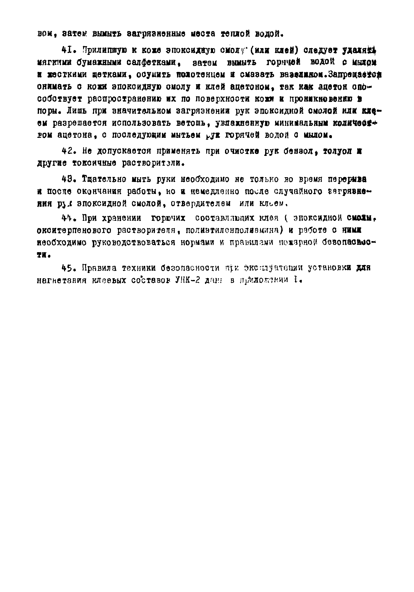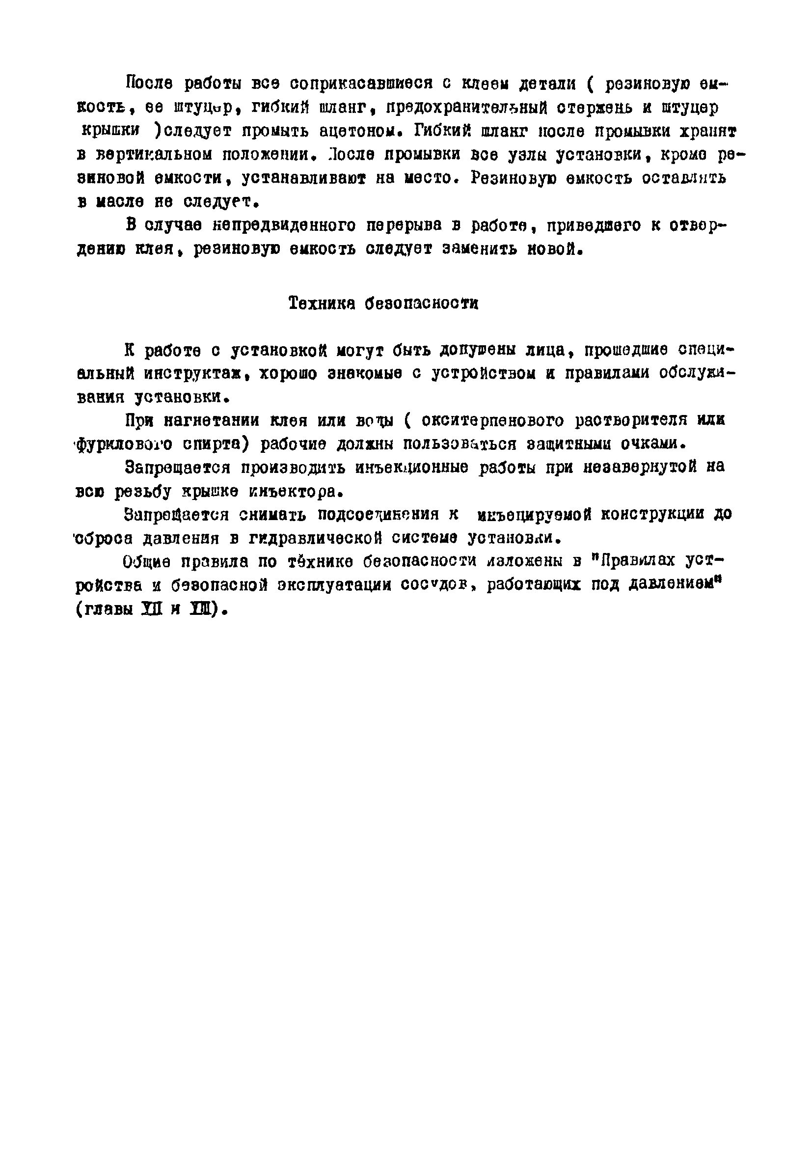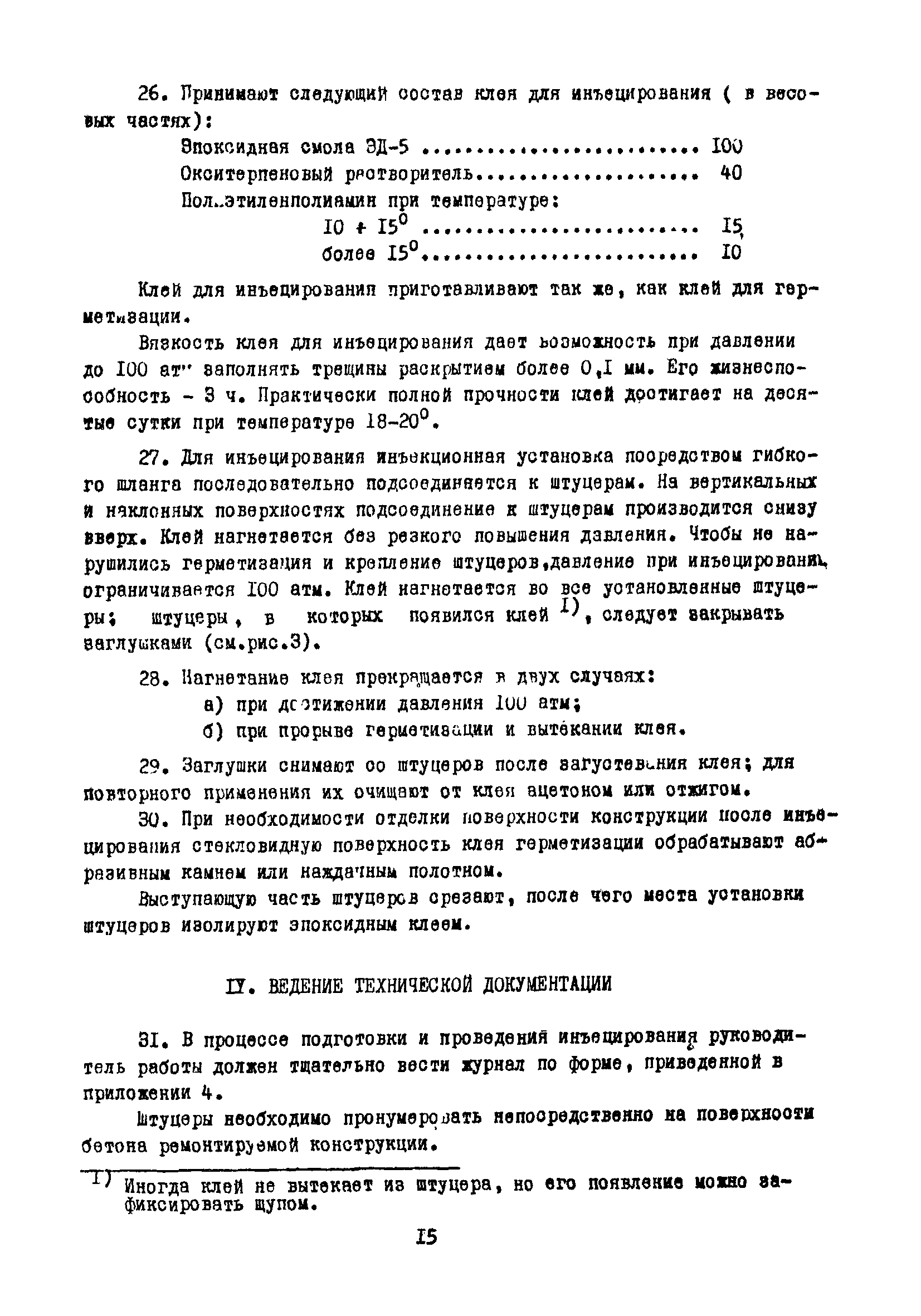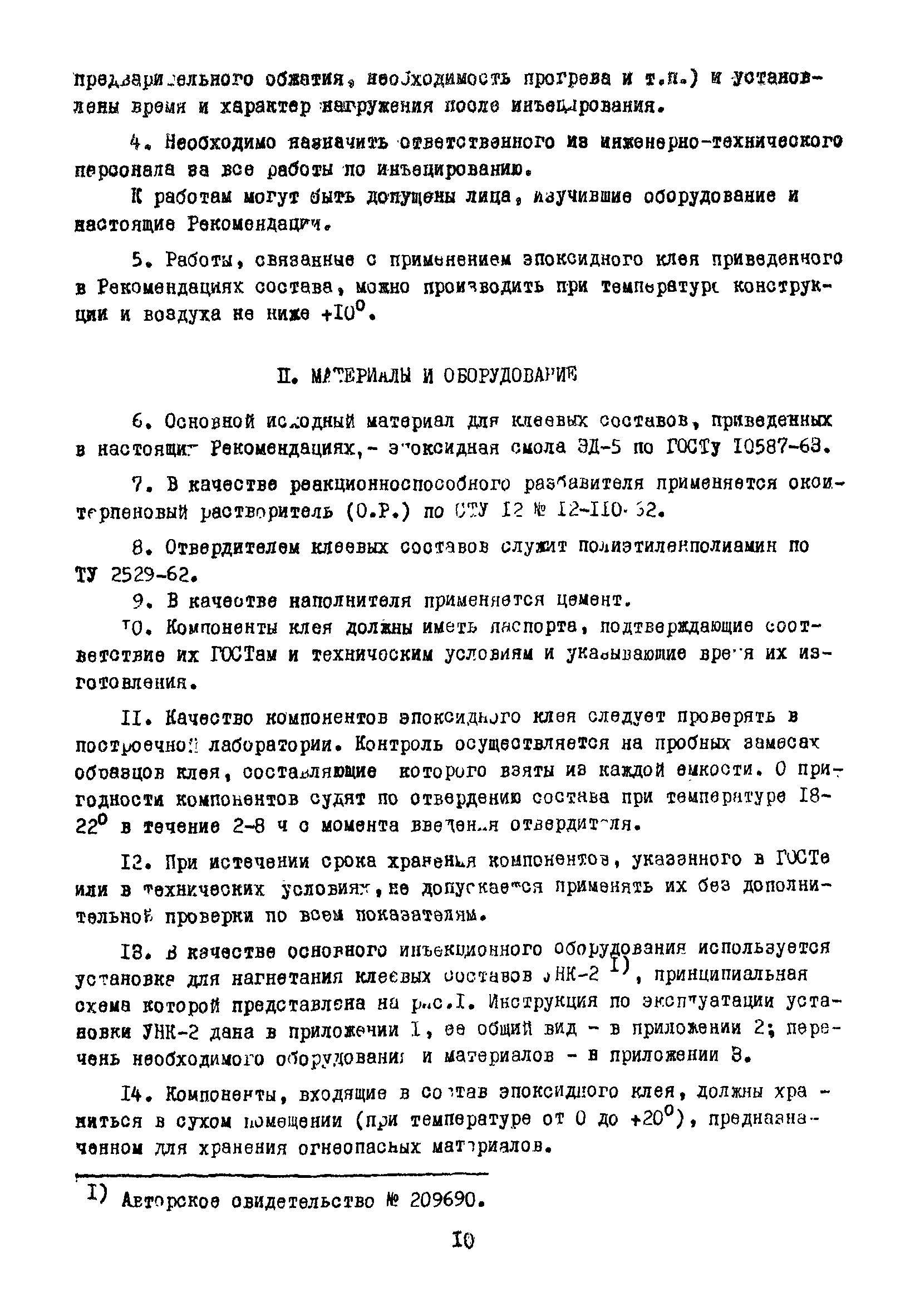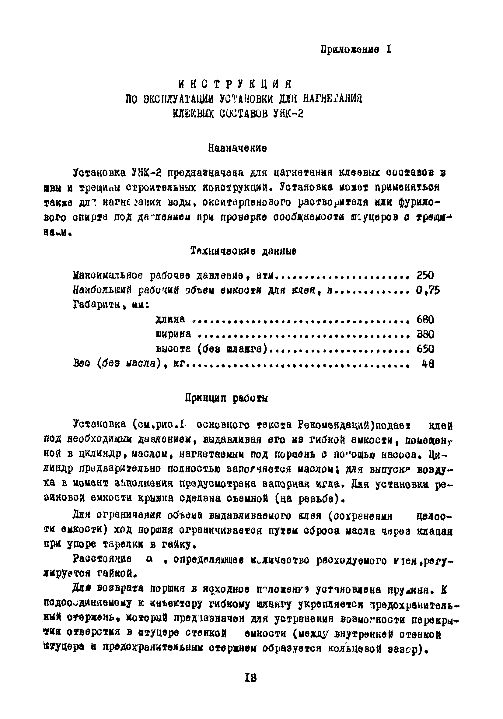 | Оглавление: | Предисловие Введение 1. Общая часть 2. Материалы и оборудование 3. Состав работ и описание операций 4. Ведение технической документации 5. Техника безопасности Приложения 1. Инструкция по эксплуатации установки для нагнетания клееных составов УНК-2 2. Установка для нагнетания клеевых составов УНК-2 (общий вид) 3. Перечень оборудования, инструментов и материалов, необходимых для инъецирования 4. Журнал инъецирования Литература |