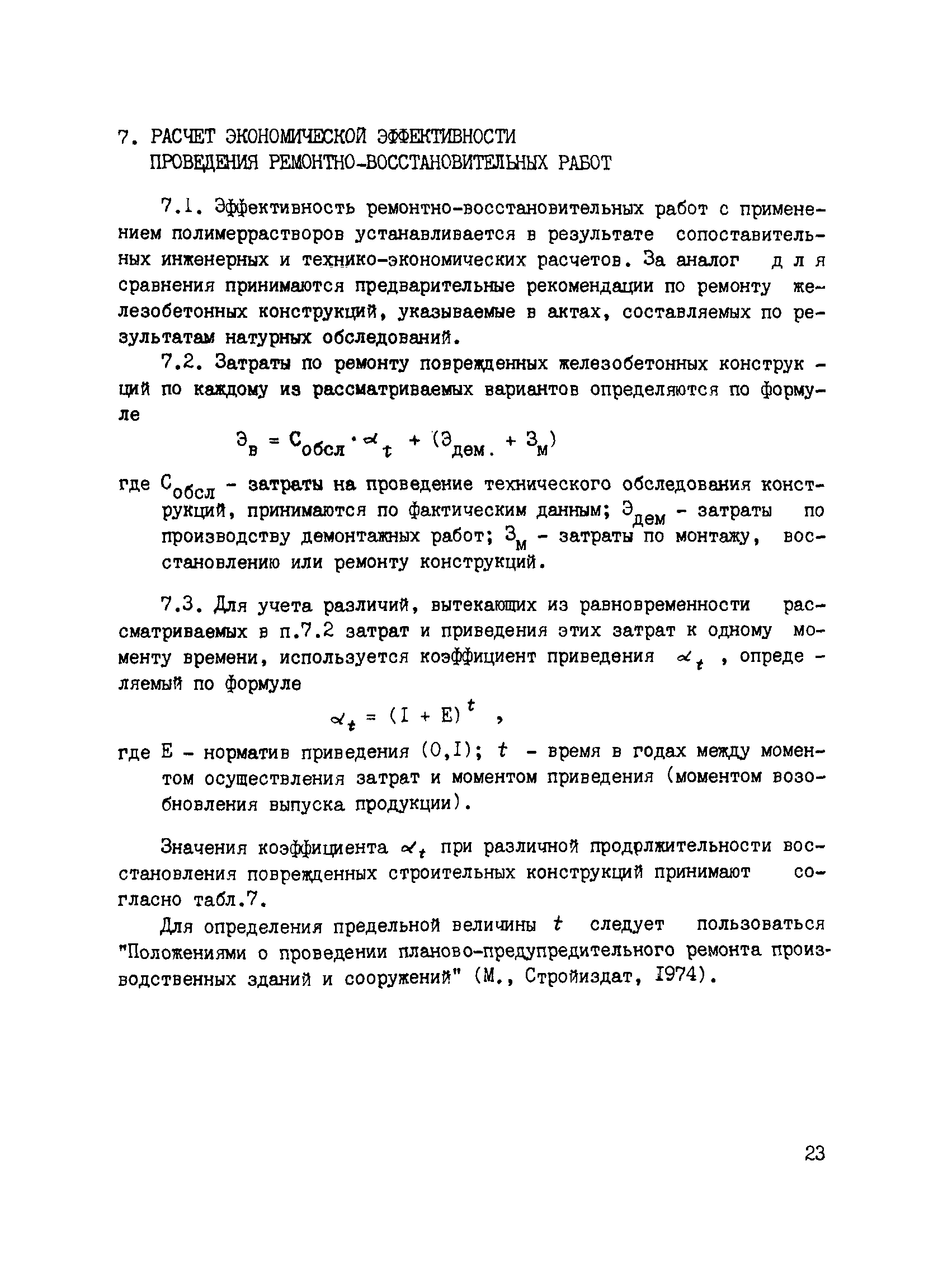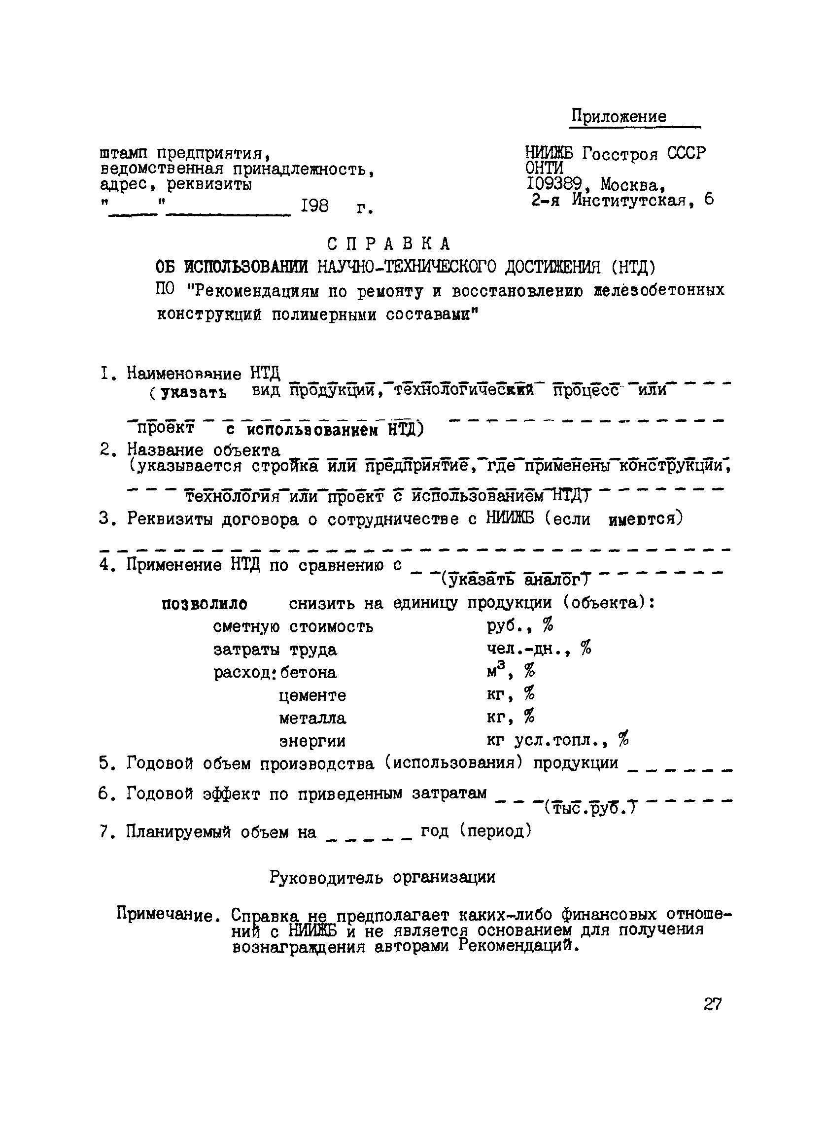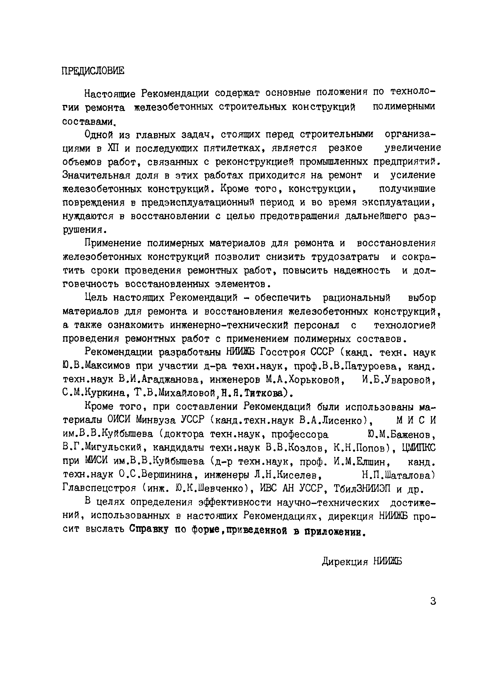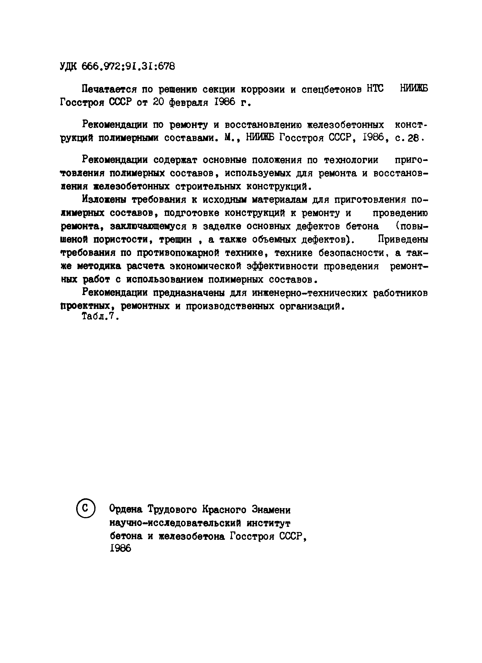 | Оглавление: | Предисловие 1. Общие положения 2. Материалы и технология приготовления полимерных составов 3. Пропитка бетонных конструкций полимерными составами 4. Заделка трещин в железобетонных конструкциях 5. Заделка объемных дефектов 6. Основные правила безопасного ведения технологического процесса 7. Расчет экономической эффективности проведения ремонтно-восстановительных работ Приложение. Справка об использовании научно-технического достижения (НТД) по данным Рекомендациям |