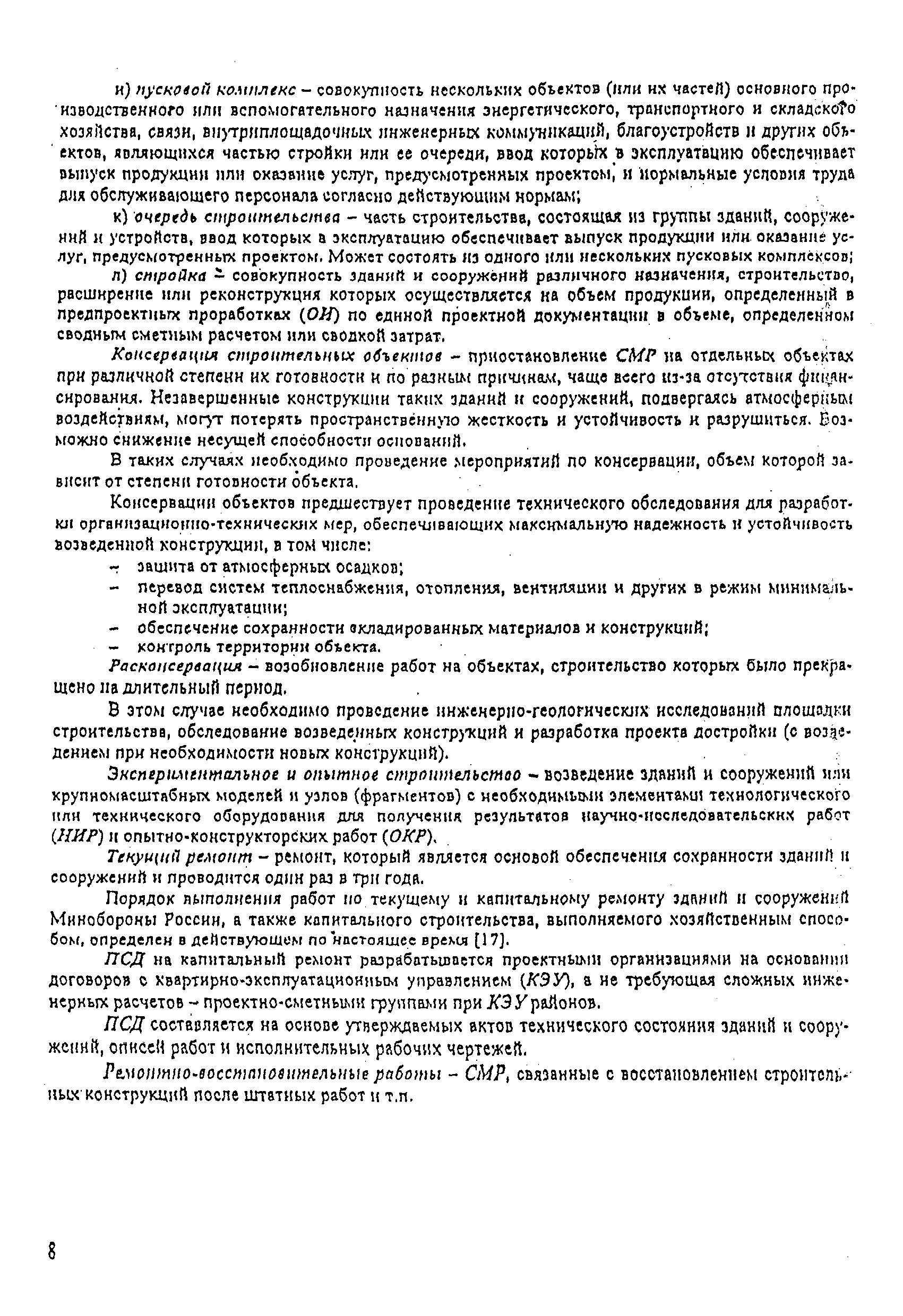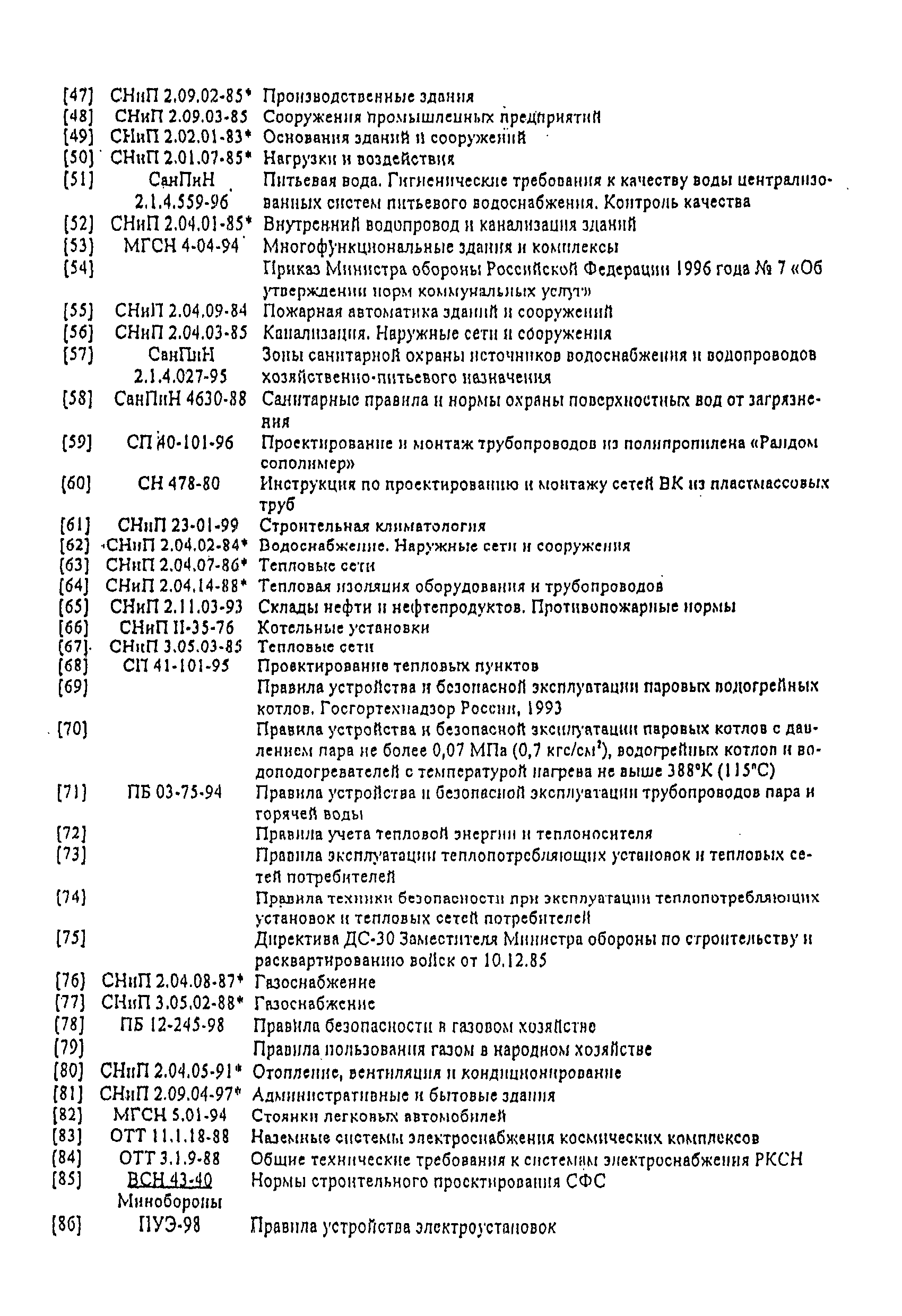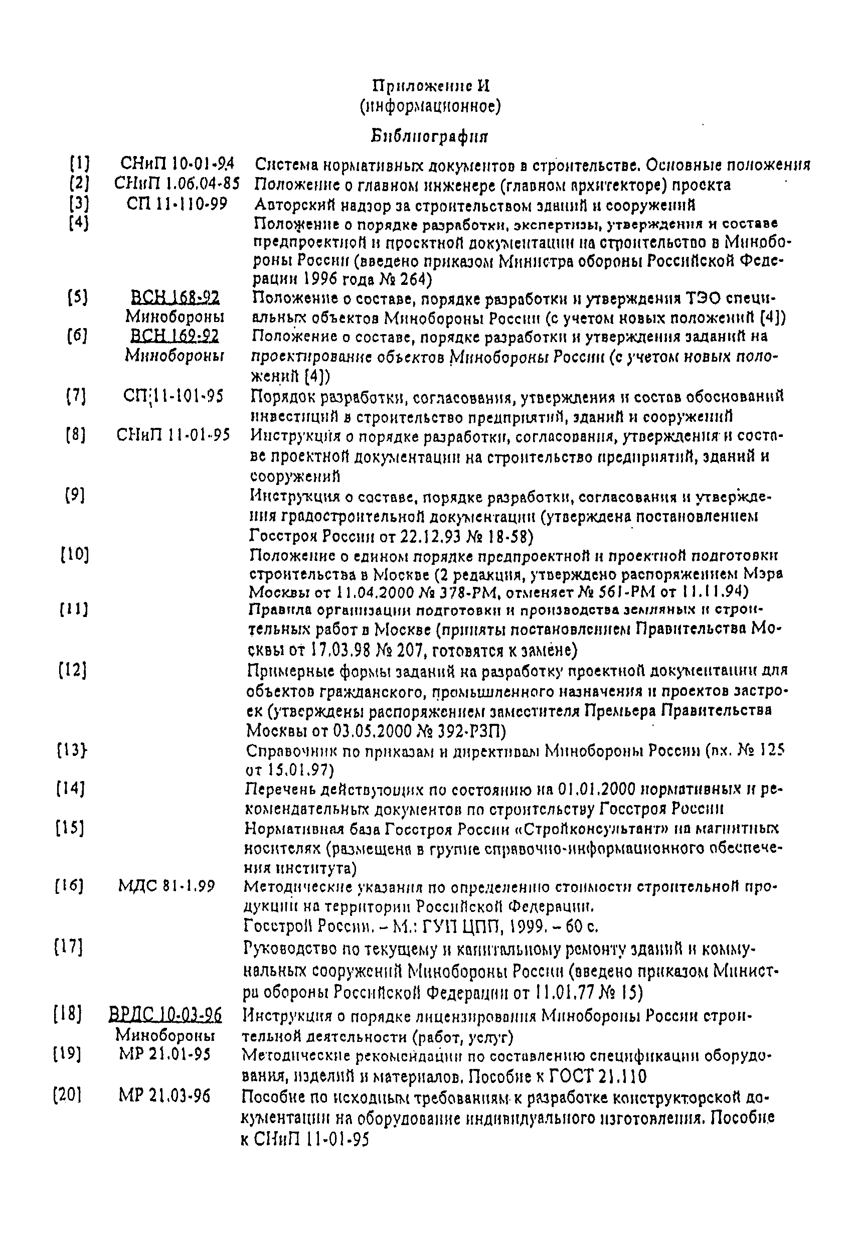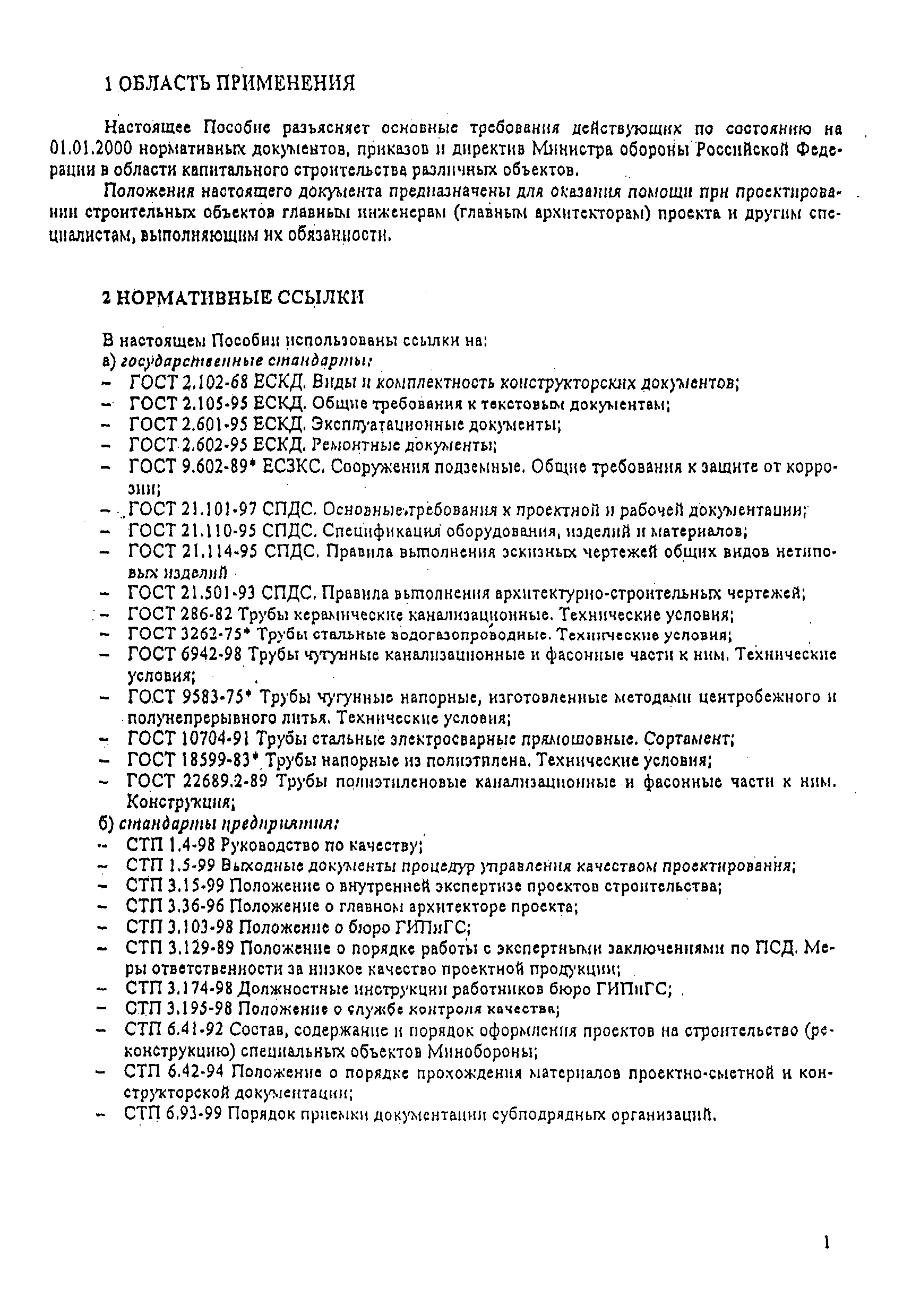 | Оглавление: | 1. Область применения 2. Нормативные ссылки 3. Определения 4. Правила проектирования 4.1 Общие положения 4.2 Положение о главном инженере (главном архитекторе) проекта 4.3 Основные нормативные и руководящие документы 4.4 Основные положения приказа Министра обороны РФ от 08.07.96 № 264 4.5 Состав и содержание обоснований инвестиций 4.6 Виды строительства 4.7 Лицензирование 4.8 Основные требования к проектной и рабочей документации 5. Технология проектирования 5.1 Схема создания объекта строительства 5.2 Последовательность и стадийность проектирования 5.3 Рекогносцировочные работы 5.4 Предпроектная подготовка, сбор исходно-разрешительной документации и исходных данных 5.5 Инженерные изыскания 5.6 Задание на проектирование 5.7 Инженерно-техническое обследование 5.8 Договорная, финансовая, претензионная работа 5.9 Плановая заявка на проектирование и организация процесса проектирования 5.10 Особенности проектирования объектов, возводимых в г. Москве 6. Согласование и экспертиза предпроектной и проектной документации 6.1 Внутренняя экспертиза проектов строительства 6.2 Согласование предпроектной и проектной документации до представления в органы госэкспертизы проектов 6.3 Работа с экспертными органами в процессе рассмотрения предпроектной и проектной документации 6.4 Порядок пересмотра ранее утвержденной документации 7. Авторский надзор 7.1 Организация авторского надзора 7.2 Основные требования АН к качеству выполнения СМР 8. Участие в приемке в эксплуатацию законченных строительством объектов 9. Краткие данные по основным разделам проекта на строительство объекта 9.1 Общая пояснительная записка 9.2 Генеральный план 9.3 Технологические решения 9.4 Архитектурно-строительные решения 9.5 Водоснабжение и канализация 9.6 Теплоснабжение и газоснабжение 9.7 Отопление, вентиляция и кондиционирование 9.8 Электроснабжение и автоматизация 9.9 Требования по противопожарной защите 9,10 Конструкции металлические 9.11 Охрана окружающей природной среды 9.12 Системы связи и сигнализации 9.13 Организация и производство работ 9.14 Состав сметной документации и определение стоимости строительства 9.15 Эффективность инвестиций 9.16 Управление производством, предприятием и организация условий и охраны труда рабочих и служащих 9.17 Инженерно-технические мероприятия гражданской обороны. Мероприятия по предупреждению чрезвычайных ситуаций 9.18 Дополнительные требования 9.19 Охрана и оборона объекта Приложение А. Перечень сокращений слов и их аббревиатур Приложение Б. Акт рекогносцировочных работ Приложение В. Вариант составления задания на проектирование Приложение Г. Акт обследования технического состояния объекта Приложение Е. Марки и шифры разделов проекта и текстовых документов Приложение Ж. Укрупненные показатели стоимости строительства (удельные показатели капитальных вложений) Приложение И. Библиография |
