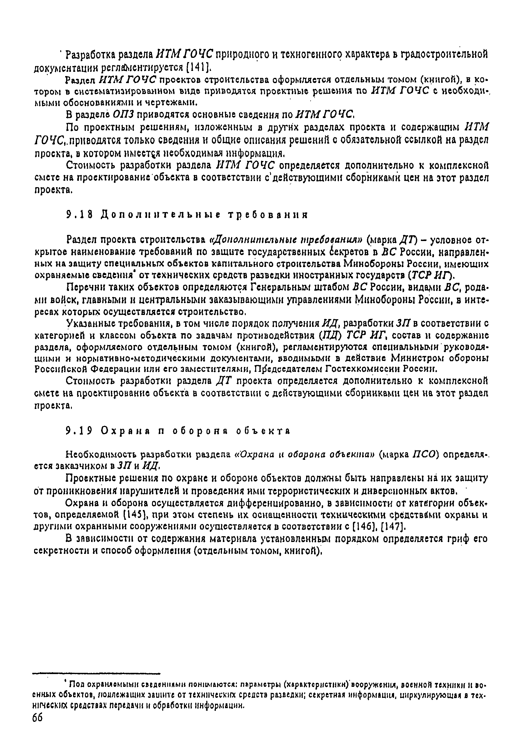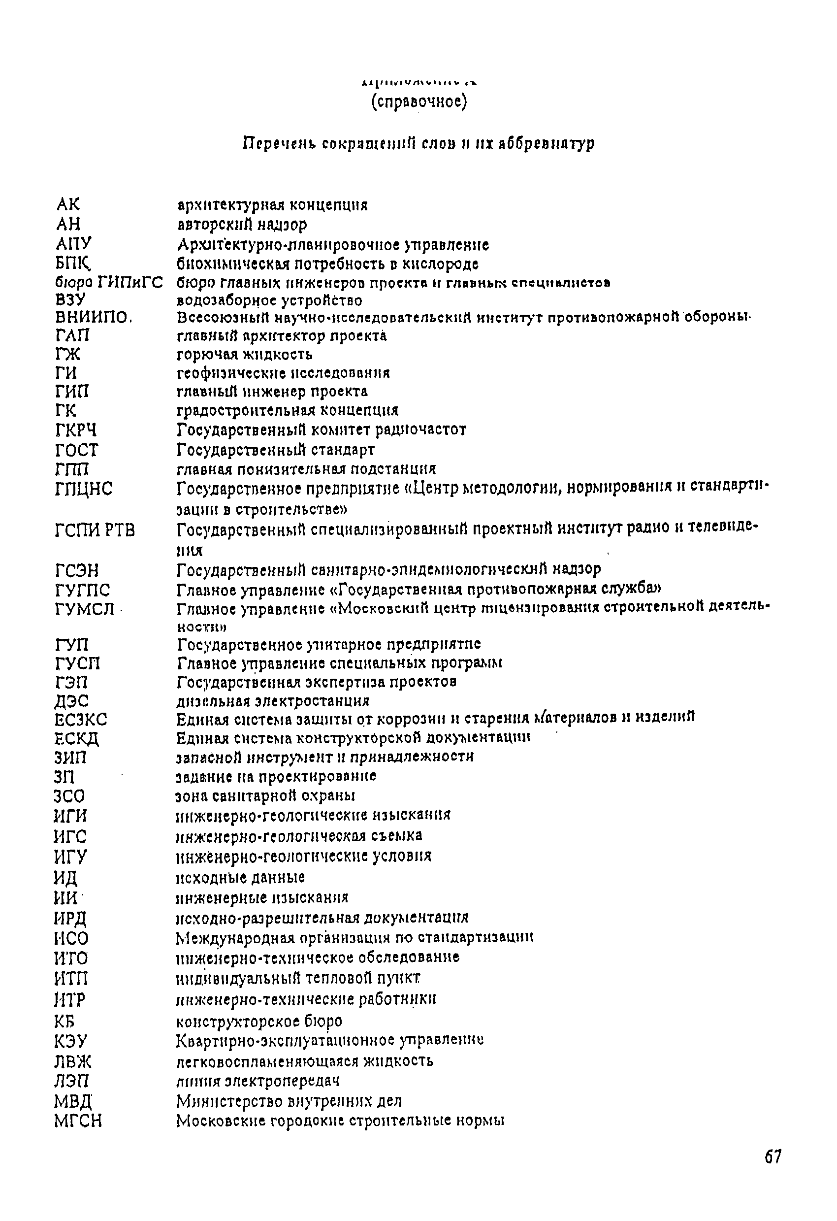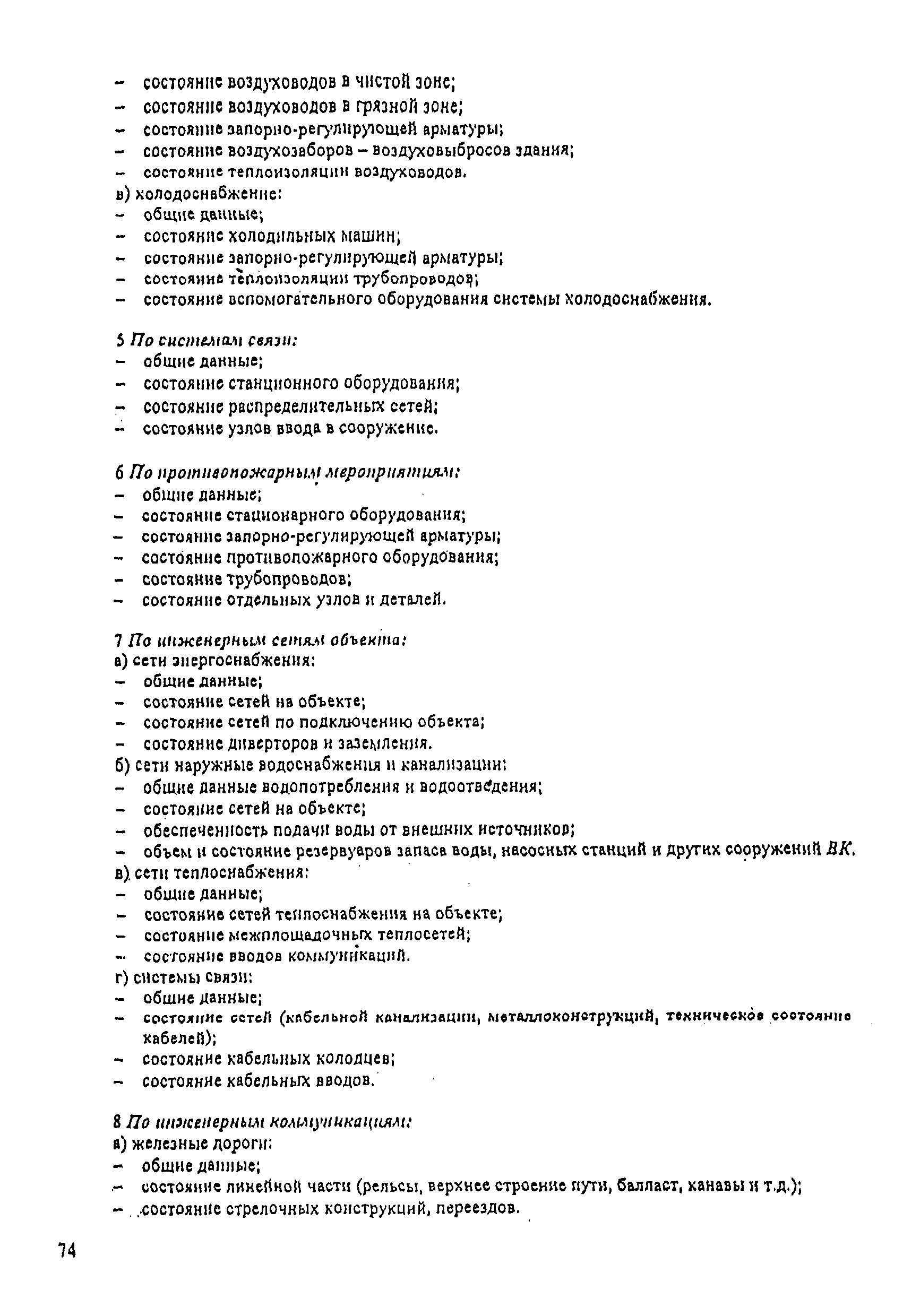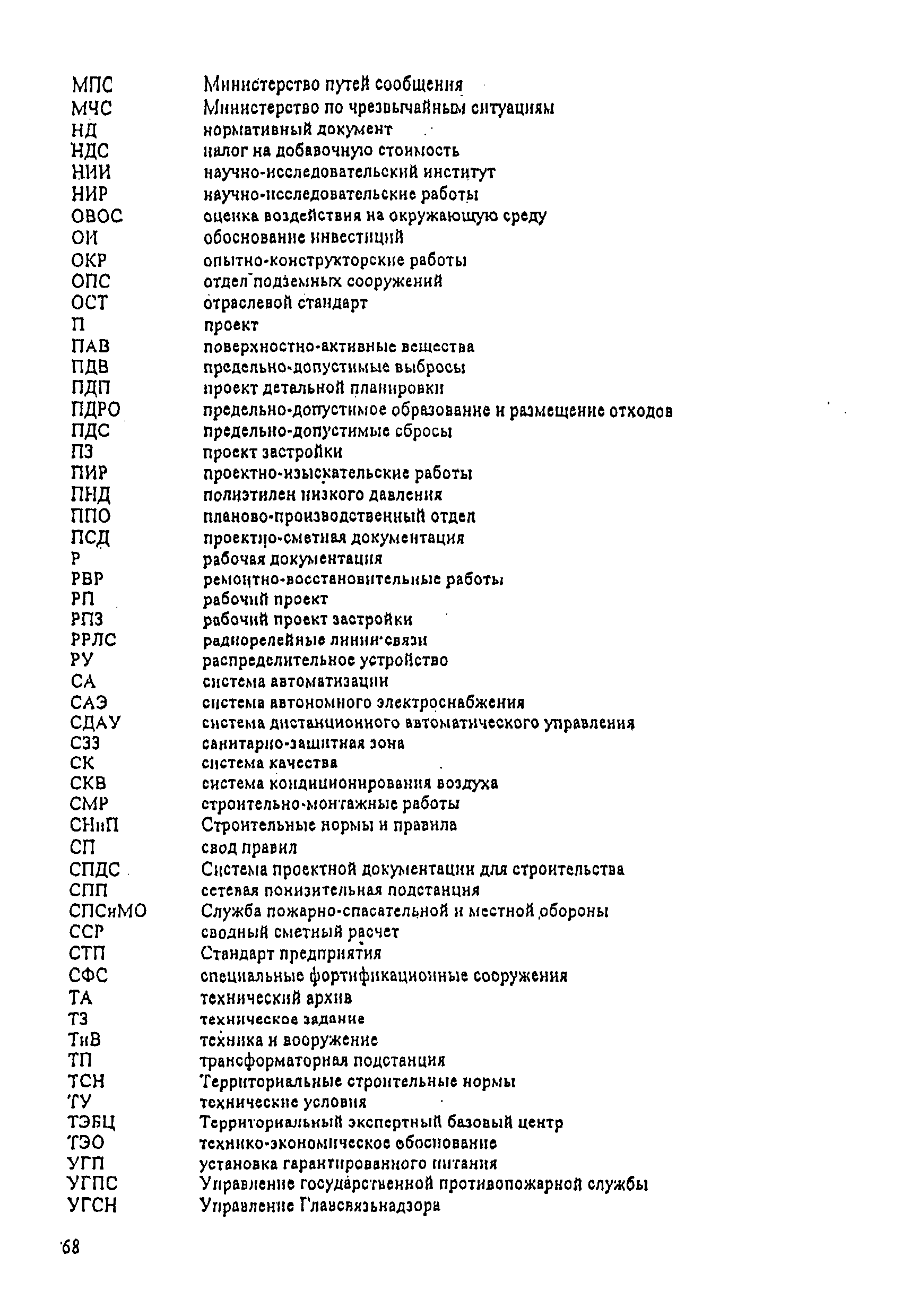 | Оглавление: | 1. Область применения 2. Нормативные ссылки 3. Определения 4. Правила проектирования 4.1 Общие положения 4.2 Положение о главном инженере (главном архитекторе) проекта 4.3 Основные нормативные и руководящие документы 4.4 Основные положения приказа Министра обороны РФ от 08.07.96 № 264 4.5 Состав и содержание обоснований инвестиций 4.6 Виды строительства 4.7 Лицензирование 4.8 Основные требования к проектной и рабочей документации 5. Технология проектирования 5.1 Схема создания объекта строительства 5.2 Последовательность и стадийность проектирования 5.3 Рекогносцировочные работы 5.4 Предпроектная подготовка, сбор исходно-разрешительной документации и исходных данных 5.5 Инженерные изыскания 5.6 Задание на проектирование 5.7 Инженерно-техническое обследование 5.8 Договорная, финансовая, претензионная работа 5.9 Плановая заявка на проектирование и организация процесса проектирования 5.10 Особенности проектирования объектов, возводимых в г. Москве 6. Согласование и экспертиза предпроектной и проектной документации 6.1 Внутренняя экспертиза проектов строительства 6.2 Согласование предпроектной и проектной документации до представления в органы госэкспертизы проектов 6.3 Работа с экспертными органами в процессе рассмотрения предпроектной и проектной документации 6.4 Порядок пересмотра ранее утвержденной документации 7. Авторский надзор 7.1 Организация авторского надзора 7.2 Основные требования АН к качеству выполнения СМР 8. Участие в приемке в эксплуатацию законченных строительством объектов 9. Краткие данные по основным разделам проекта на строительство объекта 9.1 Общая пояснительная записка 9.2 Генеральный план 9.3 Технологические решения 9.4 Архитектурно-строительные решения 9.5 Водоснабжение и канализация 9.6 Теплоснабжение и газоснабжение 9.7 Отопление, вентиляция и кондиционирование 9.8 Электроснабжение и автоматизация 9.9 Требования по противопожарной защите 9,10 Конструкции металлические 9.11 Охрана окружающей природной среды 9.12 Системы связи и сигнализации 9.13 Организация и производство работ 9.14 Состав сметной документации и определение стоимости строительства 9.15 Эффективность инвестиций 9.16 Управление производством, предприятием и организация условий и охраны труда рабочих и служащих 9.17 Инженерно-технические мероприятия гражданской обороны. Мероприятия по предупреждению чрезвычайных ситуаций 9.18 Дополнительные требования 9.19 Охрана и оборона объекта Приложение А. Перечень сокращений слов и их аббревиатур Приложение Б. Акт рекогносцировочных работ Приложение В. Вариант составления задания на проектирование Приложение Г. Акт обследования технического состояния объекта Приложение Е. Марки и шифры разделов проекта и текстовых документов Приложение Ж. Укрупненные показатели стоимости строительства (удельные показатели капитальных вложений) Приложение И. Библиография |