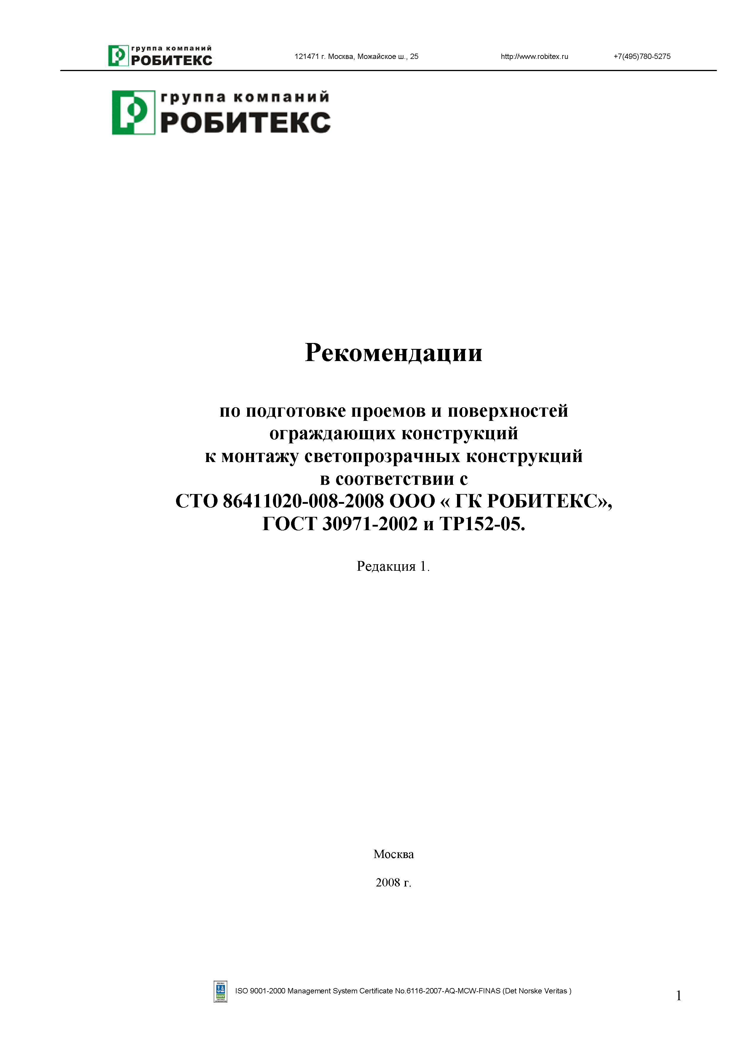 Скачать Рекомендации по подготовке проемов и поверхностей ограждающих конструкций к монтажу светопрозрачных конструкций в соответствии с СТО 86411020-008-2008 ООО ГК РОБИТЕКС, ГОСТ 30971-2002 и ТР152-05Дата актуализации: 01.01.2021