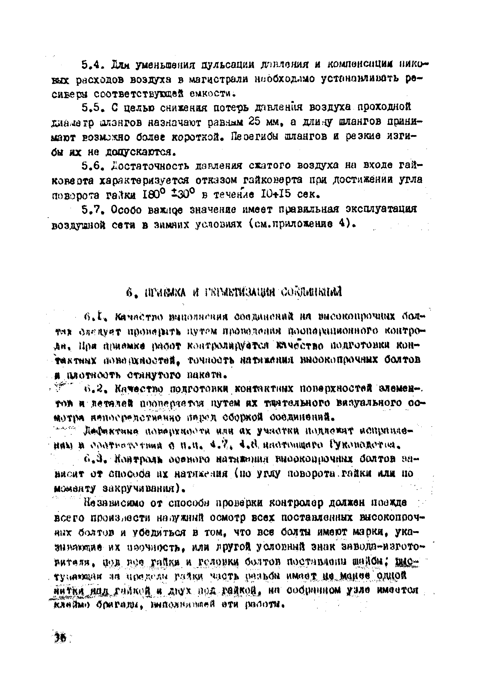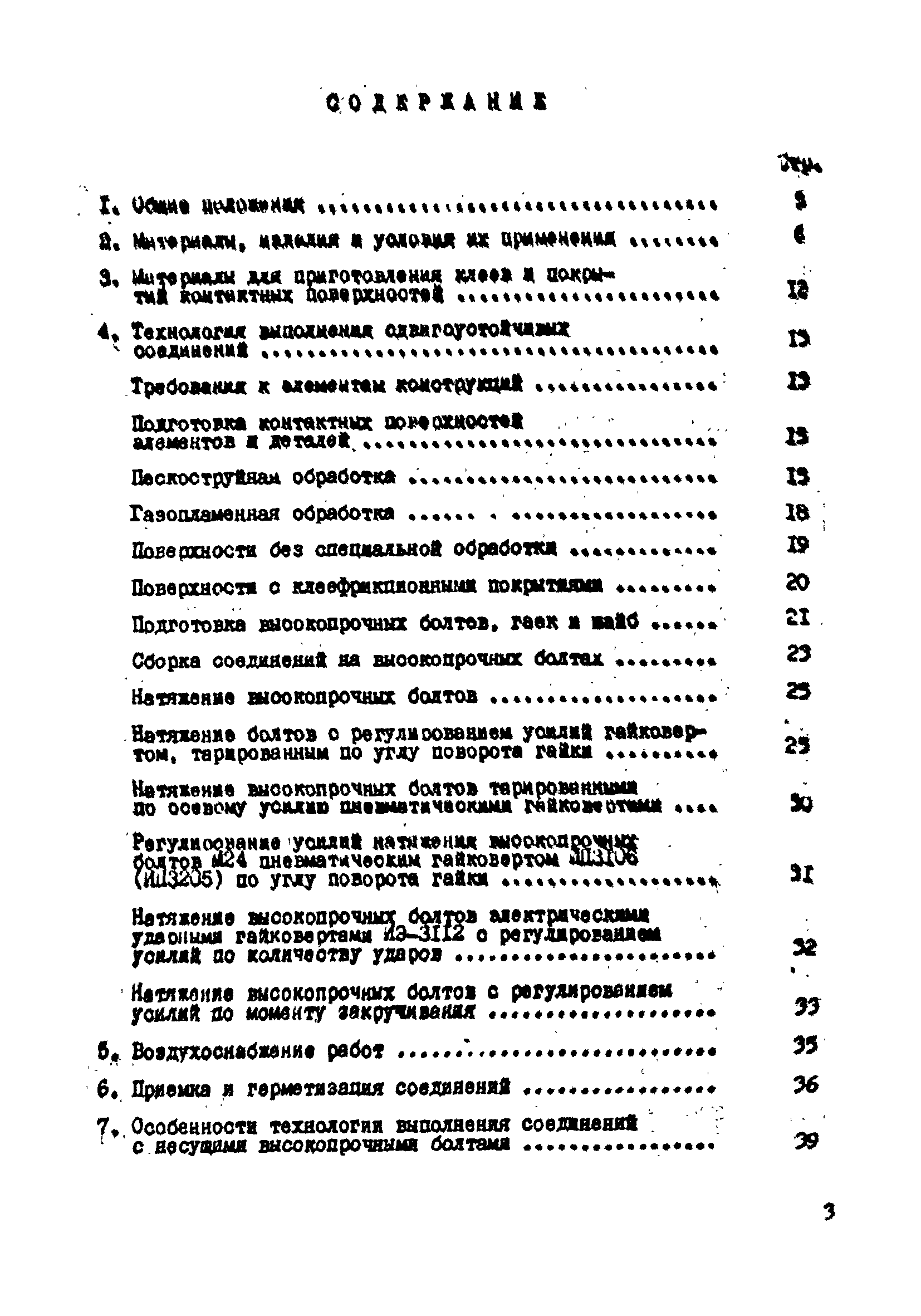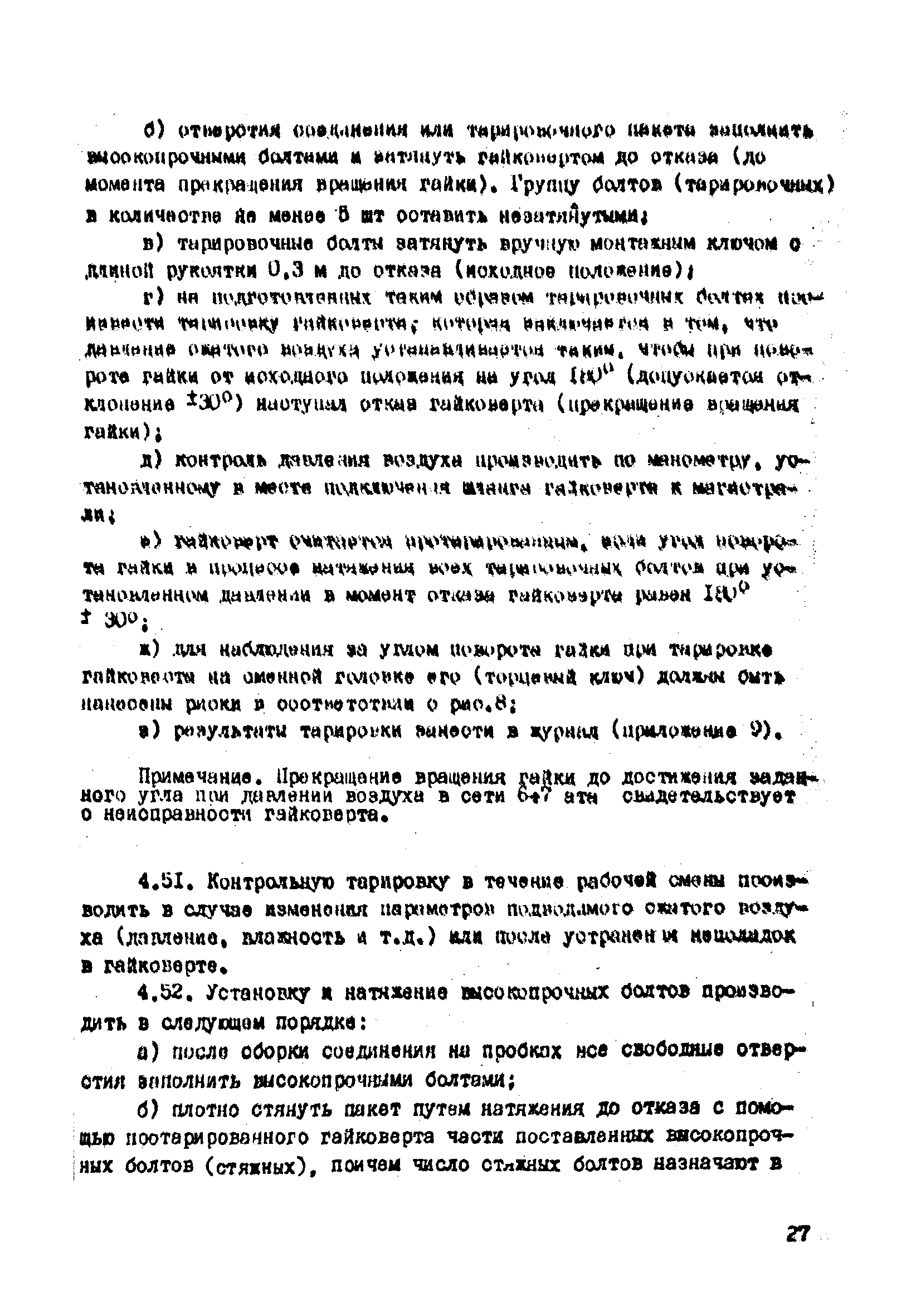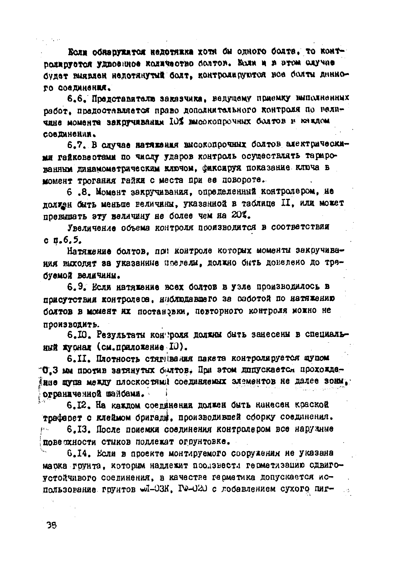 | Оглавление: | 1. Общие положения 2. Материалы, изделия и условия их применения 3. Материалы для приготовления клеев и покрытий контактных поверхностей 4. Технология выполнения сдвигоустойчивых соединений Требования к элементам конструкций Подготовка контактных поверхностей элементов и деталей Пескоструйная обработка Газопламенная обработка Поверхности без специальной обработки Поверхности с клеефрикционными покрытиями Подготовка высокопрочных болтов, гаек и шайб Сборка соединений на высокопрочных болтах Натяжение высокопрочных болтов Натяжение болтов с регулированием усилий гайковертов, тарированием по углу поворота гайки Регулирование усилий натяжения высокопрочных болтов М24 пневматическим гайковертом ИП3106 (ИП3205) по углу поворота гайки Натяжение высокопрочных болтов электрическими ударными гайковертами ИЭ-3112 с регулированием усилий по количеству ударов Натяжение высокопрочных болтов с регулированием усилий по моменту закручивания 5. Воздухоснабжение работ 6. Приемка и герметизация соединений 7. Особенности технологии выполнения соединений с несущими высокопрочными болтами 8. Особенности технологии выполнения болтосварных соединений 9. Особенности технологии выполнения болтоклепанных соединений 10. Особенности технологии выполнения болтоклеевых соединений 11. Типовой технологический процесс сборки соединений на высокопрочных болтах 12. Техника безопасности и охрана труда Приложения |