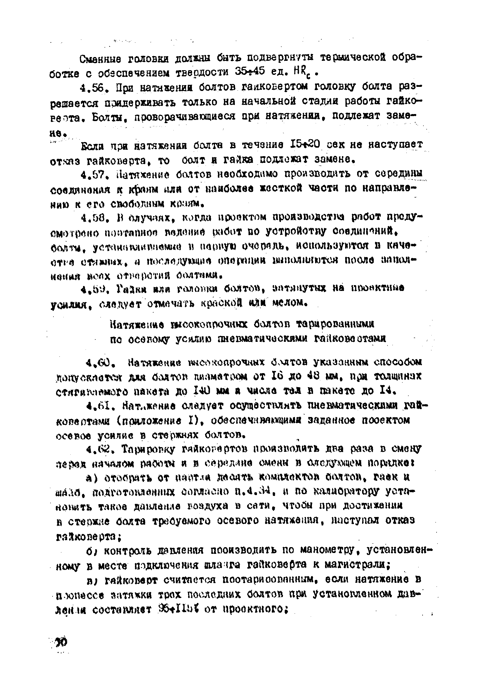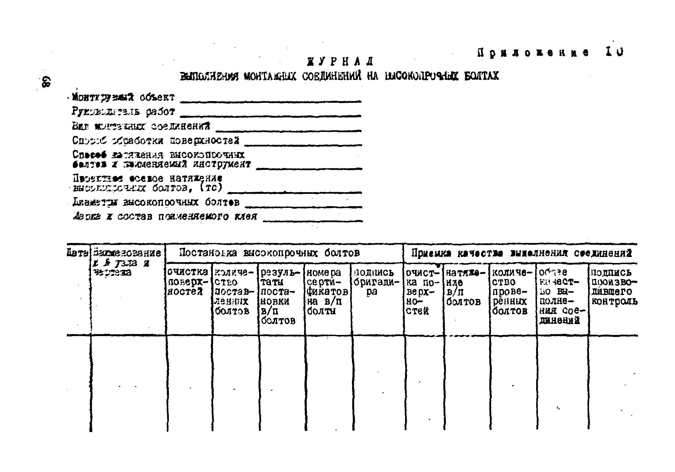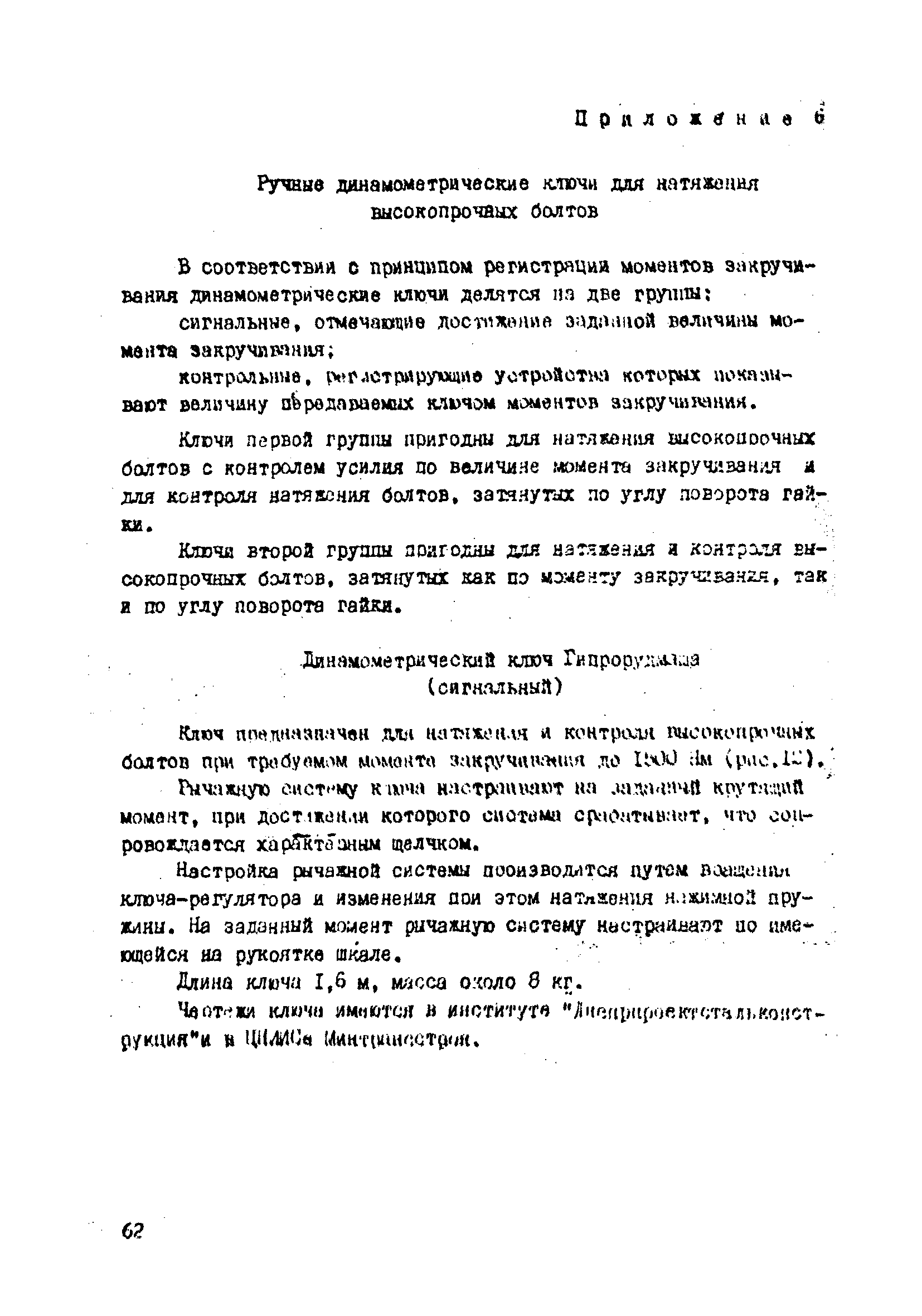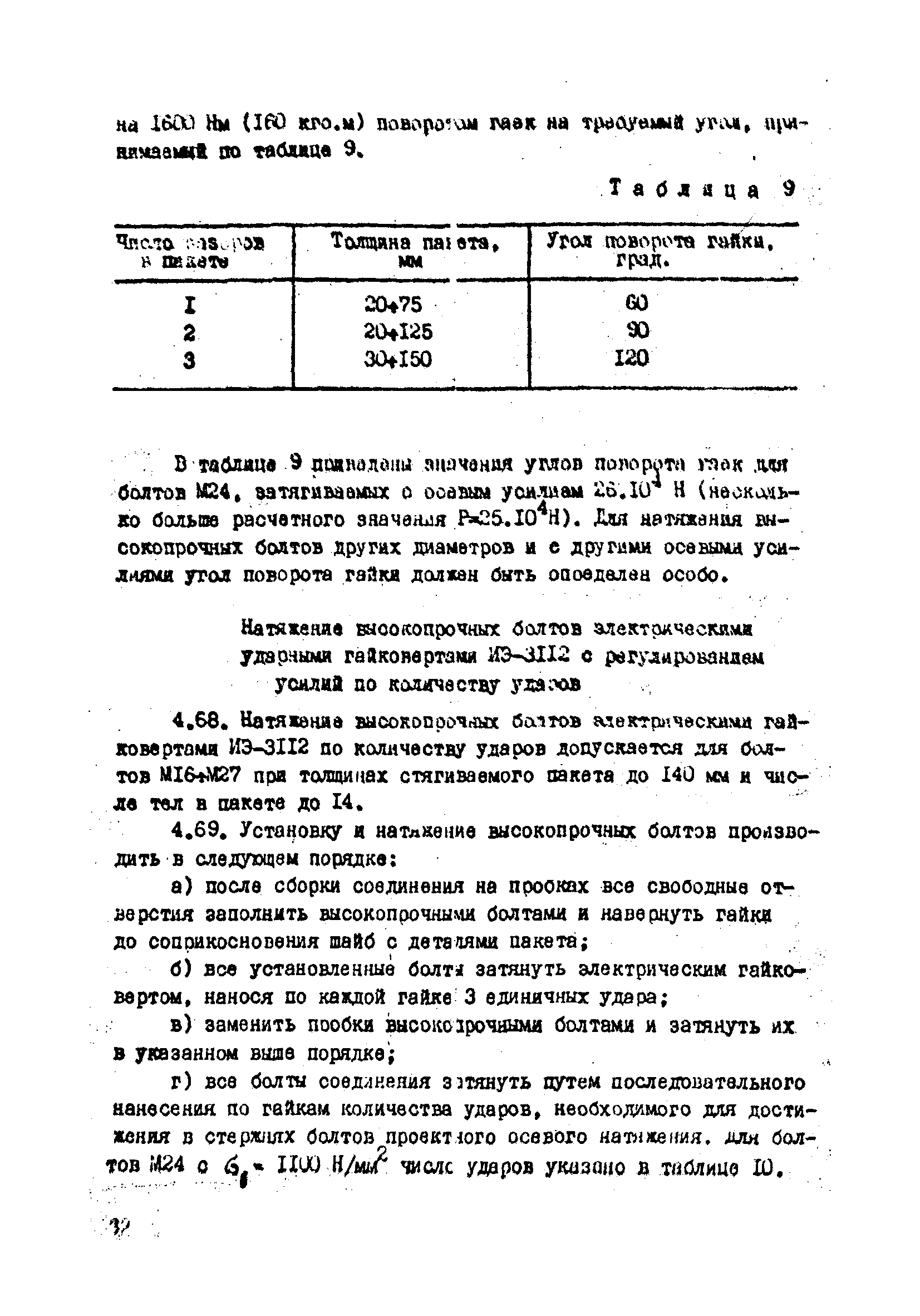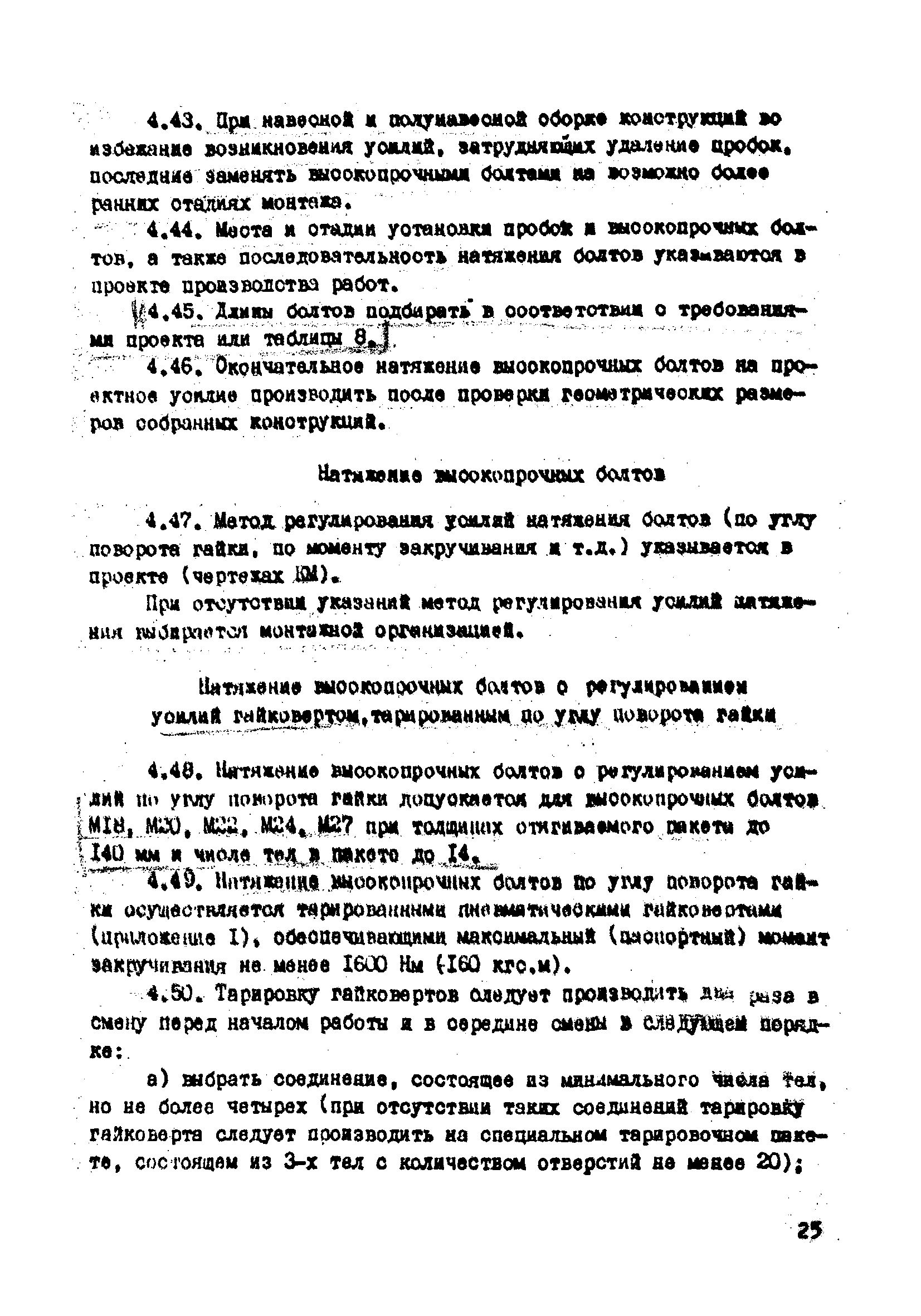 | Оглавление: | 1. Общие положения 2. Материалы, изделия и условия их применения 3. Материалы для приготовления клеев и покрытий контактных поверхностей 4. Технология выполнения сдвигоустойчивых соединений Требования к элементам конструкций Подготовка контактных поверхностей элементов и деталей Пескоструйная обработка Газопламенная обработка Поверхности без специальной обработки Поверхности с клеефрикционными покрытиями Подготовка высокопрочных болтов, гаек и шайб Сборка соединений на высокопрочных болтах Натяжение высокопрочных болтов Натяжение болтов с регулированием усилий гайковертов, тарированием по углу поворота гайки Регулирование усилий натяжения высокопрочных болтов М24 пневматическим гайковертом ИП3106 (ИП3205) по углу поворота гайки Натяжение высокопрочных болтов электрическими ударными гайковертами ИЭ-3112 с регулированием усилий по количеству ударов Натяжение высокопрочных болтов с регулированием усилий по моменту закручивания 5. Воздухоснабжение работ 6. Приемка и герметизация соединений 7. Особенности технологии выполнения соединений с несущими высокопрочными болтами 8. Особенности технологии выполнения болтосварных соединений 9. Особенности технологии выполнения болтоклепанных соединений 10. Особенности технологии выполнения болтоклеевых соединений 11. Типовой технологический процесс сборки соединений на высокопрочных болтах 12. Техника безопасности и охрана труда Приложения |
