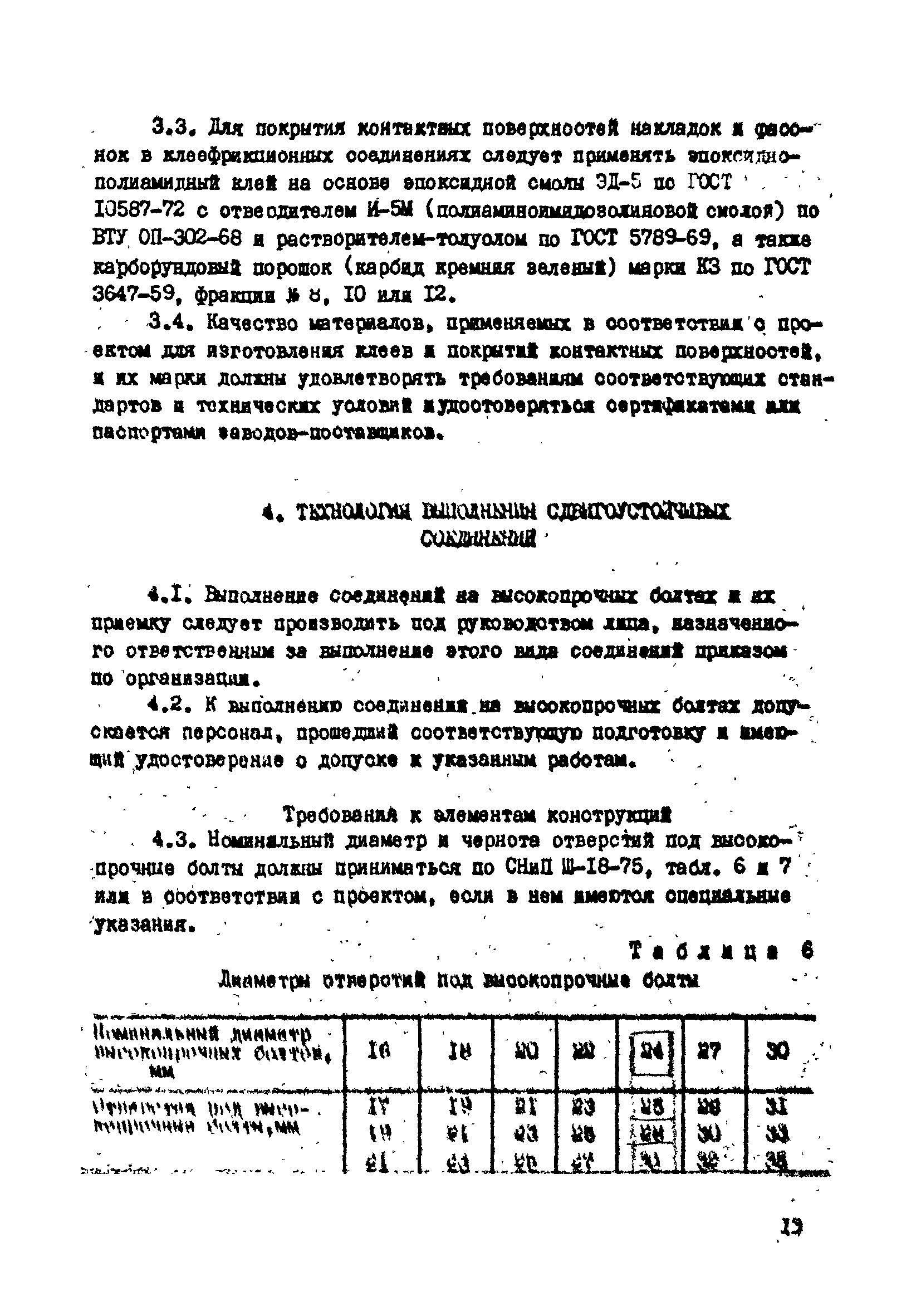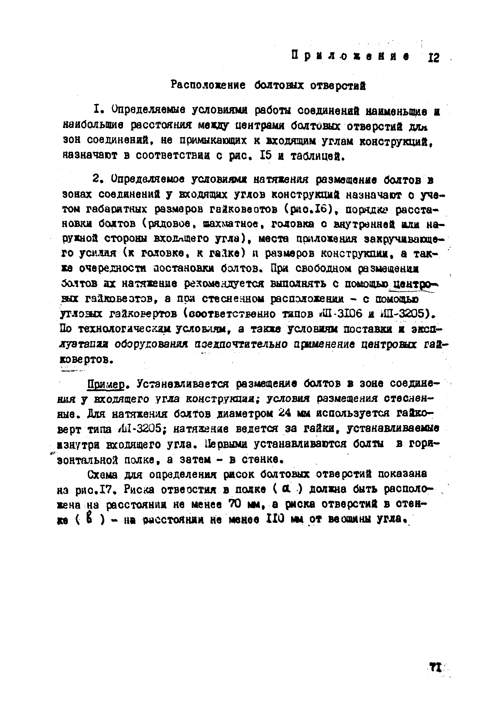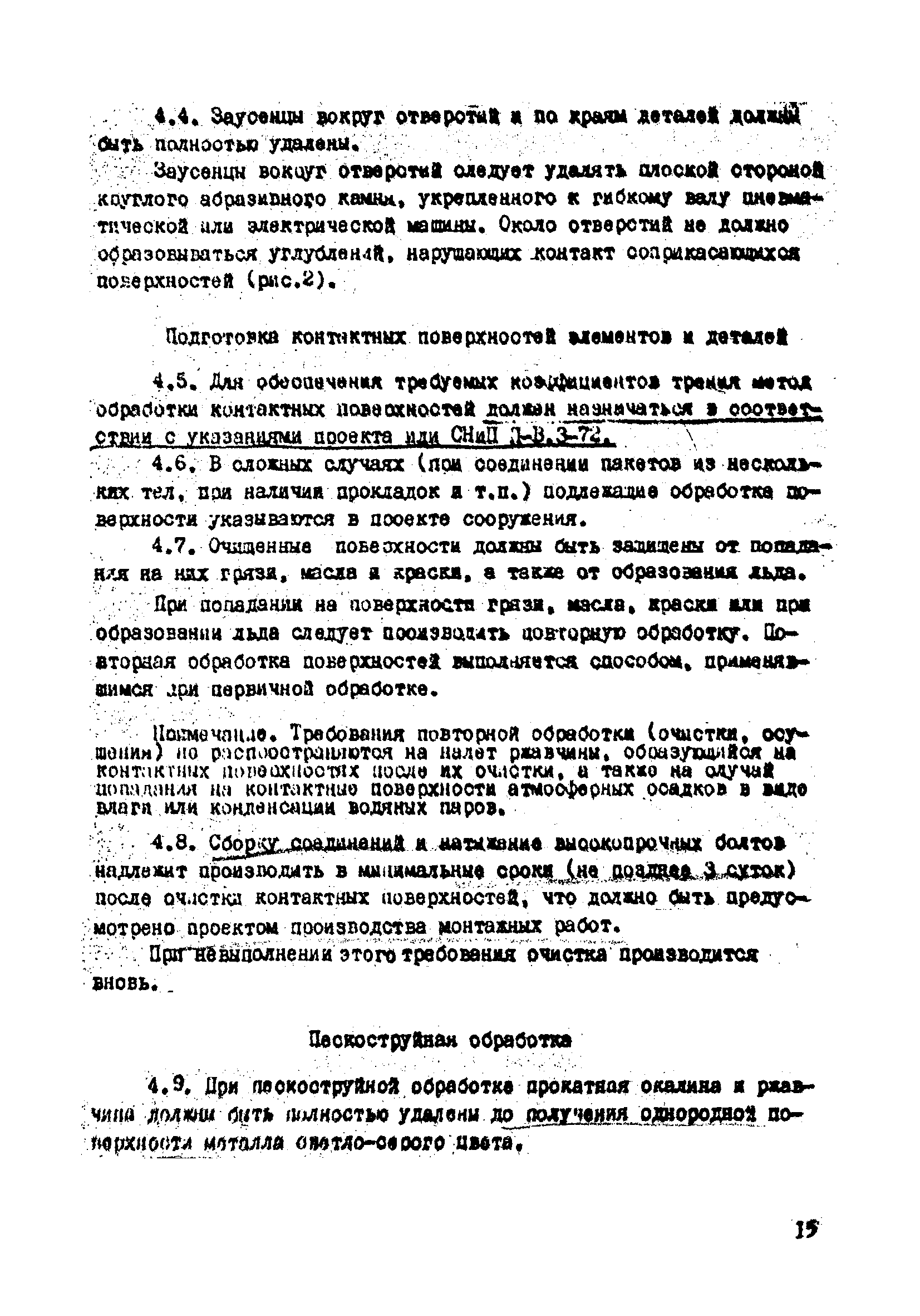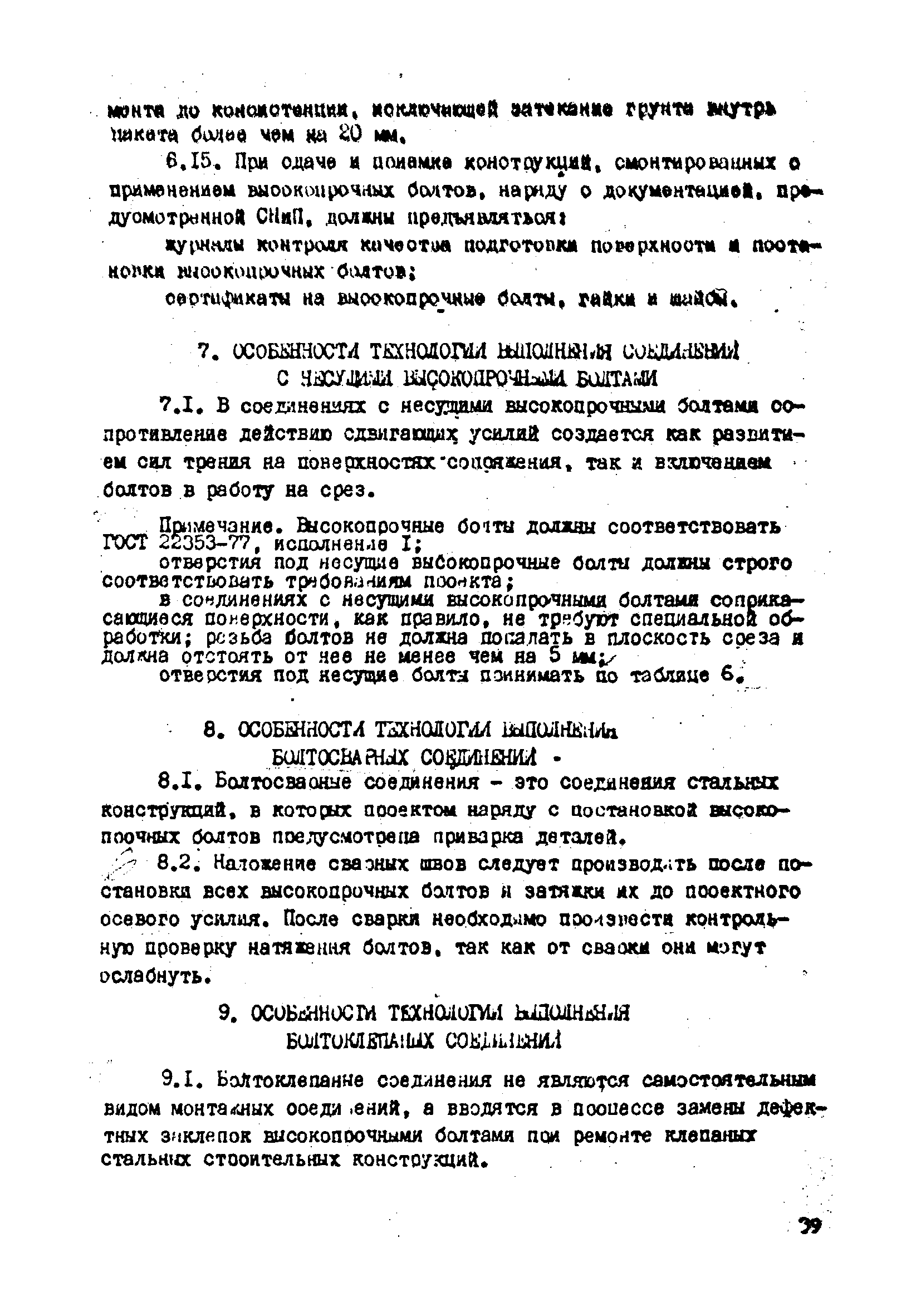 | Оглавление: | 1. Общие положения 2. Материалы, изделия и условия их применения 3. Материалы для приготовления клеев и покрытий контактных поверхностей 4. Технология выполнения сдвигоустойчивых соединений Требования к элементам конструкций Подготовка контактных поверхностей элементов и деталей Пескоструйная обработка Газопламенная обработка Поверхности без специальной обработки Поверхности с клеефрикционными покрытиями Подготовка высокопрочных болтов, гаек и шайб Сборка соединений на высокопрочных болтах Натяжение высокопрочных болтов Натяжение болтов с регулированием усилий гайковертов, тарированием по углу поворота гайки Регулирование усилий натяжения высокопрочных болтов М24 пневматическим гайковертом ИП3106 (ИП3205) по углу поворота гайки Натяжение высокопрочных болтов электрическими ударными гайковертами ИЭ-3112 с регулированием усилий по количеству ударов Натяжение высокопрочных болтов с регулированием усилий по моменту закручивания 5. Воздухоснабжение работ 6. Приемка и герметизация соединений 7. Особенности технологии выполнения соединений с несущими высокопрочными болтами 8. Особенности технологии выполнения болтосварных соединений 9. Особенности технологии выполнения болтоклепанных соединений 10. Особенности технологии выполнения болтоклеевых соединений 11. Типовой технологический процесс сборки соединений на высокопрочных болтах 12. Техника безопасности и охрана труда Приложения |