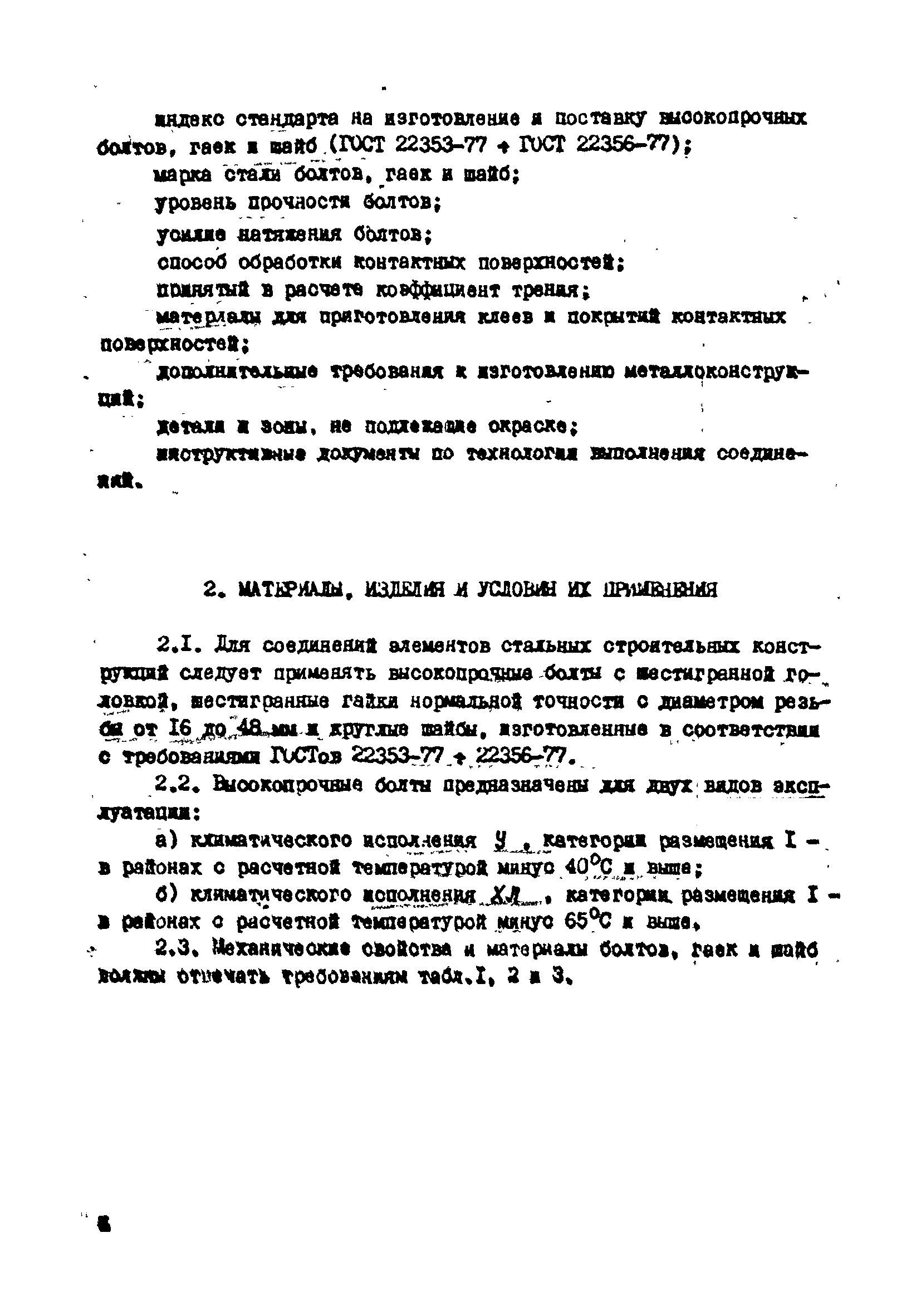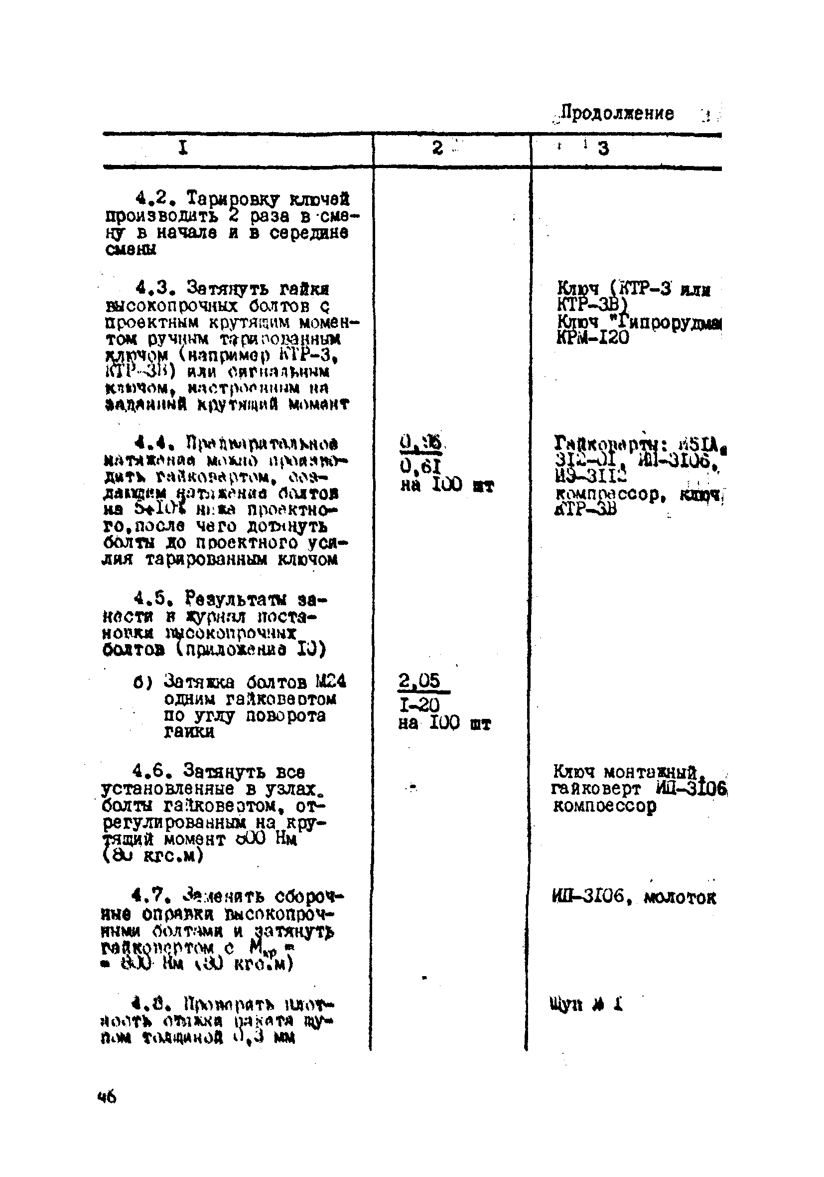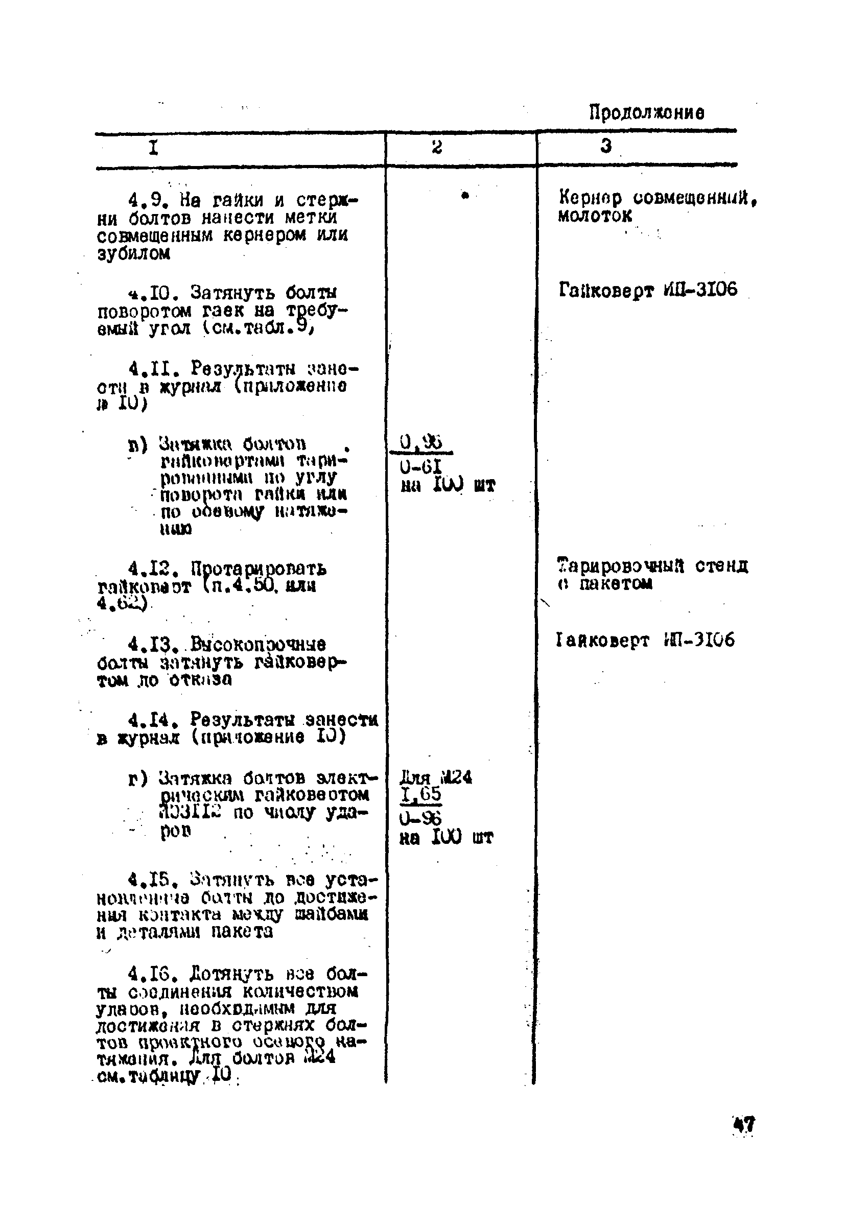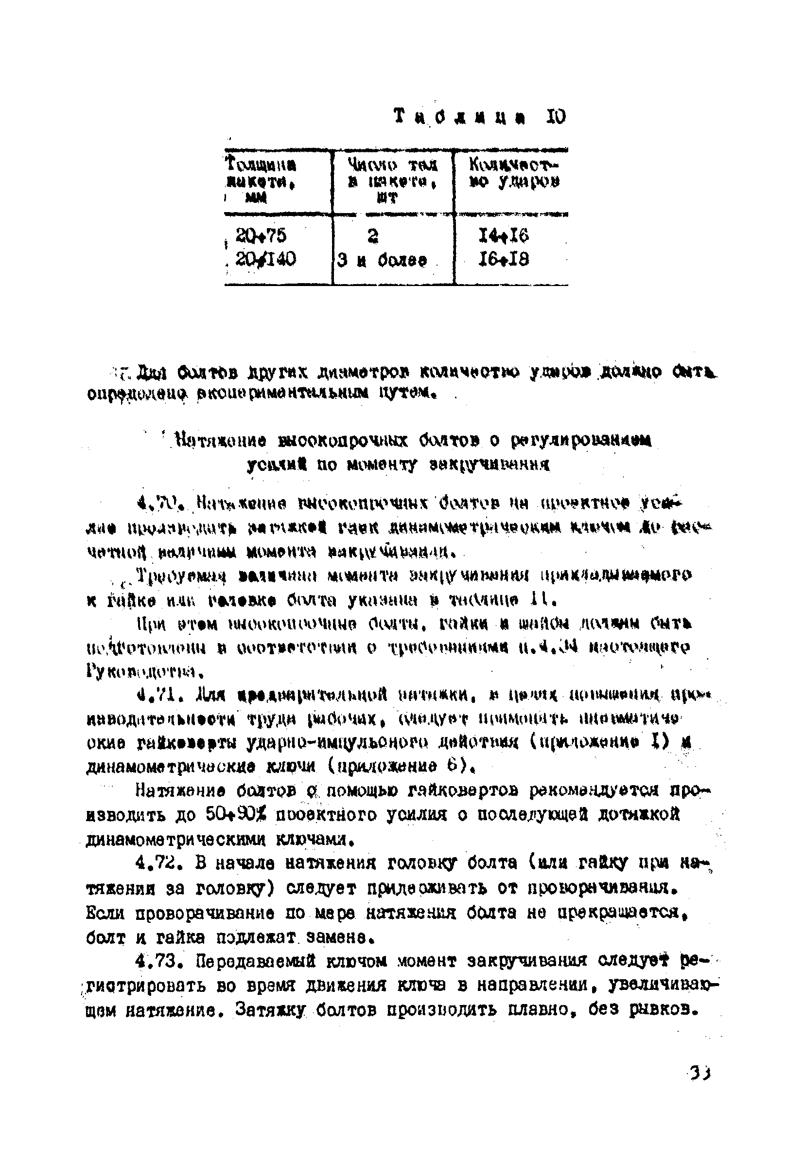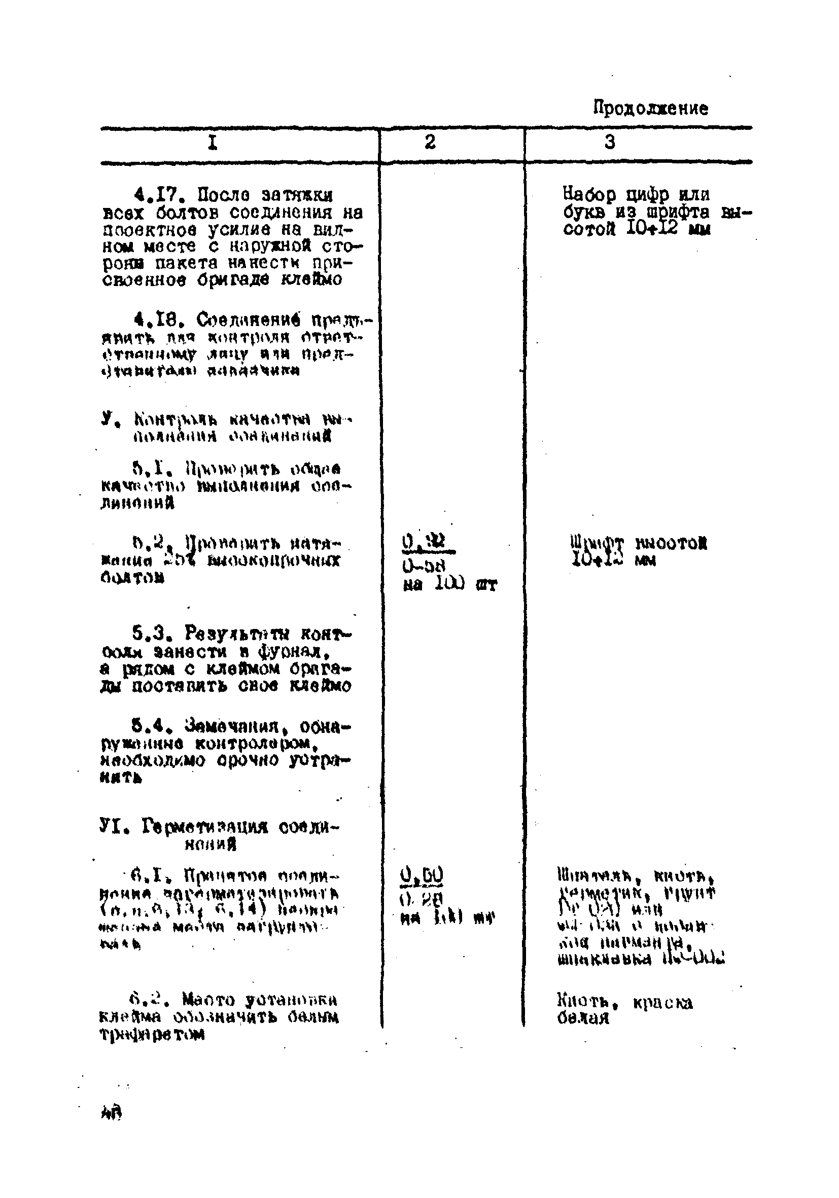 | Оглавление: | 1. Общие положения 2. Материалы, изделия и условия их применения 3. Материалы для приготовления клеев и покрытий контактных поверхностей 4. Технология выполнения сдвигоустойчивых соединений Требования к элементам конструкций Подготовка контактных поверхностей элементов и деталей Пескоструйная обработка Газопламенная обработка Поверхности без специальной обработки Поверхности с клеефрикционными покрытиями Подготовка высокопрочных болтов, гаек и шайб Сборка соединений на высокопрочных болтах Натяжение высокопрочных болтов Натяжение болтов с регулированием усилий гайковертов, тарированием по углу поворота гайки Регулирование усилий натяжения высокопрочных болтов М24 пневматическим гайковертом ИП3106 (ИП3205) по углу поворота гайки Натяжение высокопрочных болтов электрическими ударными гайковертами ИЭ-3112 с регулированием усилий по количеству ударов Натяжение высокопрочных болтов с регулированием усилий по моменту закручивания 5. Воздухоснабжение работ 6. Приемка и герметизация соединений 7. Особенности технологии выполнения соединений с несущими высокопрочными болтами 8. Особенности технологии выполнения болтосварных соединений 9. Особенности технологии выполнения болтоклепанных соединений 10. Особенности технологии выполнения болтоклеевых соединений 11. Типовой технологический процесс сборки соединений на высокопрочных болтах 12. Техника безопасности и охрана труда Приложения |