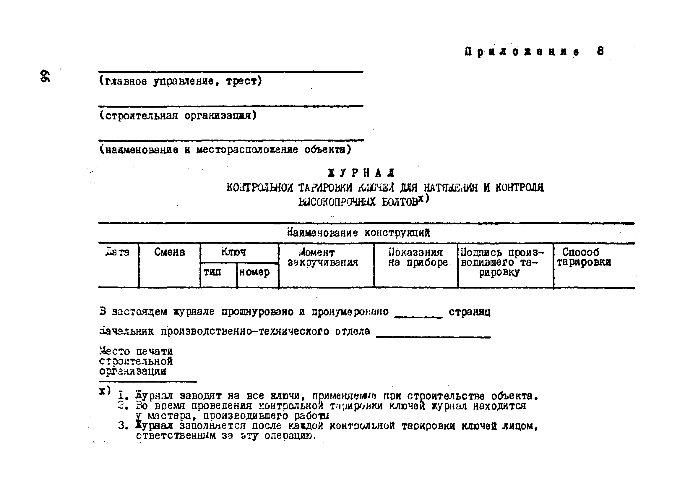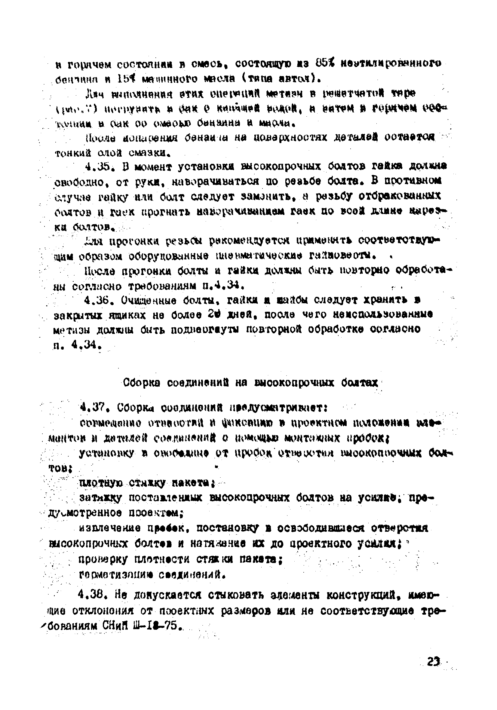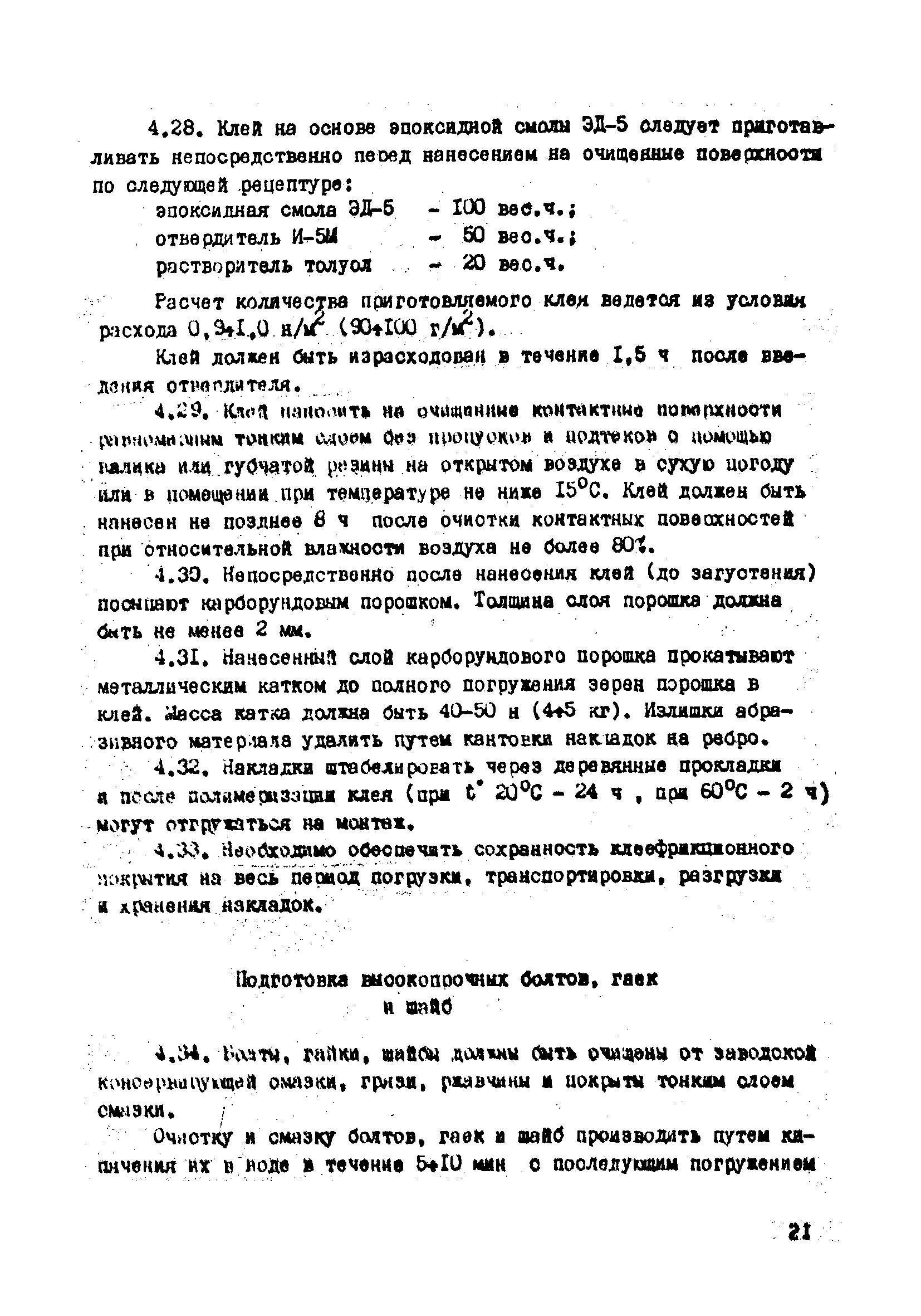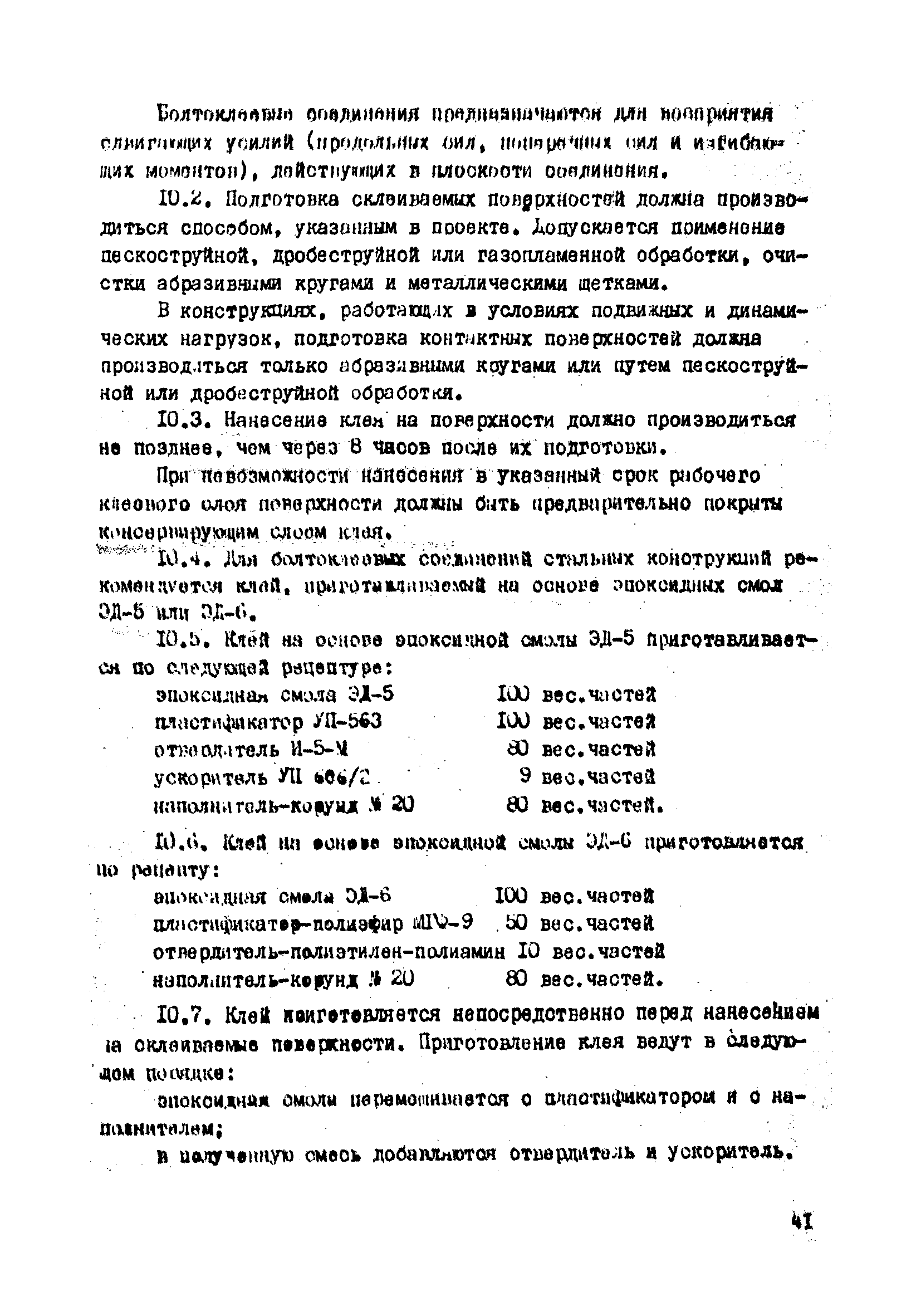 | Оглавление: | 1. Общие положения 2. Материалы, изделия и условия их применения 3. Материалы для приготовления клеев и покрытий контактных поверхностей 4. Технология выполнения сдвигоустойчивых соединений Требования к элементам конструкций Подготовка контактных поверхностей элементов и деталей Пескоструйная обработка Газопламенная обработка Поверхности без специальной обработки Поверхности с клеефрикционными покрытиями Подготовка высокопрочных болтов, гаек и шайб Сборка соединений на высокопрочных болтах Натяжение высокопрочных болтов Натяжение болтов с регулированием усилий гайковертов, тарированием по углу поворота гайки Регулирование усилий натяжения высокопрочных болтов М24 пневматическим гайковертом ИП3106 (ИП3205) по углу поворота гайки Натяжение высокопрочных болтов электрическими ударными гайковертами ИЭ-3112 с регулированием усилий по количеству ударов Натяжение высокопрочных болтов с регулированием усилий по моменту закручивания 5. Воздухоснабжение работ 6. Приемка и герметизация соединений 7. Особенности технологии выполнения соединений с несущими высокопрочными болтами 8. Особенности технологии выполнения болтосварных соединений 9. Особенности технологии выполнения болтоклепанных соединений 10. Особенности технологии выполнения болтоклеевых соединений 11. Типовой технологический процесс сборки соединений на высокопрочных болтах 12. Техника безопасности и охрана труда Приложения |