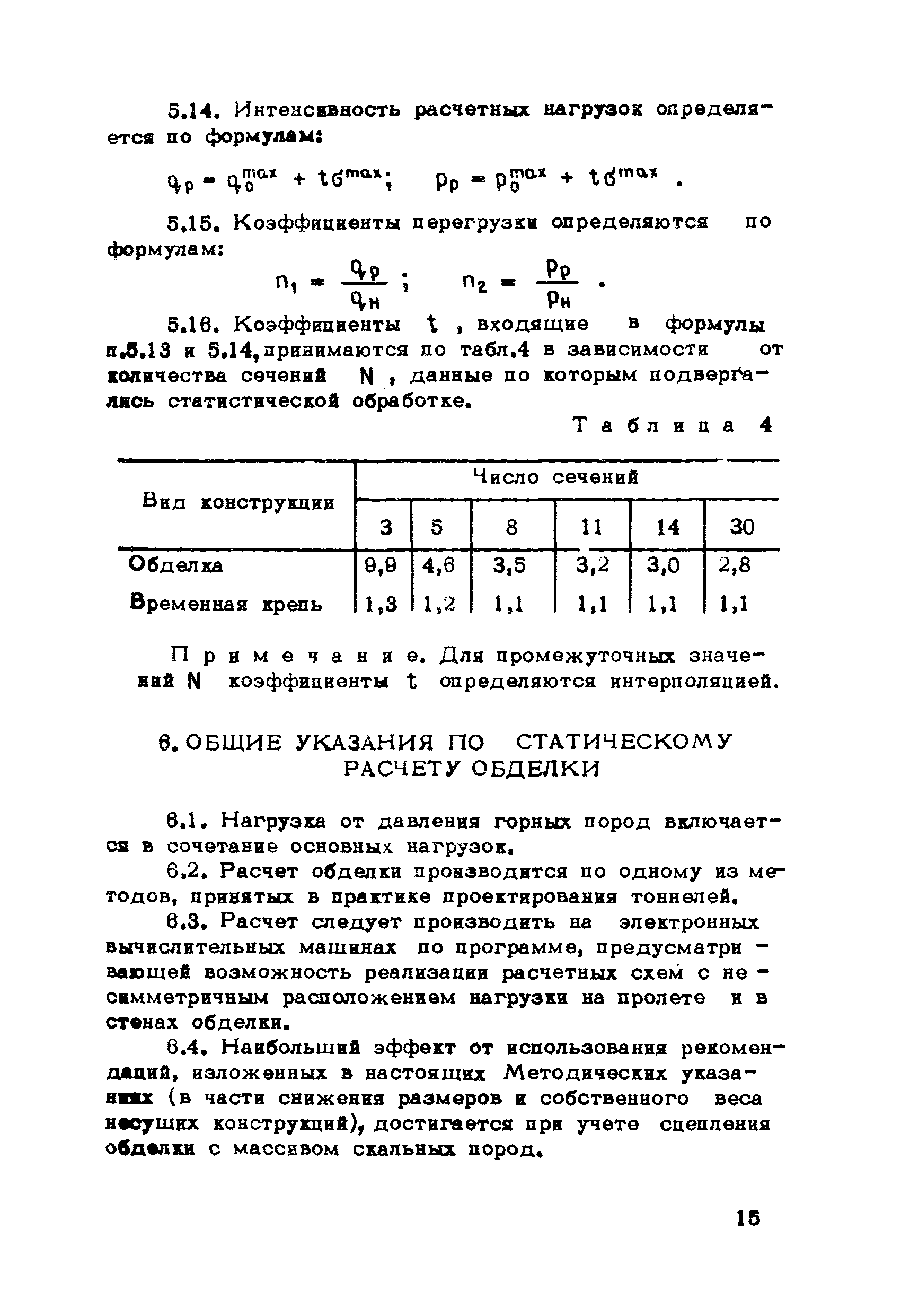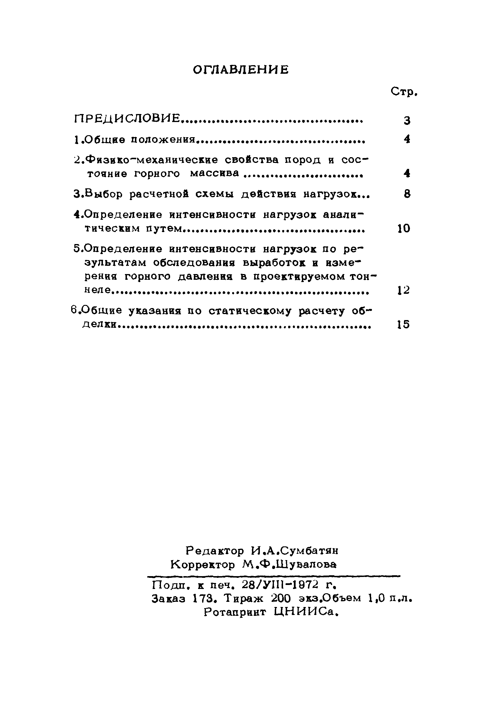 | Оглавление: | Предисловие 1. Общие положения 2. Физико-механические свойства пород и состояние горного массива 3. Выбор расчетной схемы действия нагрузок 4. Определение интенсивности нагрузок аналитическим путем 5. Определение интенсивности нагрузок по результатам обследования выработок и измерения горного давления в проектируемом тоннеле 6. Общие указания по статическому расчету обделки |