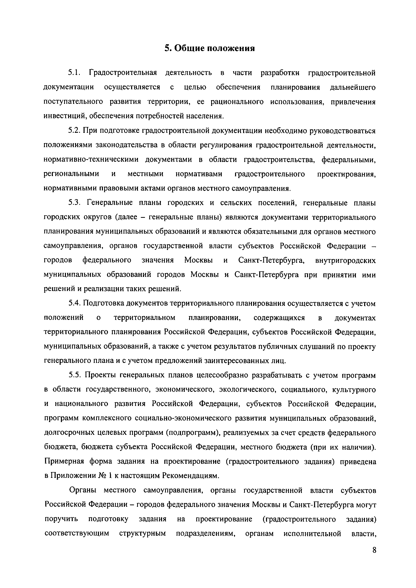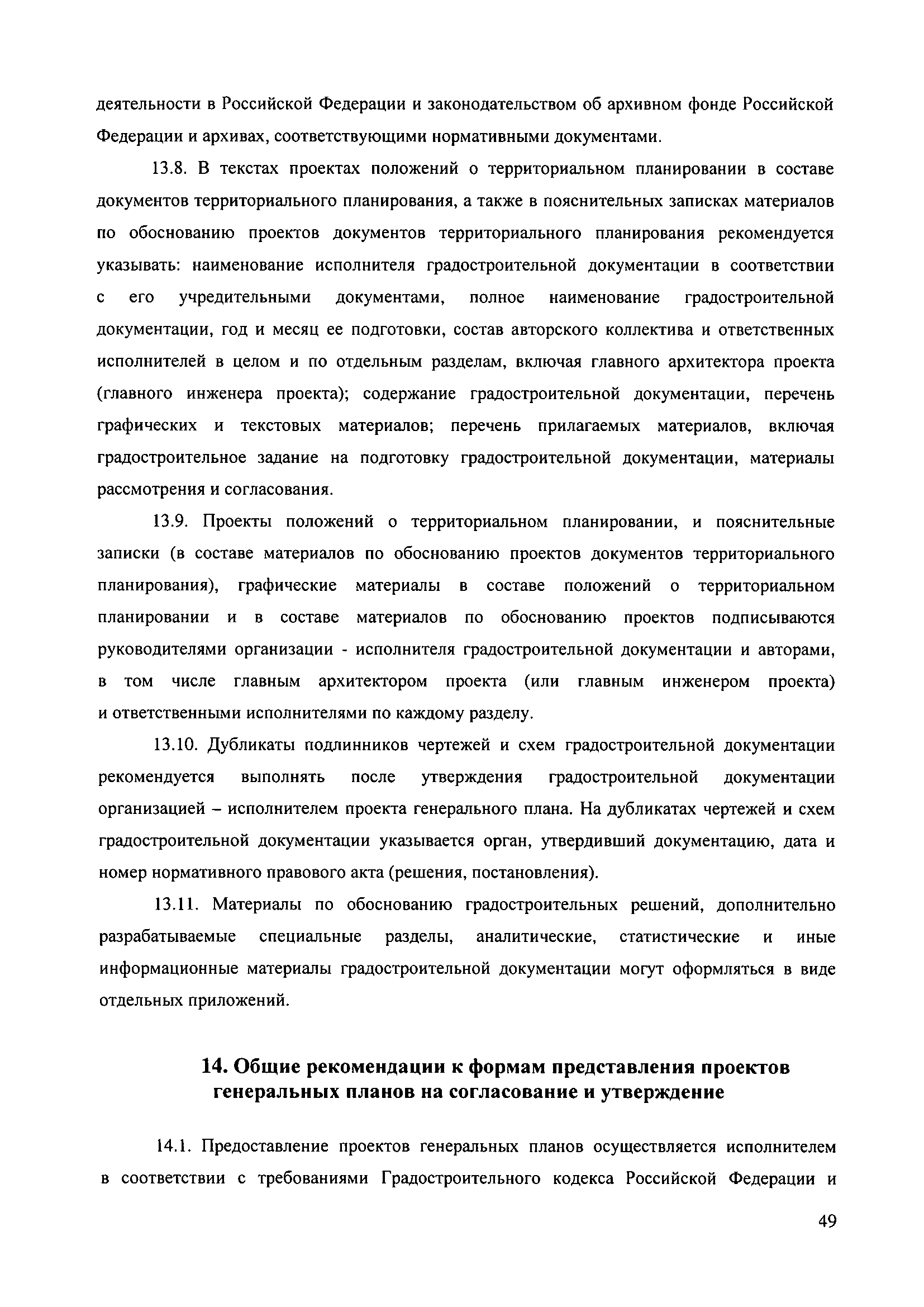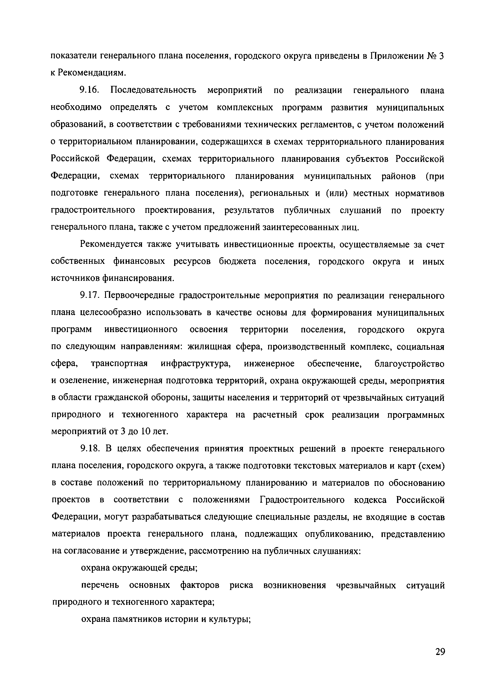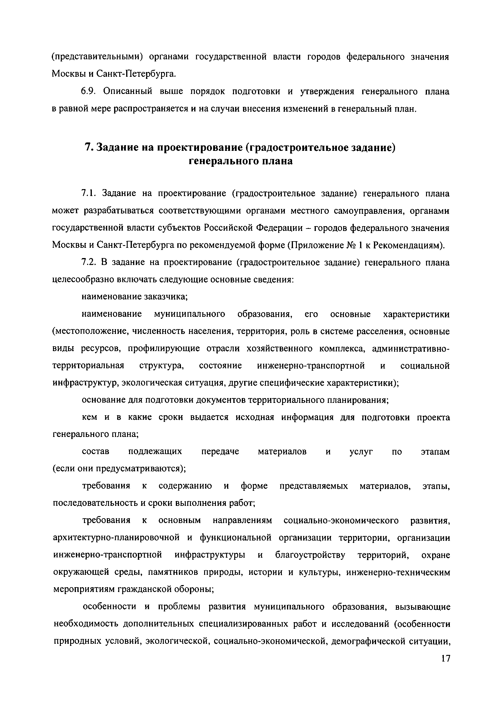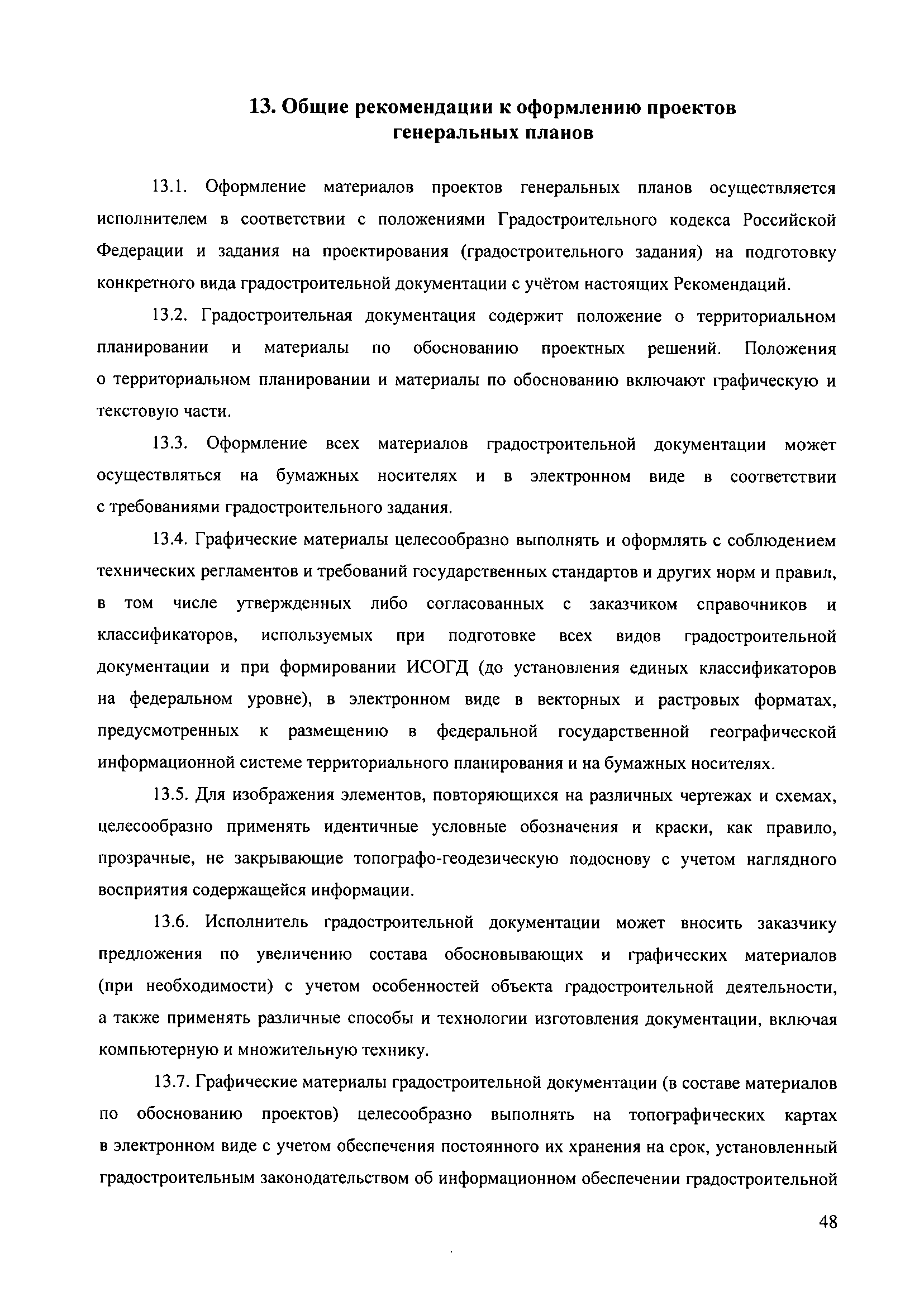 Методические рекомендации по разработке проектов генеральных планов поселений и городских округов| Статус: | не действует | | Название рус.: | Методические рекомендации по разработке проектов генеральных планов поселений и городских округов | | Дата добавления в базу: | 01.09.2013 | | Дата актуализации: | 01.01.2021 | | Дата введения: | 13.11.2010 | | Дата окончания срока действия: | 25.05.2011 | | Область применения: | Рекомендации предназначены для использования организациями независимо от организационно-правовой формы, а также индивидуальными предпринимателями, осуществляющими деятельность по разработке градостроительной документации на профессиональной основе, федеральными органами исполнительной власти, органами исполнительной власти субъектов Российской Федерации, органами местного самоуправления, осуществляющими в пределах своих полномочий планирование развития территорий и использование земель для градостроительной деятельности, а также органами, координирующими и контролирующими осуществление градостроительной деятельности. | | Оглавление: | 1. Введение 2. Область применения 3. Термины и определения 4. Перечень используемых сокращений 5. Общие положения 6. Общий порядок подготовки и утверждения генерального плана 7. Задание на проектирование (градостроительное задание) генерального плана 8. Исходные данные для подготовки проекта генерального плана 9. Состав и содержание проекта генерального плана 10. Реализация генерального плана 11. Особенности разработки раздела «Перечень основных факторов риска возникновения чрезвычайных ситуаций природного и техногенного характера» 12. Градостроительные ограничения и особые условия использования территорий 13. Общие рекомендации к оформлению проектов генеральных планов 14. Общие рекомендации к формам представления проектов генеральных планов на согласование и утверждение 15. Порядок хранения градостроительной документации 16. Приложения | | Утверждён: | 13.11.2010 Минрегион России (492)