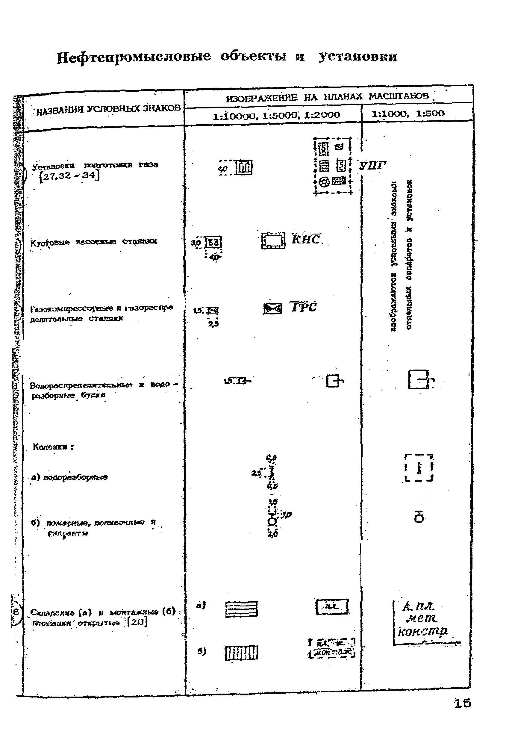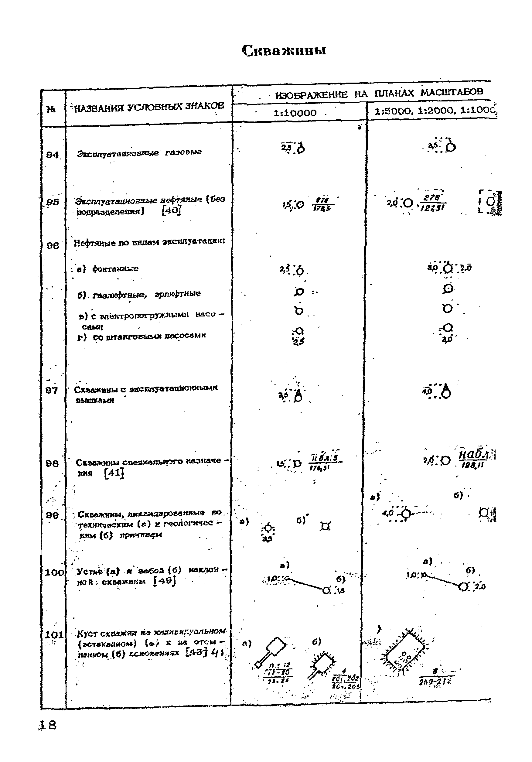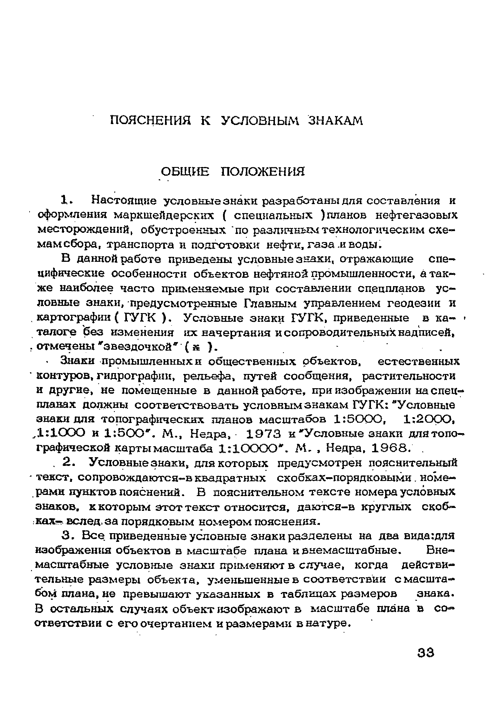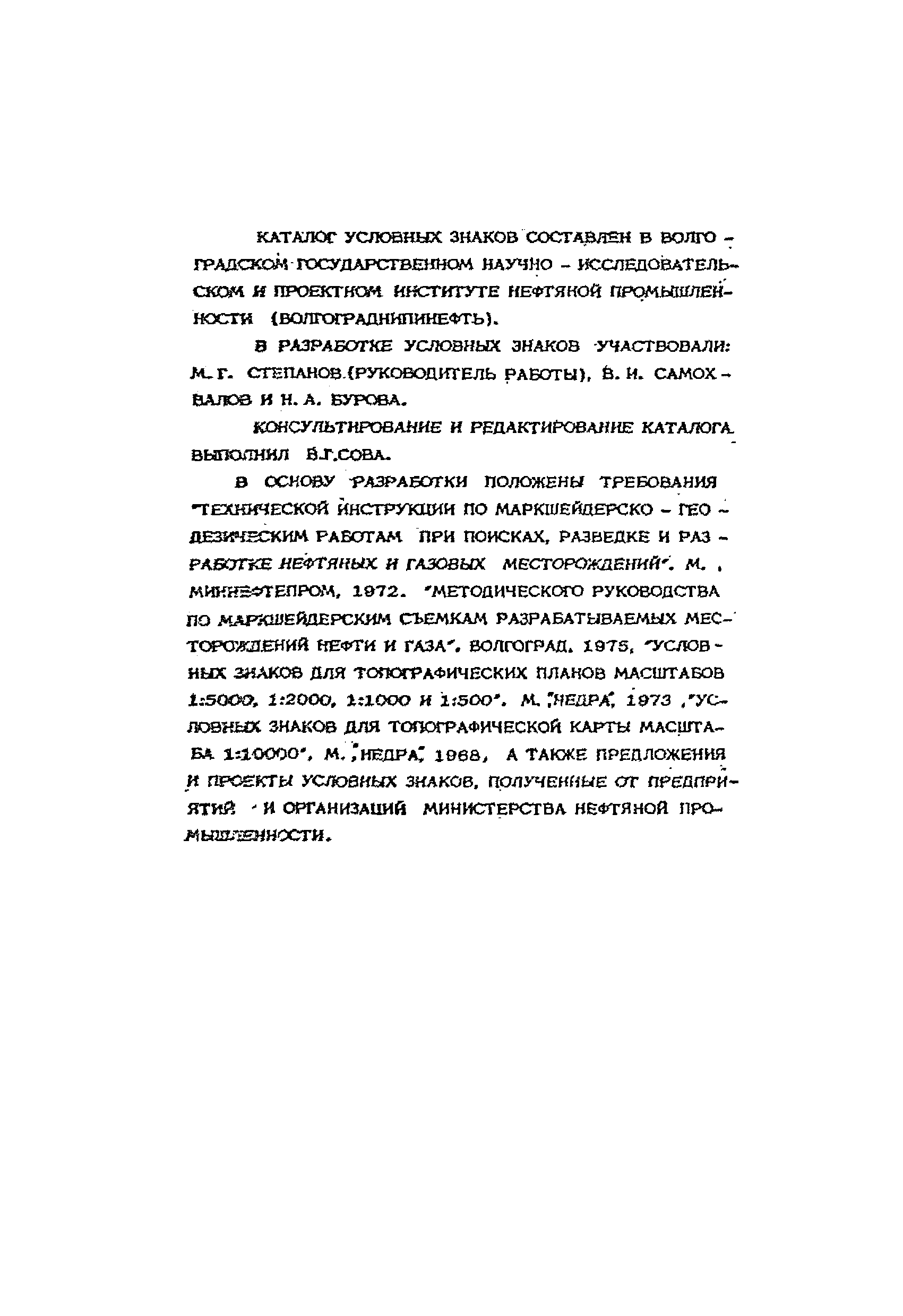 Каталог условных знаков для маркшейдерских планов разрабатываемых месторождений нефти и газа масштабов: 1:10000, 1:5000, 1:2000, 1:1000, 1:500| Статус: | не установлен срок действия | | Название рус.: | Каталог условных знаков для маркшейдерских планов разрабатываемых месторождений нефти и газа масштабов: 1:10000, 1:5000, 1:2000, 1:1000, 1:500 | | Дата добавления в базу: | 01.09.2013 | | Дата актуализации: | 01.01.2021 | | Область применения: | Условные знаки разработаны для составления и оформления маркшейдерских (специальных) планов нефтегазовых месторождений, обустроенных по различным технологическим схемам сбора, транспорта и подготовки нефти, газа и воды. | | Оглавление: | Пояснения к условным знакам Общие положения Пояснения к знакам опорных пунктов Пояснения к знакам зданий, построек и их частей Пояснения к знакам нефтепромысловых аппаратов и сооружений Пояснения к знакам нефтепромысловых объектов и установок Пояснения к знакам скажин Пояснения к знакам промысловых инженерных коммуникаций Пояснения к знакам границ и ограждений Пояснения к образцам шрифтов Пояснения к образцам оформления рамок Перечень условных сокращений | | Разработан: | ВолгоградНИПИнефти