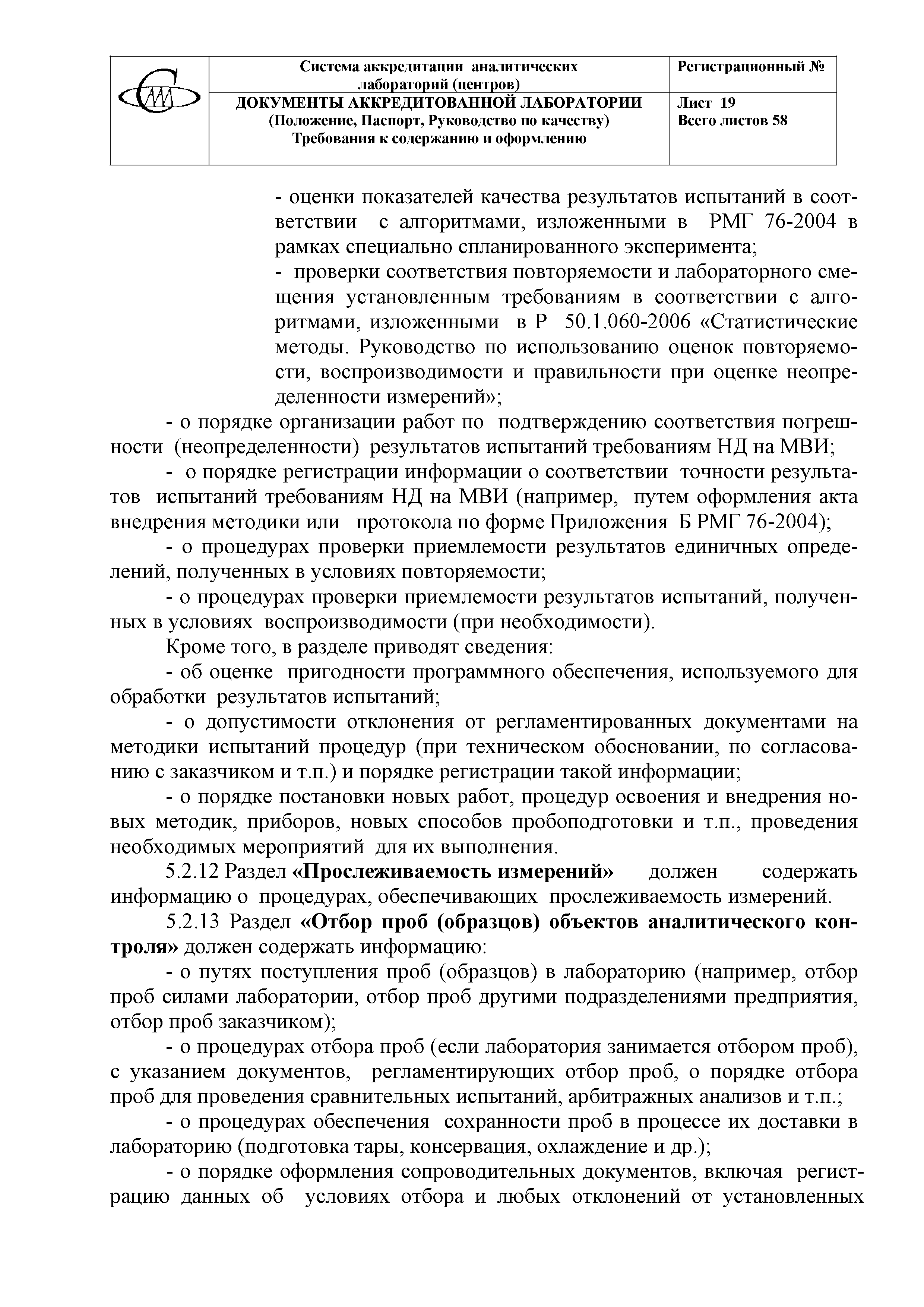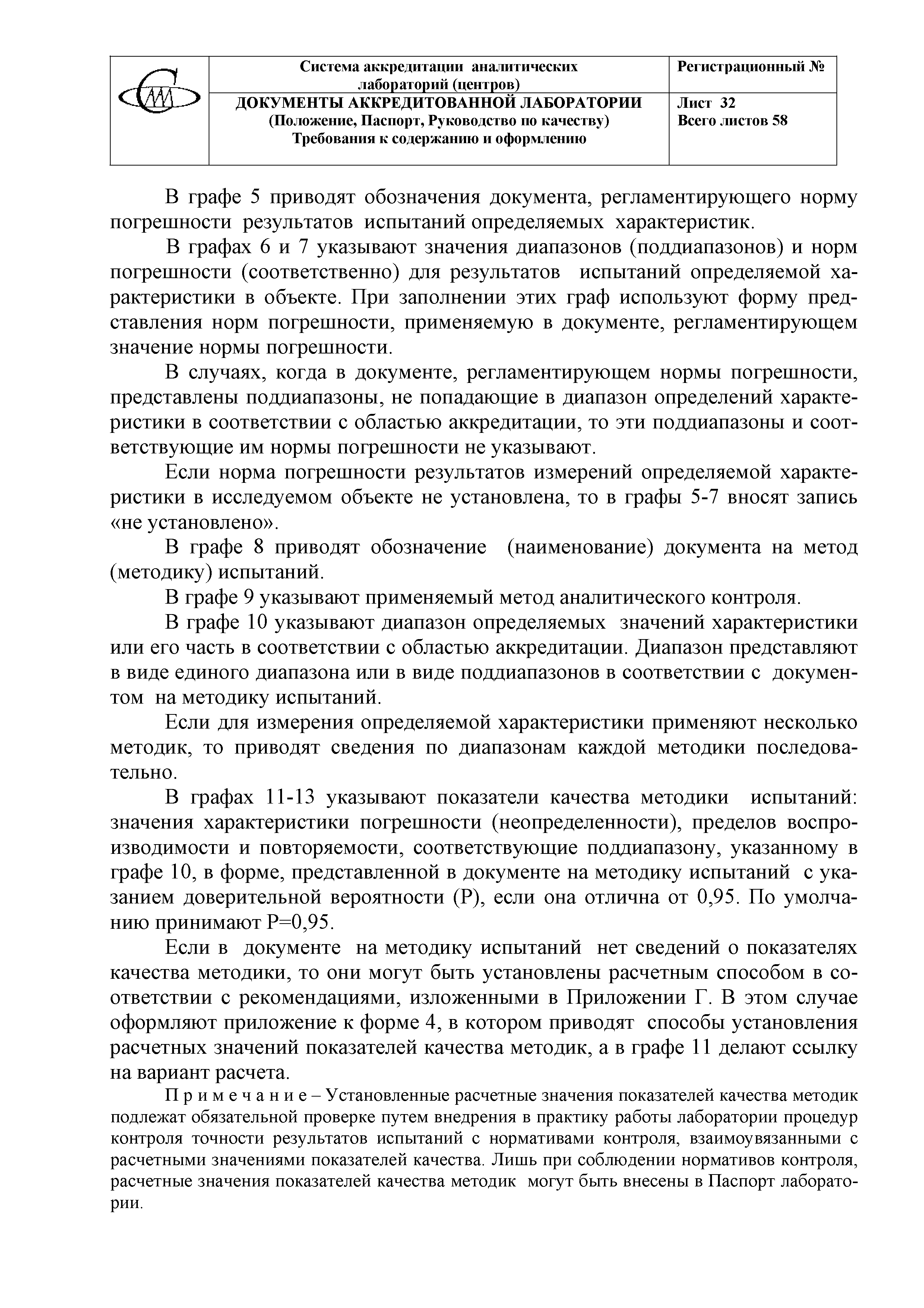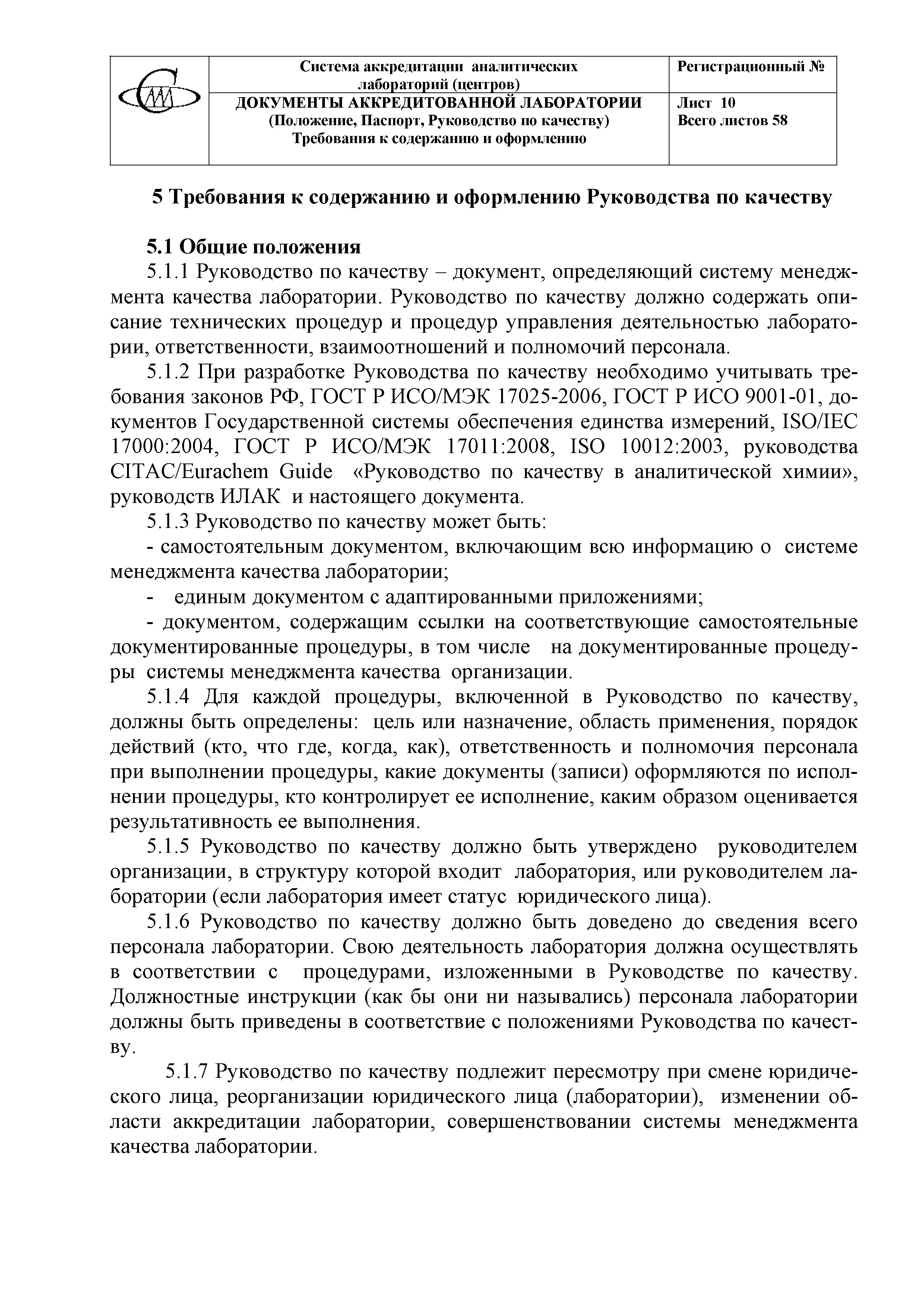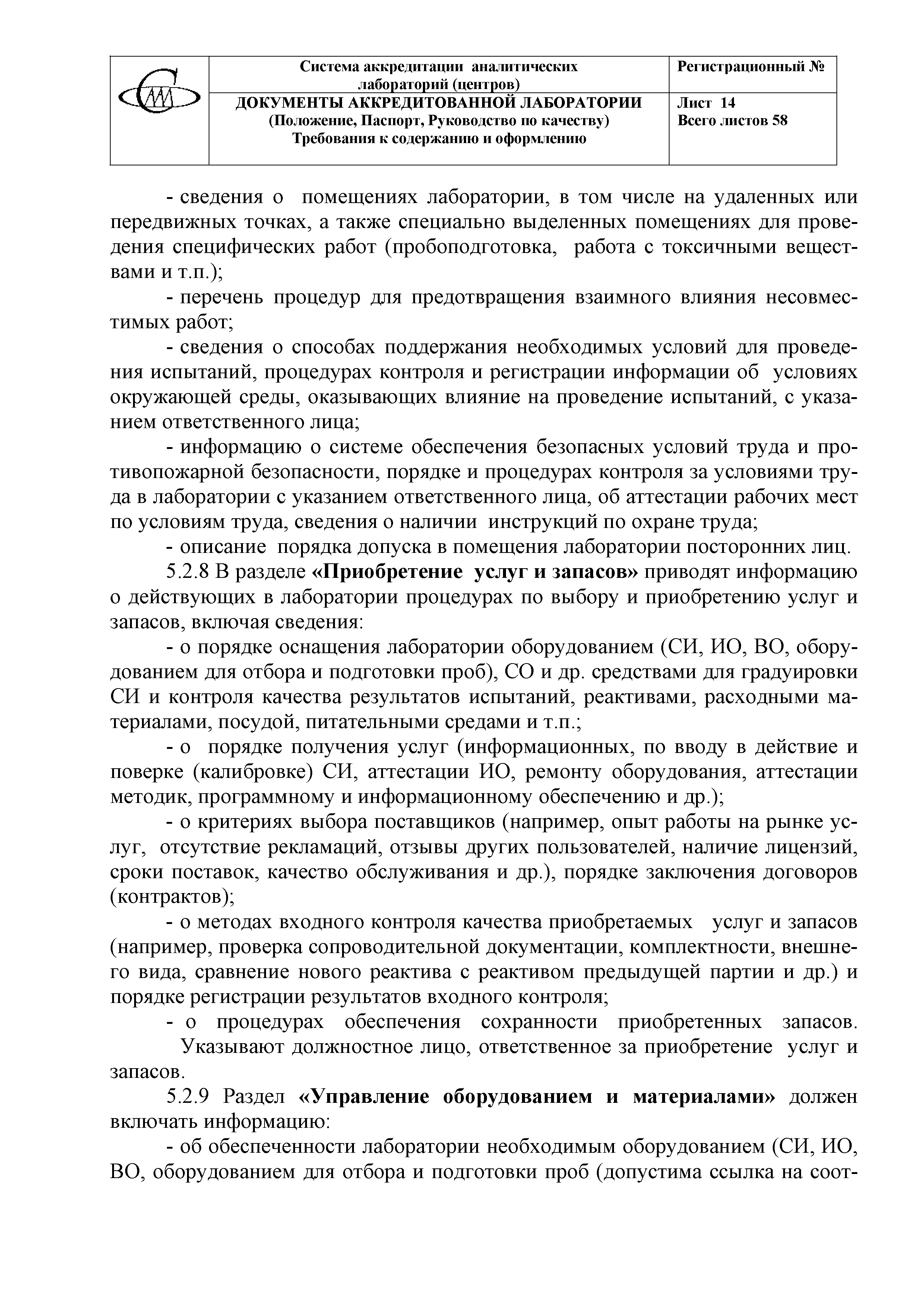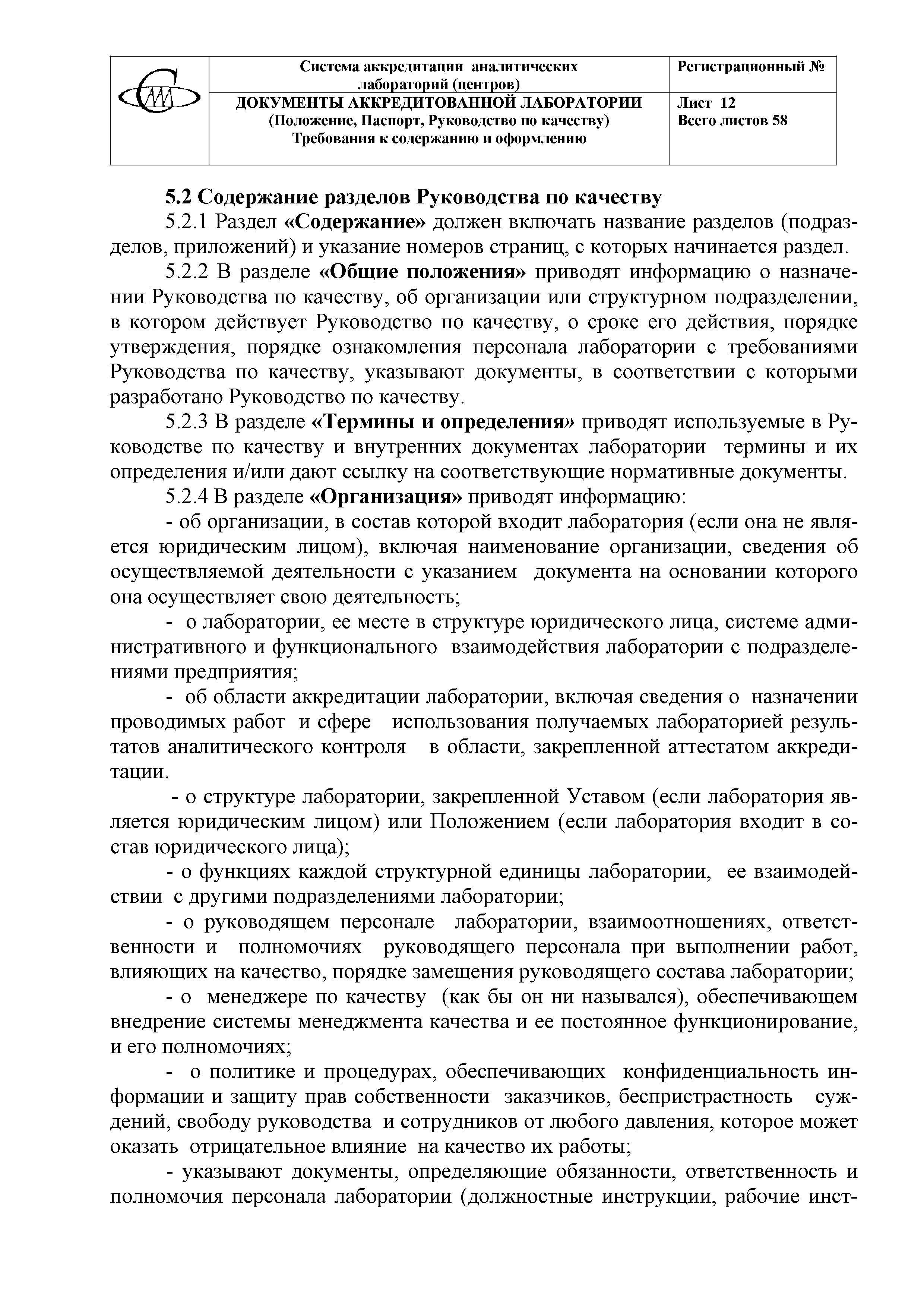 | Оглавление: | 1. Область применения 2. Нормативные ссылки 3. Определения и сокращения 4. Требования к содержанию и оформлению. Положения об аккредитованной лаборатории 5. Требования к содержанию и оформлению Руководства по качеству 6. Требования к содержанию и оформлению Паспорта аккредитованной лаборатории Приложение А. Форма титульного листа Положения об аккредитованной лаборатории Приложение Б. Форма титульного листа Руководства по качеству Приложение В. Форма титульного листа и формы Паспорта аккредитованной лаборатории Приложение Г. Способы установления расчетных значений показателей точности, правильности прецезионности методик анализа |