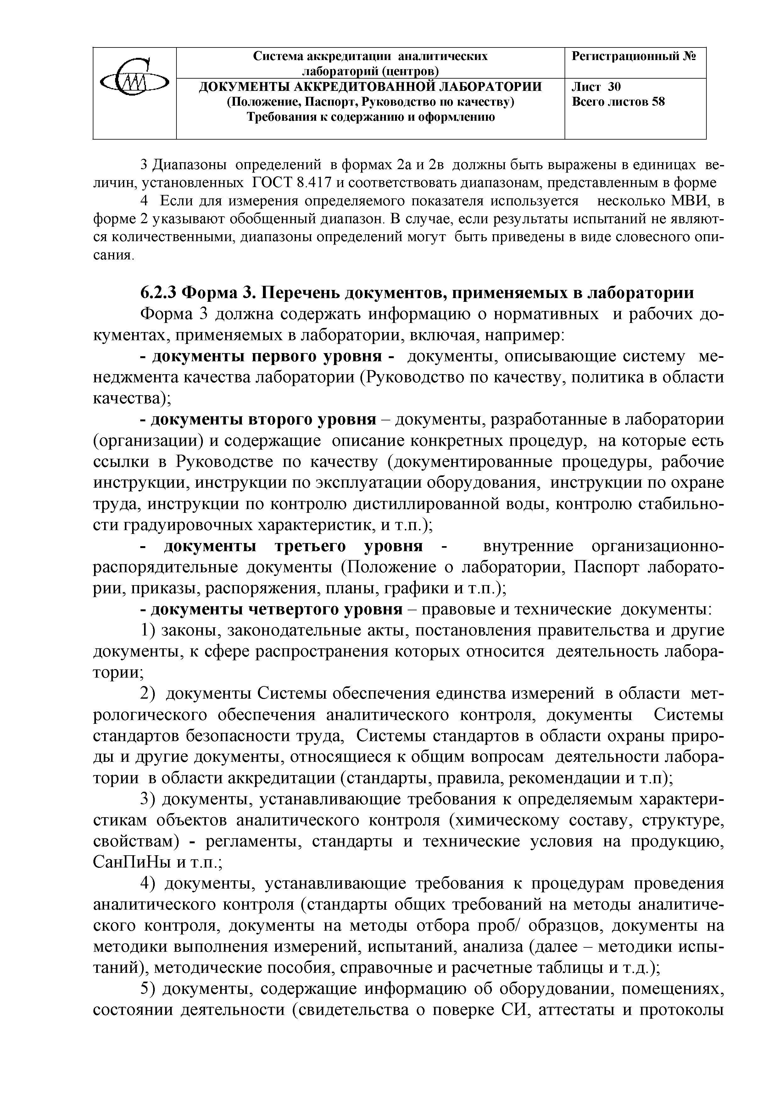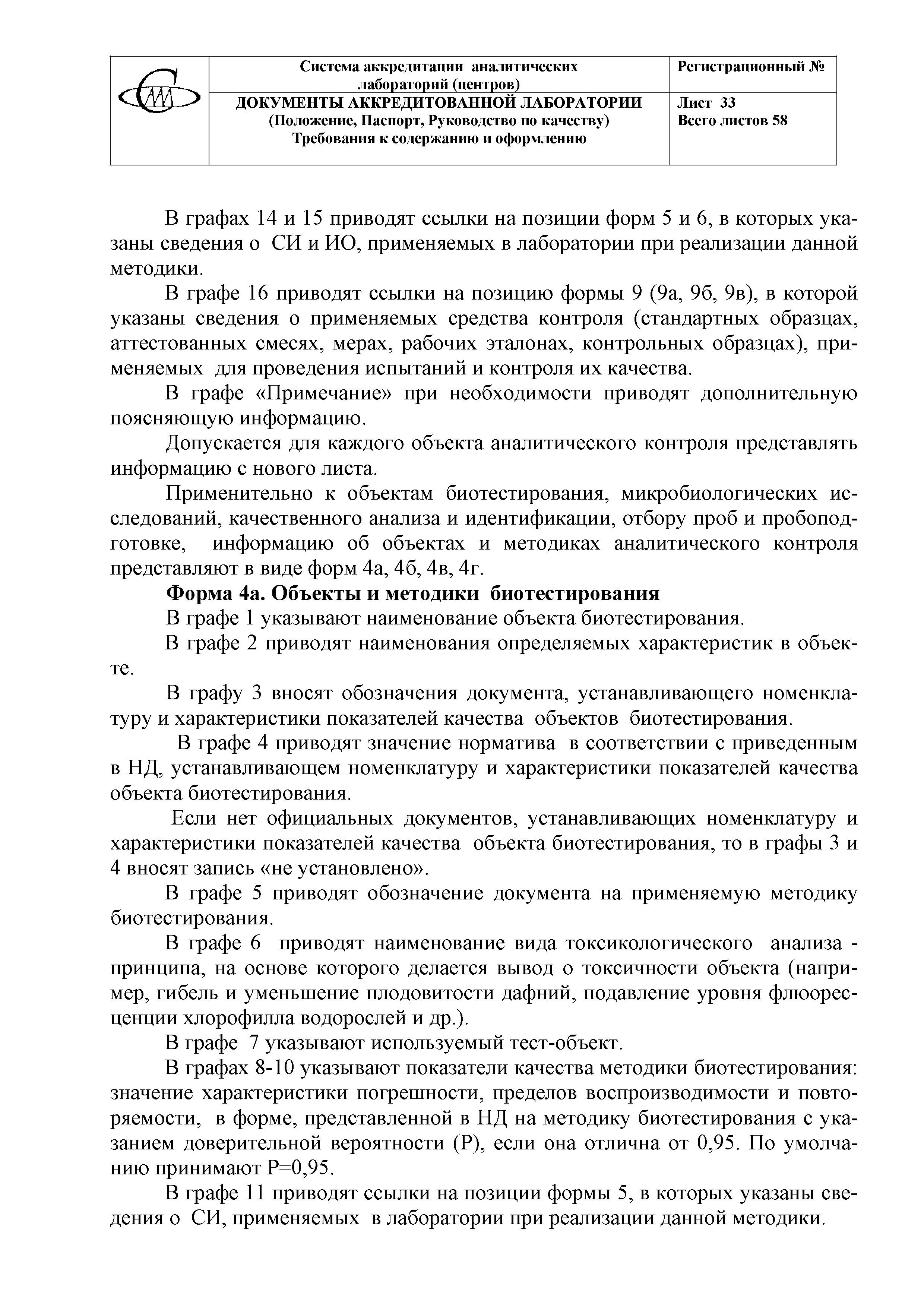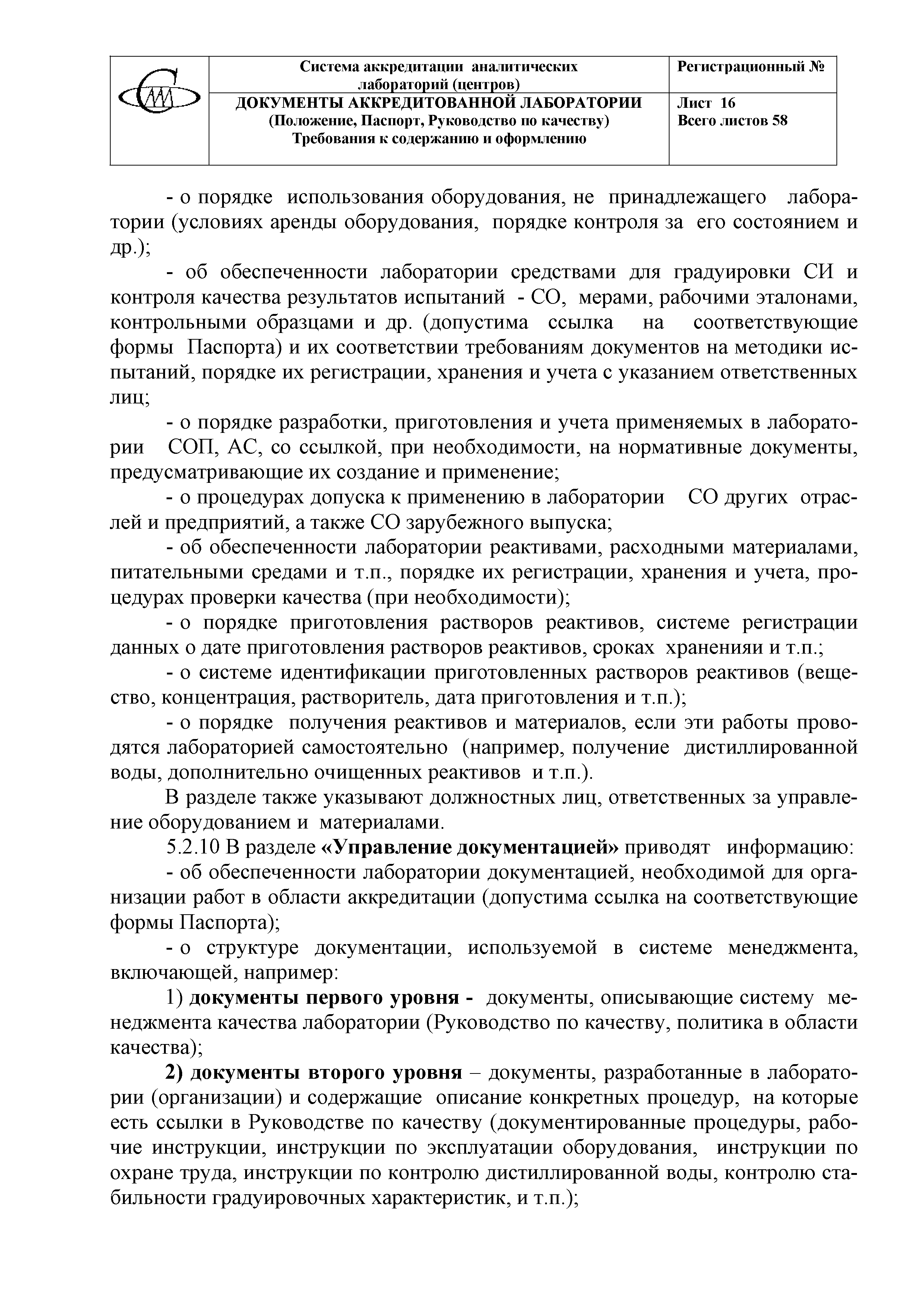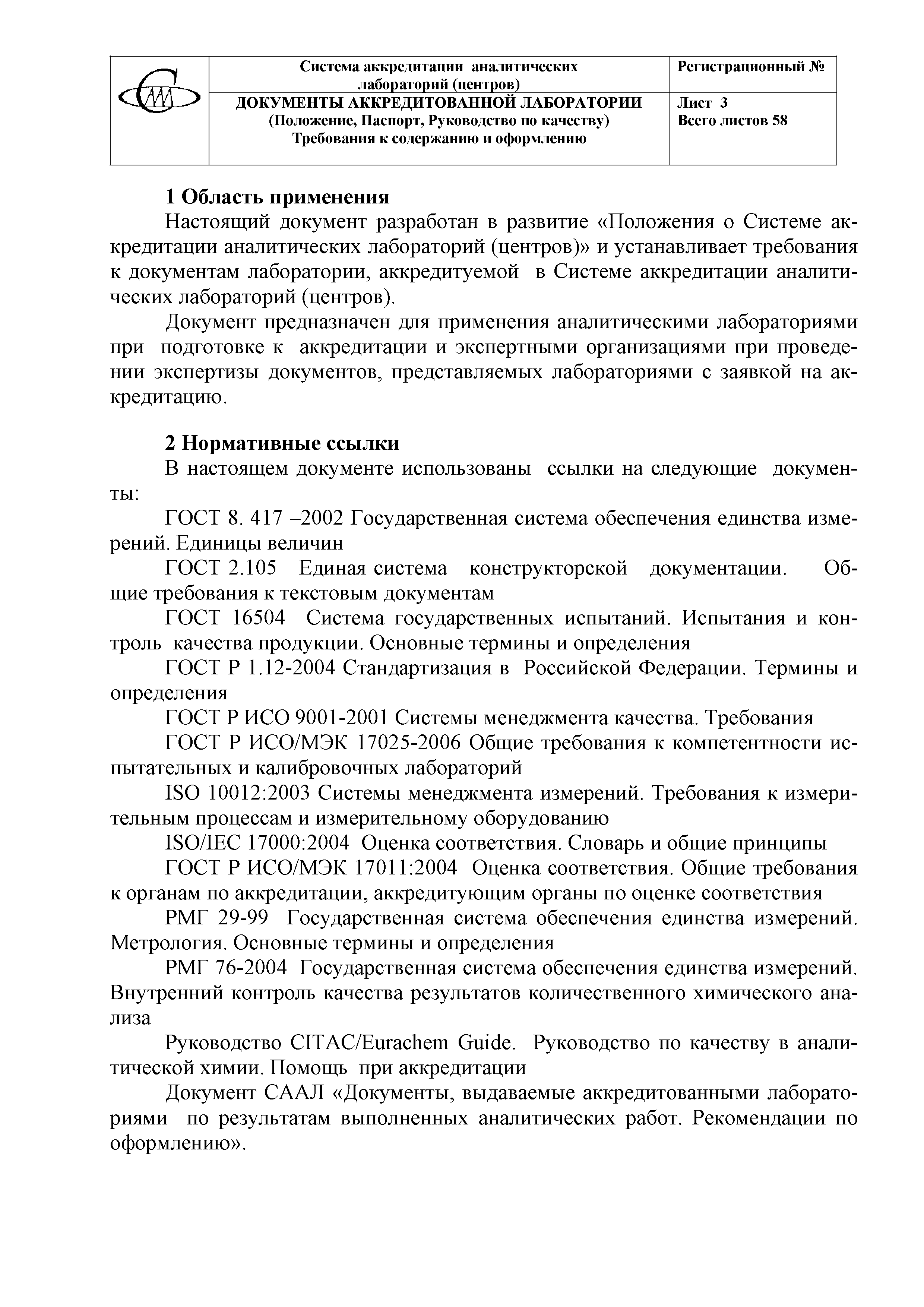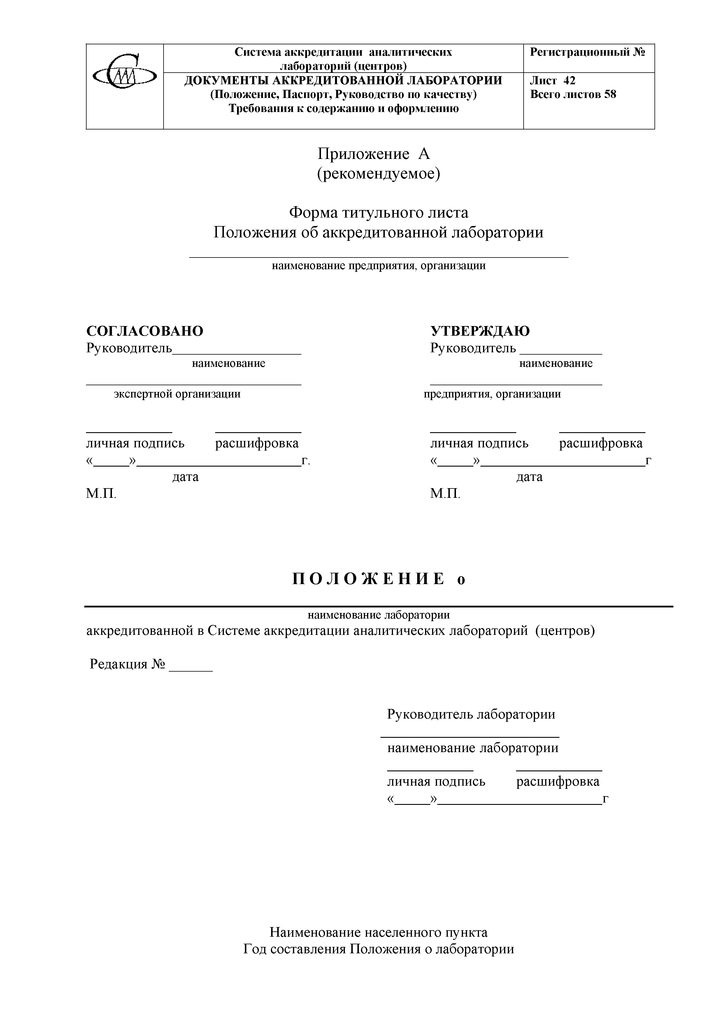 | Оглавление: | 1. Область применения 2. Нормативные ссылки 3. Определения и сокращения 4. Требования к содержанию и оформлению. Положения об аккредитованной лаборатории 5. Требования к содержанию и оформлению Руководства по качеству 6. Требования к содержанию и оформлению Паспорта аккредитованной лаборатории Приложение А. Форма титульного листа Положения об аккредитованной лаборатории Приложение Б. Форма титульного листа Руководства по качеству Приложение В. Форма титульного листа и формы Паспорта аккредитованной лаборатории Приложение Г. Способы установления расчетных значений показателей точности, правильности прецезионности методик анализа |