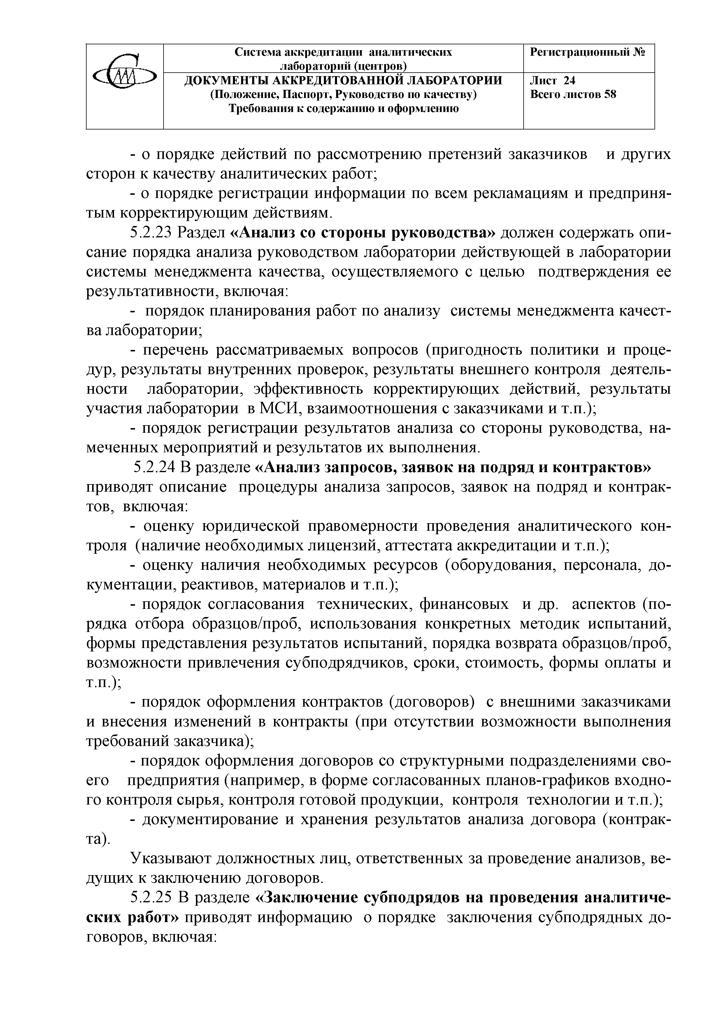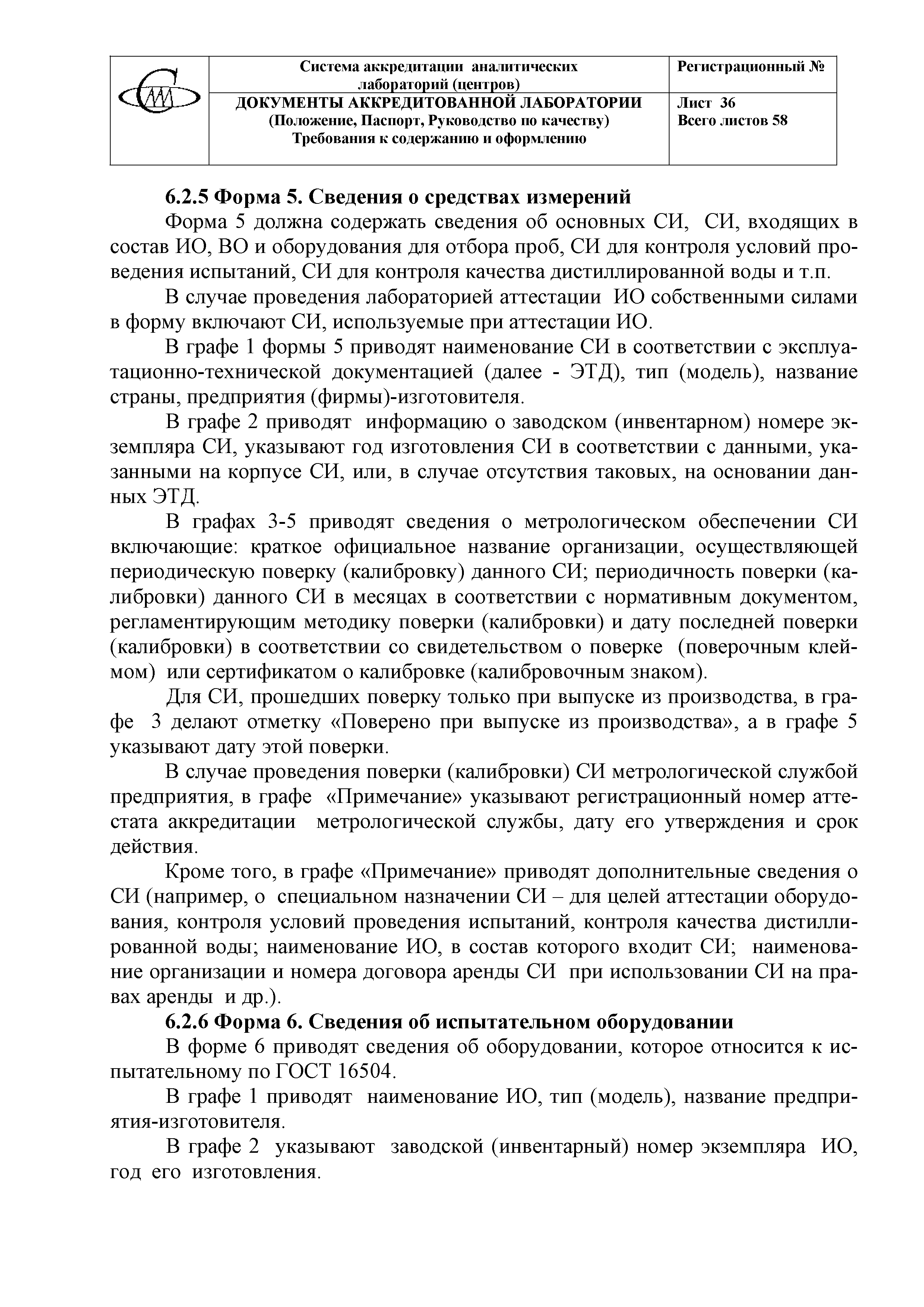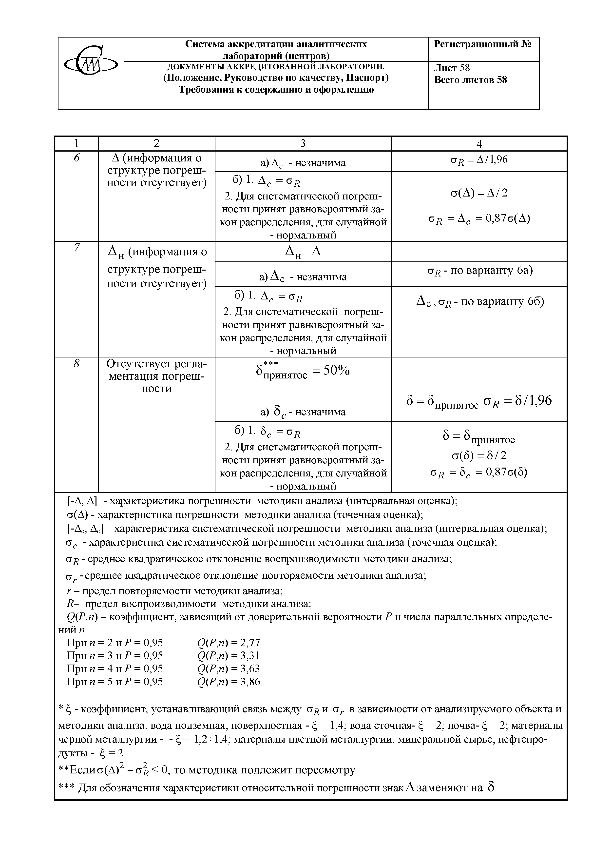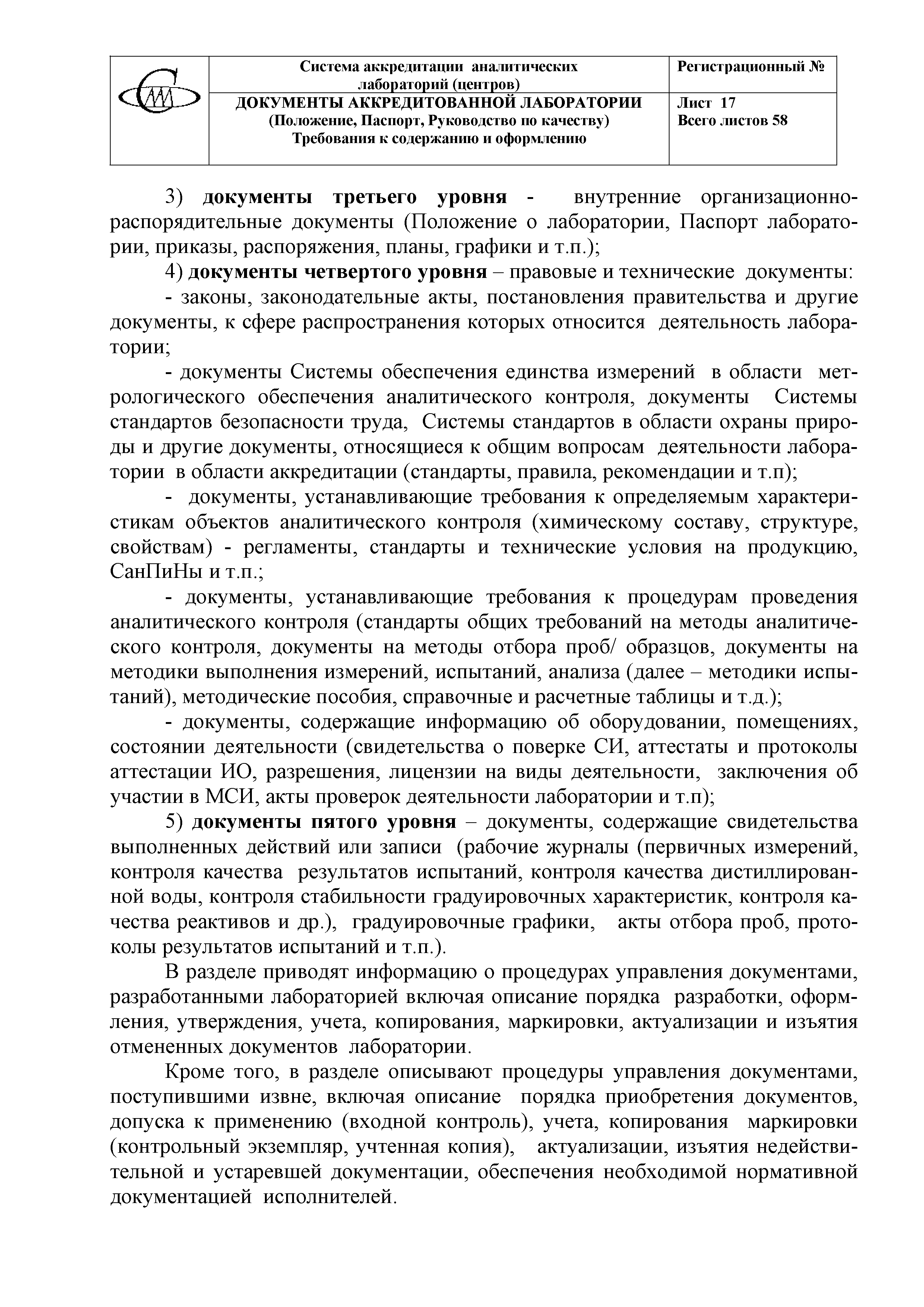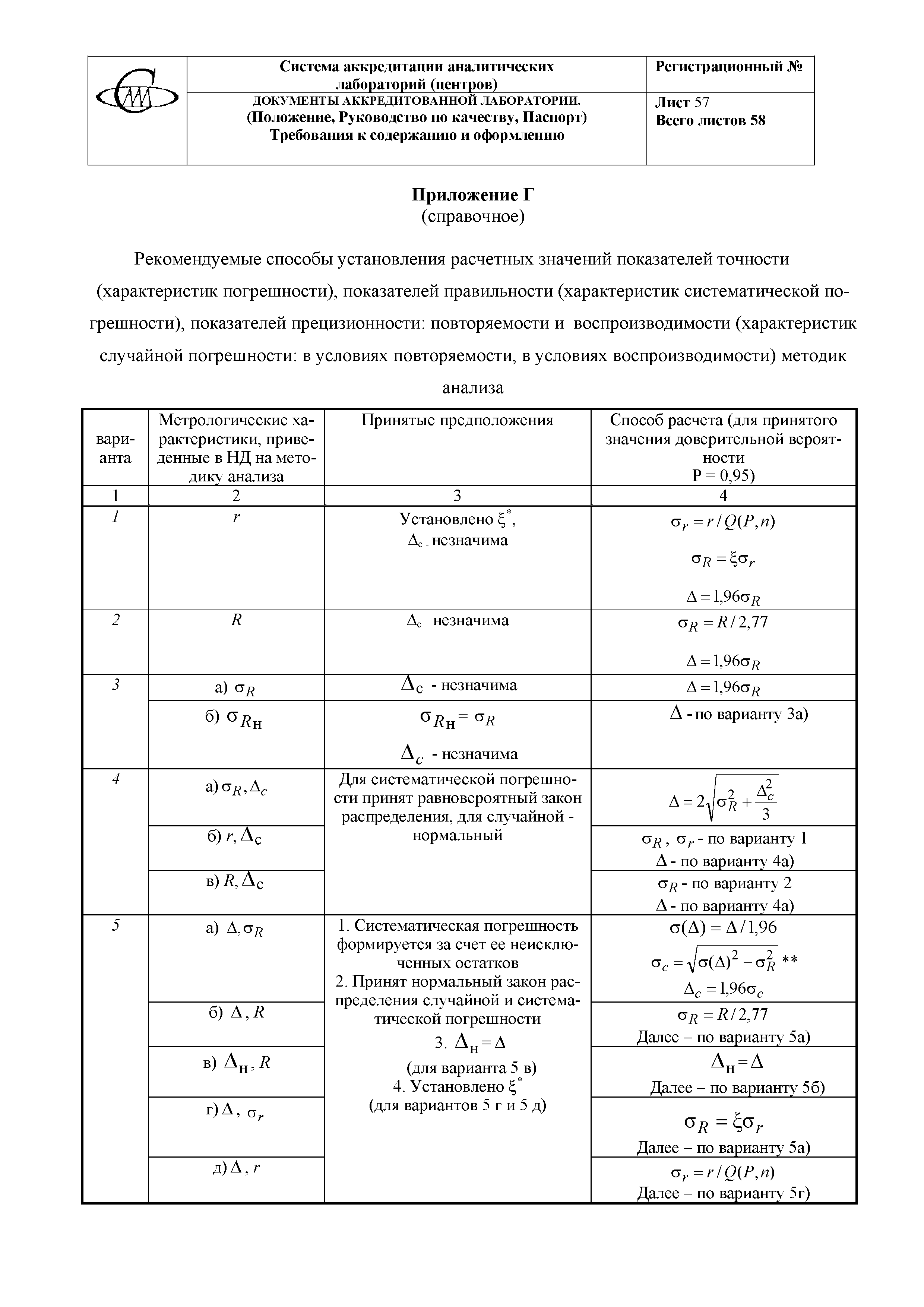 | Оглавление: | 1. Область применения 2. Нормативные ссылки 3. Определения и сокращения 4. Требования к содержанию и оформлению. Положения об аккредитованной лаборатории 5. Требования к содержанию и оформлению Руководства по качеству 6. Требования к содержанию и оформлению Паспорта аккредитованной лаборатории Приложение А. Форма титульного листа Положения об аккредитованной лаборатории Приложение Б. Форма титульного листа Руководства по качеству Приложение В. Форма титульного листа и формы Паспорта аккредитованной лаборатории Приложение Г. Способы установления расчетных значений показателей точности, правильности прецезионности методик анализа |