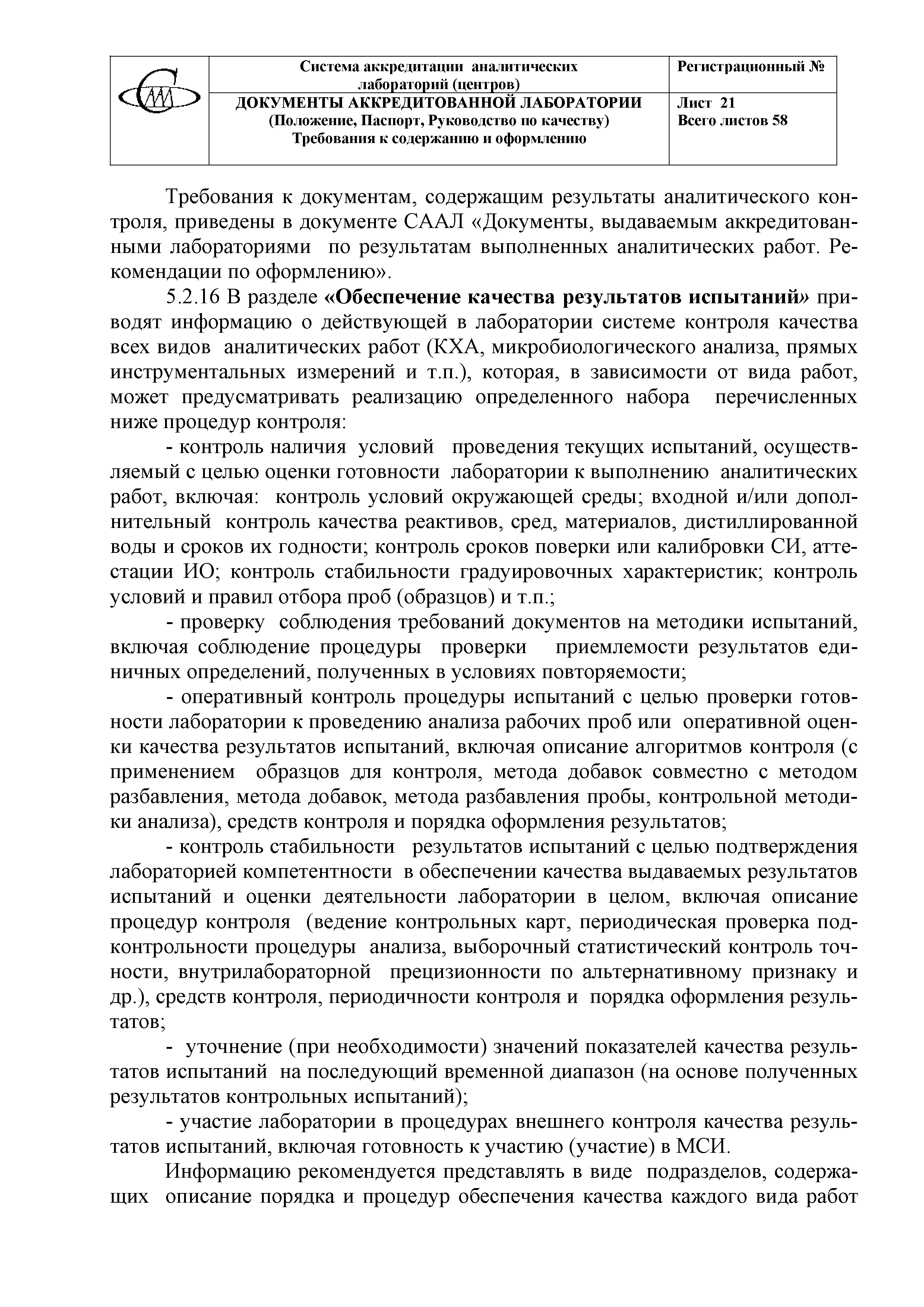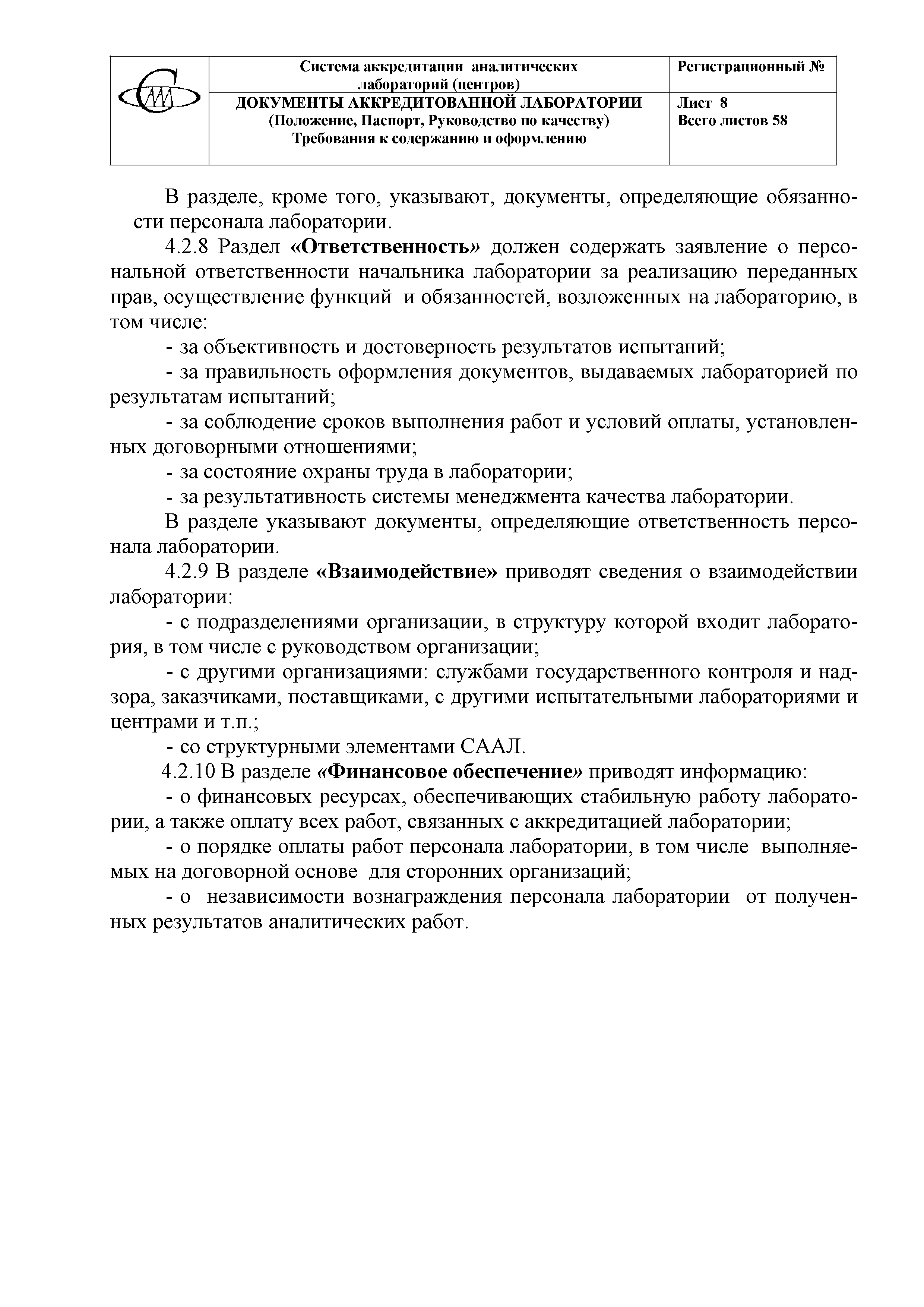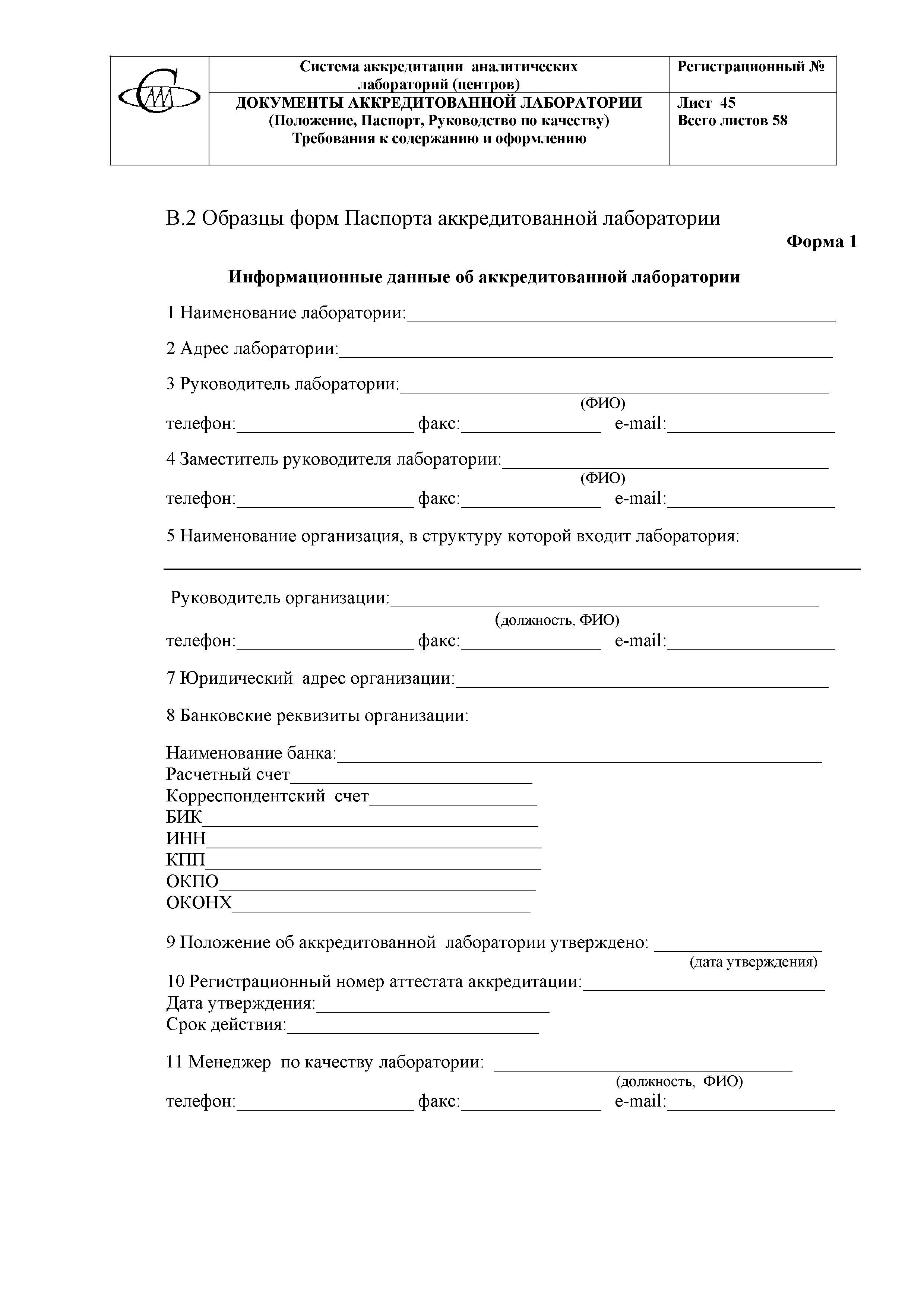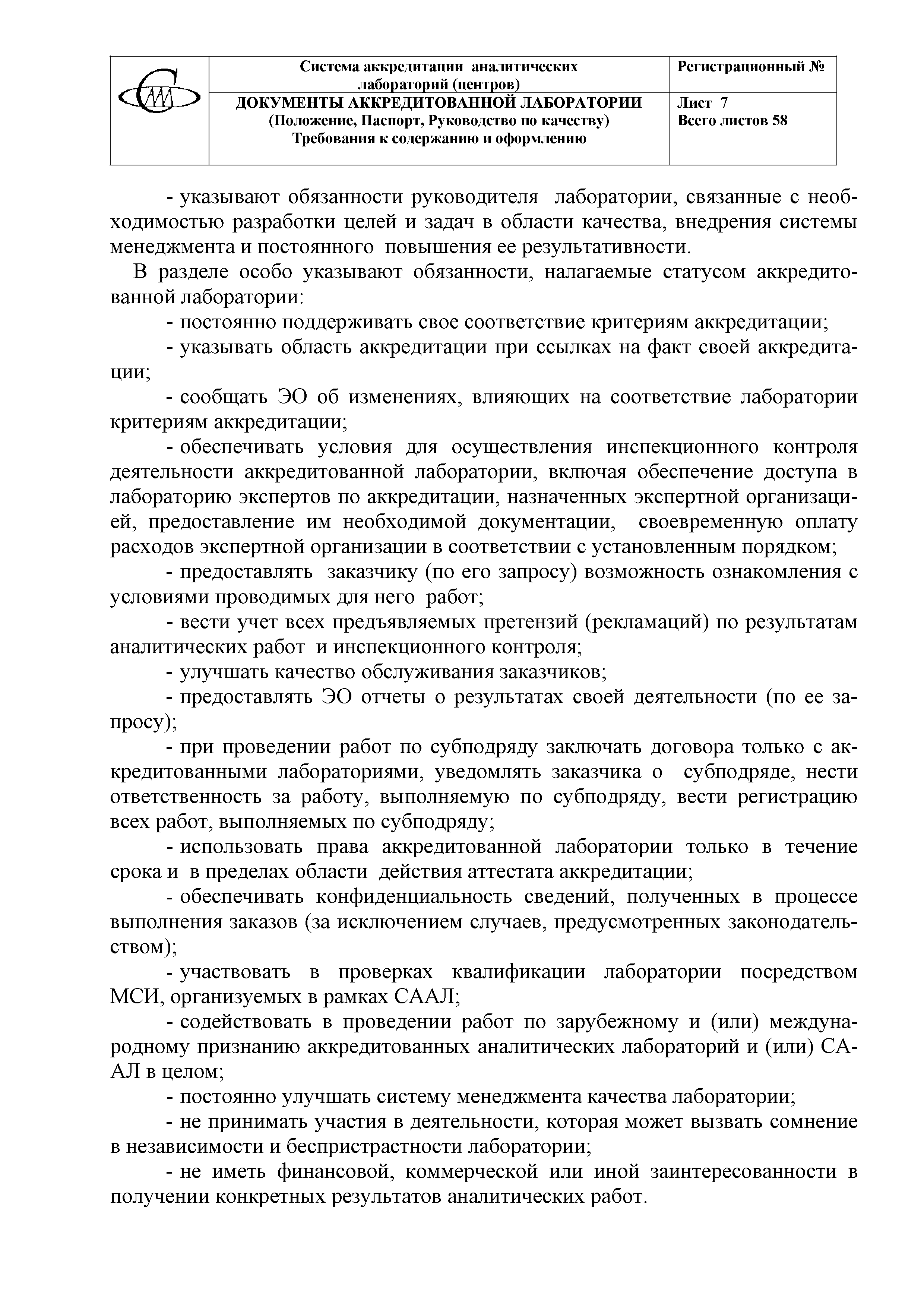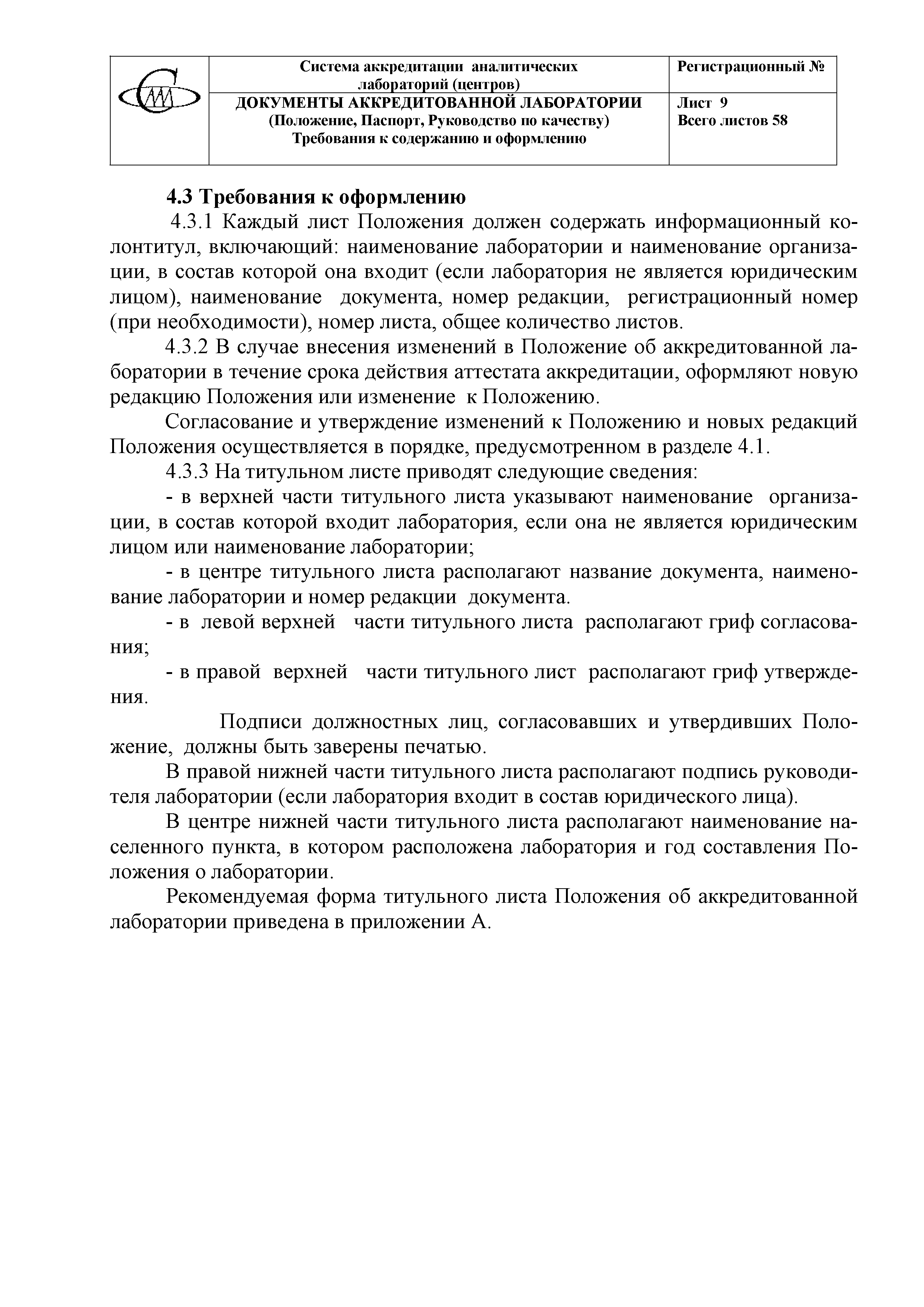 | Название рус.: | Документы аккредитованной лаборатории (Положение, Руководство по качеству, Паспорт). Требования к содержанию и оформлению |