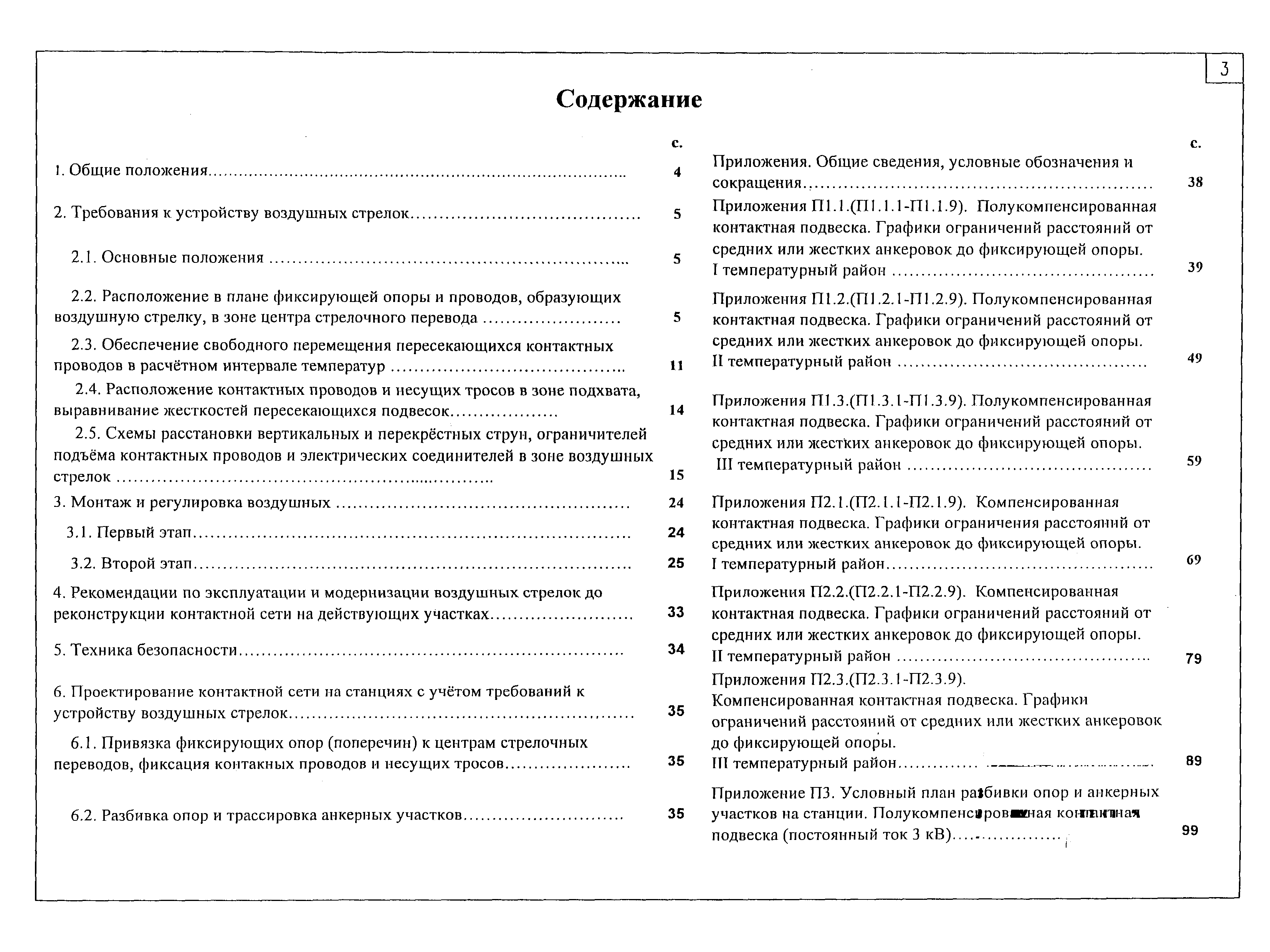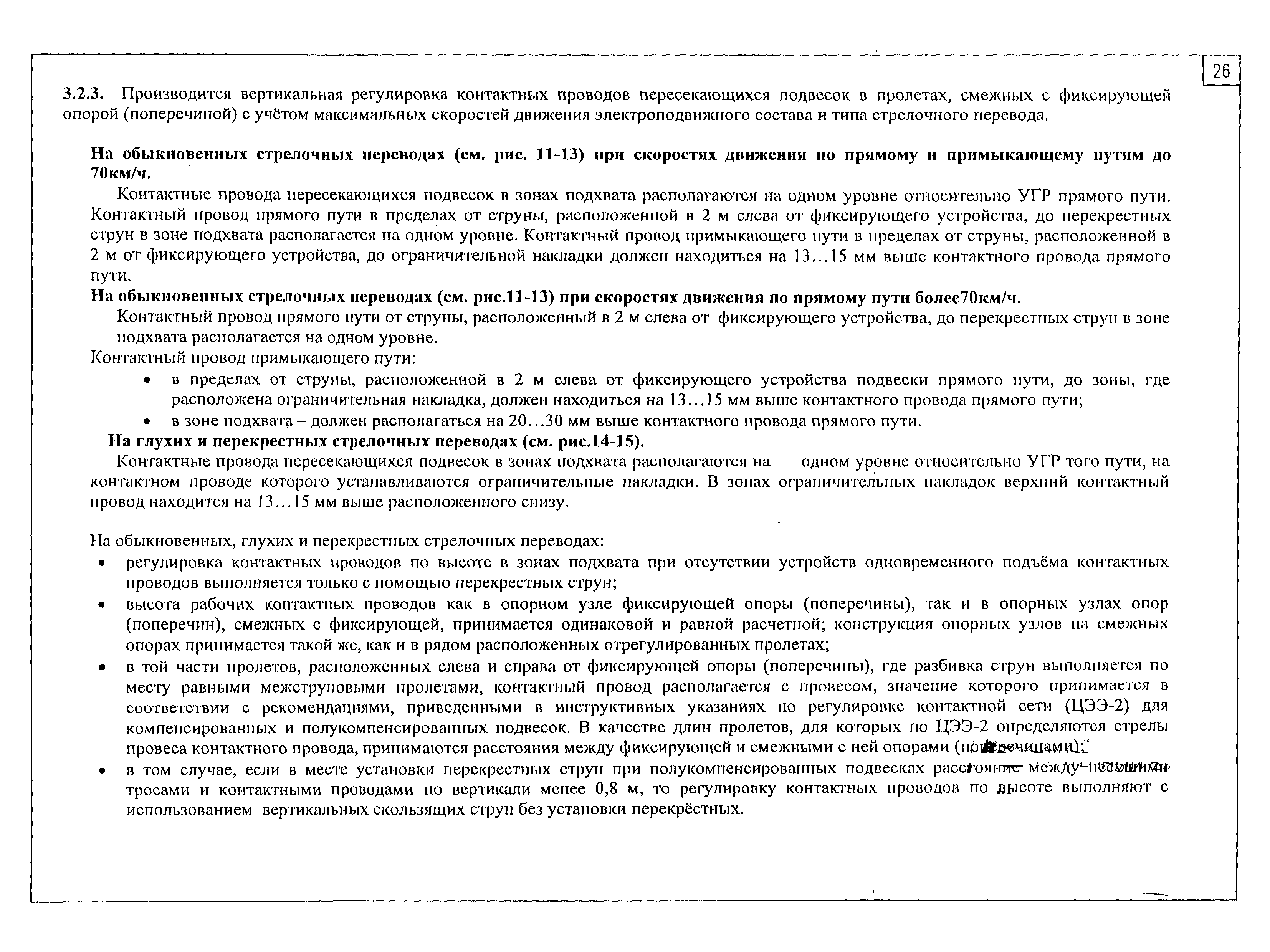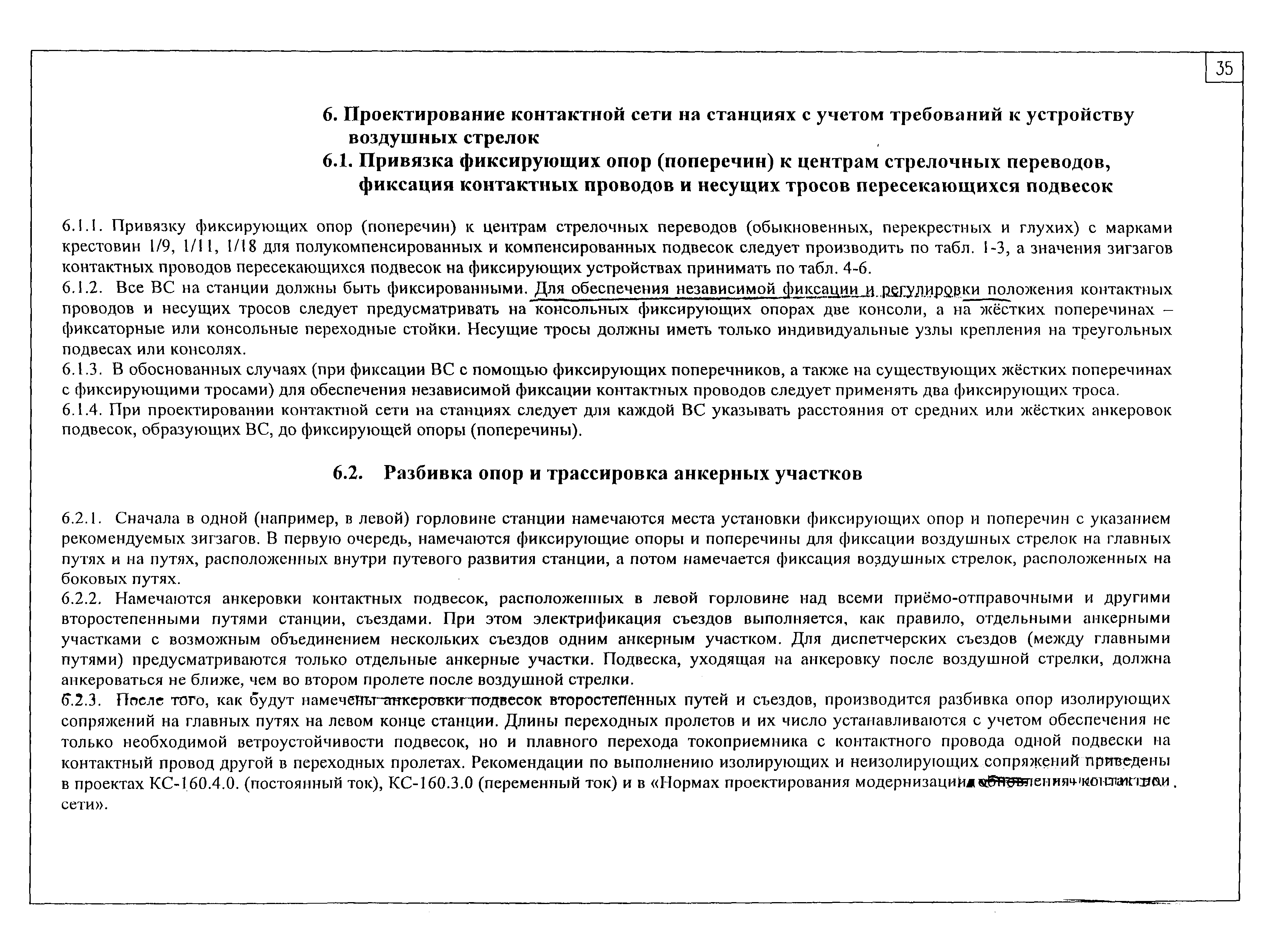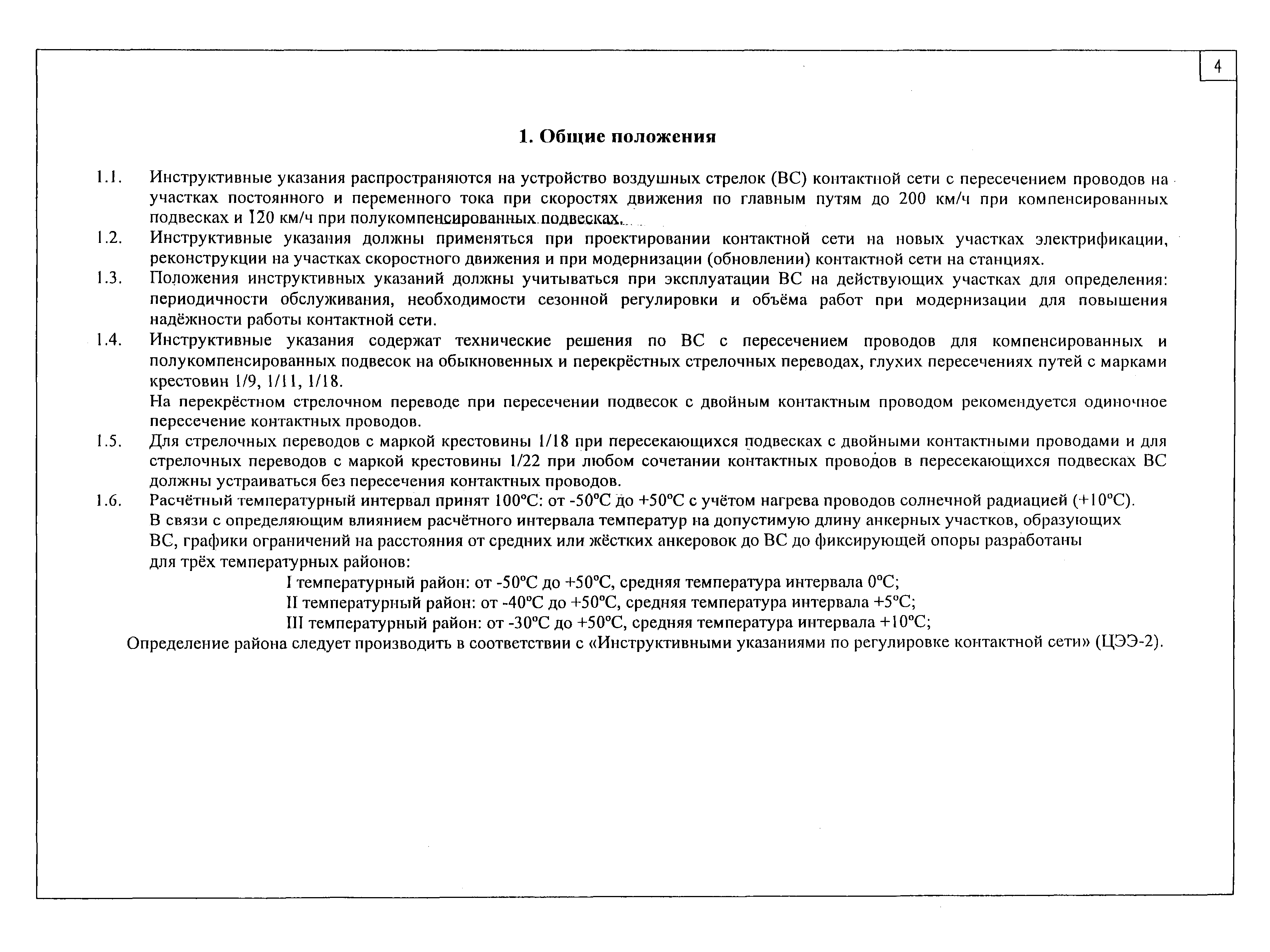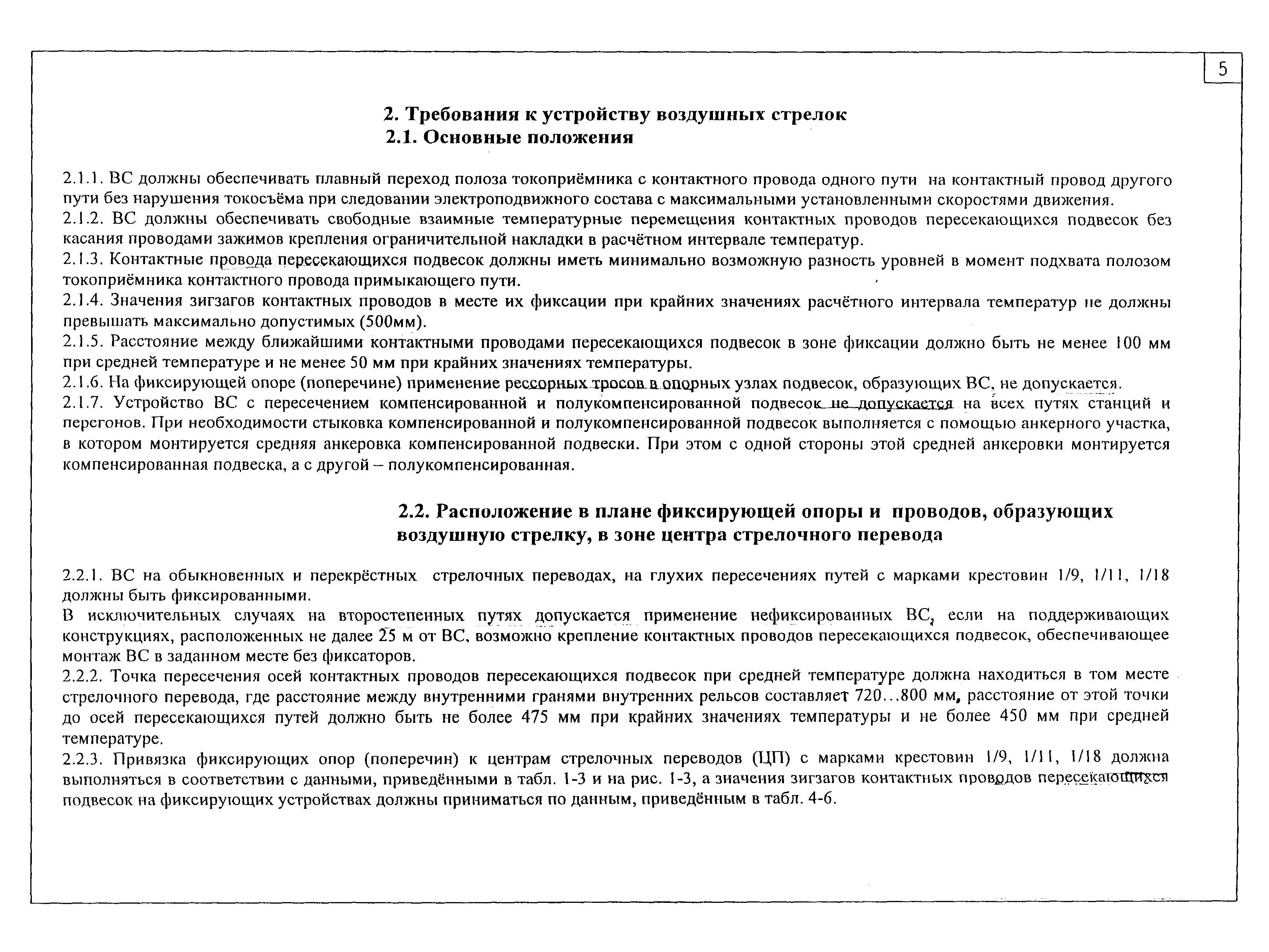 Инструктивные указания по монтажу, регулировке и проектированию воздушных стрелок| Статус: | не определен законодательством | | Название рус.: | Инструктивные указания по монтажу, регулировке и проектированию воздушных стрелок | | Дата добавления в базу: | 01.09.2013 | | Дата актуализации: | 01.01.2021 | | Дата введения: | 01.01.2007 | | Оглавление: | 1. Общие положения 2. Требования к устройству воздушных стрелок 2.1. Основные положения 2.2. Расположение в плане фиксирующей опоры и проводов, образующих воздушную стрелку, в зоне центра стрелочного перевода 2.3. Обеспечение свободного перемещения пересекающихся контактных проводов в расчетном интервале температур 2.4. Расположение контактных проводов и несущих тросов в зоне подхвата, выравнивание жесткостей пересекающихся подвесок 2.5. Схемы расстановки вертикальных и перекрестных струн, ограничителей подъема контактных проводов и электрических соединителей в зоне воздушных стрелок 3. Монтаж и регулировка воздушных 3.1. Первый этап 3.2. Второй этап 4. Рекомендации по эксплуатации и модернизации воздушных стрелок до реконструкции контактной сети на действующих участках 5. Техника безопасности 6. Проектирование контактной сети на станциях с учетом требований к устройству воздушных стрелок 6.1. Привязка фиксирующих опор (поперечин) к центрам стрелочных переводов, фиксация контактных проводов и несущих тросов 6.2. Разбивка опор и трассировка анкерных участков Приложения. Общие сведения, условные обозначения и сокращения Приложения П1.1.(П1.1.1-П1.1.9). Полукомпенсированная контактная подвеска. Графики ограничений расстояний от средних или жестких анкеровок до фиксирующей опоры. I температурный район Приложения П1.2.(П1.2.1-П1.2.9). Полукомпенсированная контактная подвеска. Графики ограничений расстояний от средних или жестких анкеровок до фиксирующей опоры. II температурный район Приложения П1.3.(П1.3.1-П1.3.9). Полукомпенсированная контактная подвеска. Графики ограничений расстояний от средних или жестких анкеровок до фиксирующей опоры. III температурный район Приложения П2.1.(П2.1.1-П2.1.9). Компенсированная контактная подвеска. Графики ограничения расстояний от средних или жестких анкеровок до фиксирующей опоры. I температурный район Приложения П2.2.(П2.2.1-П2.2.9). Компенсированная контактная подвеска. Графики ограничений расстояний от средних или жестких анкеровок до фиксирующей опоры. II температурный район Приложения П2.3.(П2.3.1-П2.3.9). Компенсированная контактная подвеска. Графики ограничений расстояний от средних или жестких анкеровок до фиксирующей опоры. III температурный район Приложение ПЗ. Условный план разбивки опор и анкерных участков на станции. Полукомпенсированная контактная подвеска (постоянный ток 3 кВ) | | Разработан: | Универсал-контактные сети