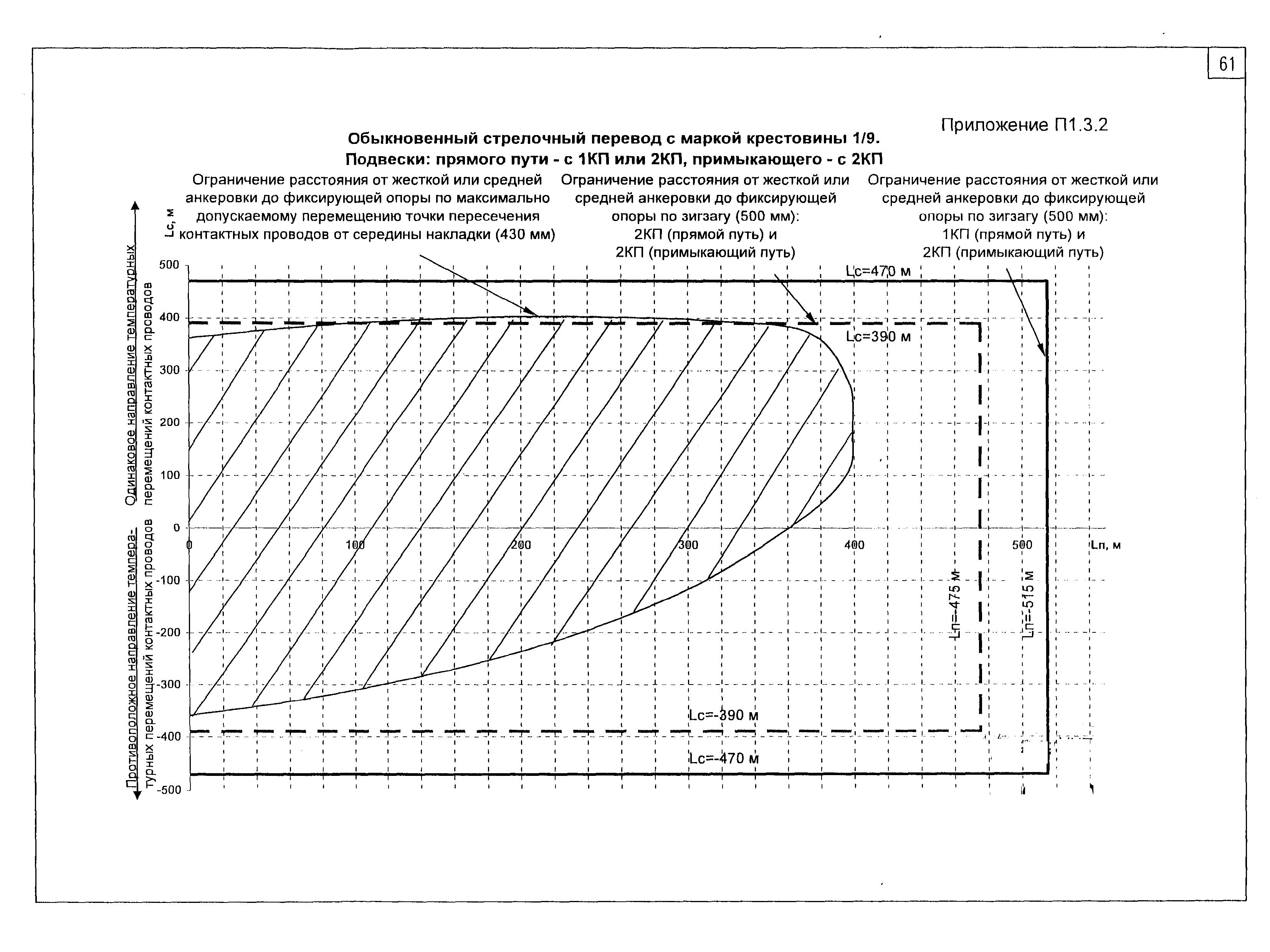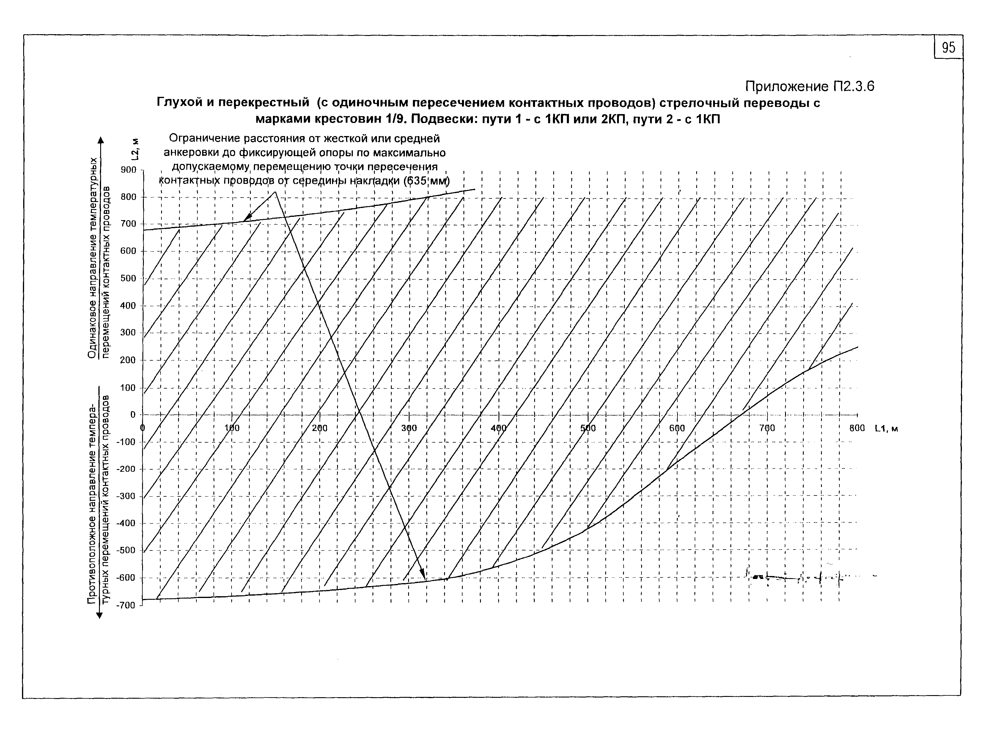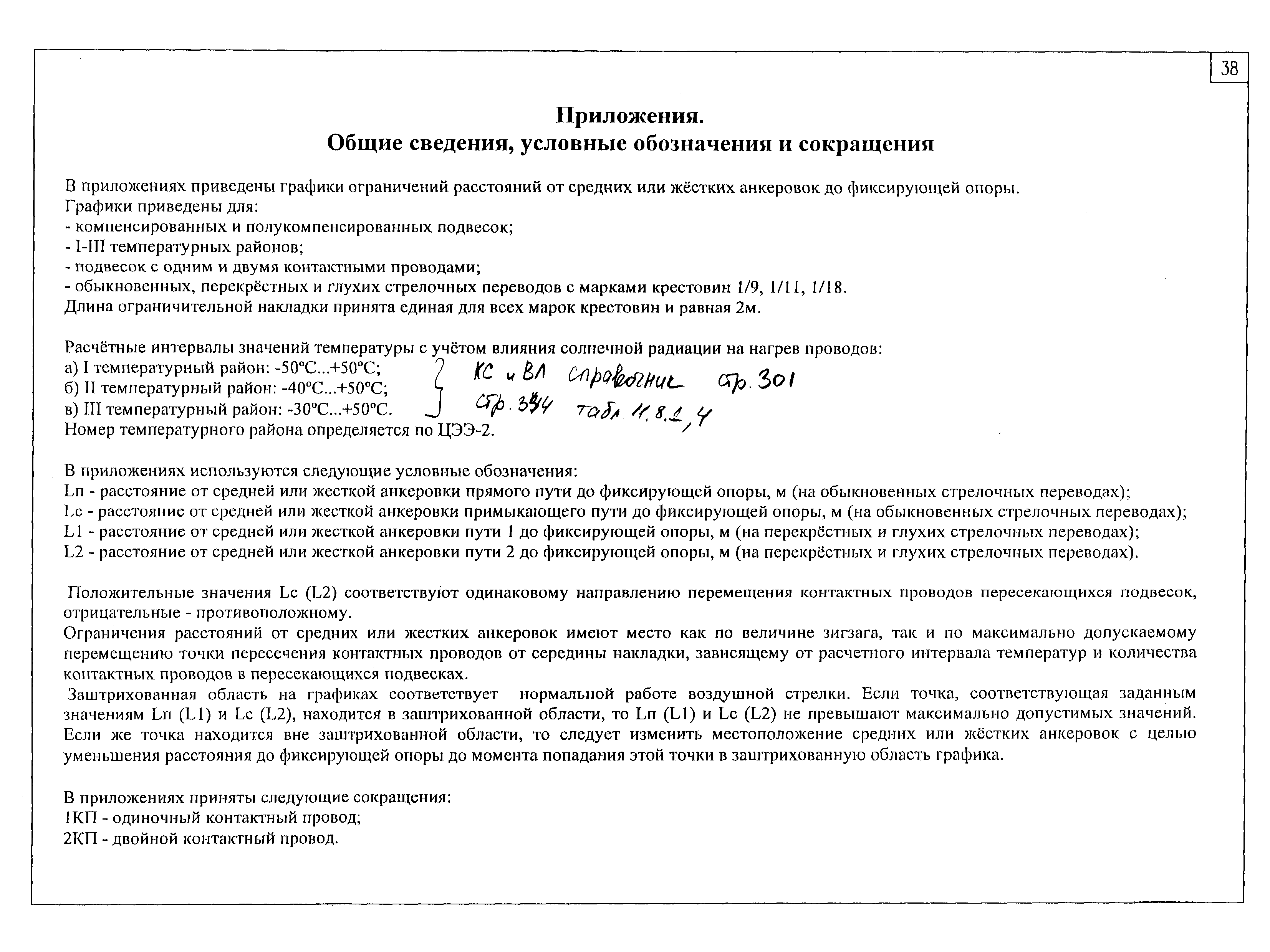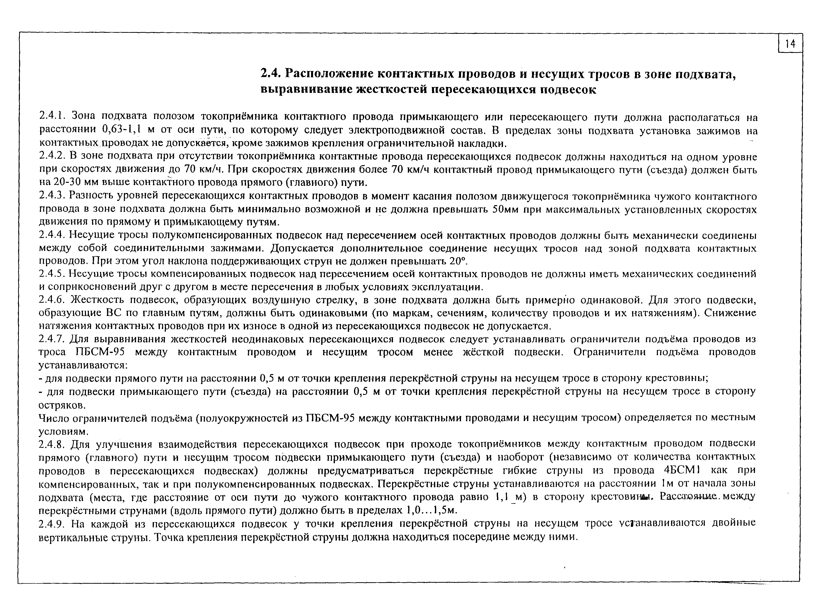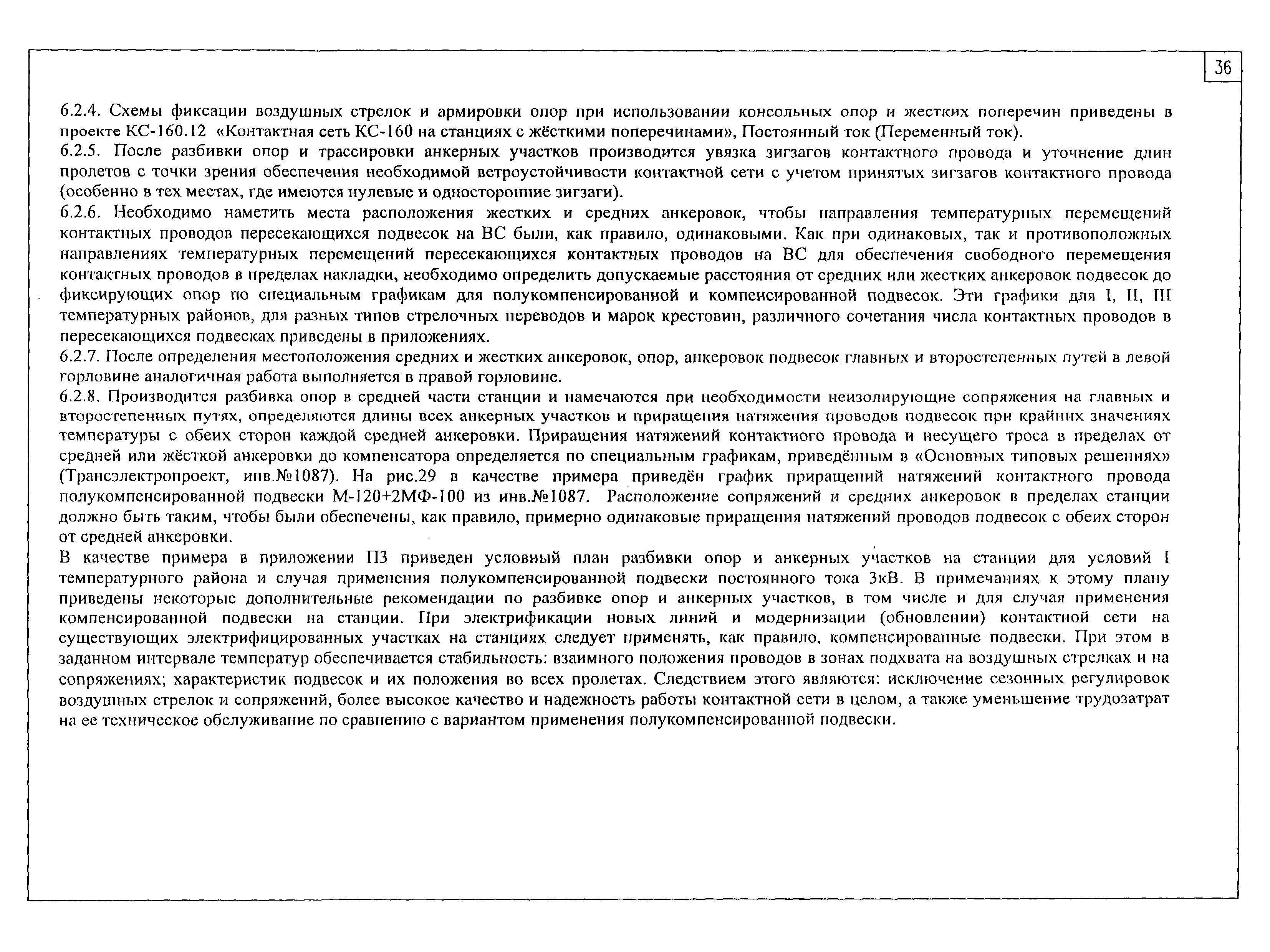 Инструктивные указания по монтажу, регулировке и проектированию воздушных стрелок| Статус: | не определен законодательством | | Название рус.: | Инструктивные указания по монтажу, регулировке и проектированию воздушных стрелок | | Дата добавления в базу: | 01.09.2013 | | Дата актуализации: | 01.01.2021 | | Дата введения: | 01.01.2007 | | Оглавление: | 1. Общие положения 2. Требования к устройству воздушных стрелок 2.1. Основные положения 2.2. Расположение в плане фиксирующей опоры и проводов, образующих воздушную стрелку, в зоне центра стрелочного перевода 2.3. Обеспечение свободного перемещения пересекающихся контактных проводов в расчетном интервале температур 2.4. Расположение контактных проводов и несущих тросов в зоне подхвата, выравнивание жесткостей пересекающихся подвесок 2.5. Схемы расстановки вертикальных и перекрестных струн, ограничителей подъема контактных проводов и электрических соединителей в зоне воздушных стрелок 3. Монтаж и регулировка воздушных 3.1. Первый этап 3.2. Второй этап 4. Рекомендации по эксплуатации и модернизации воздушных стрелок до реконструкции контактной сети на действующих участках 5. Техника безопасности 6. Проектирование контактной сети на станциях с учетом требований к устройству воздушных стрелок 6.1. Привязка фиксирующих опор (поперечин) к центрам стрелочных переводов, фиксация контактных проводов и несущих тросов 6.2. Разбивка опор и трассировка анкерных участков Приложения. Общие сведения, условные обозначения и сокращения Приложения П1.1.(П1.1.1-П1.1.9). Полукомпенсированная контактная подвеска. Графики ограничений расстояний от средних или жестких анкеровок до фиксирующей опоры. I температурный район Приложения П1.2.(П1.2.1-П1.2.9). Полукомпенсированная контактная подвеска. Графики ограничений расстояний от средних или жестких анкеровок до фиксирующей опоры. II температурный район Приложения П1.3.(П1.3.1-П1.3.9). Полукомпенсированная контактная подвеска. Графики ограничений расстояний от средних или жестких анкеровок до фиксирующей опоры. III температурный район Приложения П2.1.(П2.1.1-П2.1.9). Компенсированная контактная подвеска. Графики ограничения расстояний от средних или жестких анкеровок до фиксирующей опоры. I температурный район Приложения П2.2.(П2.2.1-П2.2.9). Компенсированная контактная подвеска. Графики ограничений расстояний от средних или жестких анкеровок до фиксирующей опоры. II температурный район Приложения П2.3.(П2.3.1-П2.3.9). Компенсированная контактная подвеска. Графики ограничений расстояний от средних или жестких анкеровок до фиксирующей опоры. III температурный район Приложение ПЗ. Условный план разбивки опор и анкерных участков на станции. Полукомпенсированная контактная подвеска (постоянный ток 3 кВ) | | Разработан: | Универсал-контактные сети