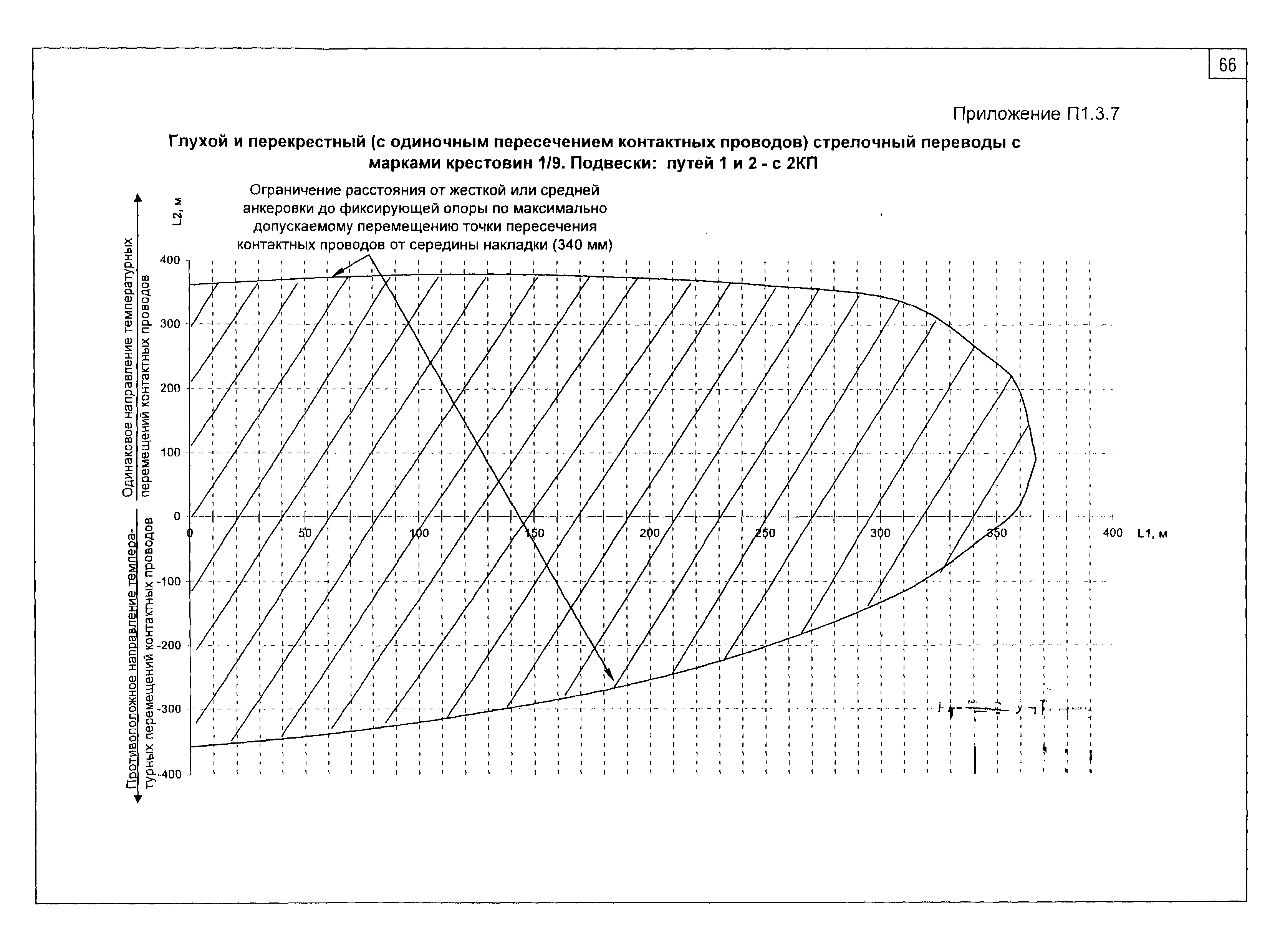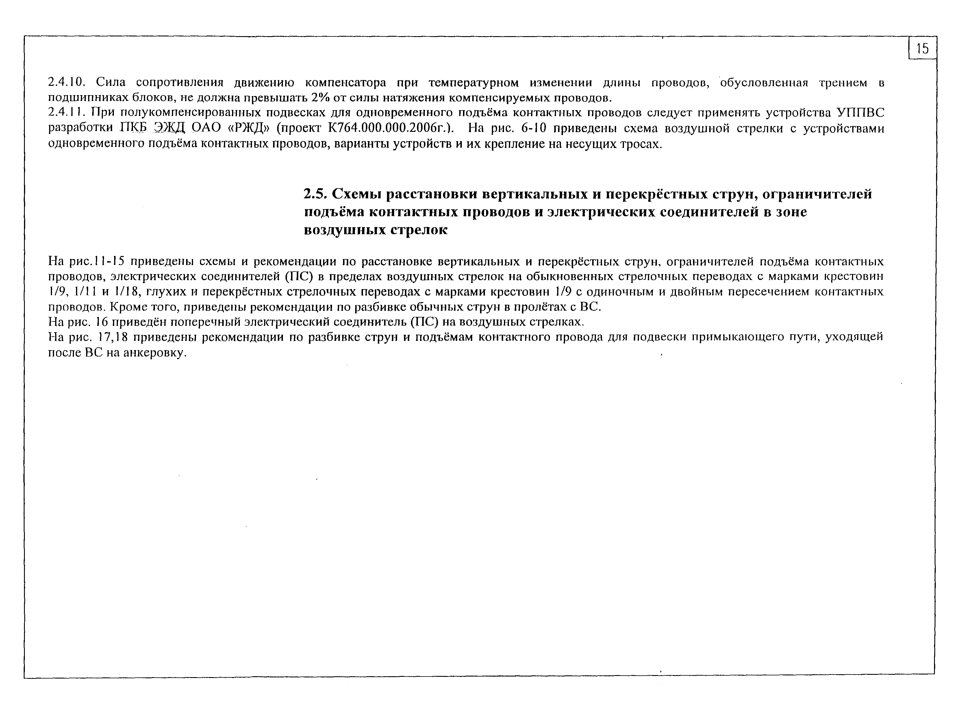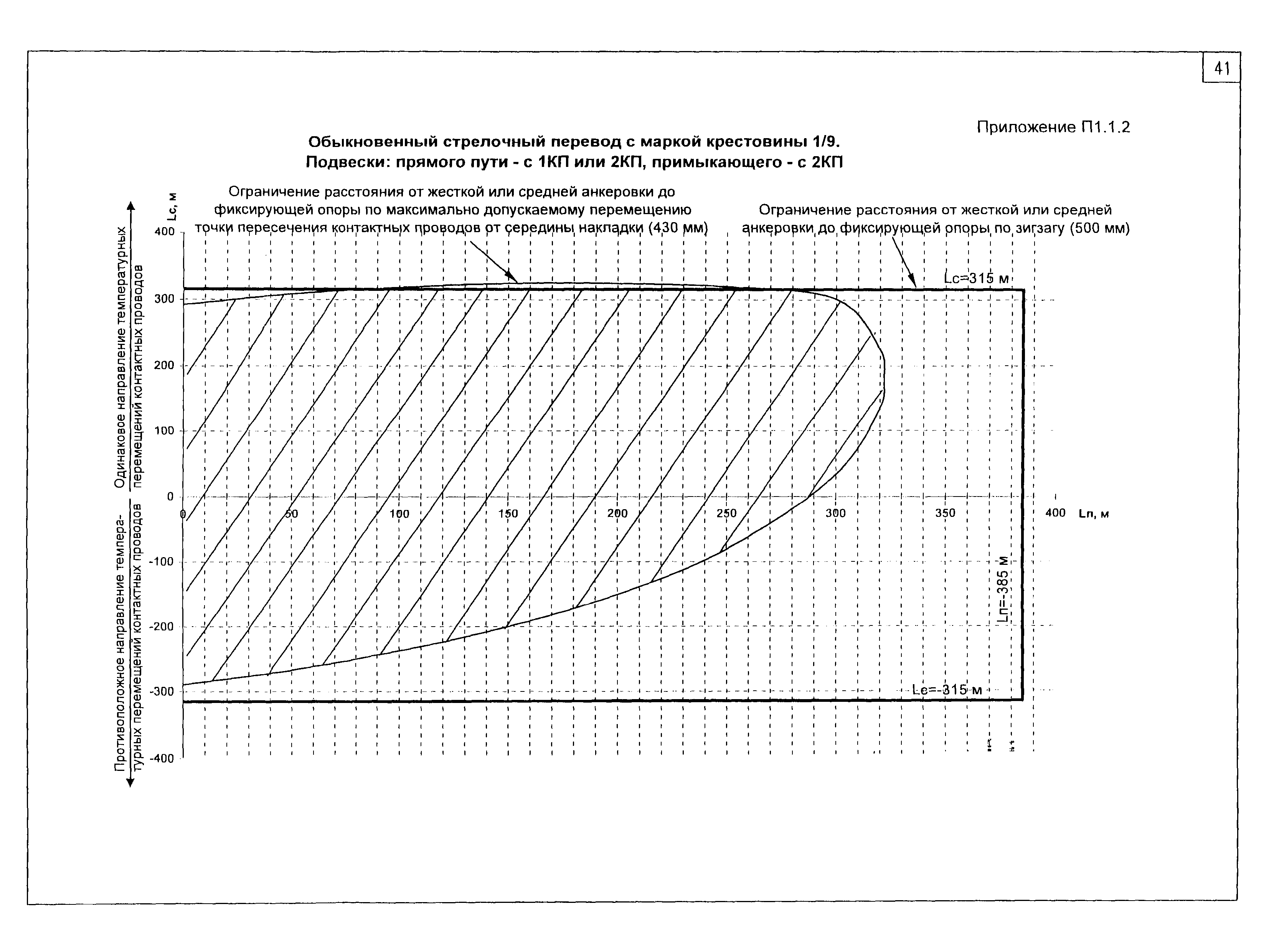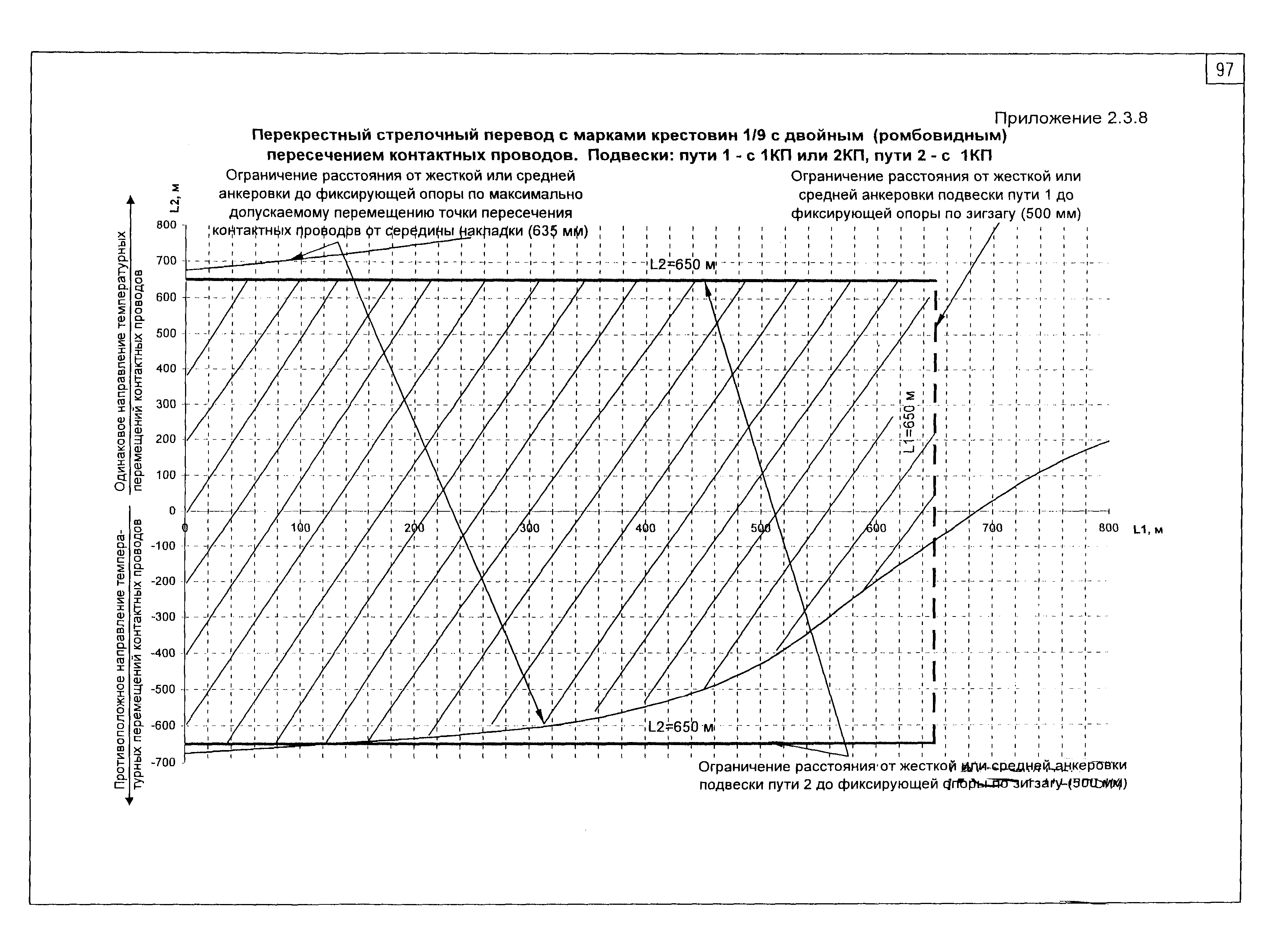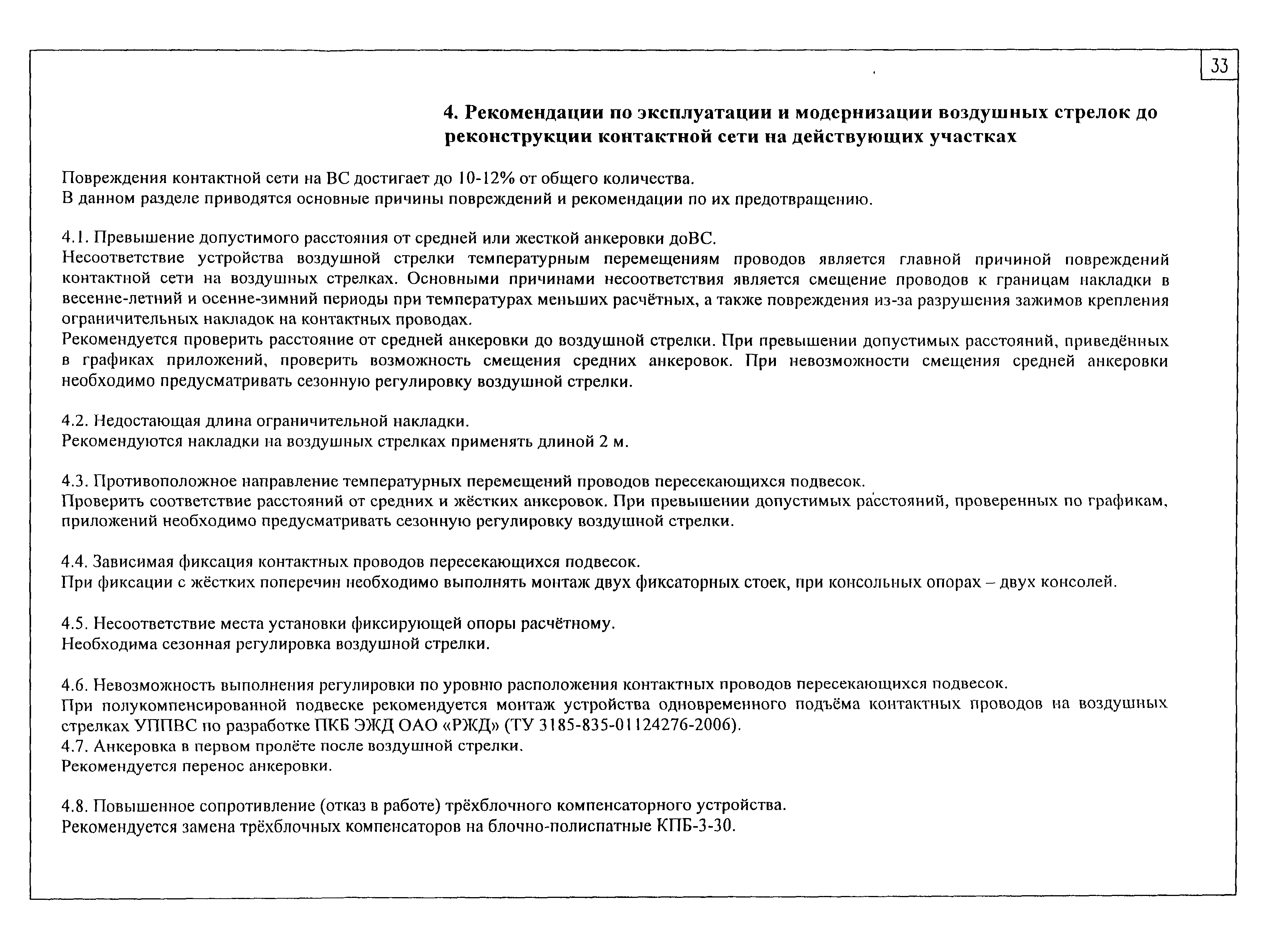 Инструктивные указания по монтажу, регулировке и проектированию воздушных стрелок| Статус: | не определен законодательством | | Название рус.: | Инструктивные указания по монтажу, регулировке и проектированию воздушных стрелок | | Дата добавления в базу: | 01.09.2013 | | Дата актуализации: | 01.01.2021 | | Дата введения: | 01.01.2007 | | Оглавление: | 1. Общие положения 2. Требования к устройству воздушных стрелок 2.1. Основные положения 2.2. Расположение в плане фиксирующей опоры и проводов, образующих воздушную стрелку, в зоне центра стрелочного перевода 2.3. Обеспечение свободного перемещения пересекающихся контактных проводов в расчетном интервале температур 2.4. Расположение контактных проводов и несущих тросов в зоне подхвата, выравнивание жесткостей пересекающихся подвесок 2.5. Схемы расстановки вертикальных и перекрестных струн, ограничителей подъема контактных проводов и электрических соединителей в зоне воздушных стрелок 3. Монтаж и регулировка воздушных 3.1. Первый этап 3.2. Второй этап 4. Рекомендации по эксплуатации и модернизации воздушных стрелок до реконструкции контактной сети на действующих участках 5. Техника безопасности 6. Проектирование контактной сети на станциях с учетом требований к устройству воздушных стрелок 6.1. Привязка фиксирующих опор (поперечин) к центрам стрелочных переводов, фиксация контактных проводов и несущих тросов 6.2. Разбивка опор и трассировка анкерных участков Приложения. Общие сведения, условные обозначения и сокращения Приложения П1.1.(П1.1.1-П1.1.9). Полукомпенсированная контактная подвеска. Графики ограничений расстояний от средних или жестких анкеровок до фиксирующей опоры. I температурный район Приложения П1.2.(П1.2.1-П1.2.9). Полукомпенсированная контактная подвеска. Графики ограничений расстояний от средних или жестких анкеровок до фиксирующей опоры. II температурный район Приложения П1.3.(П1.3.1-П1.3.9). Полукомпенсированная контактная подвеска. Графики ограничений расстояний от средних или жестких анкеровок до фиксирующей опоры. III температурный район Приложения П2.1.(П2.1.1-П2.1.9). Компенсированная контактная подвеска. Графики ограничения расстояний от средних или жестких анкеровок до фиксирующей опоры. I температурный район Приложения П2.2.(П2.2.1-П2.2.9). Компенсированная контактная подвеска. Графики ограничений расстояний от средних или жестких анкеровок до фиксирующей опоры. II температурный район Приложения П2.3.(П2.3.1-П2.3.9). Компенсированная контактная подвеска. Графики ограничений расстояний от средних или жестких анкеровок до фиксирующей опоры. III температурный район Приложение ПЗ. Условный план разбивки опор и анкерных участков на станции. Полукомпенсированная контактная подвеска (постоянный ток 3 кВ) | | Разработан: | Универсал-контактные сети