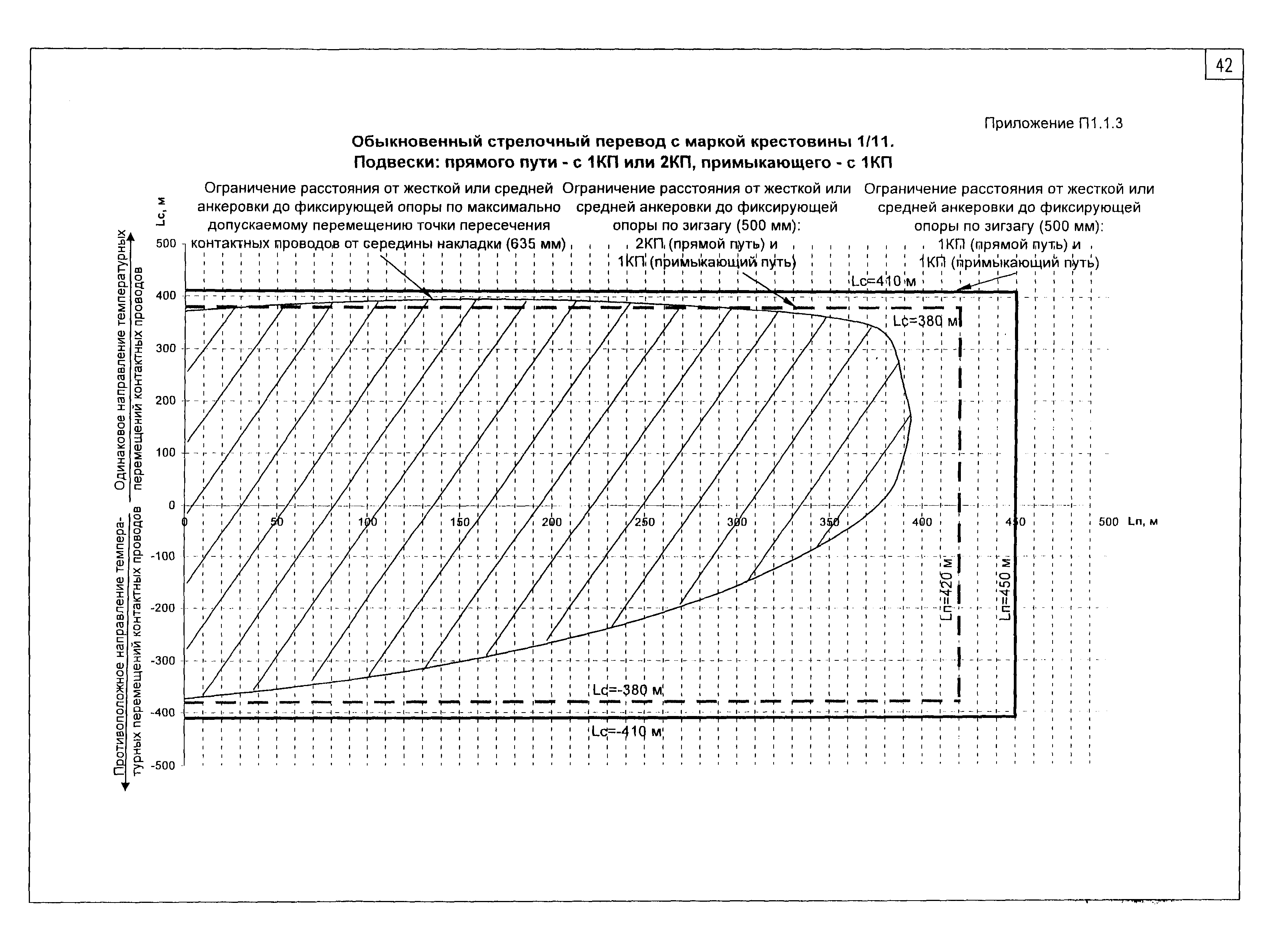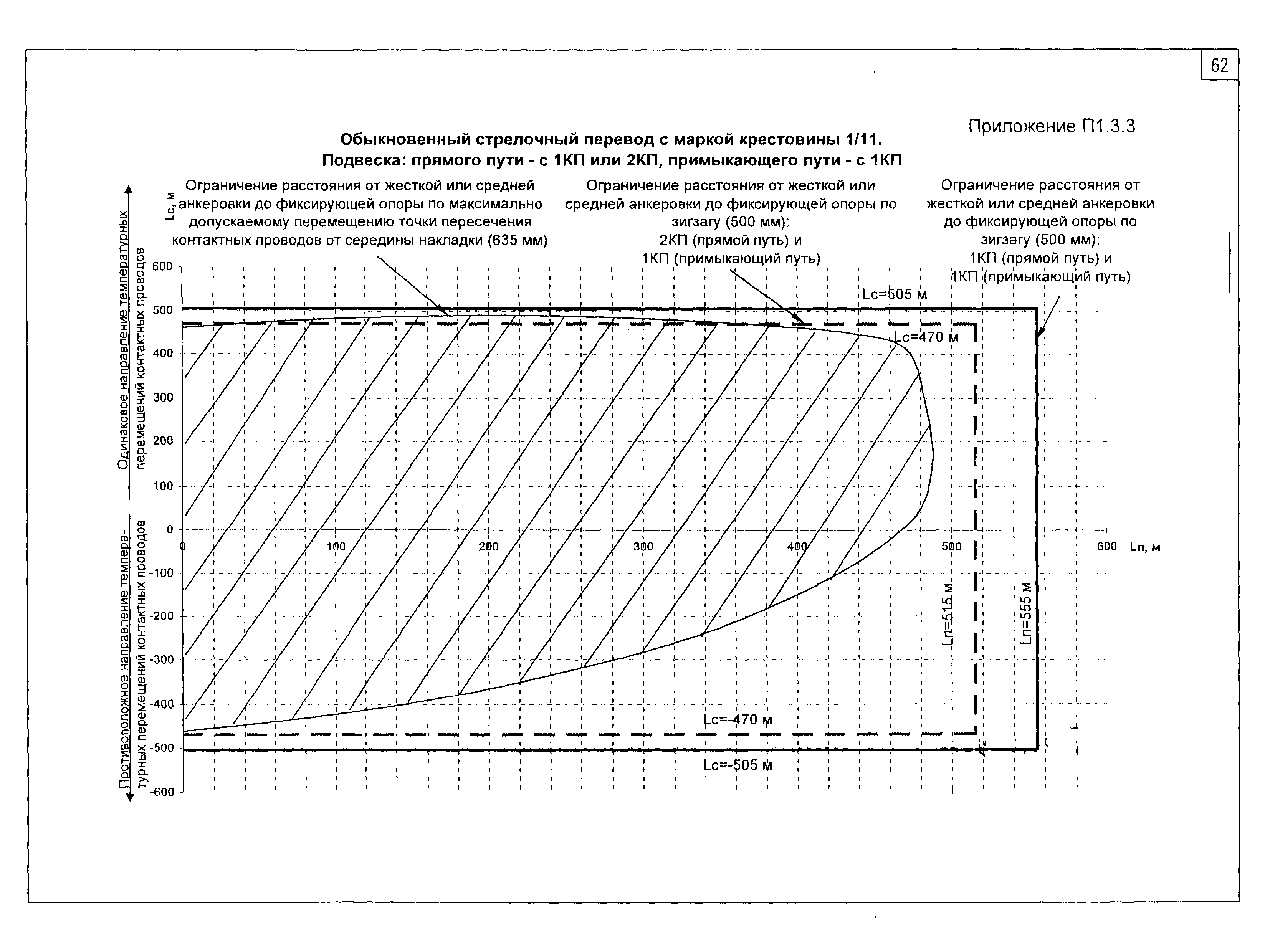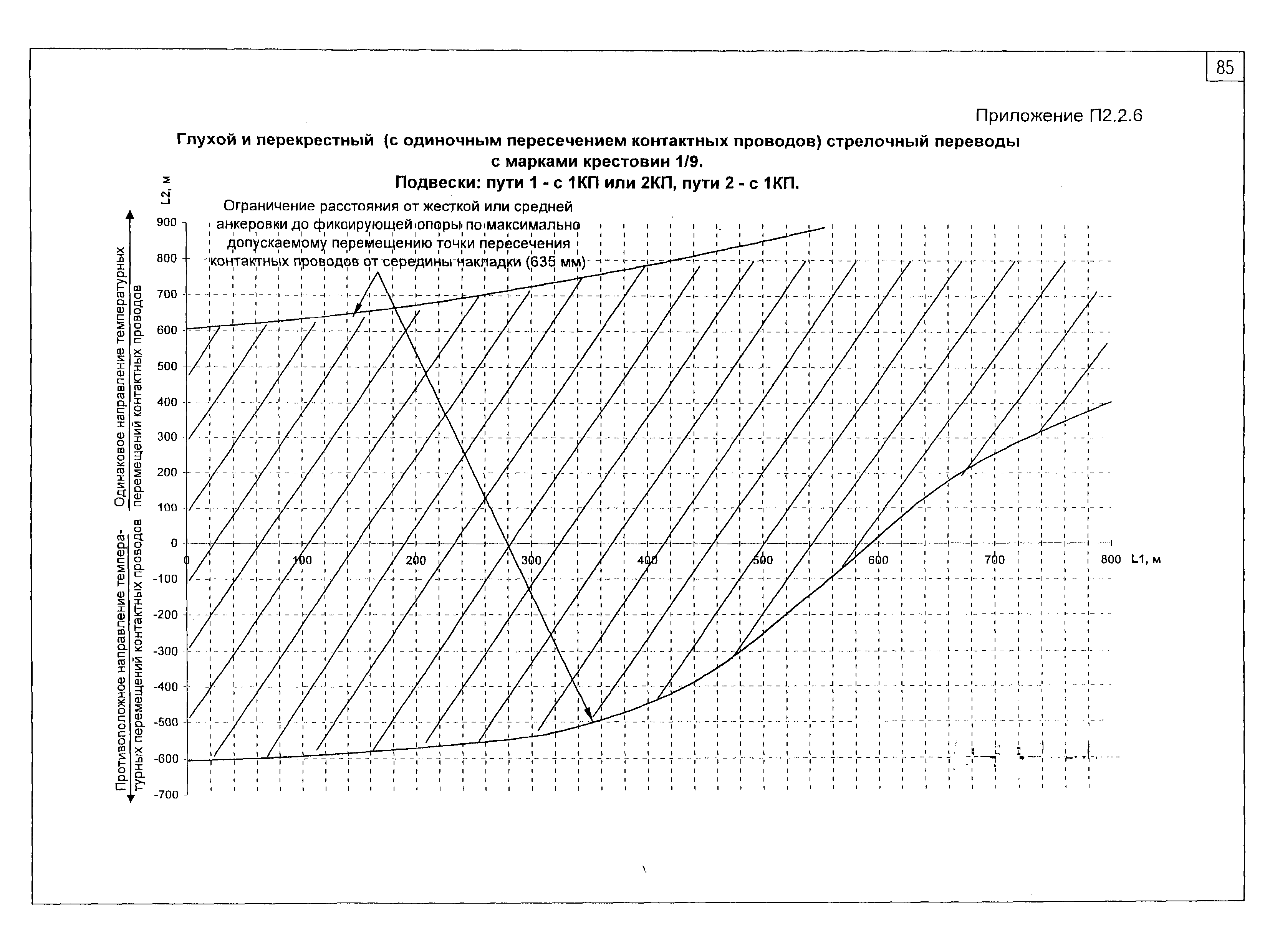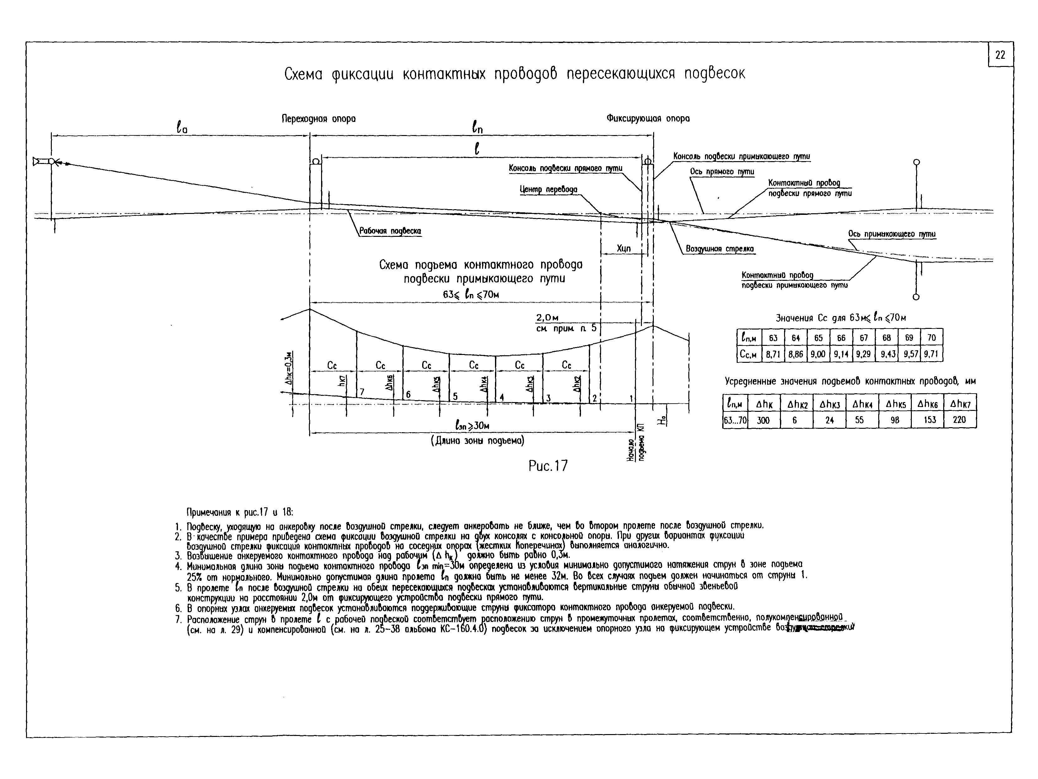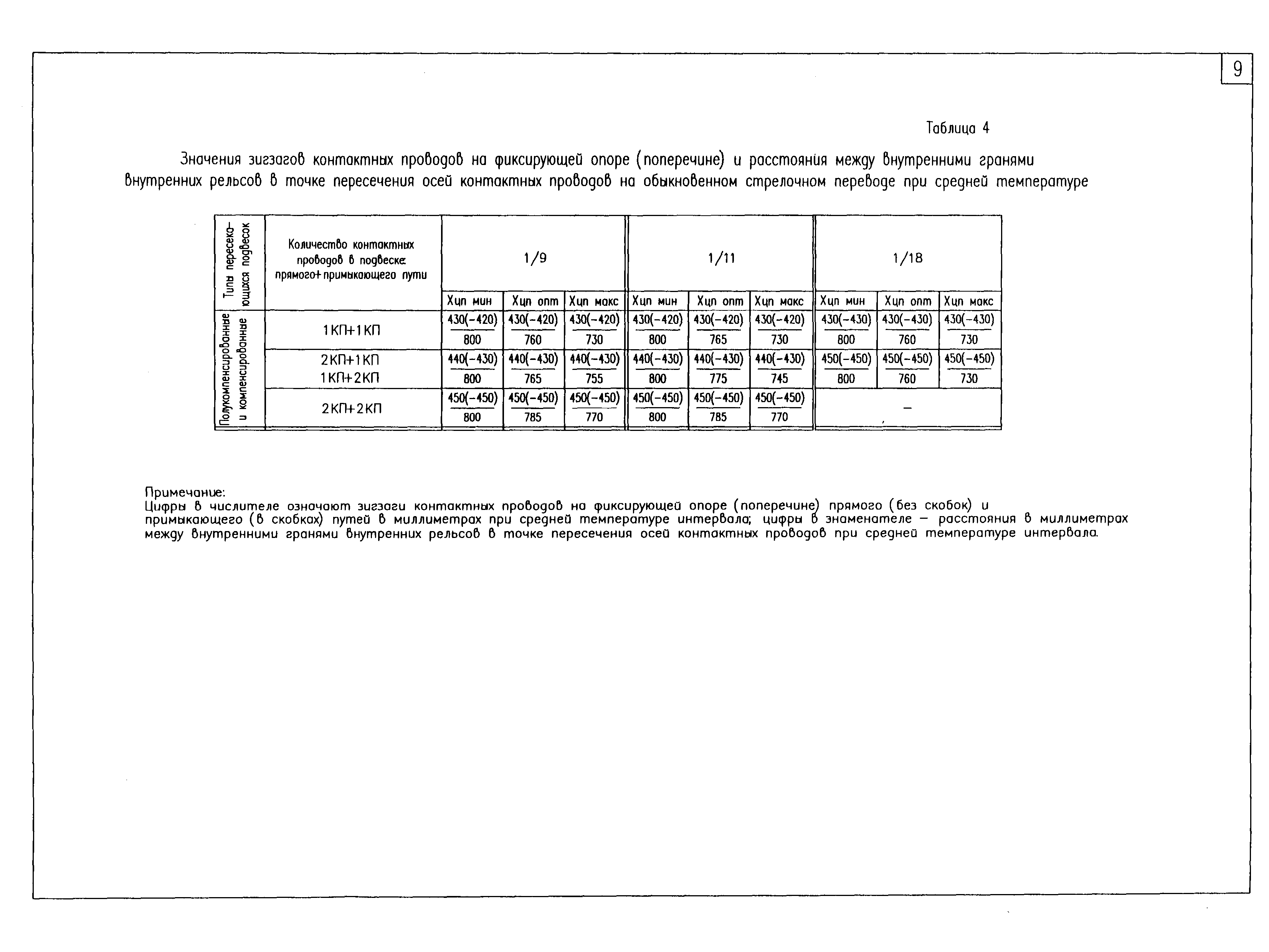 Инструктивные указания по монтажу, регулировке и проектированию воздушных стрелок| Статус: | не определен законодательством | | Название рус.: | Инструктивные указания по монтажу, регулировке и проектированию воздушных стрелок | | Дата добавления в базу: | 01.09.2013 | | Дата актуализации: | 01.01.2021 | | Дата введения: | 01.01.2007 | | Оглавление: | 1. Общие положения 2. Требования к устройству воздушных стрелок 2.1. Основные положения 2.2. Расположение в плане фиксирующей опоры и проводов, образующих воздушную стрелку, в зоне центра стрелочного перевода 2.3. Обеспечение свободного перемещения пересекающихся контактных проводов в расчетном интервале температур 2.4. Расположение контактных проводов и несущих тросов в зоне подхвата, выравнивание жесткостей пересекающихся подвесок 2.5. Схемы расстановки вертикальных и перекрестных струн, ограничителей подъема контактных проводов и электрических соединителей в зоне воздушных стрелок 3. Монтаж и регулировка воздушных 3.1. Первый этап 3.2. Второй этап 4. Рекомендации по эксплуатации и модернизации воздушных стрелок до реконструкции контактной сети на действующих участках 5. Техника безопасности 6. Проектирование контактной сети на станциях с учетом требований к устройству воздушных стрелок 6.1. Привязка фиксирующих опор (поперечин) к центрам стрелочных переводов, фиксация контактных проводов и несущих тросов 6.2. Разбивка опор и трассировка анкерных участков Приложения. Общие сведения, условные обозначения и сокращения Приложения П1.1.(П1.1.1-П1.1.9). Полукомпенсированная контактная подвеска. Графики ограничений расстояний от средних или жестких анкеровок до фиксирующей опоры. I температурный район Приложения П1.2.(П1.2.1-П1.2.9). Полукомпенсированная контактная подвеска. Графики ограничений расстояний от средних или жестких анкеровок до фиксирующей опоры. II температурный район Приложения П1.3.(П1.3.1-П1.3.9). Полукомпенсированная контактная подвеска. Графики ограничений расстояний от средних или жестких анкеровок до фиксирующей опоры. III температурный район Приложения П2.1.(П2.1.1-П2.1.9). Компенсированная контактная подвеска. Графики ограничения расстояний от средних или жестких анкеровок до фиксирующей опоры. I температурный район Приложения П2.2.(П2.2.1-П2.2.9). Компенсированная контактная подвеска. Графики ограничений расстояний от средних или жестких анкеровок до фиксирующей опоры. II температурный район Приложения П2.3.(П2.3.1-П2.3.9). Компенсированная контактная подвеска. Графики ограничений расстояний от средних или жестких анкеровок до фиксирующей опоры. III температурный район Приложение ПЗ. Условный план разбивки опор и анкерных участков на станции. Полукомпенсированная контактная подвеска (постоянный ток 3 кВ) | | Разработан: | Универсал-контактные сети