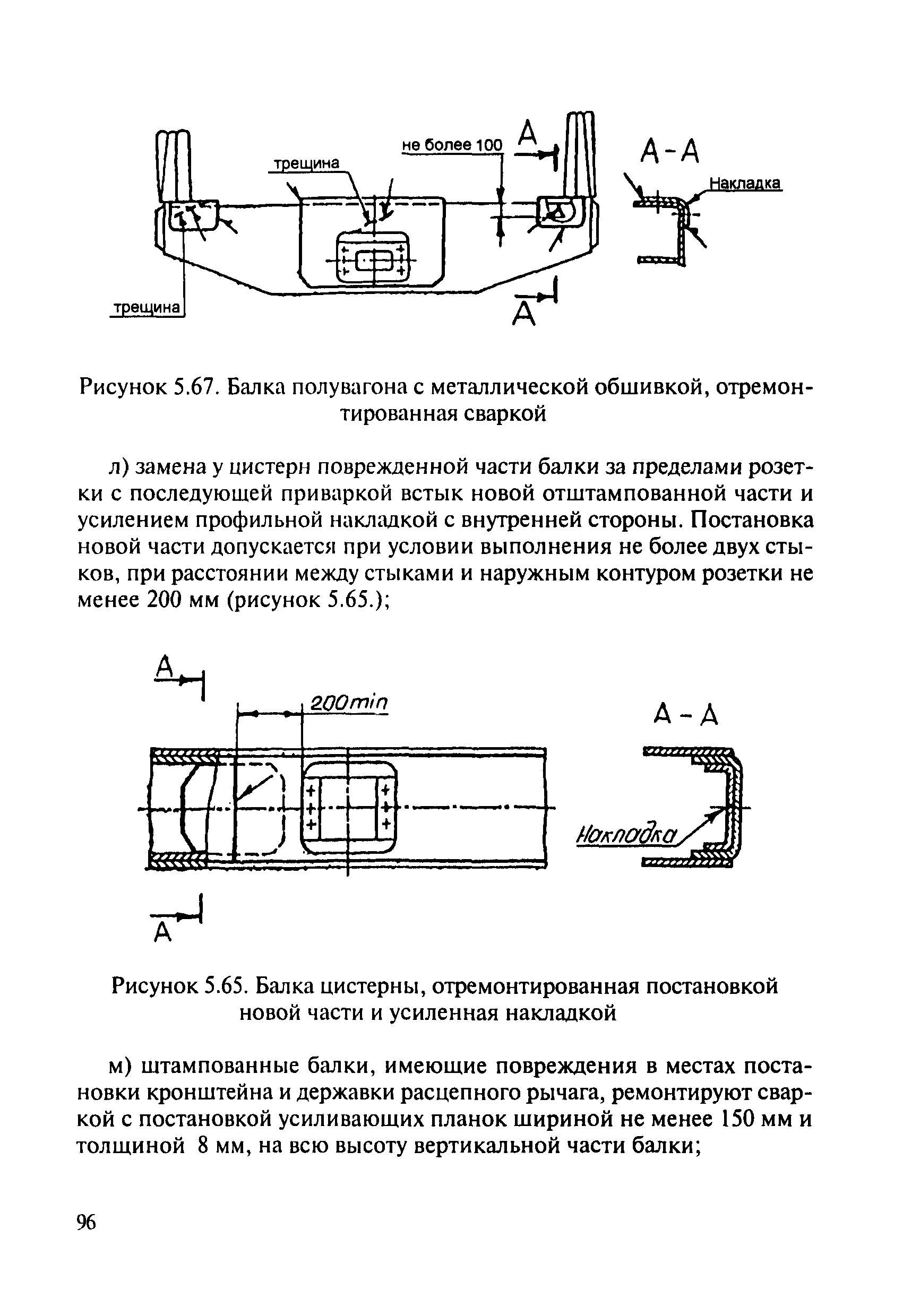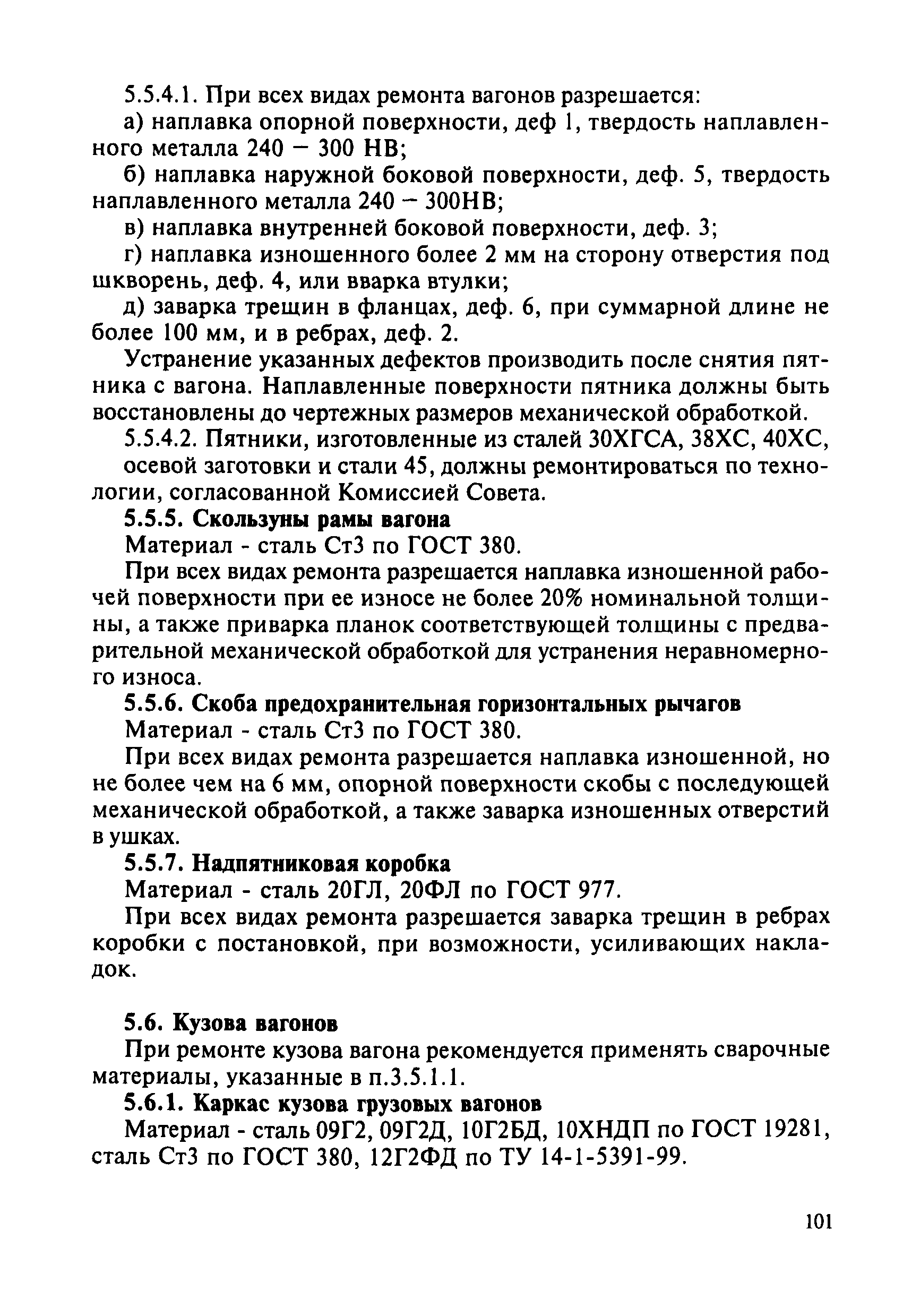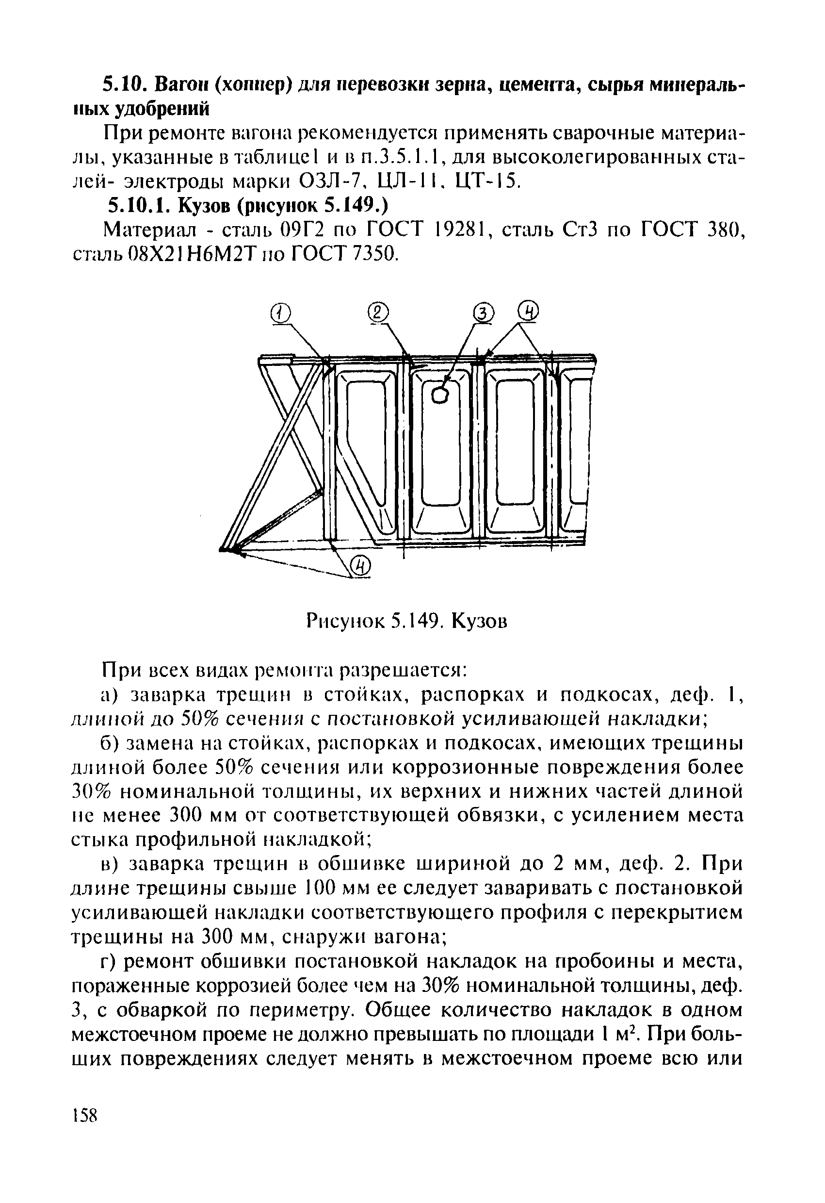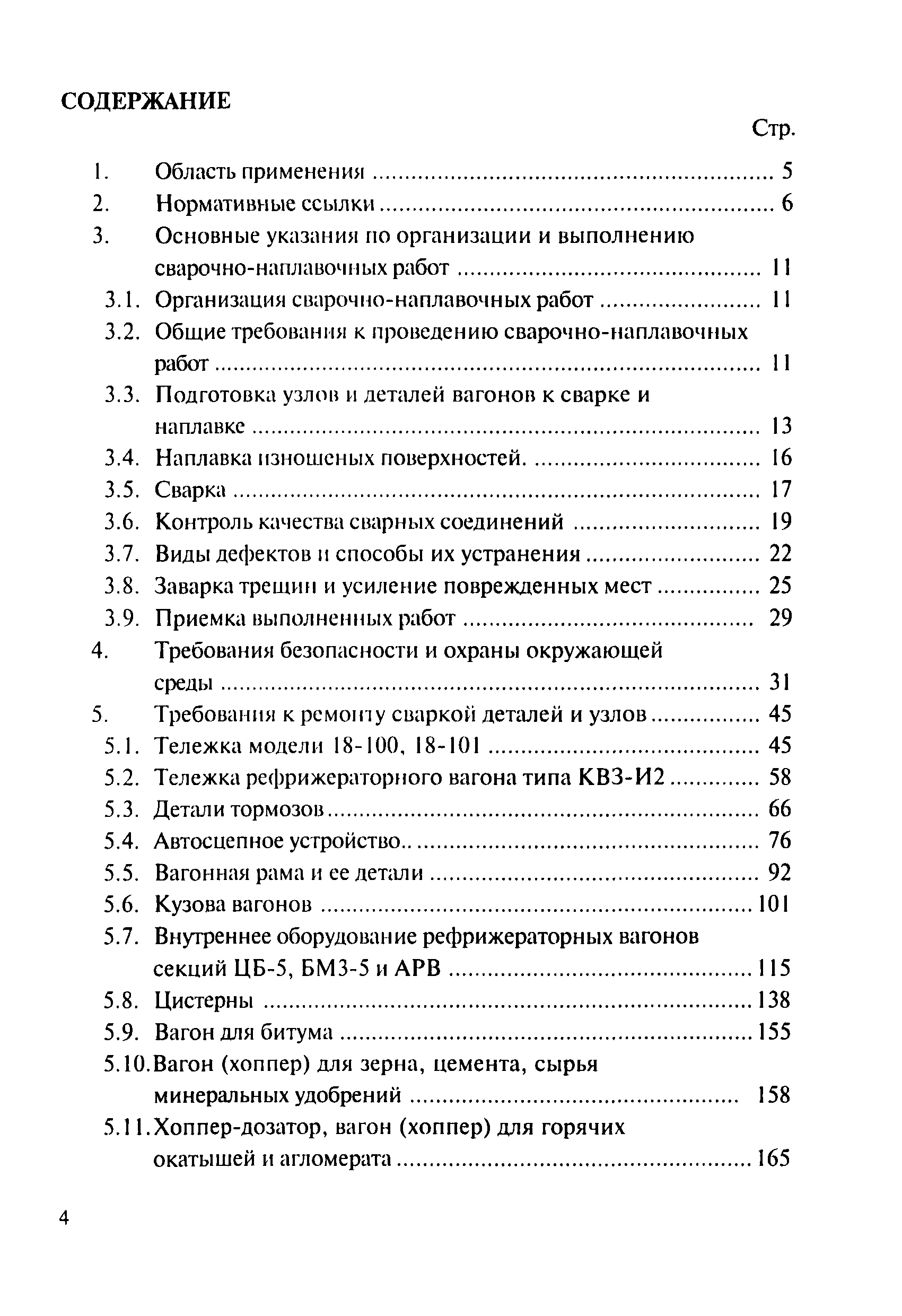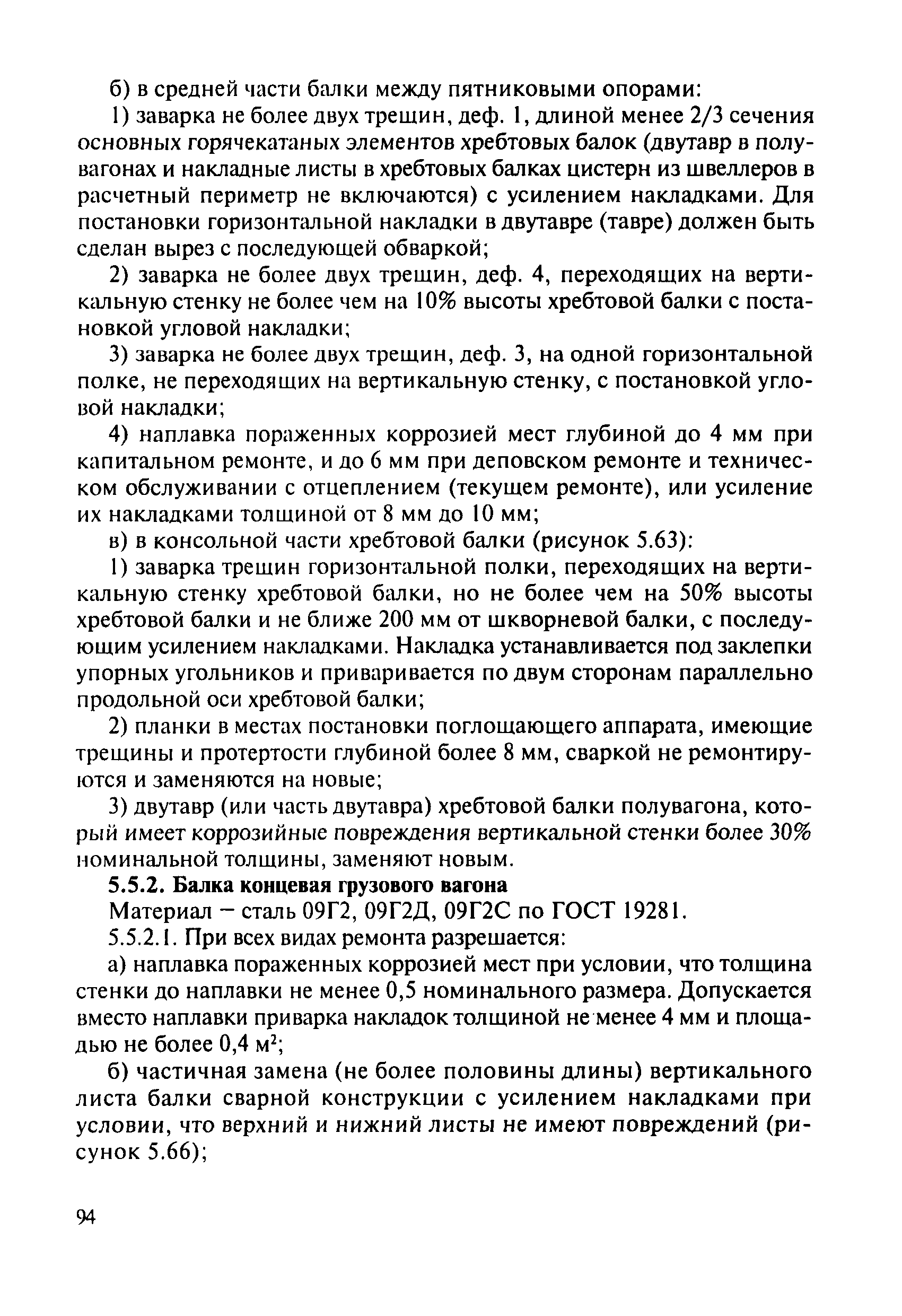 | Оглавление: | 1. Область применения 2. Нормативные ссылки 3. Основные указания по организации и выполнению сварочно-наплавочных работ 3.1 Организация сварочно-наплавочных работ 3.2 Общие требования к проведению сварочно-наплавочных работ 3.3 Подготовка узлов и деталей вагонов к сварке и наплавке 3.4 Наплавка изношенных поверхностей 3.5 Сварка 3.6 Контроль качества сварных соединений 3.7 Виды дефектов и способы их устранения 3.8 Заварка трещин и усиление поврежденных мест 3.9 Приемка выполненных работ 4. Требования безопасности и охраны окружающей среды 5. Требования к ремонту сваркой деталей и узлов 5.1 Тележка модели 18-100, 18-101 5.2 Тележка рефрижераторного типа КВЗ-И2 5.3 Детали тормозов 5.4 Автосцепное устройство 5.5 Вагонная рама и ее детали 5.6 Кузова вагонов 5.7 Внутреннее оборудование рефрижераторных вагонов секций ЦБ-5, БМЗ-5 и АРВ 5.8 Цистерны 5.9 Вагон для битума 5.10 Вагон (хоппер) для зерна, цемента, сырья минеральных удобрений 5.11 Хоппер-дозатор, вагон (хоппер) для горячих окатышей и агломерата |