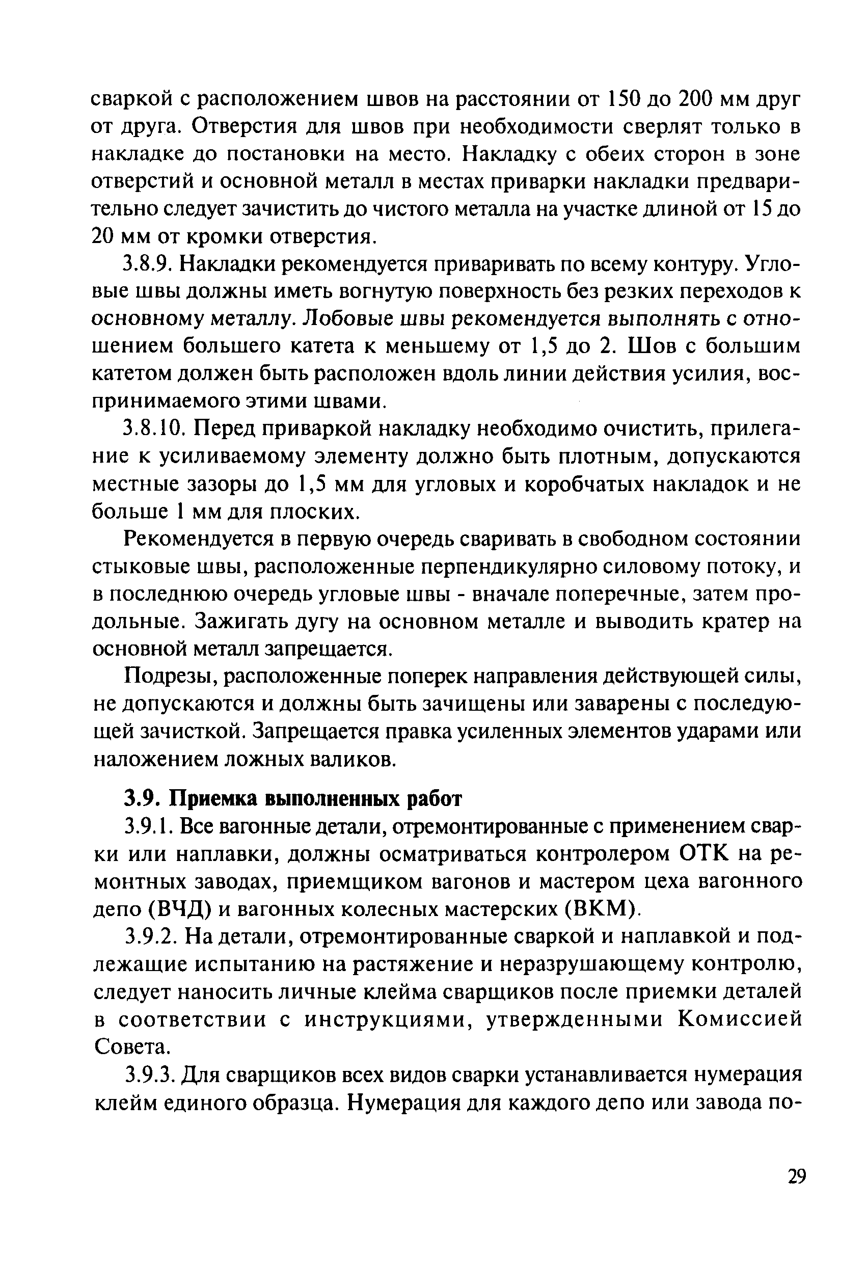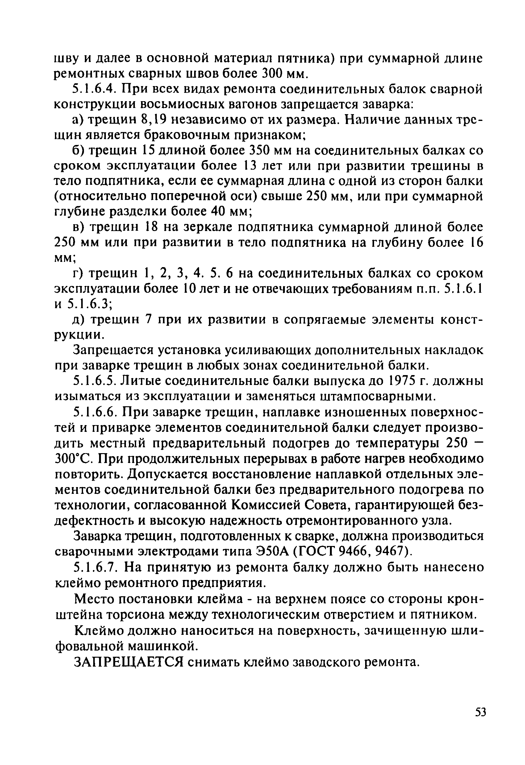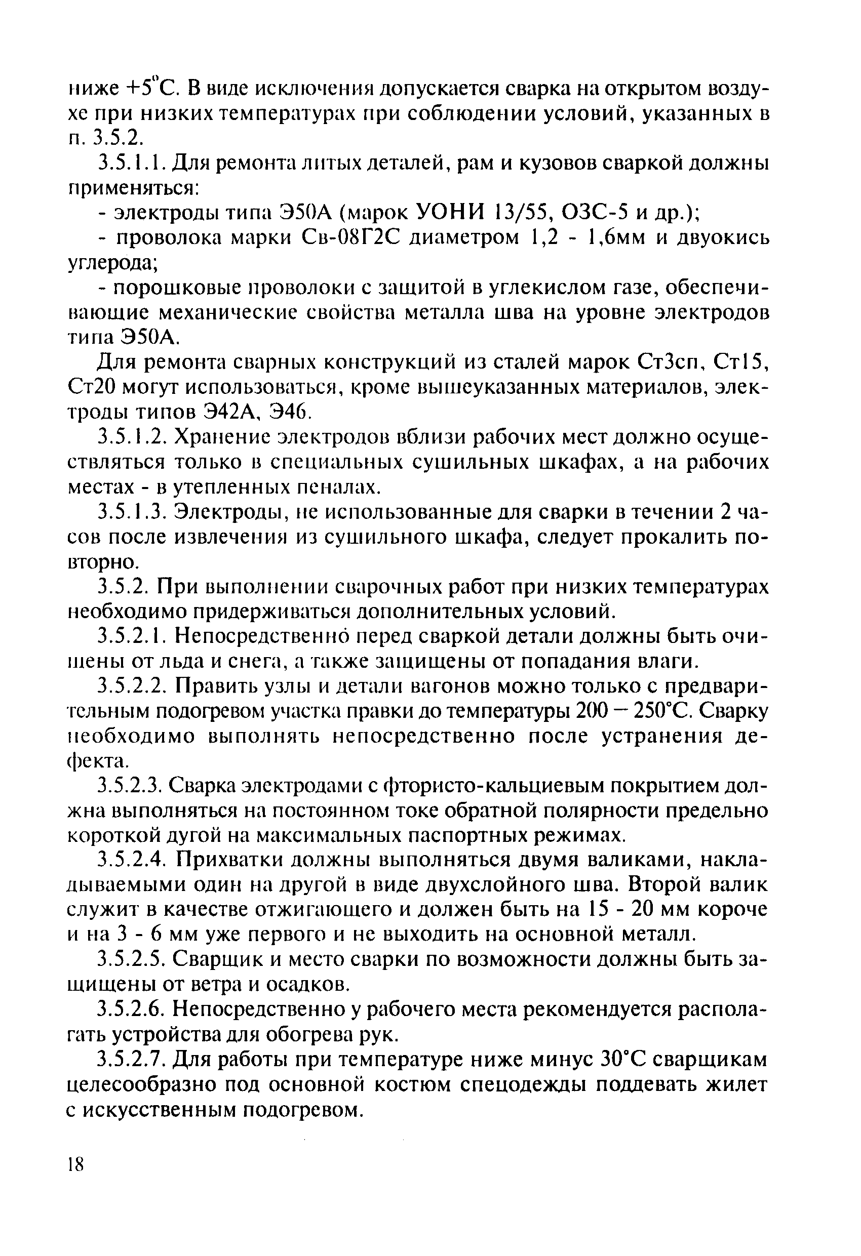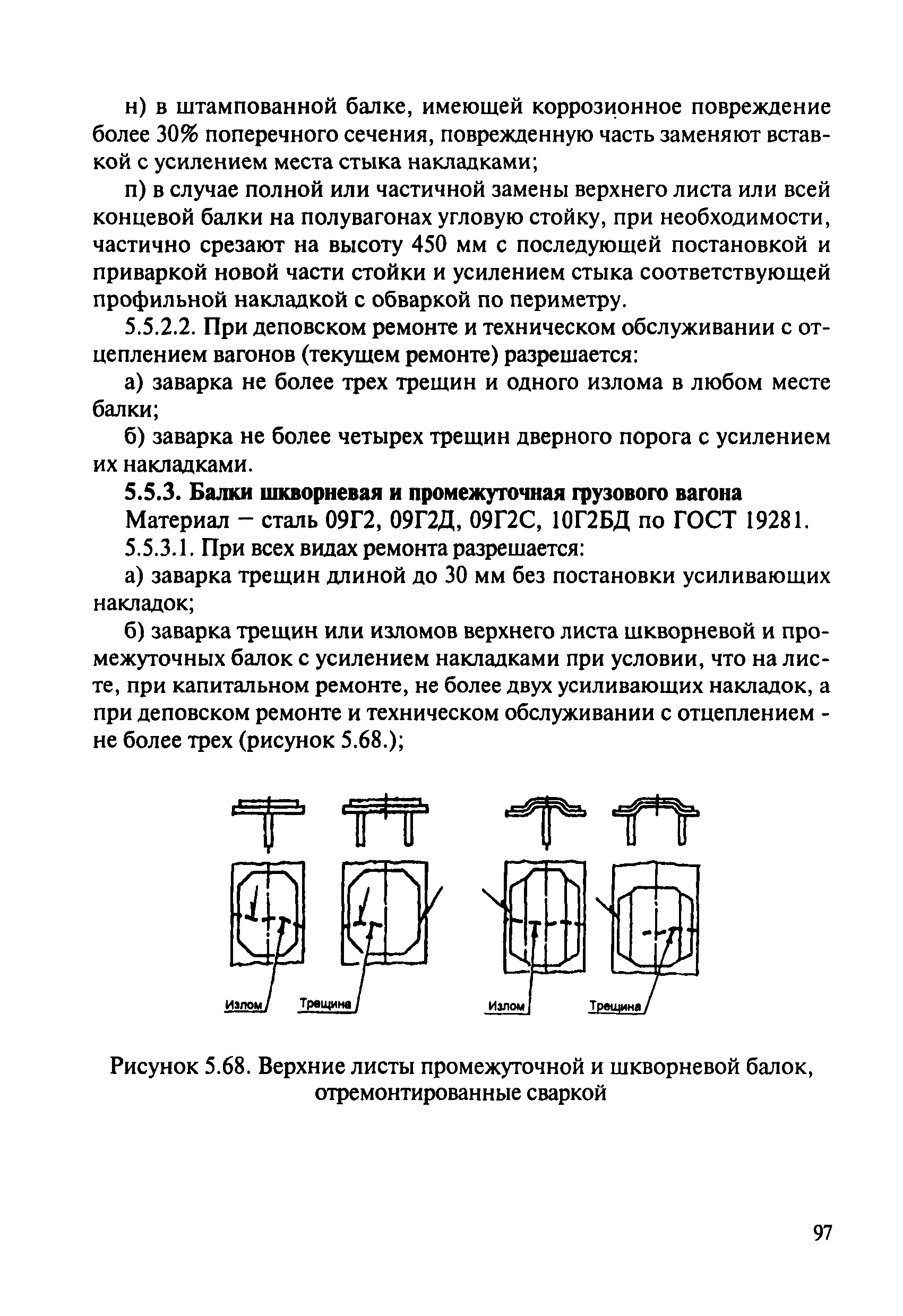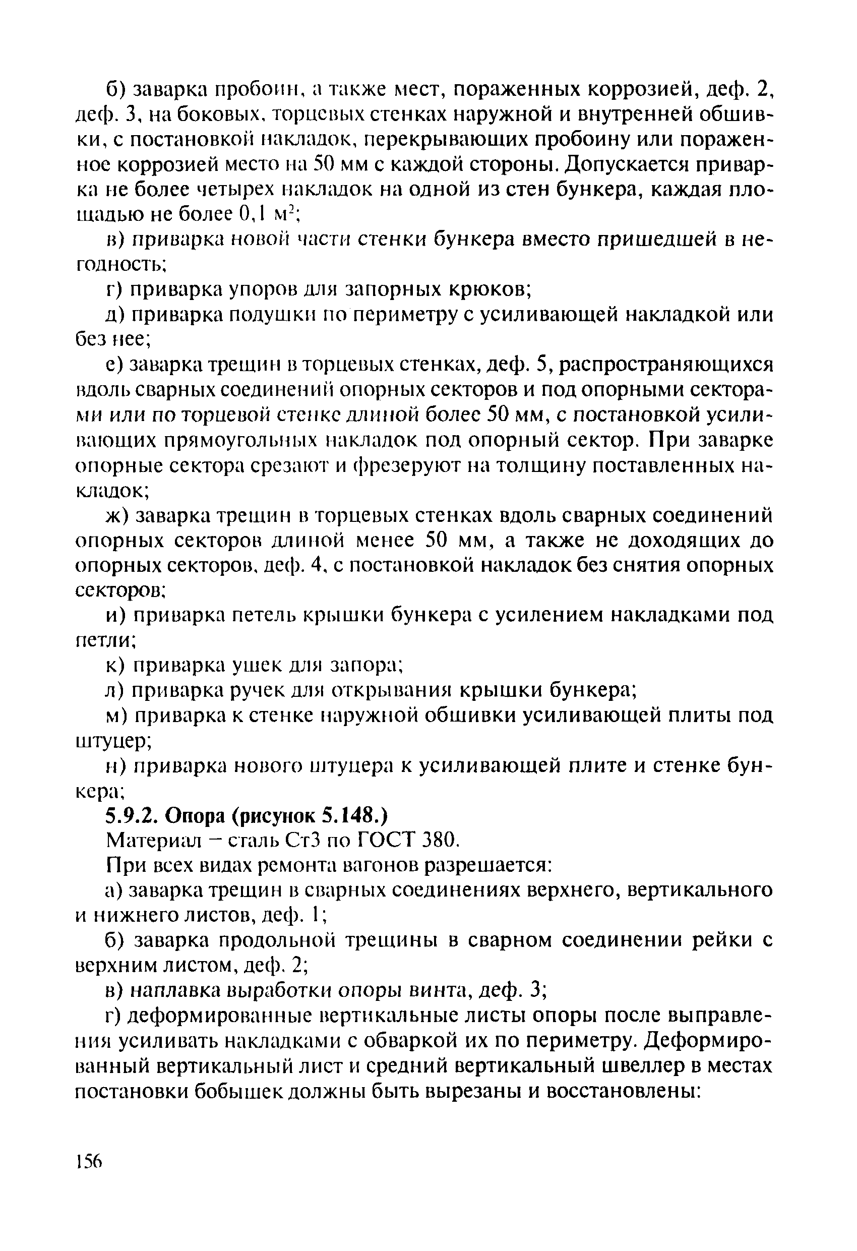 | Оглавление: | 1. Область применения 2. Нормативные ссылки 3. Основные указания по организации и выполнению сварочно-наплавочных работ 3.1 Организация сварочно-наплавочных работ 3.2 Общие требования к проведению сварочно-наплавочных работ 3.3 Подготовка узлов и деталей вагонов к сварке и наплавке 3.4 Наплавка изношенных поверхностей 3.5 Сварка 3.6 Контроль качества сварных соединений 3.7 Виды дефектов и способы их устранения 3.8 Заварка трещин и усиление поврежденных мест 3.9 Приемка выполненных работ 4. Требования безопасности и охраны окружающей среды 5. Требования к ремонту сваркой деталей и узлов 5.1 Тележка модели 18-100, 18-101 5.2 Тележка рефрижераторного типа КВЗ-И2 5.3 Детали тормозов 5.4 Автосцепное устройство 5.5 Вагонная рама и ее детали 5.6 Кузова вагонов 5.7 Внутреннее оборудование рефрижераторных вагонов секций ЦБ-5, БМЗ-5 и АРВ 5.8 Цистерны 5.9 Вагон для битума 5.10 Вагон (хоппер) для зерна, цемента, сырья минеральных удобрений 5.11 Хоппер-дозатор, вагон (хоппер) для горячих окатышей и агломерата |