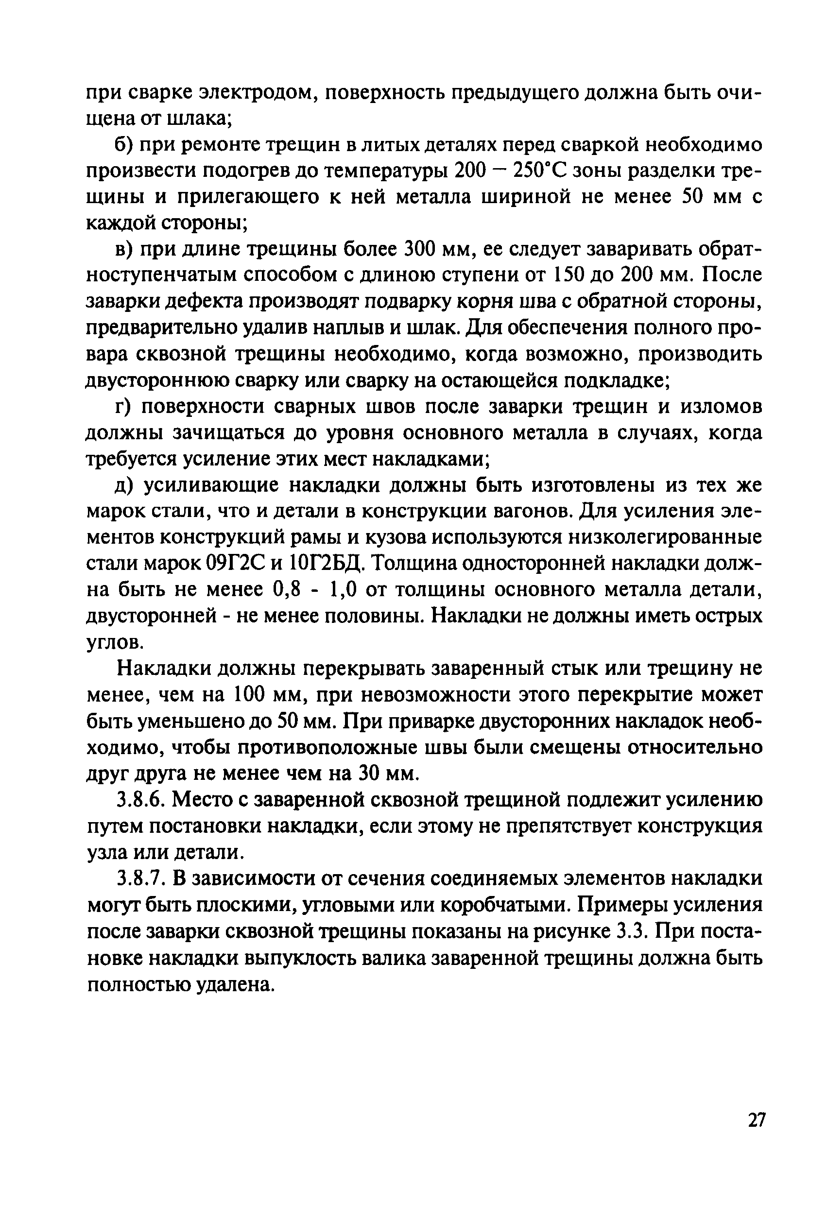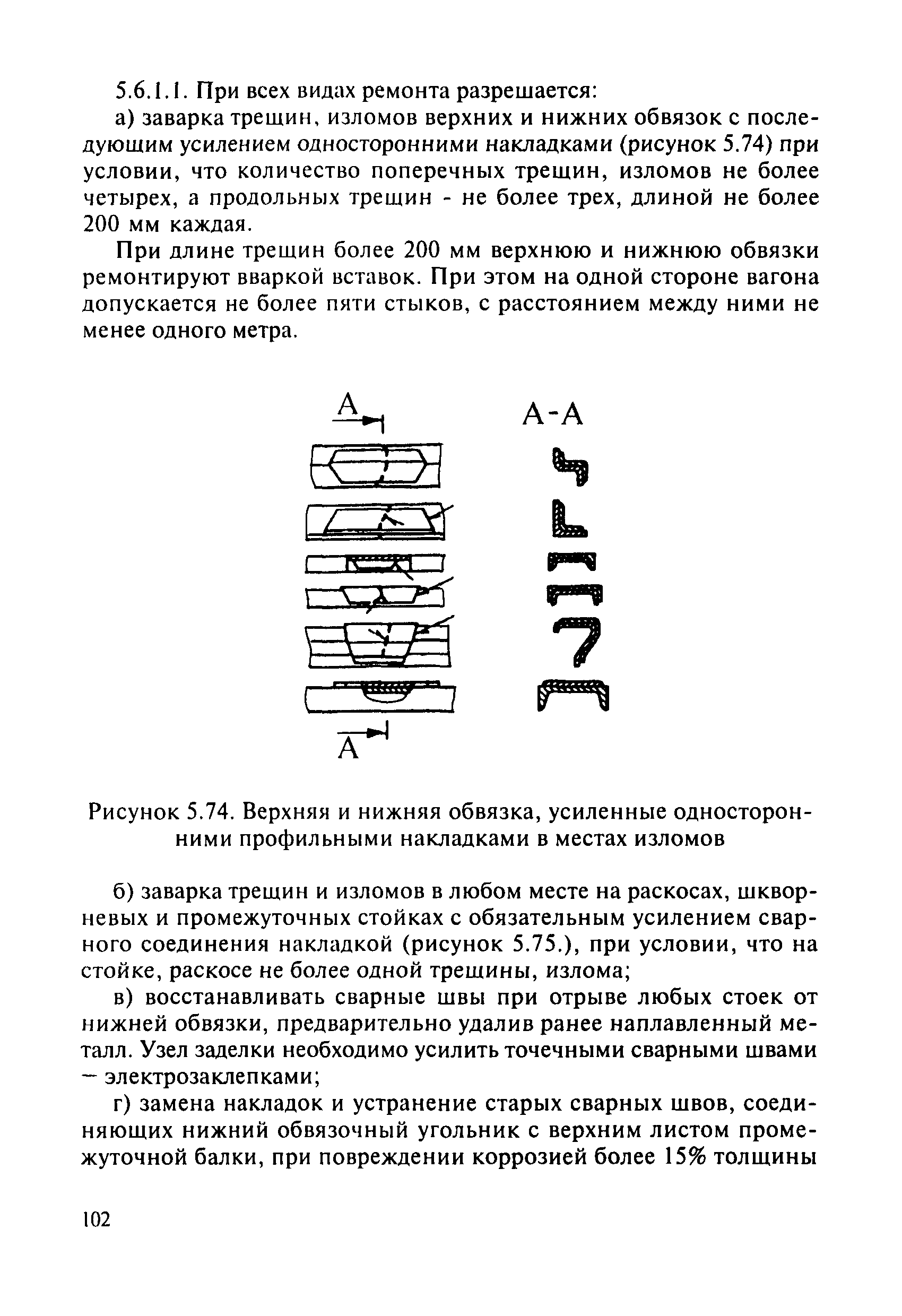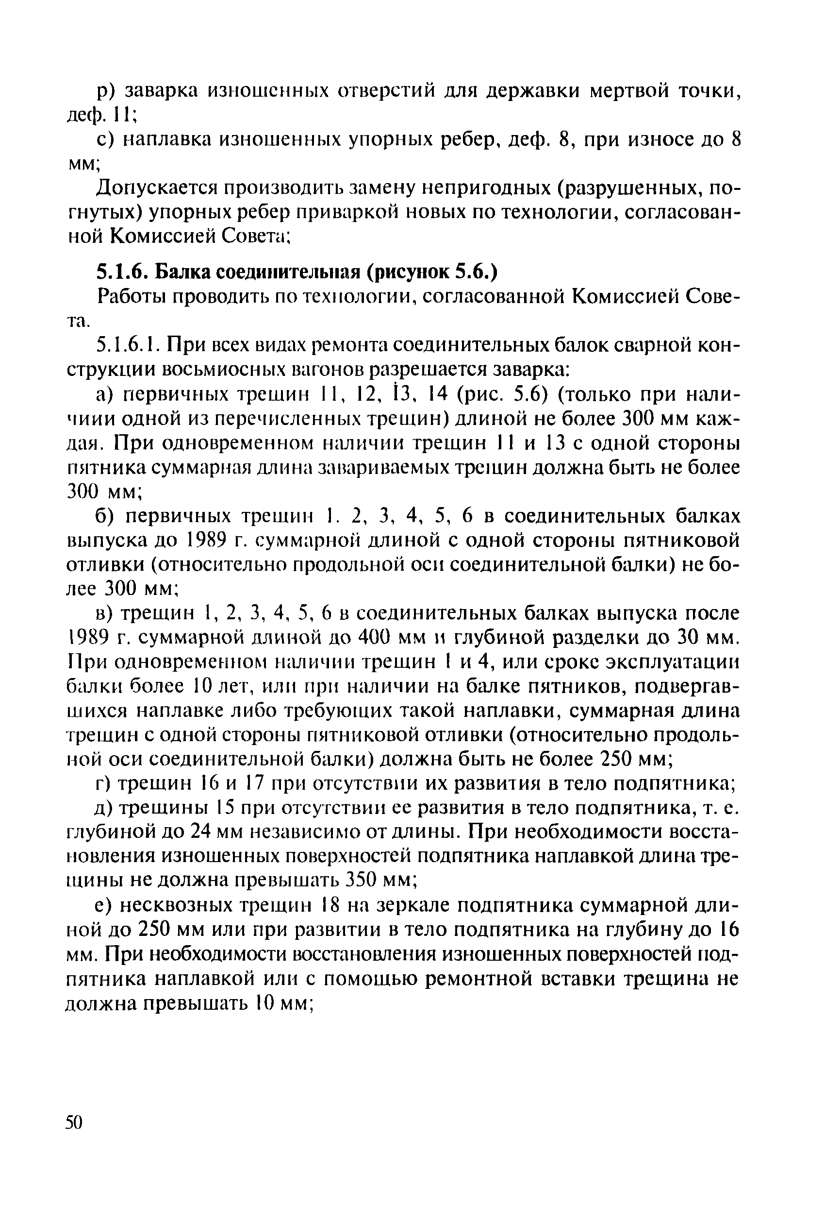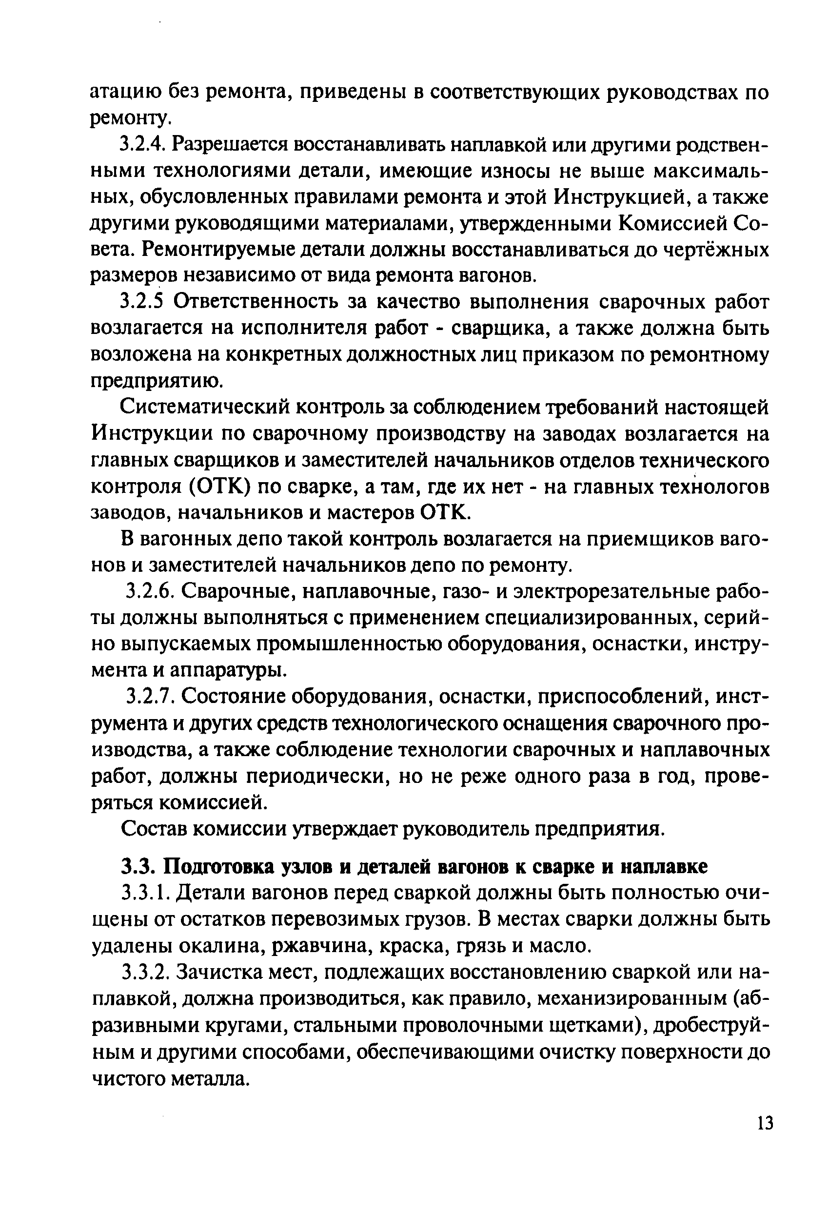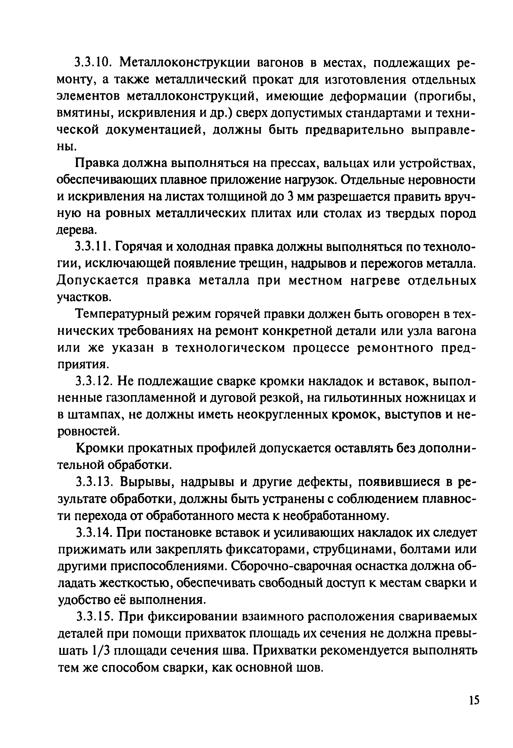 | Оглавление: | 1. Область применения 2. Нормативные ссылки 3. Основные указания по организации и выполнению сварочно-наплавочных работ 3.1 Организация сварочно-наплавочных работ 3.2 Общие требования к проведению сварочно-наплавочных работ 3.3 Подготовка узлов и деталей вагонов к сварке и наплавке 3.4 Наплавка изношенных поверхностей 3.5 Сварка 3.6 Контроль качества сварных соединений 3.7 Виды дефектов и способы их устранения 3.8 Заварка трещин и усиление поврежденных мест 3.9 Приемка выполненных работ 4. Требования безопасности и охраны окружающей среды 5. Требования к ремонту сваркой деталей и узлов 5.1 Тележка модели 18-100, 18-101 5.2 Тележка рефрижераторного типа КВЗ-И2 5.3 Детали тормозов 5.4 Автосцепное устройство 5.5 Вагонная рама и ее детали 5.6 Кузова вагонов 5.7 Внутреннее оборудование рефрижераторных вагонов секций ЦБ-5, БМЗ-5 и АРВ 5.8 Цистерны 5.9 Вагон для битума 5.10 Вагон (хоппер) для зерна, цемента, сырья минеральных удобрений 5.11 Хоппер-дозатор, вагон (хоппер) для горячих окатышей и агломерата |